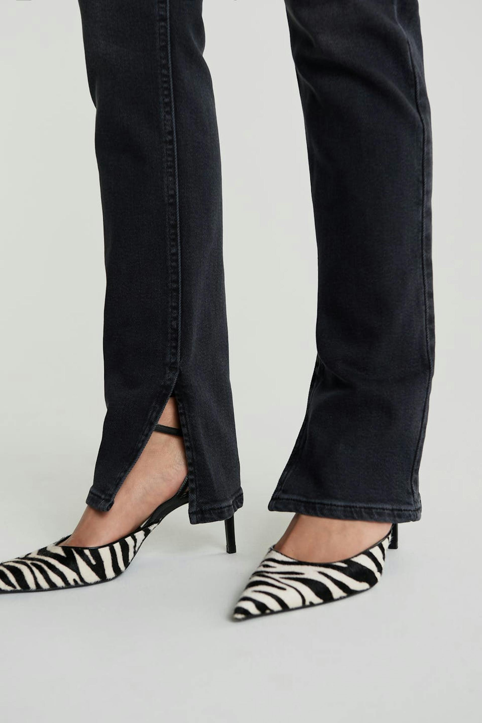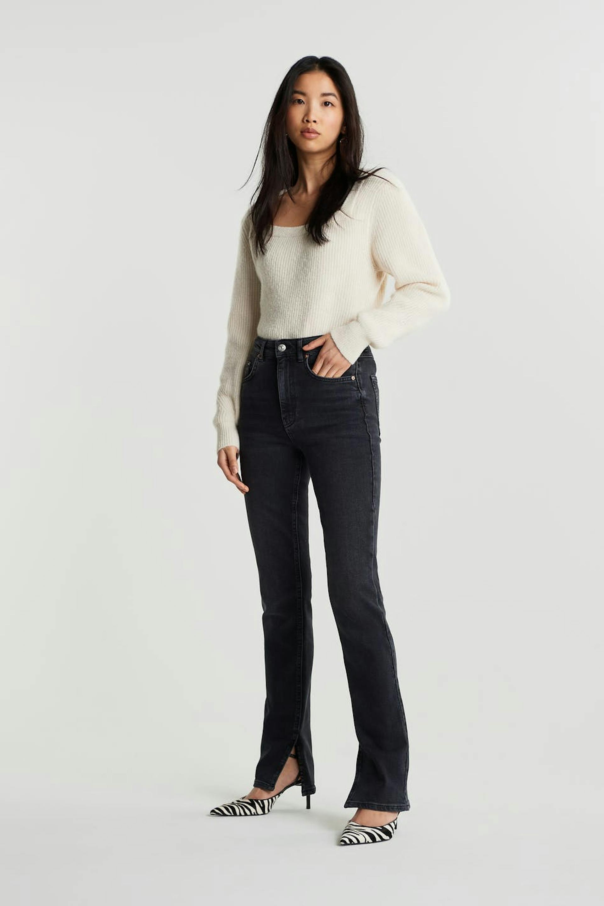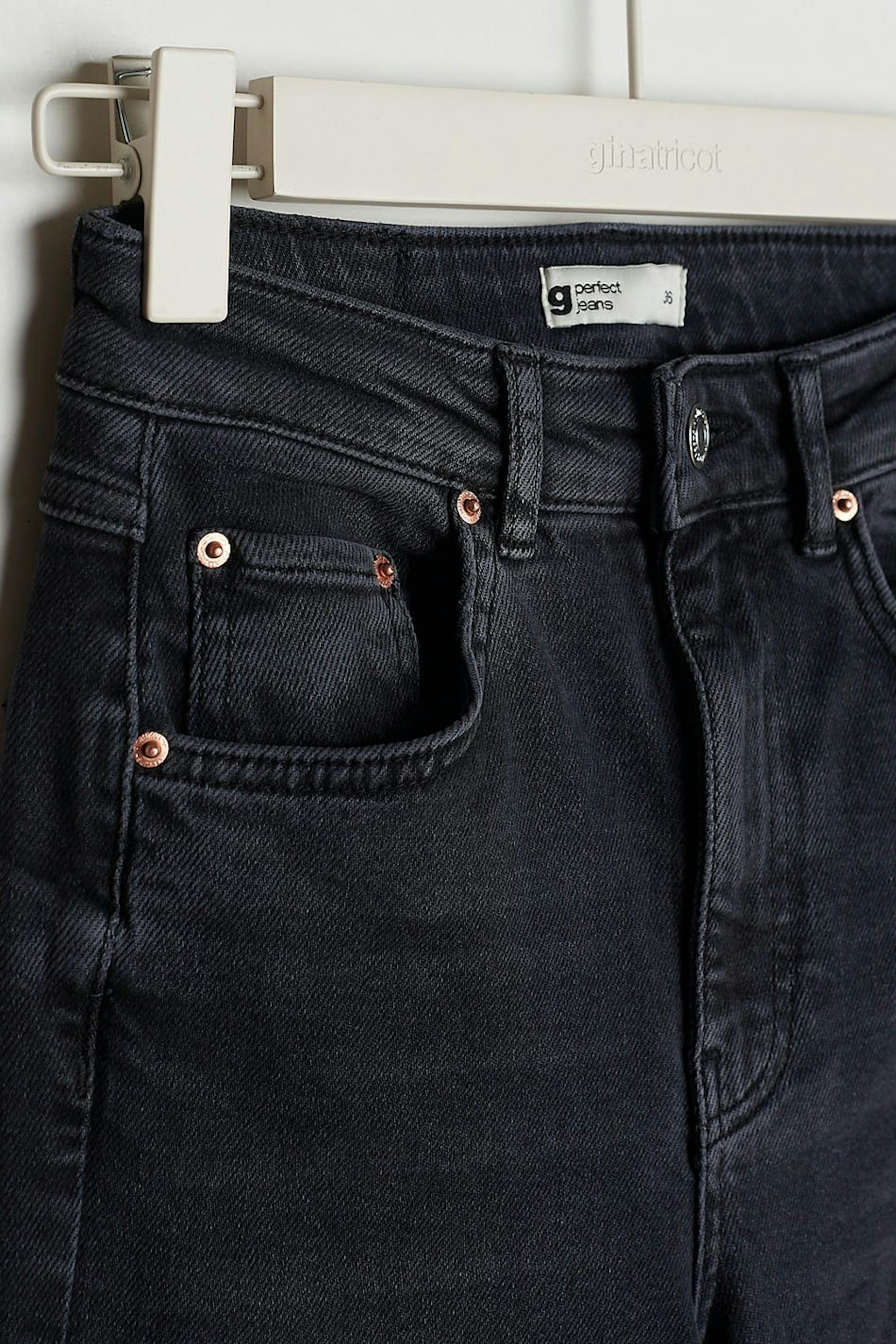 Jeans med lige bener med en slids ved enden af benene. Jeansene er sortgrå og har komfortstræk. De har en høj talje.