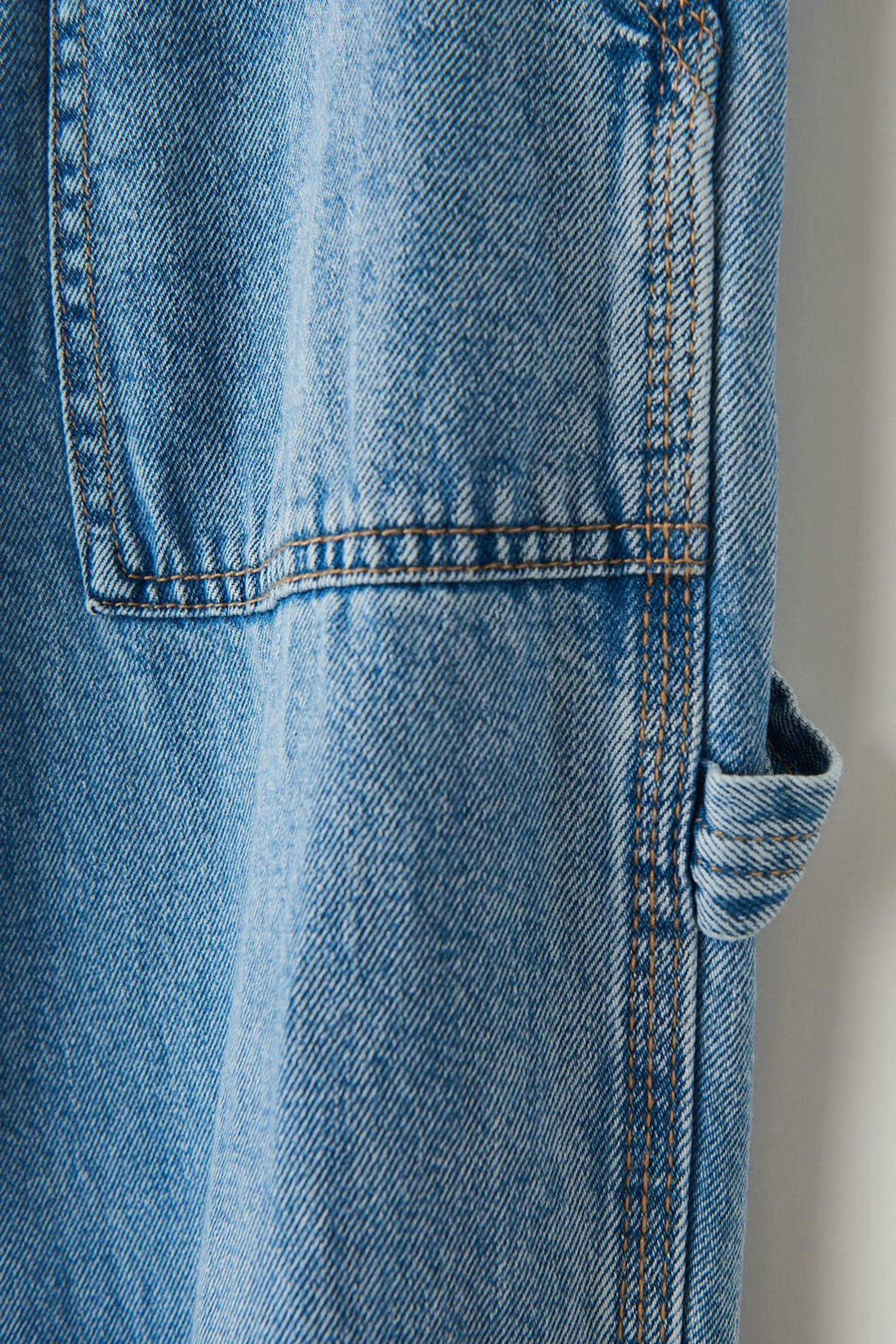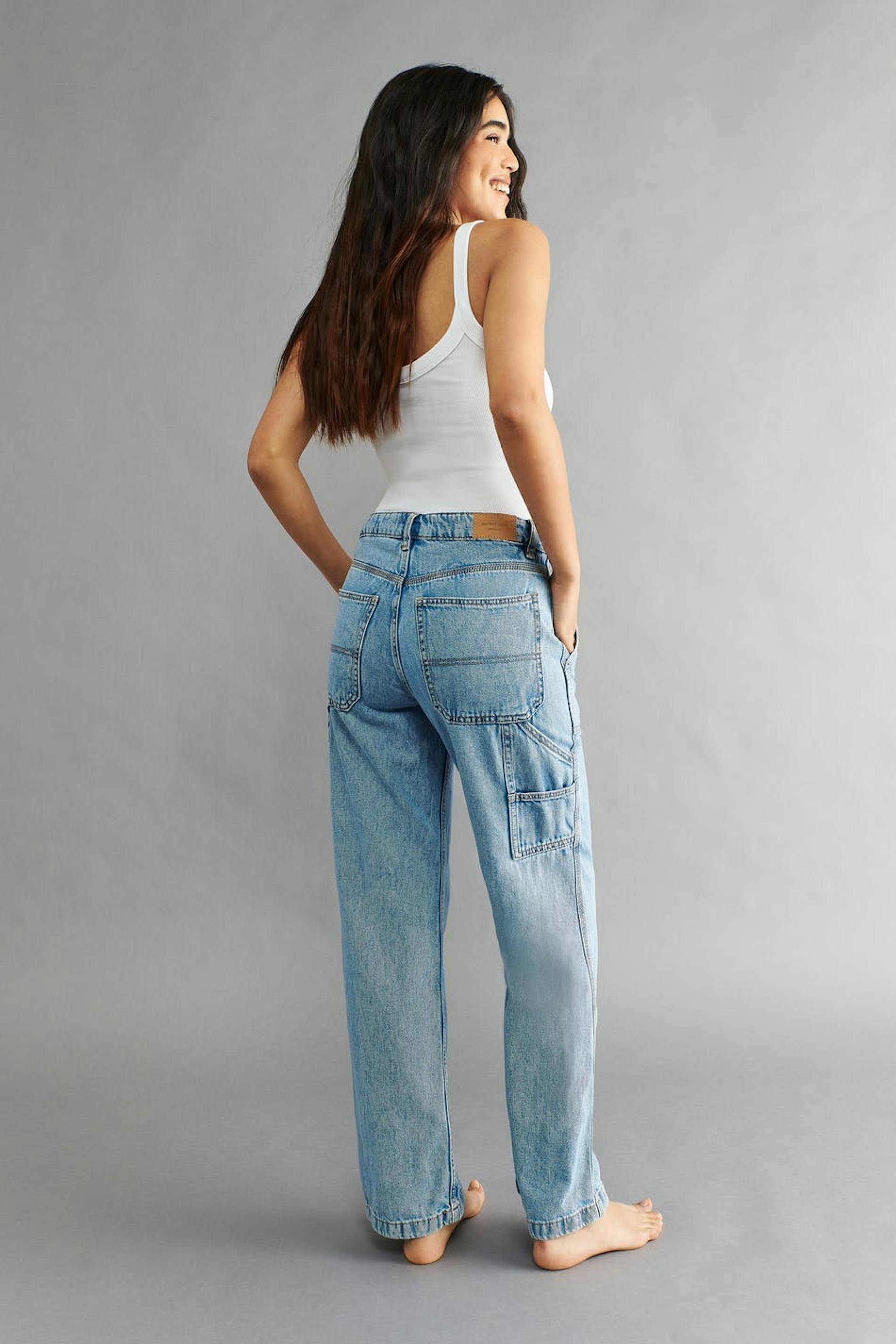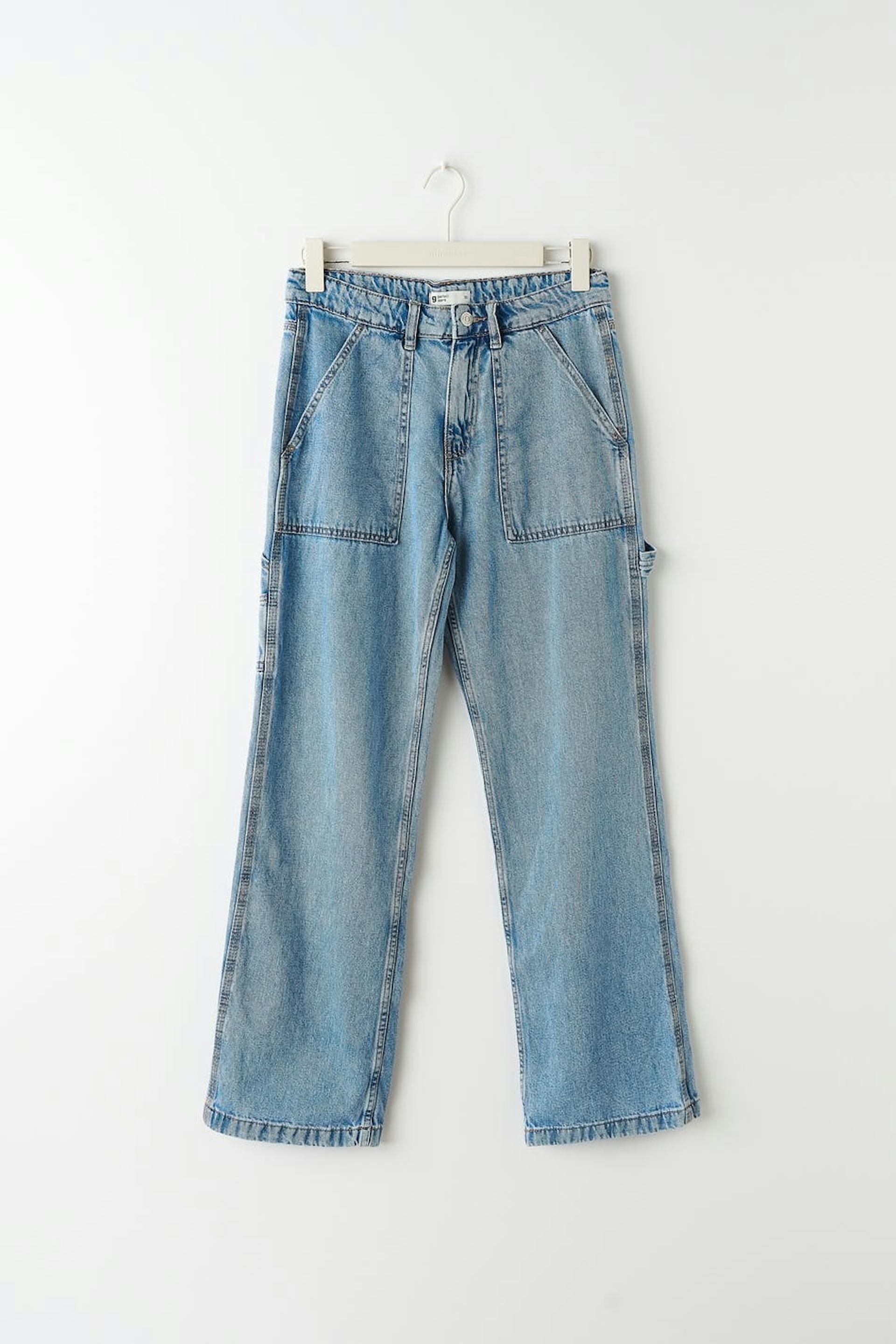 Lige carpenter jeans med medium talje i non-stretch denim. Jeansene er blå og har bukseben med maxi. De har gylp med lynlås og lommer foran og bagpå.