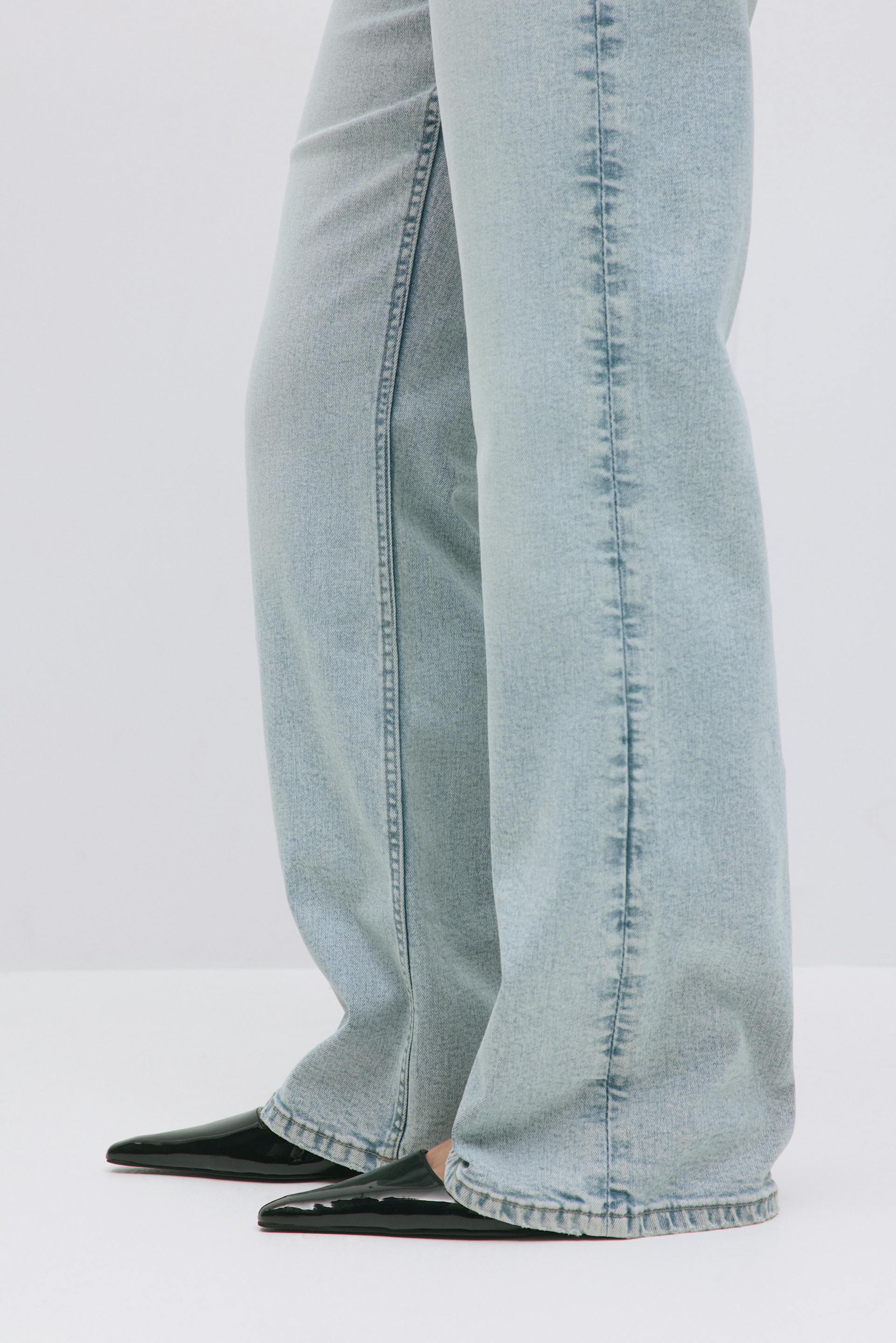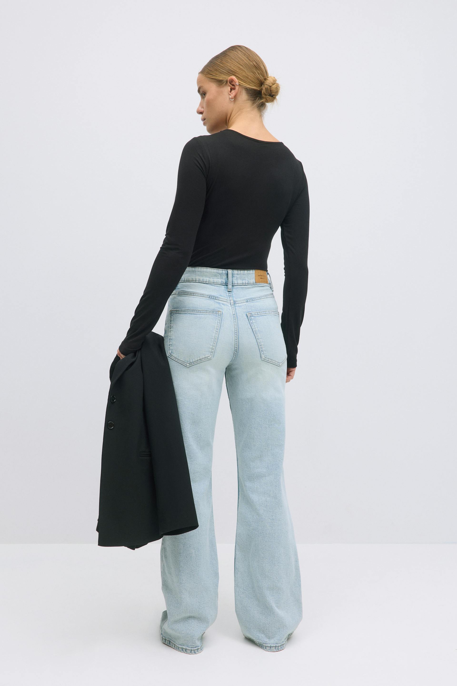Vide jeans med høj talje. Jeansene er lyseblå og har bekvem, elastisk pasform. De har vide ben med maxi, gylp med lynlås og lommer foran og bagpå. Se vores størrelsesguide for at finde din størrelse.