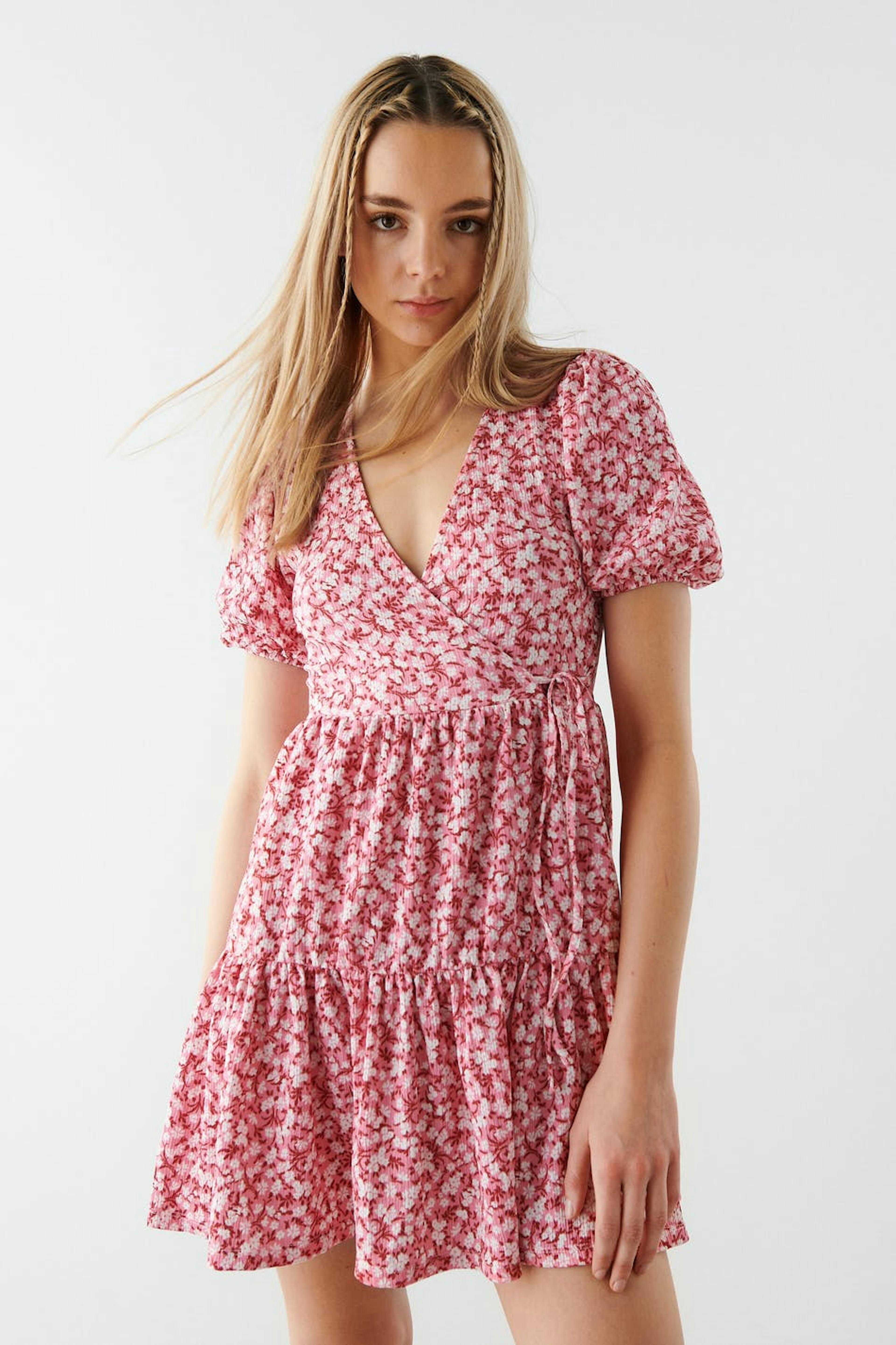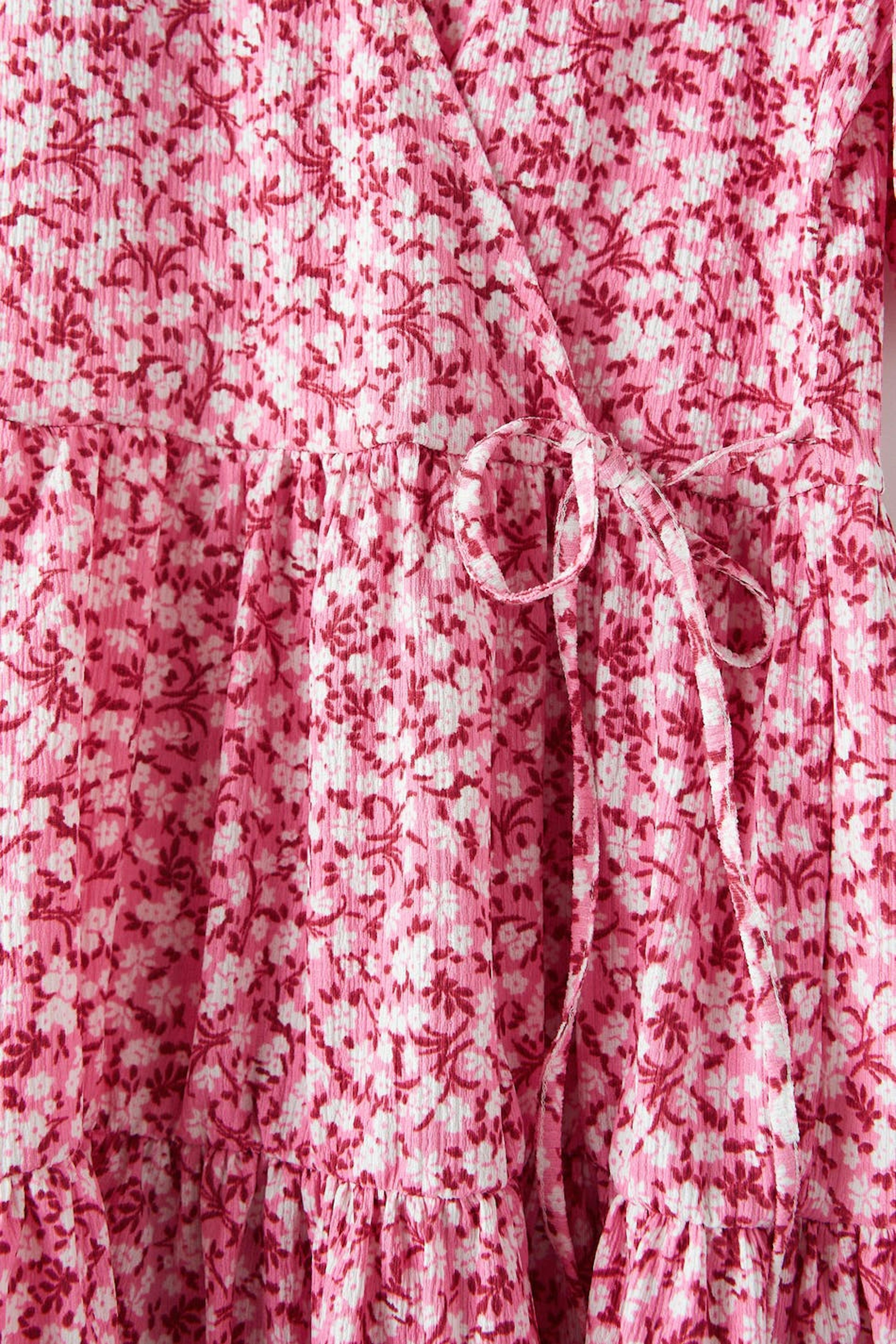 Kort slå-om kjole med en normal pasform. Kjolen er pink og har et kort pufærme. Den har et bindebånd ved taljen og en bred, rynket nederdel.