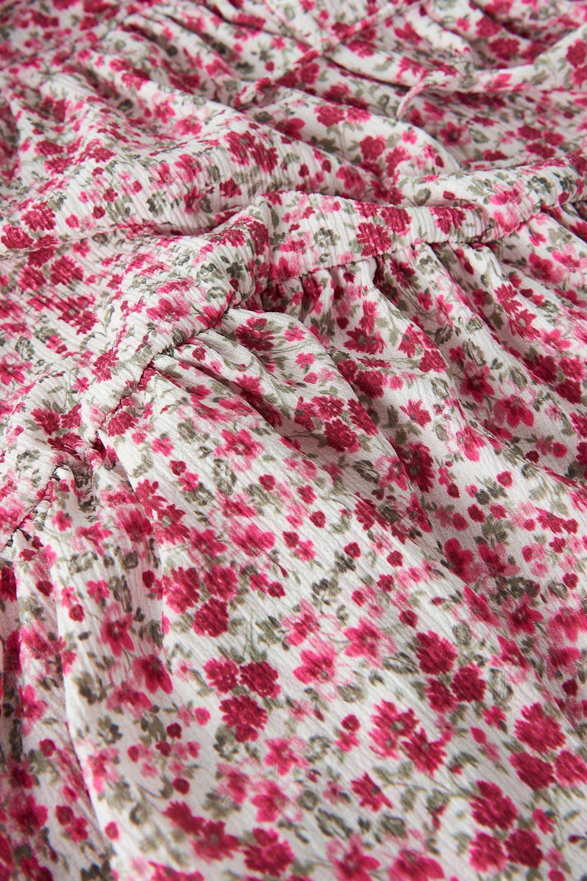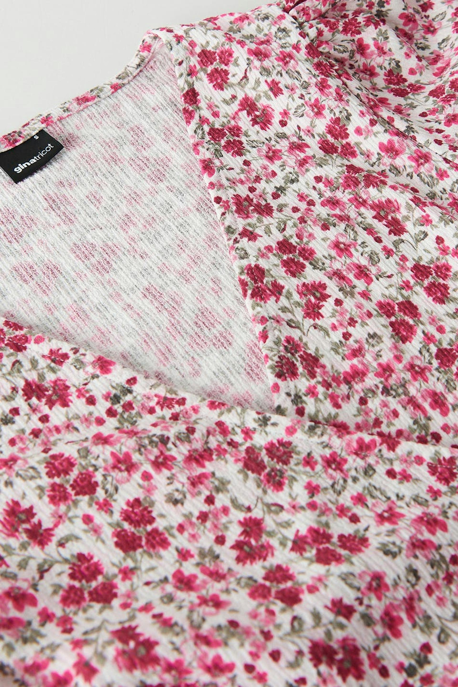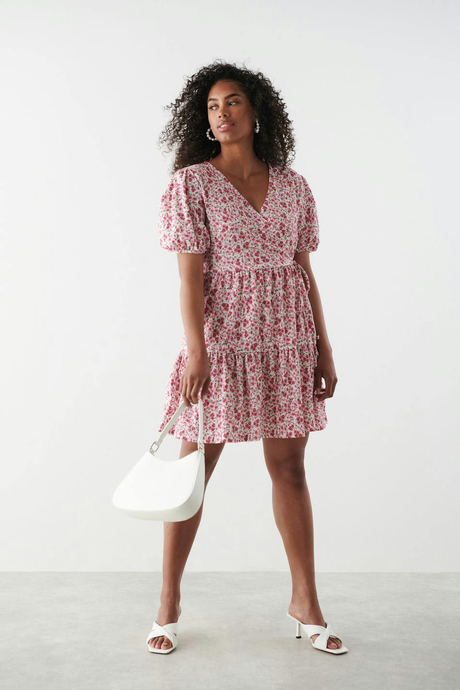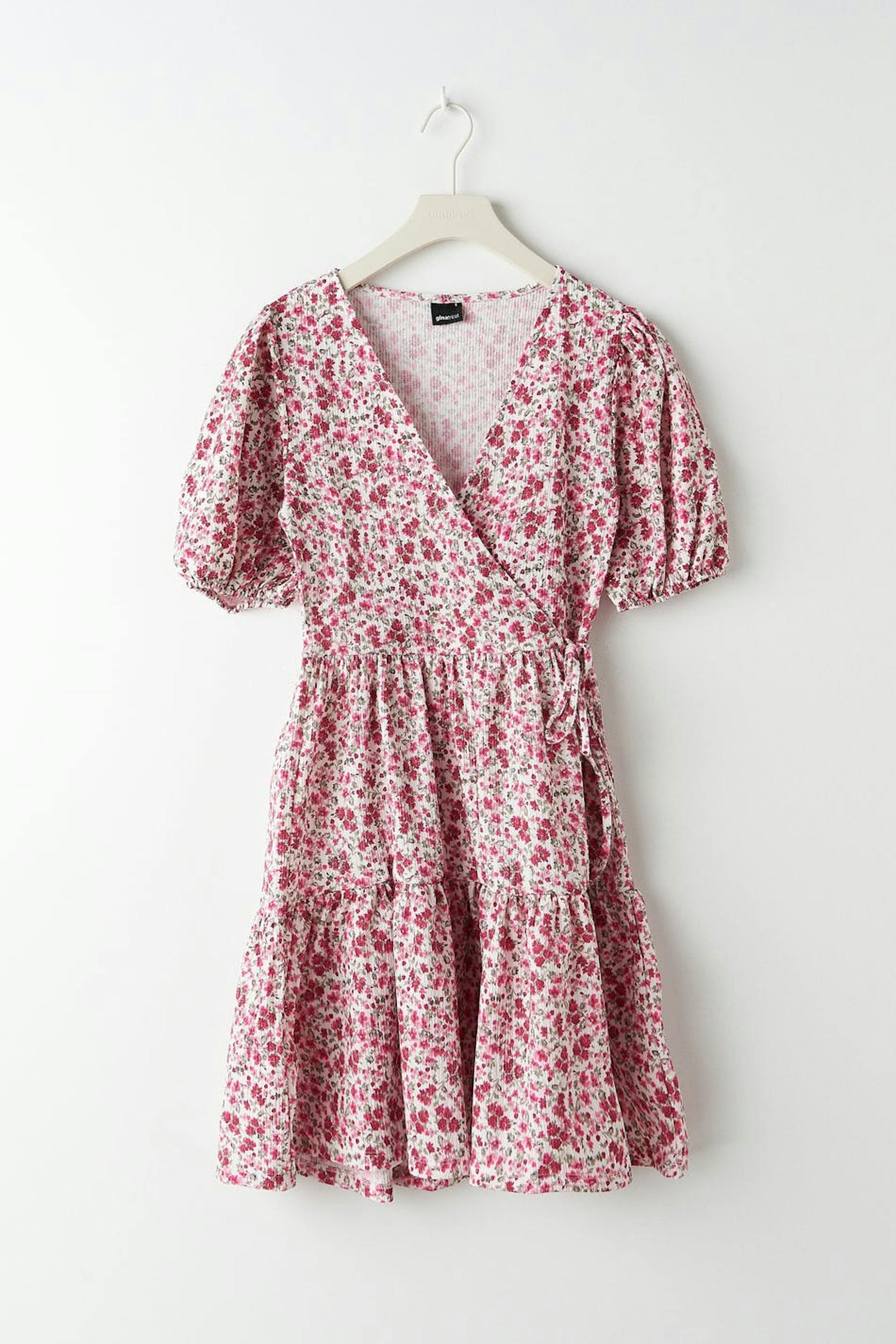 Blomstret slå-om kjole med et kort pufærme. Kjolen er pink, hvid og kort. Den har et bindebånd ved taljen og en bred, rynket nederdel.