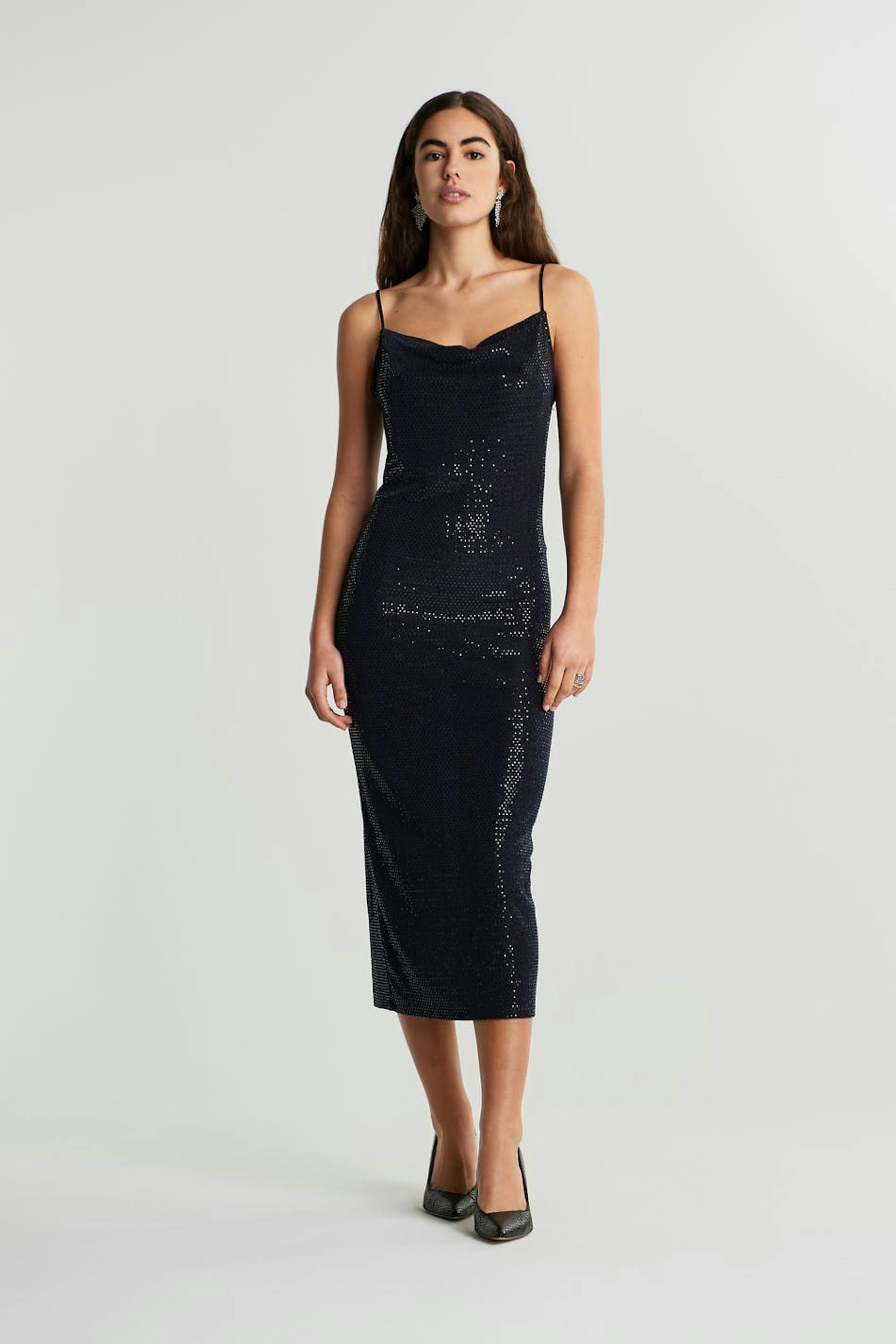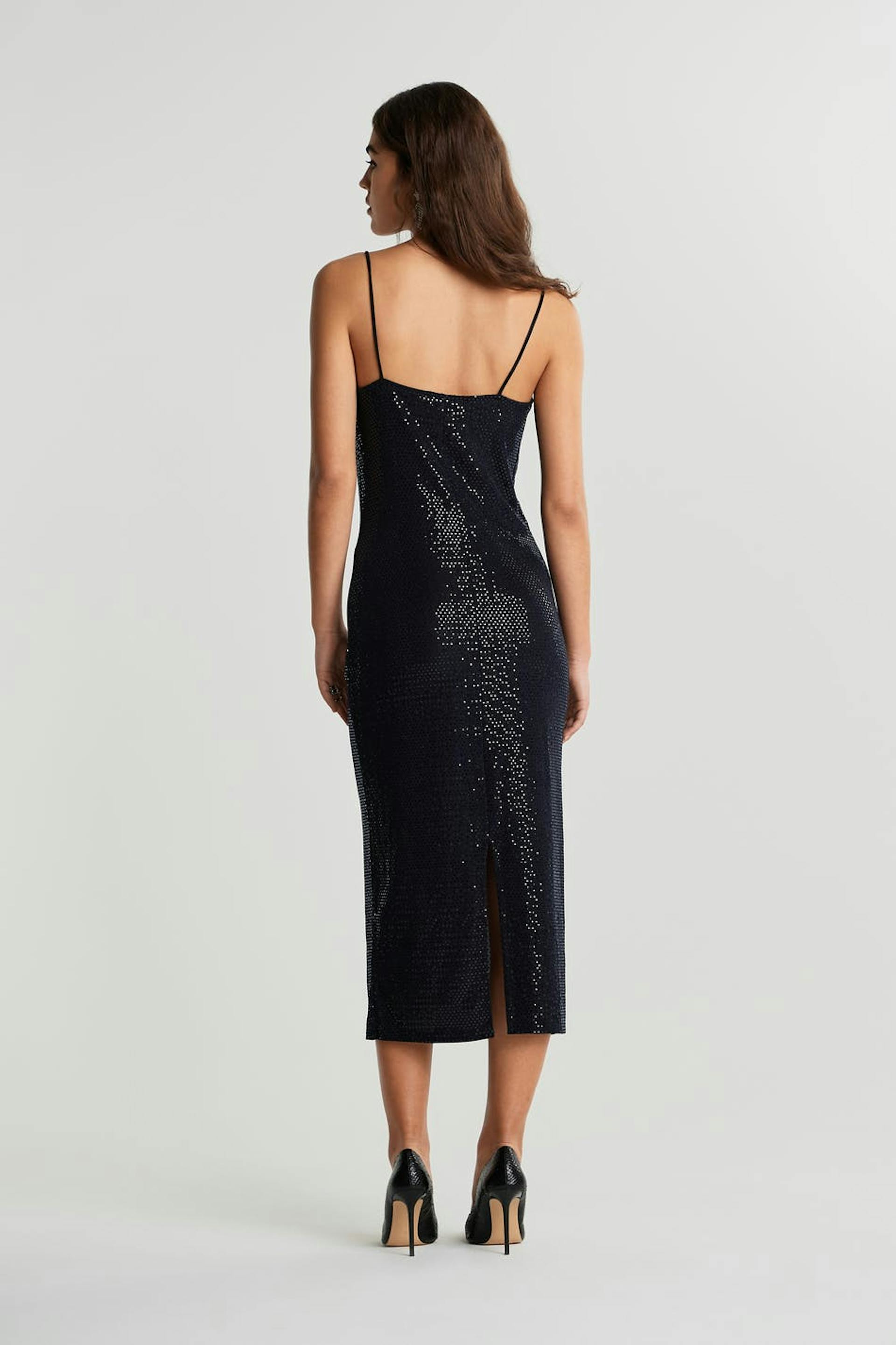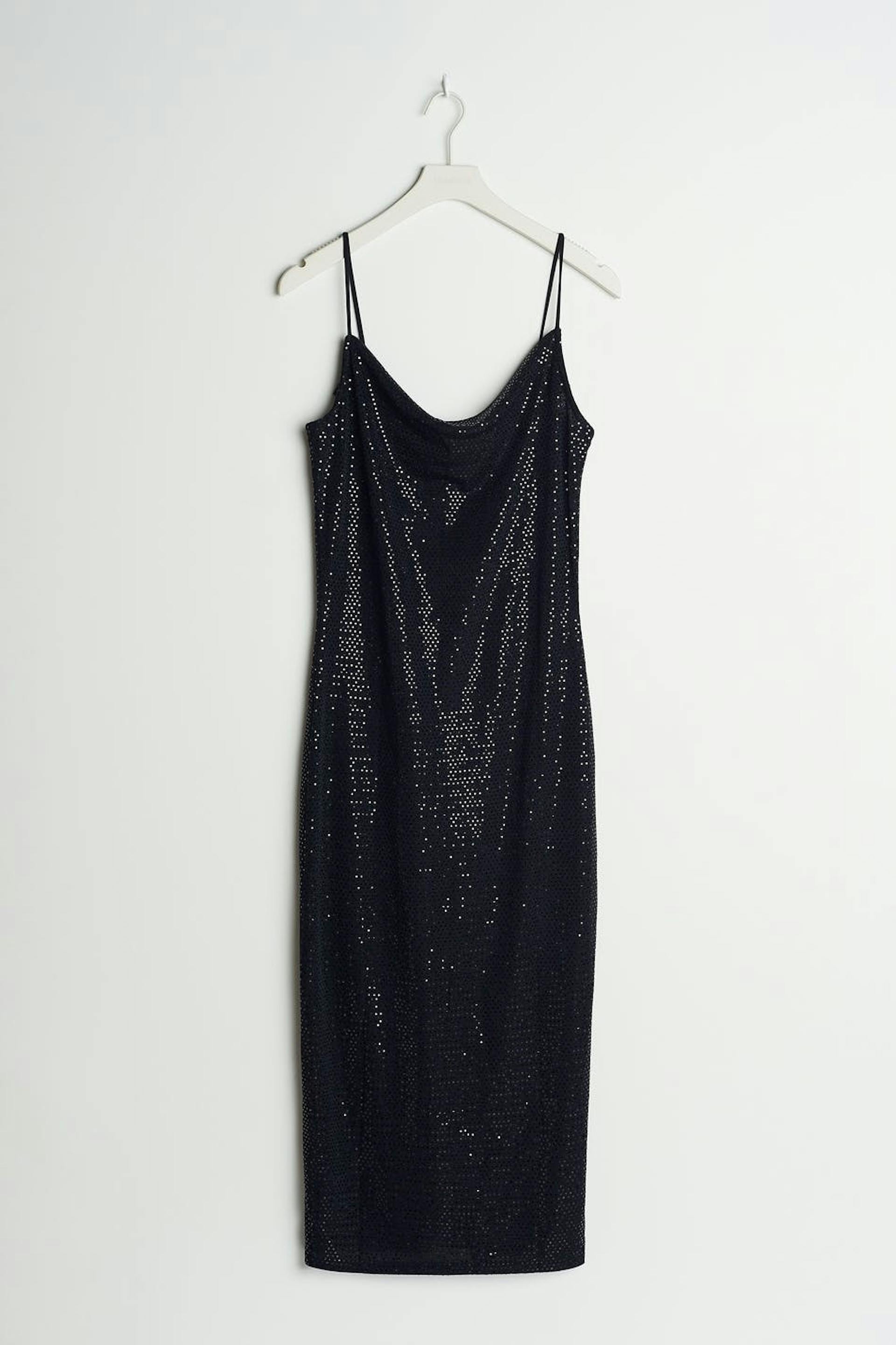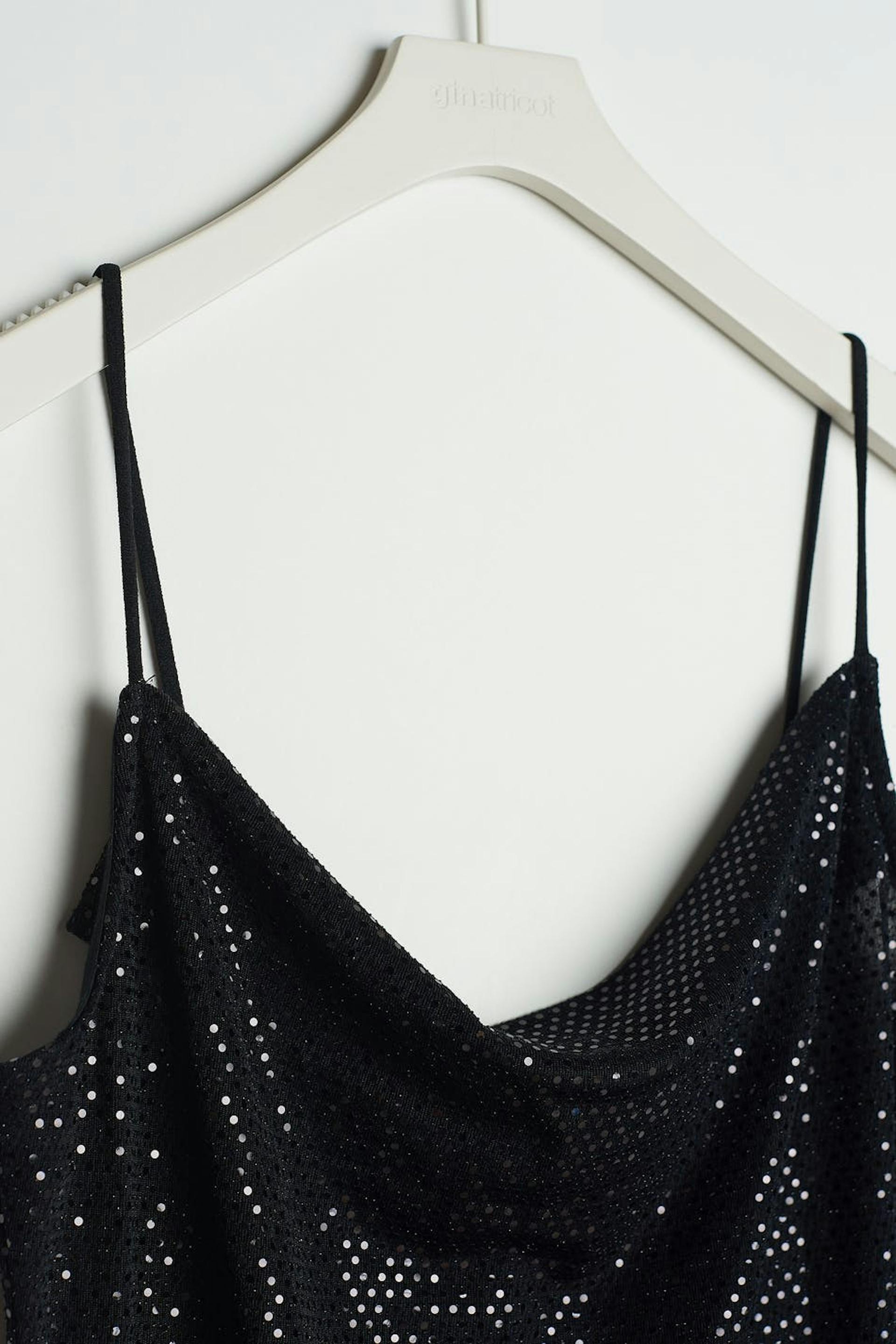Glitrende kjole med en draperet halsudskæring. Perfekt til festen, sort, ærmeløs og læglængde. Den har en slids på bagsiden.