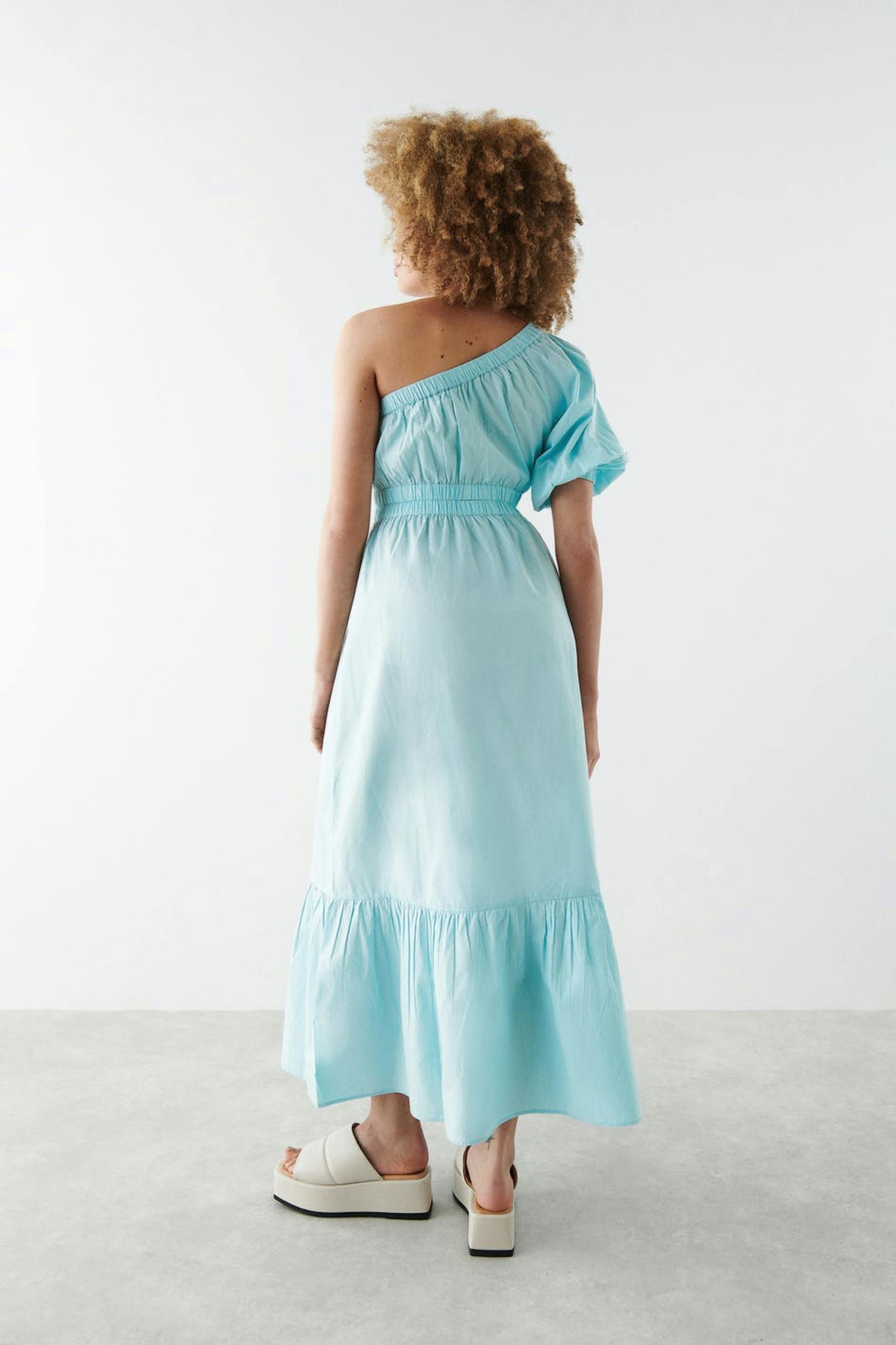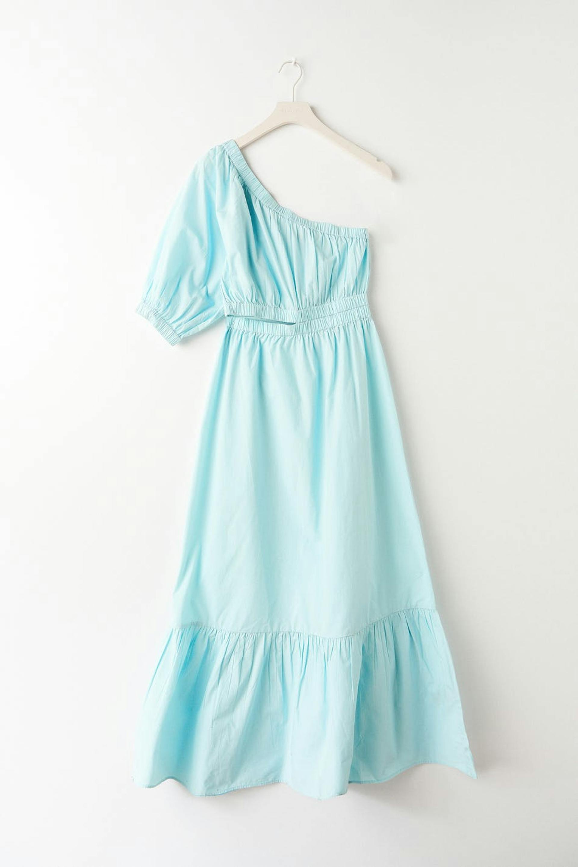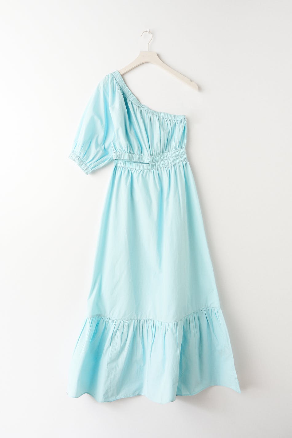 En-skulder kjole med en oversize pasform. Kjolen er blå og har en cut out-detalje i siden. Den har et kort ballonærme, elastik ved taljen og samlinger nederst og ved taljen.