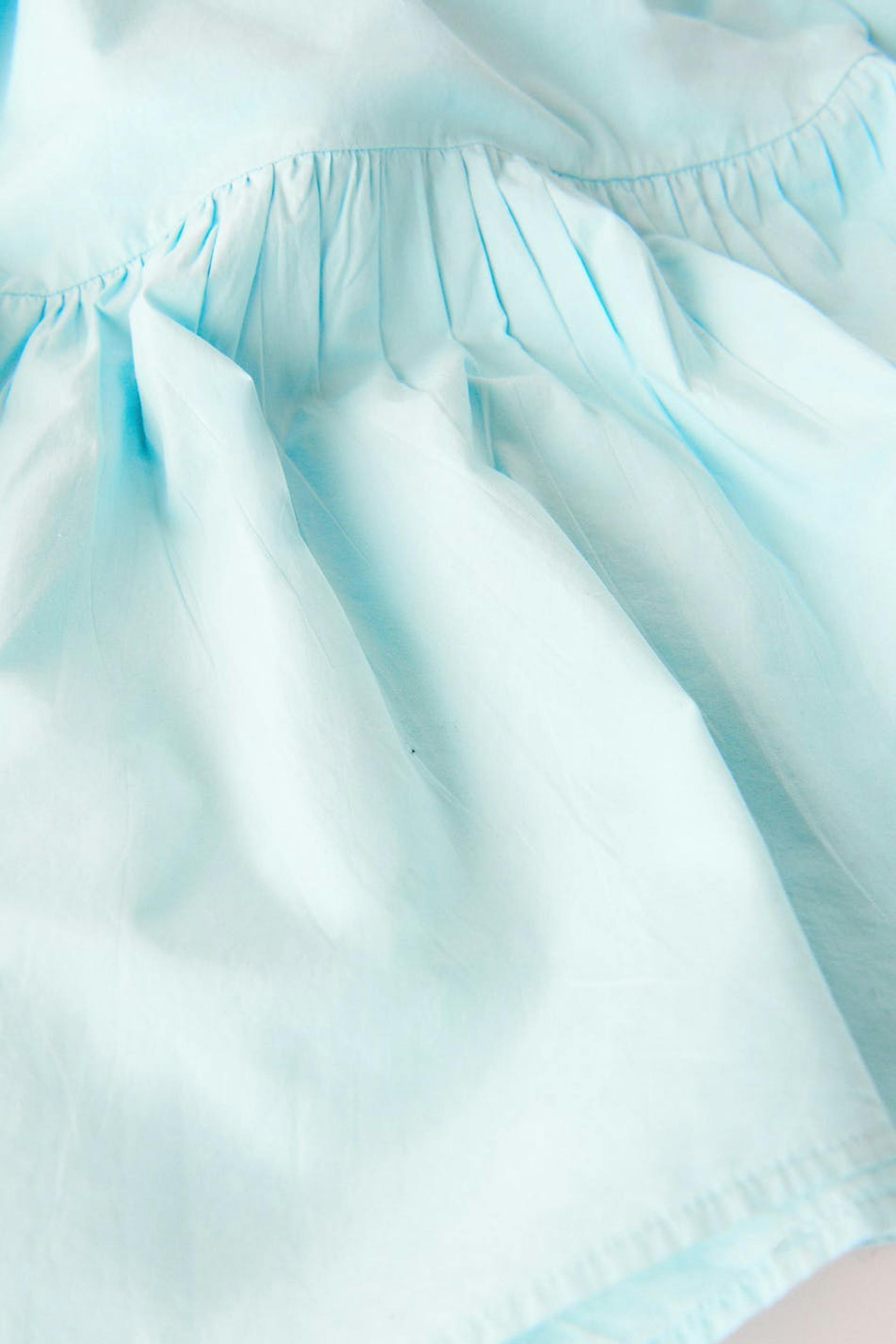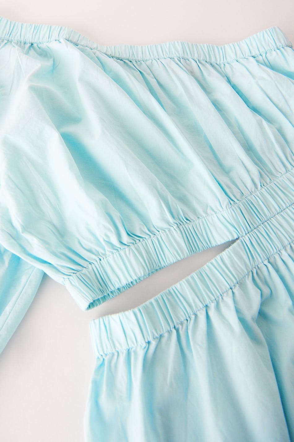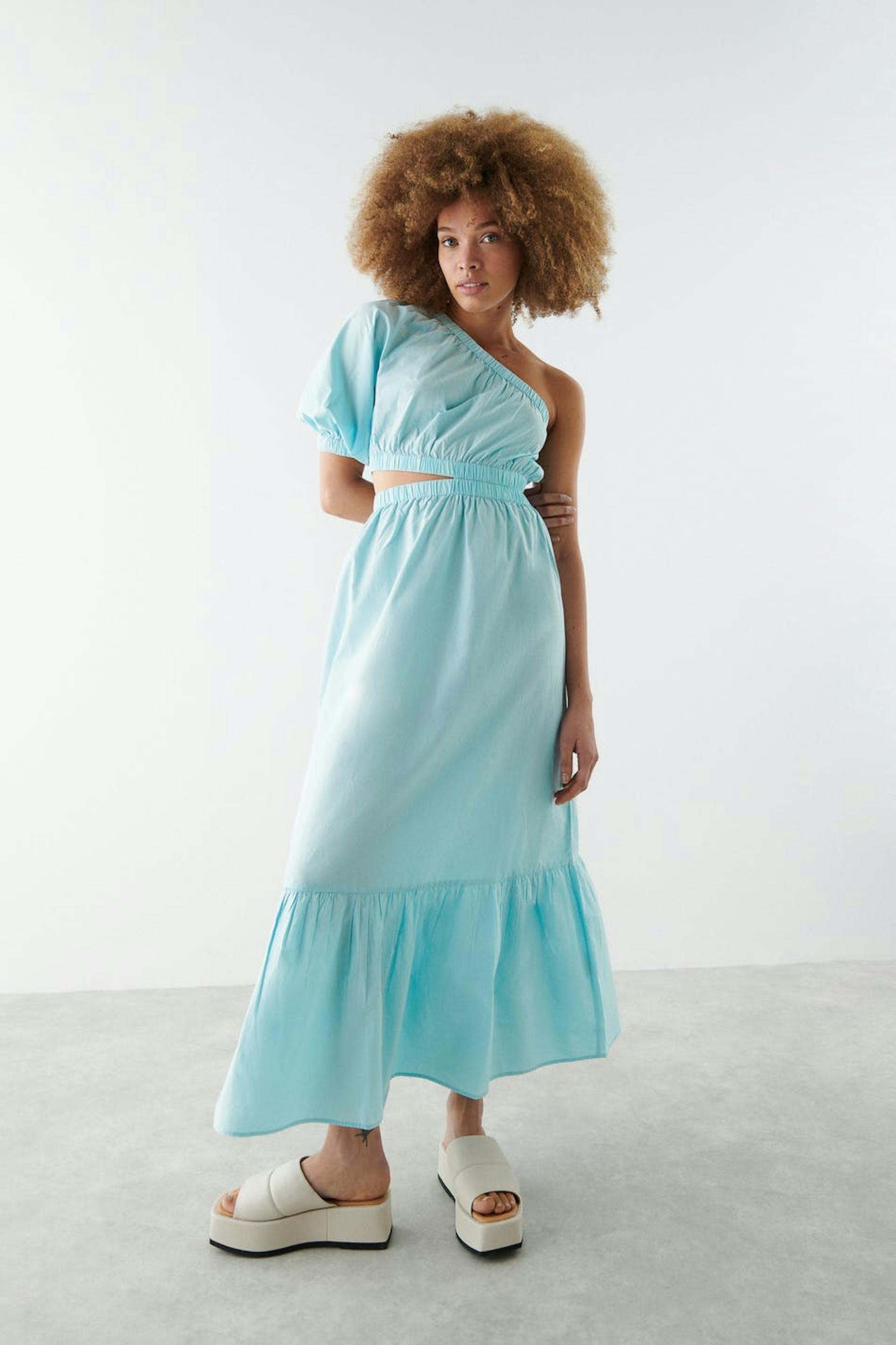 En-skulder kjole med en oversize pasform. Kjolen er blå og har en cut out-detalje i siden. Den har et kort ballonærme, elastik ved taljen og samlinger nederst og ved taljen.