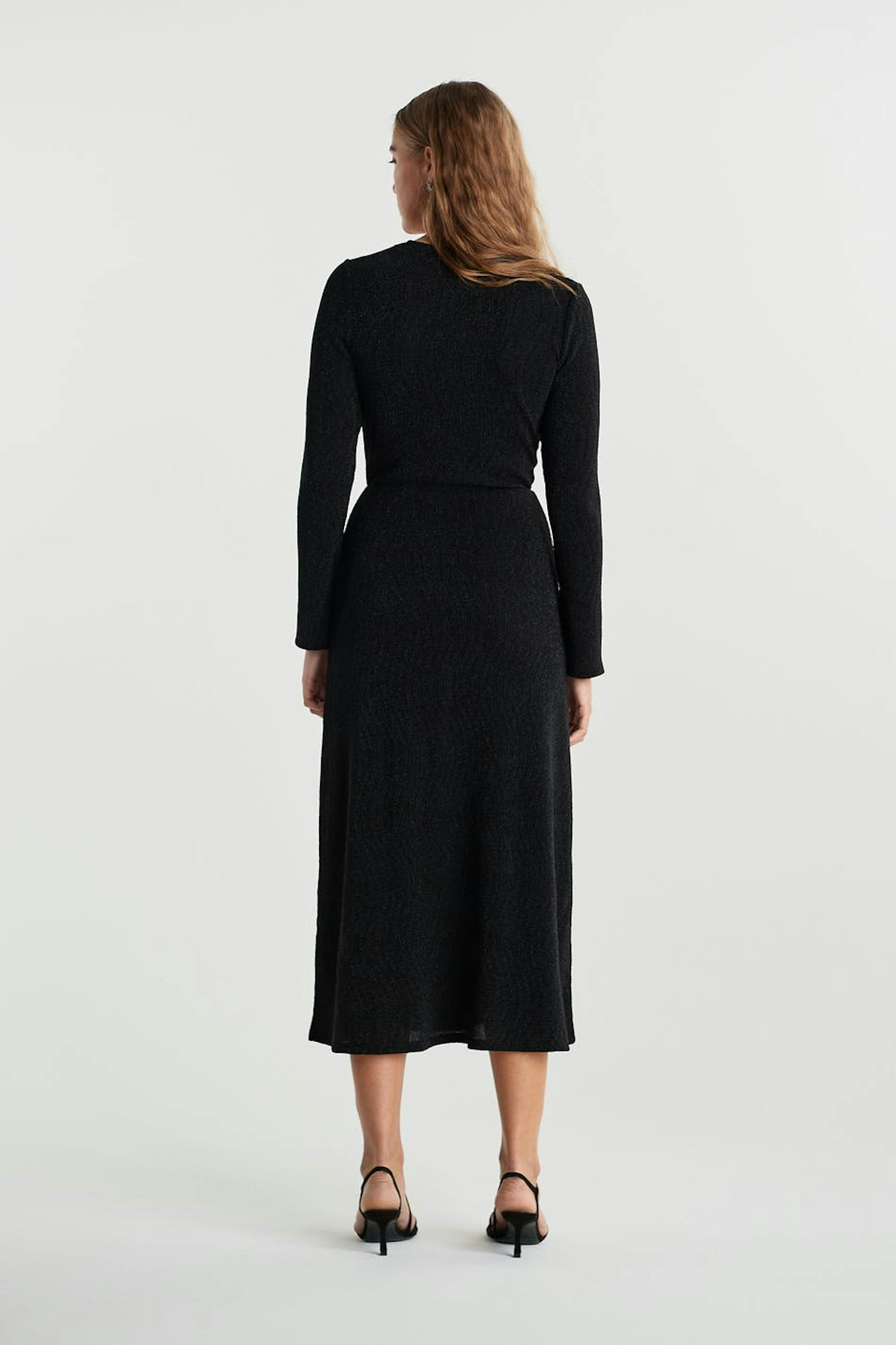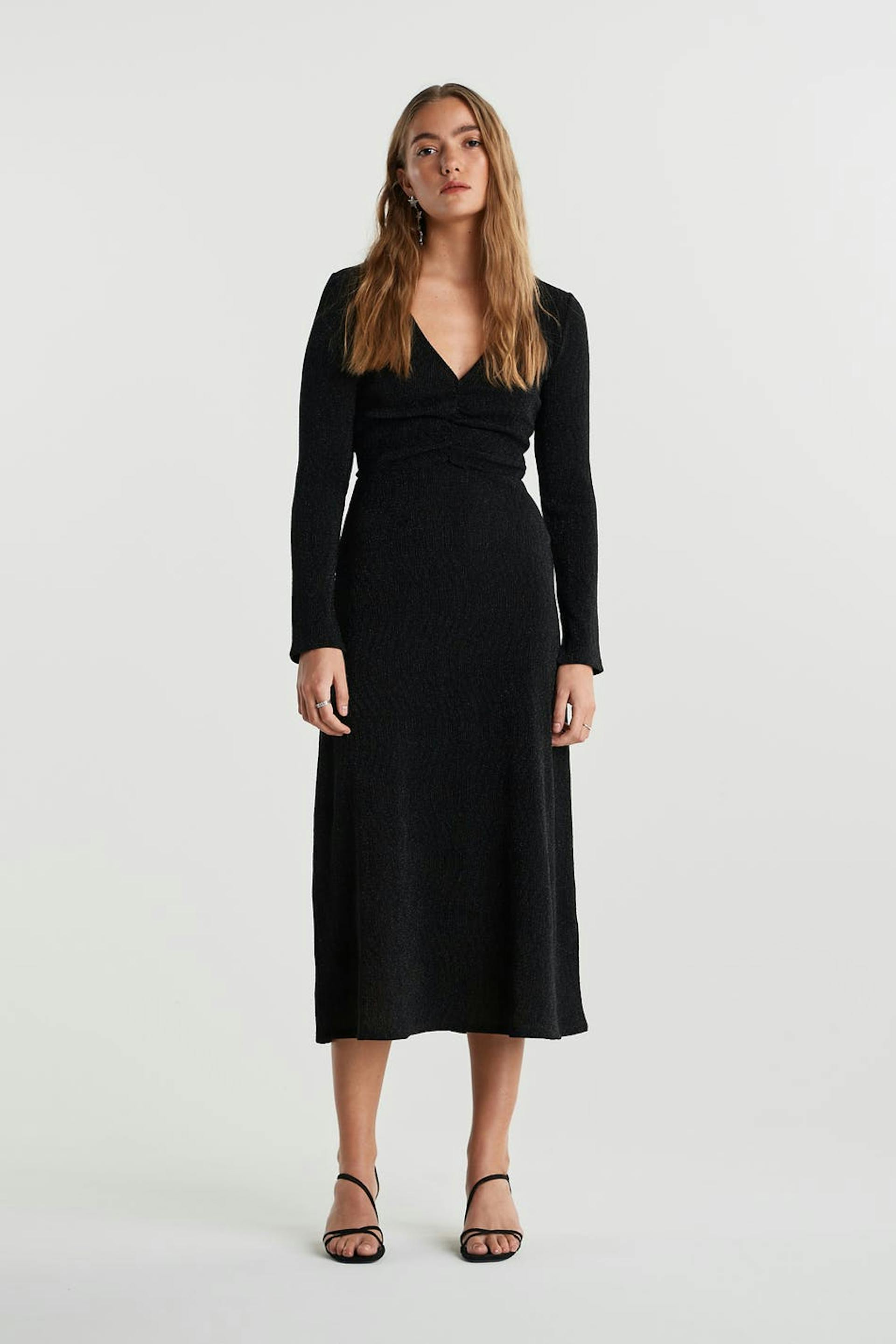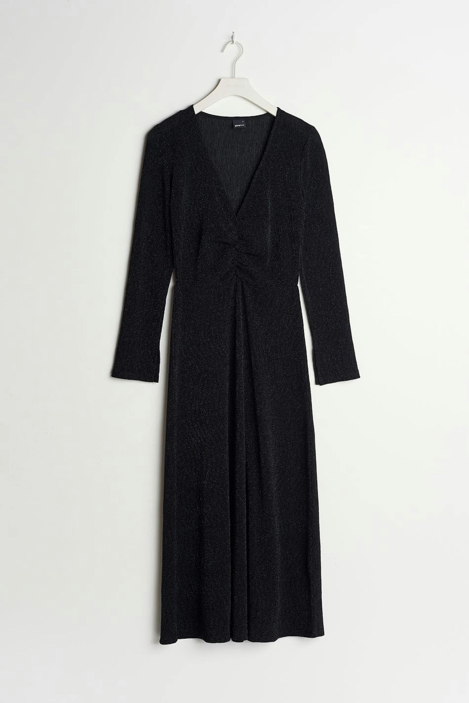 Glitrende kjole med en figursyet pasform. Perfekt til festen, sort, langærmet og læglængde. Den har en v-udskæring og en samling ved fronten.