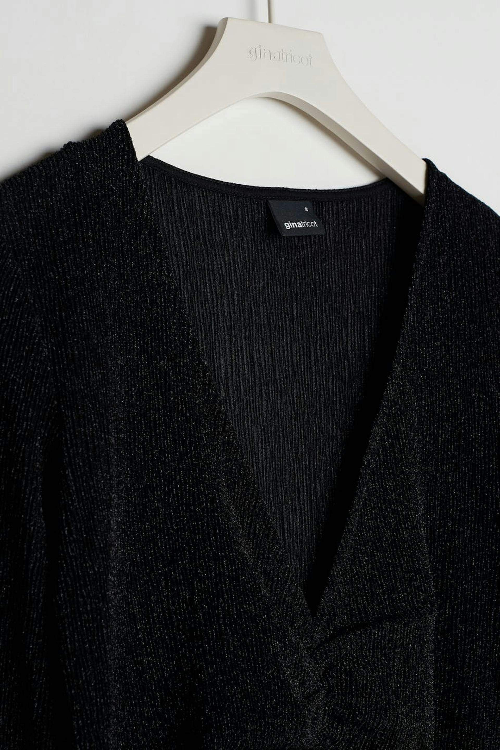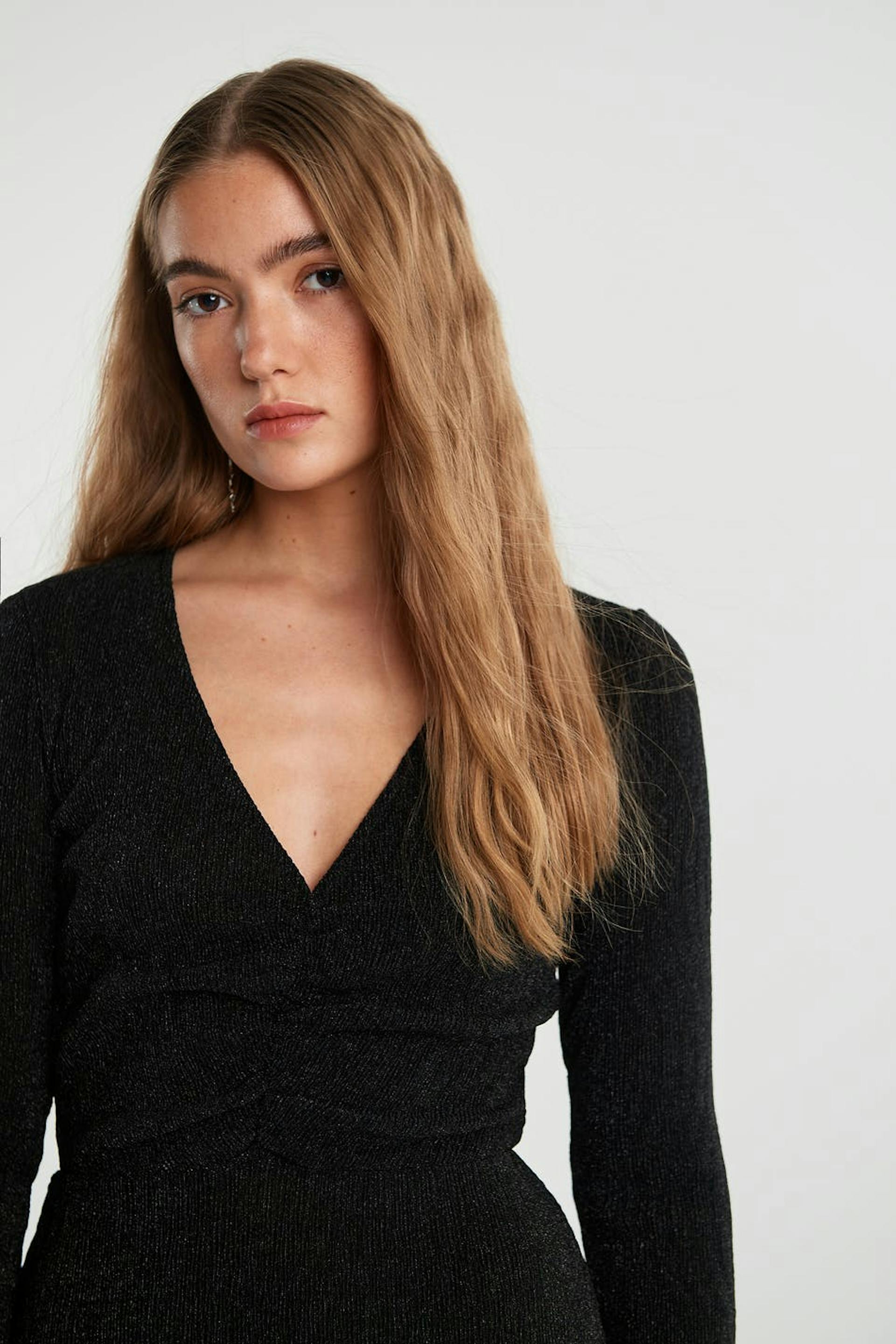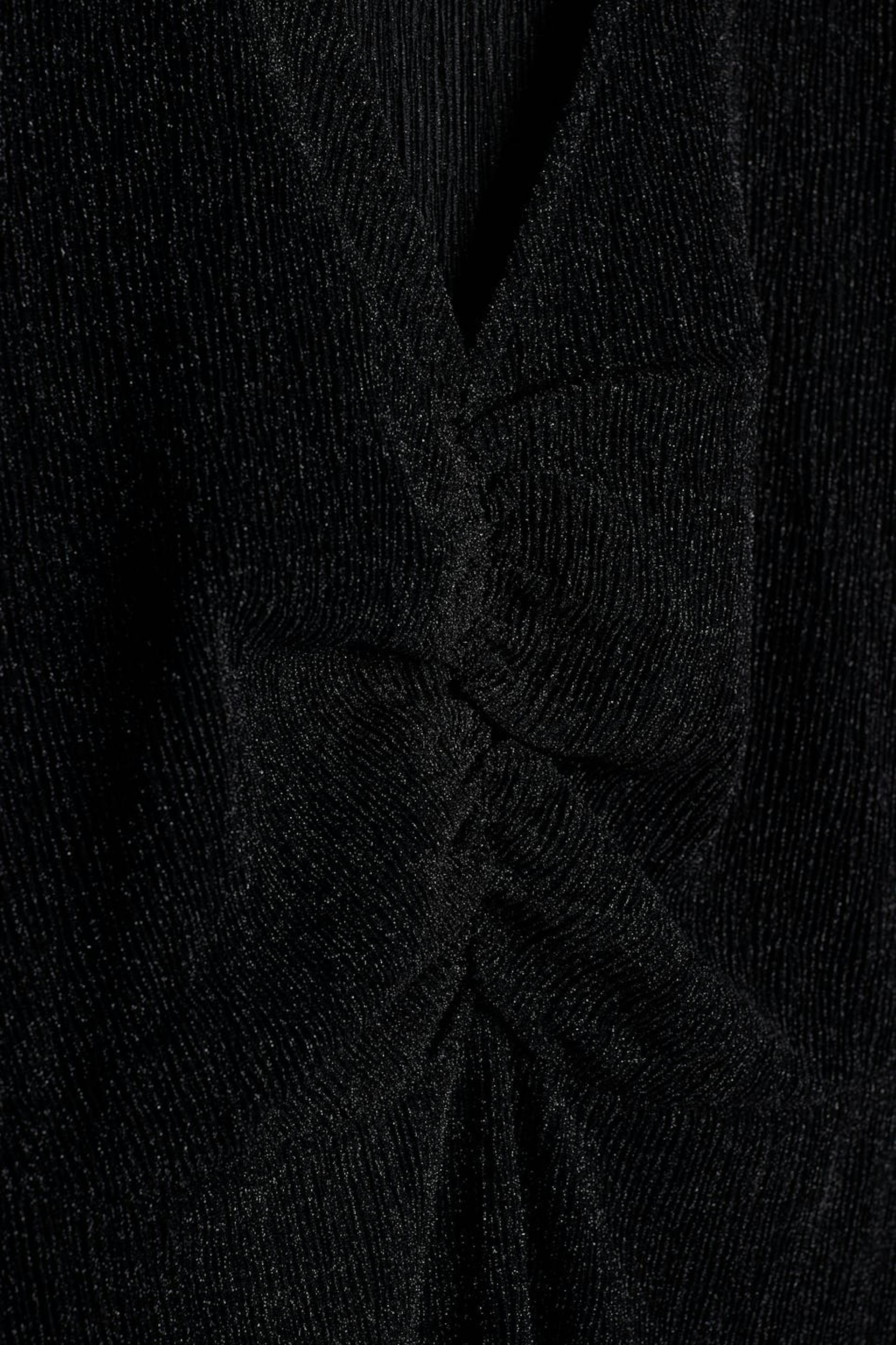 Glitrende kjole med en figursyet pasform. Perfekt til festen, sort, langærmet og læglængde. Den har en v-udskæring og en samling ved fronten.