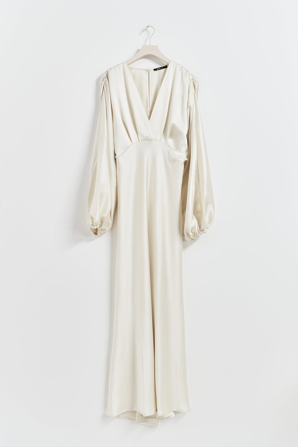 Lang satinkjole med voluminøst ærme. Satinkjolen er beige og har skinnende kvalitet. Den har løs pasform på toppen, figursyet nederdel og lynlås bagpå.