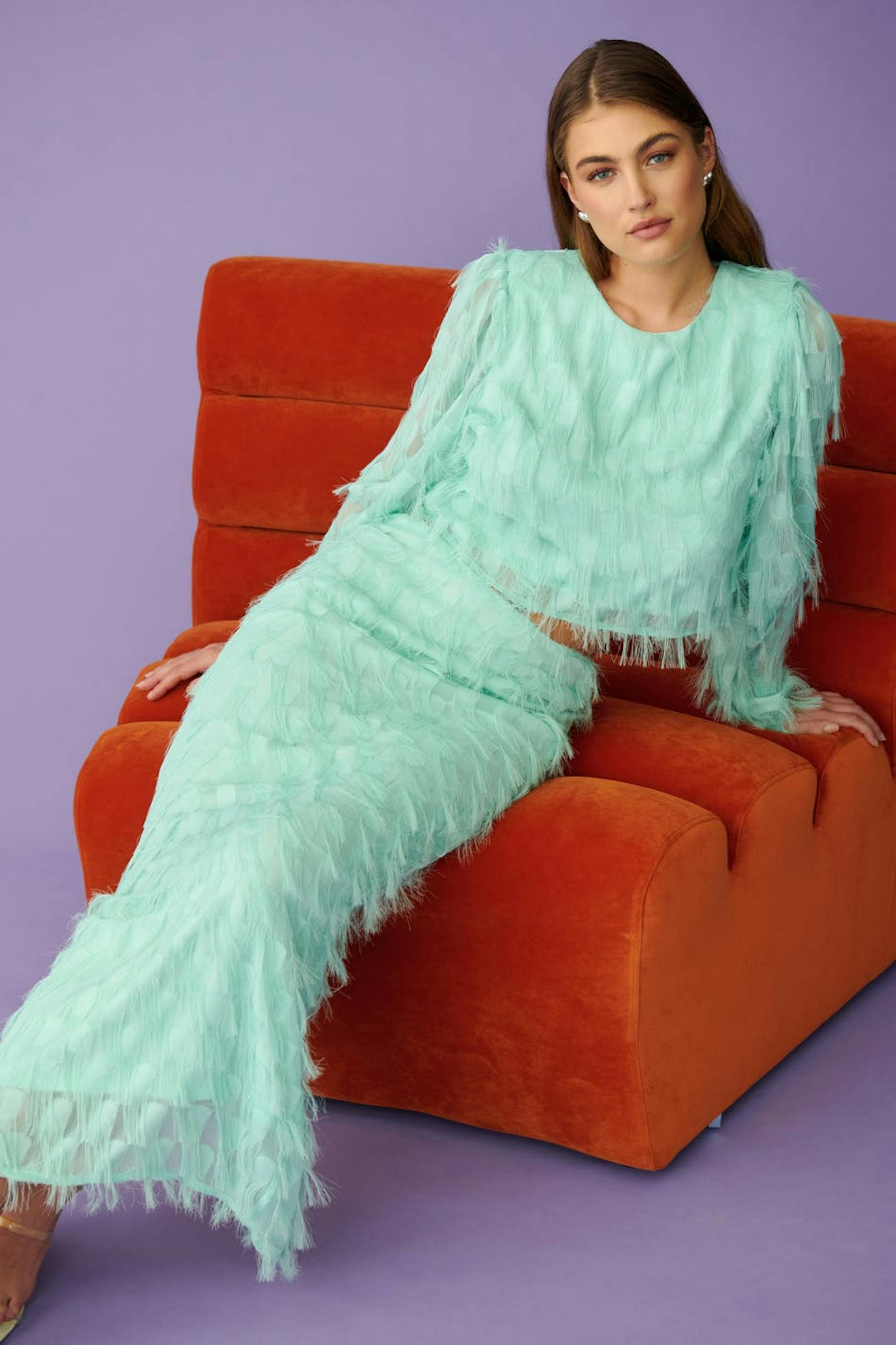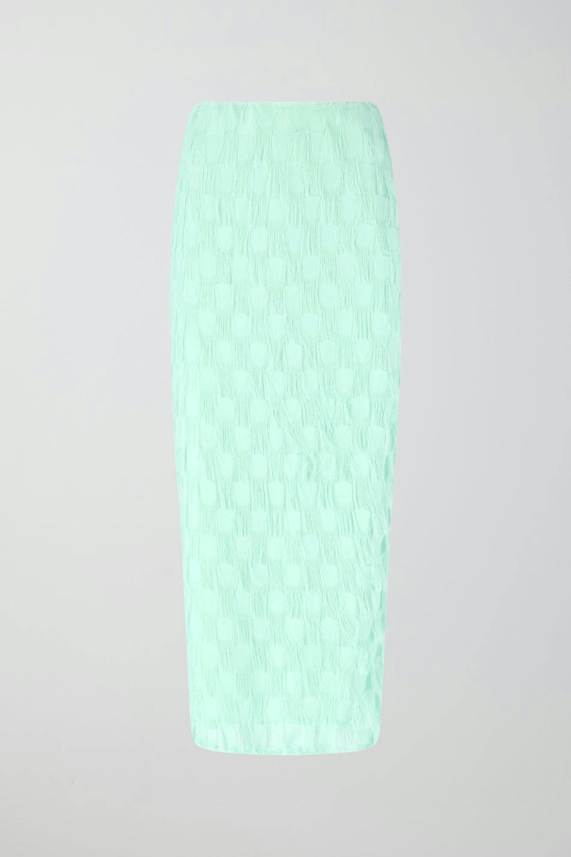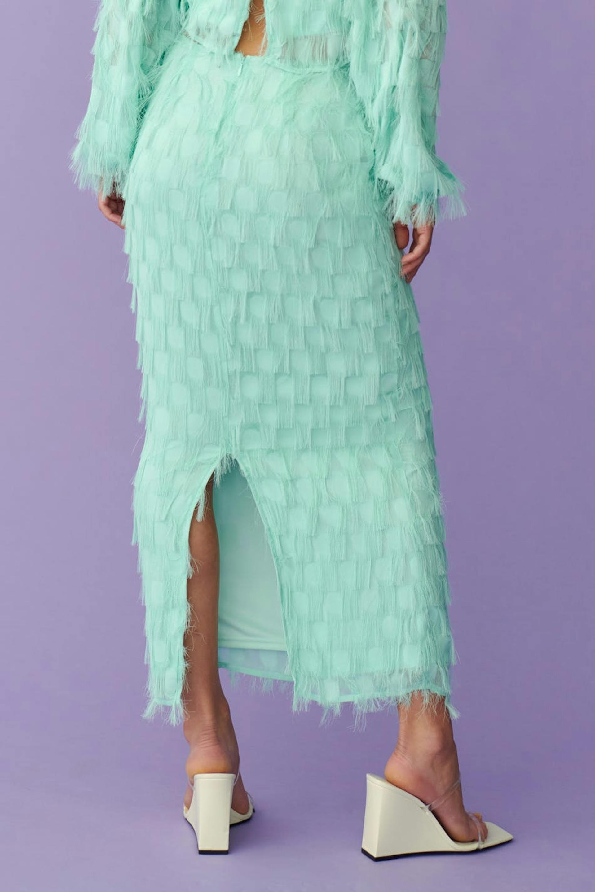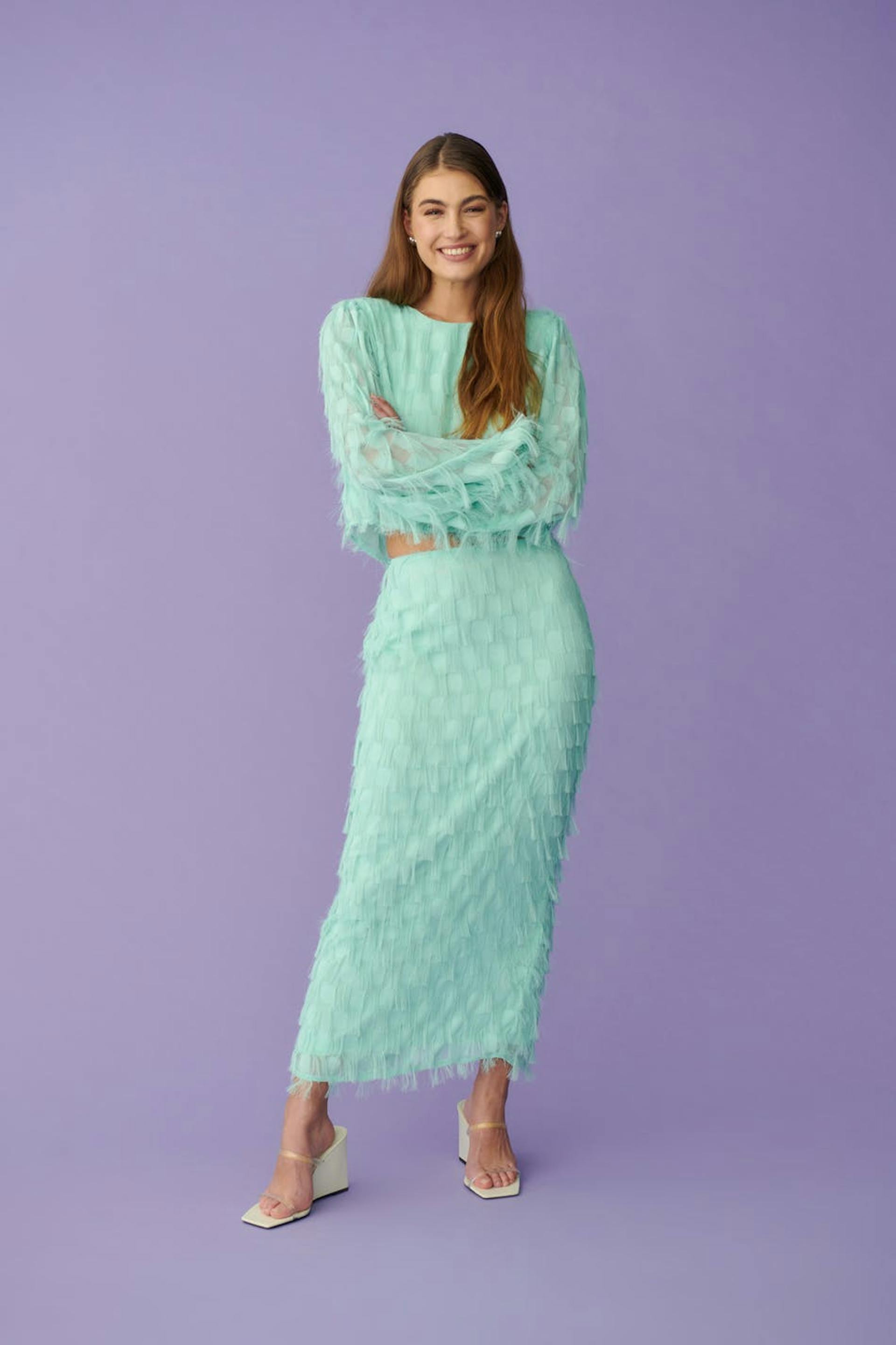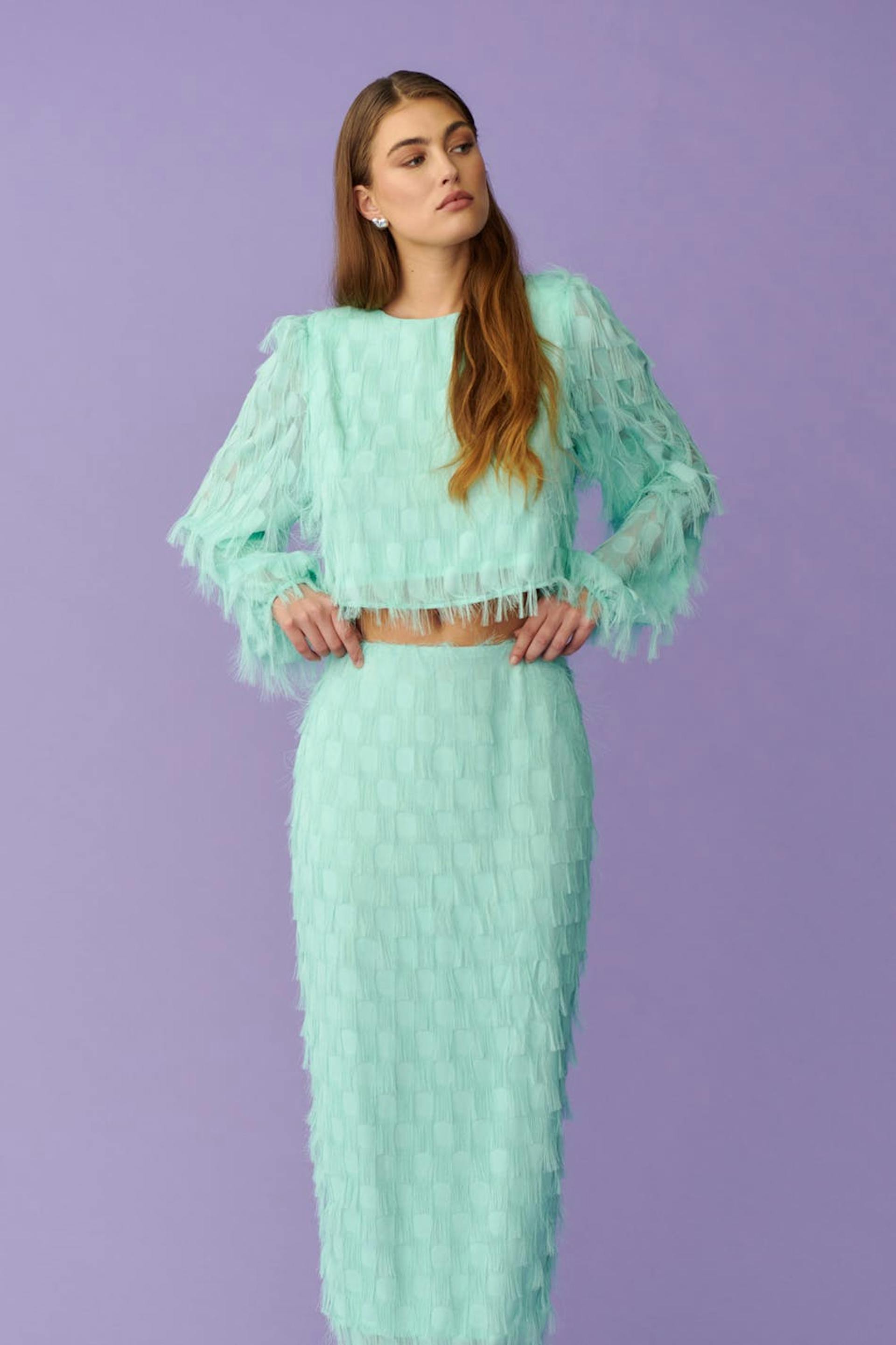 Lang nederdel med frynser. Nederdelen er perfekt til festen og blå og har figurnær pasform. Den har slids bagpå og lynlåslukning bagpå.