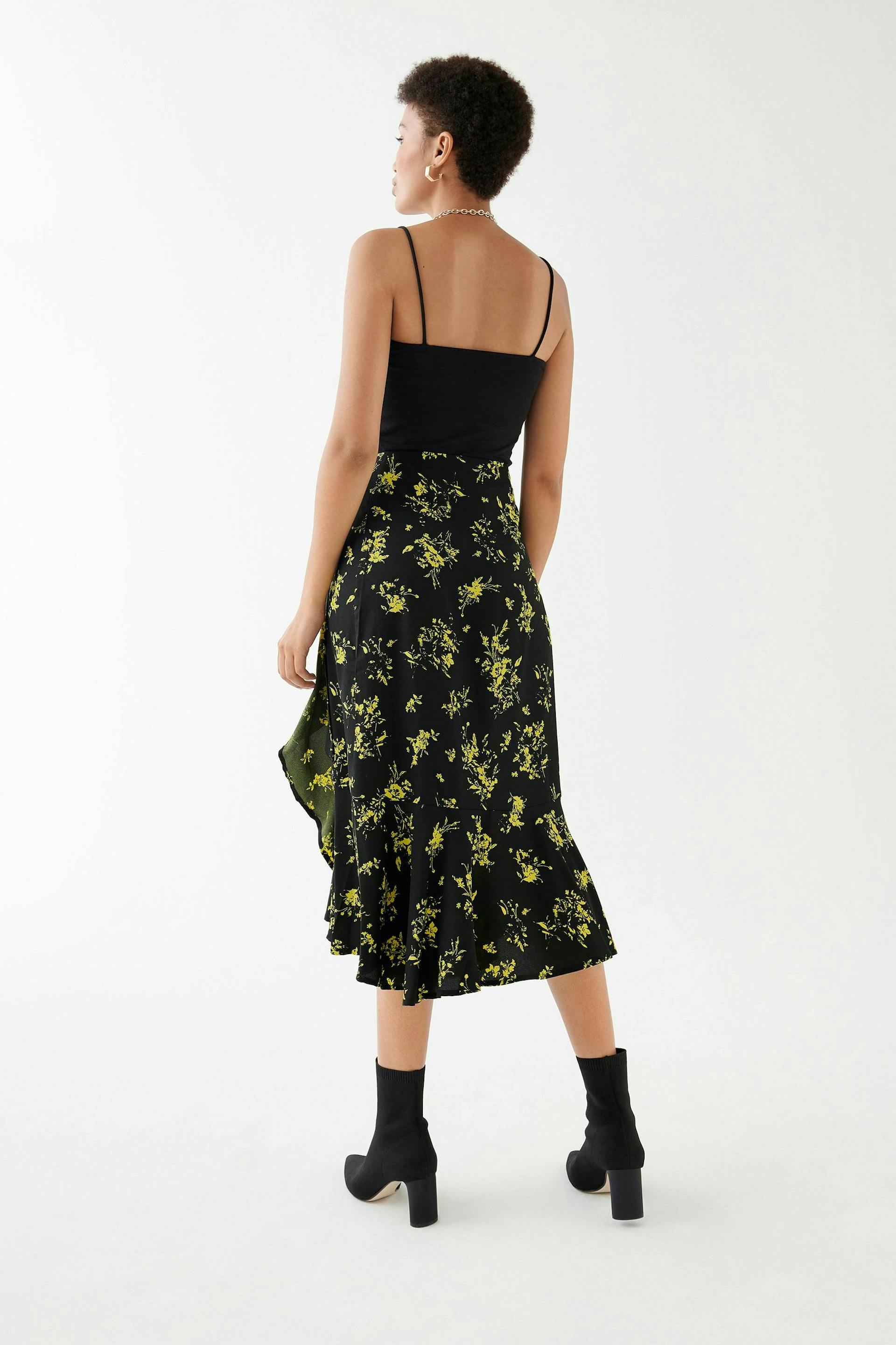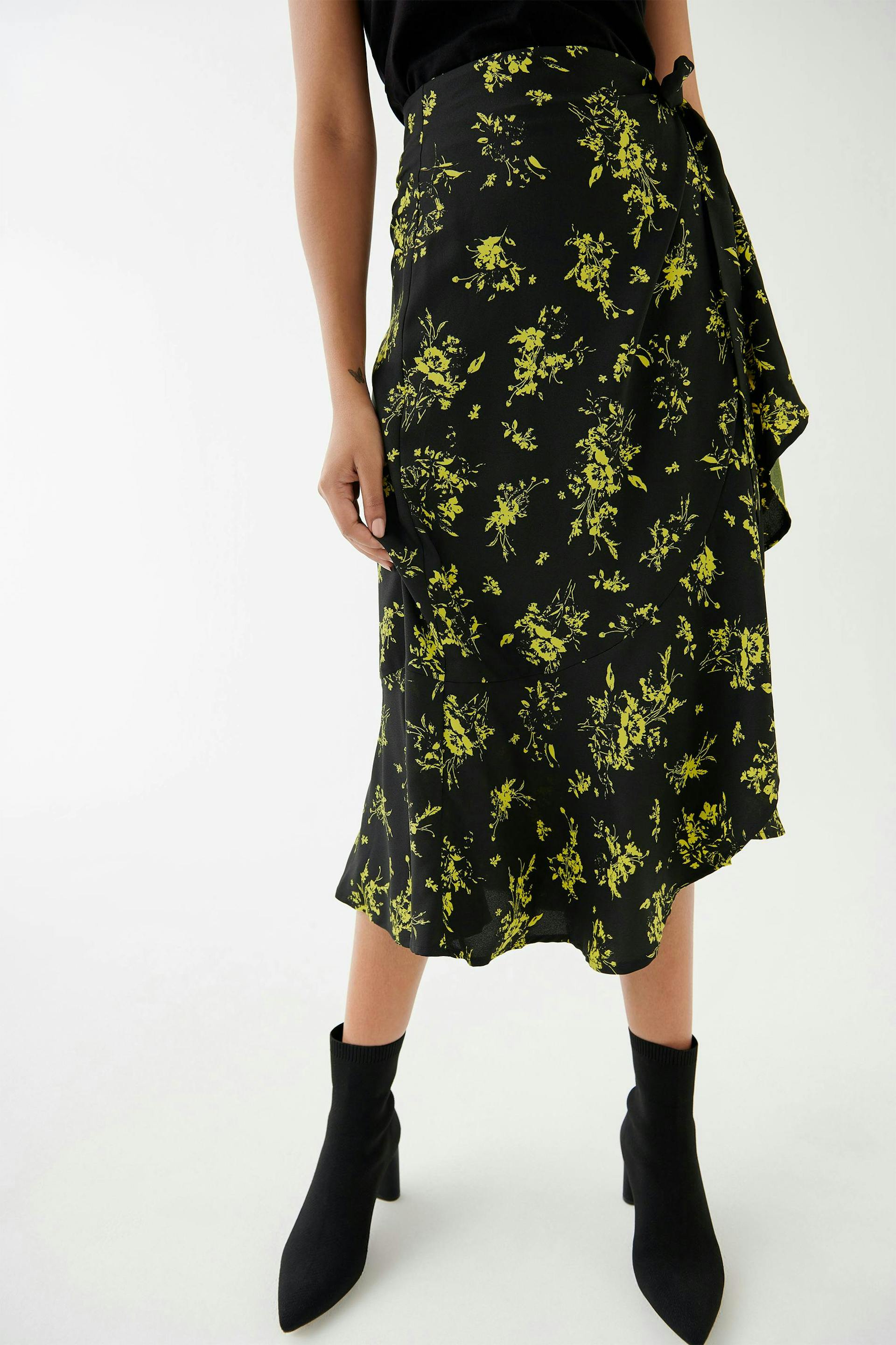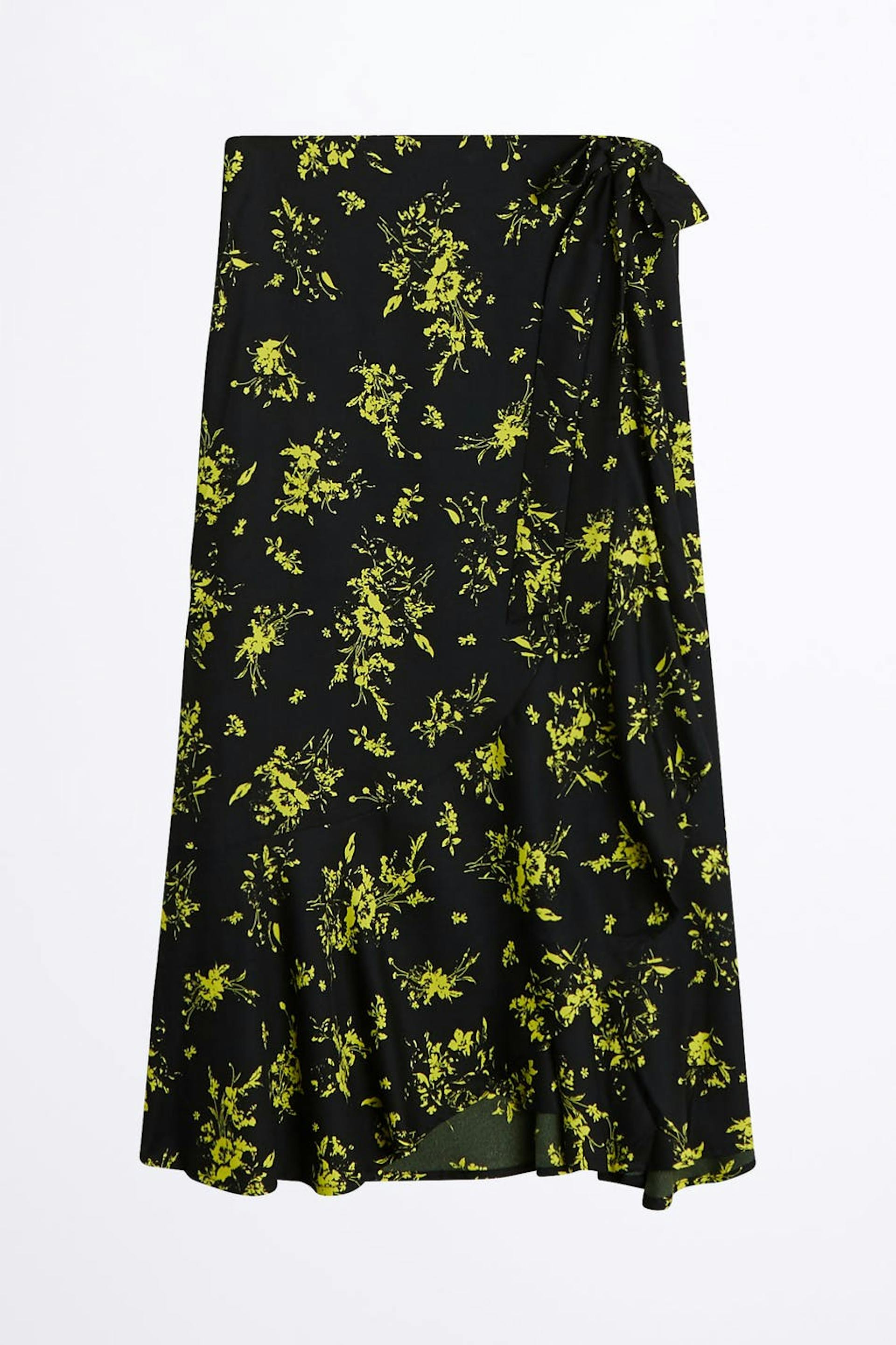 Slå-om nederdel med en normal pasform. Nederdelen er perfekt til festen, sort og gul. Den er fremstillet af satin og har en midilængde.