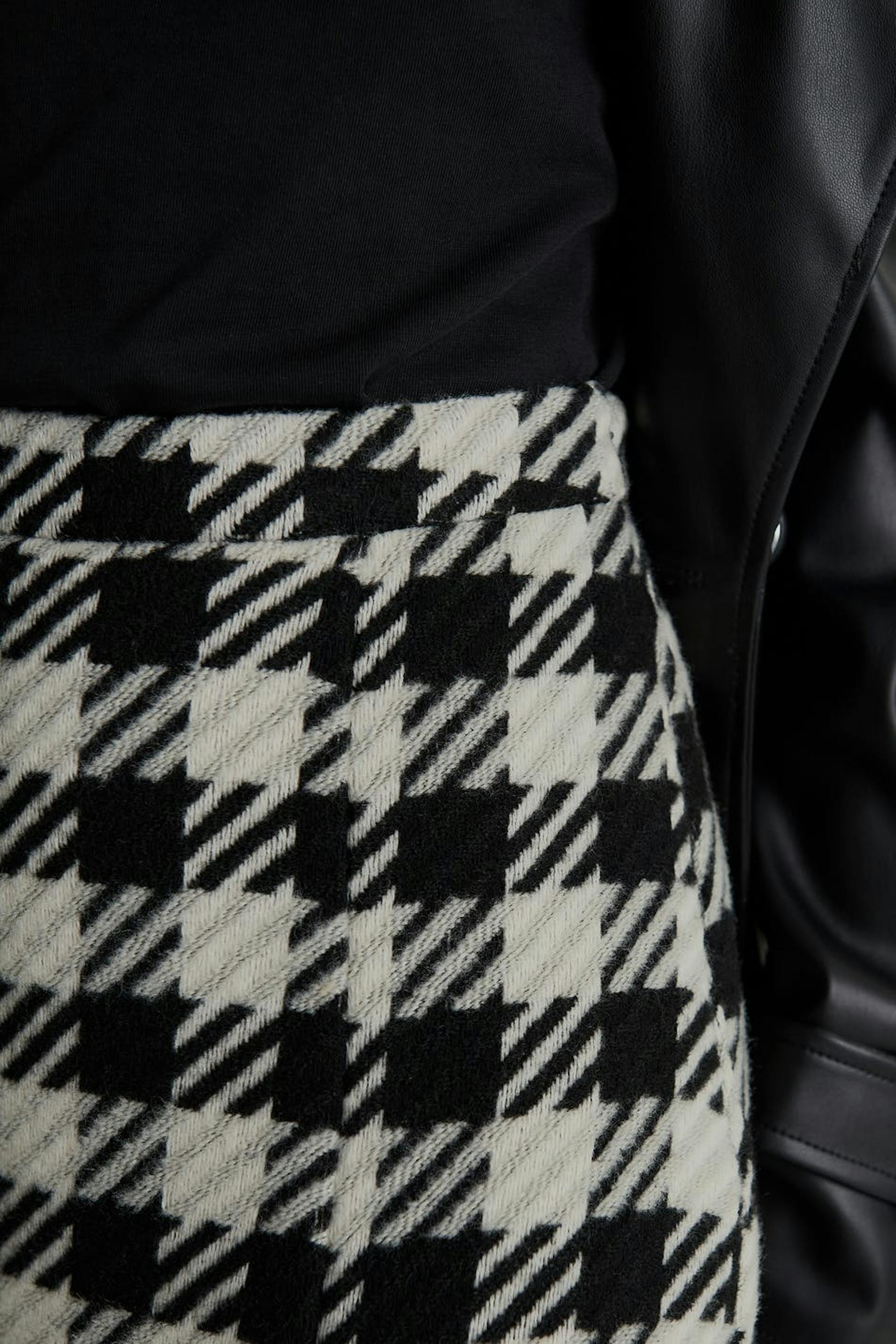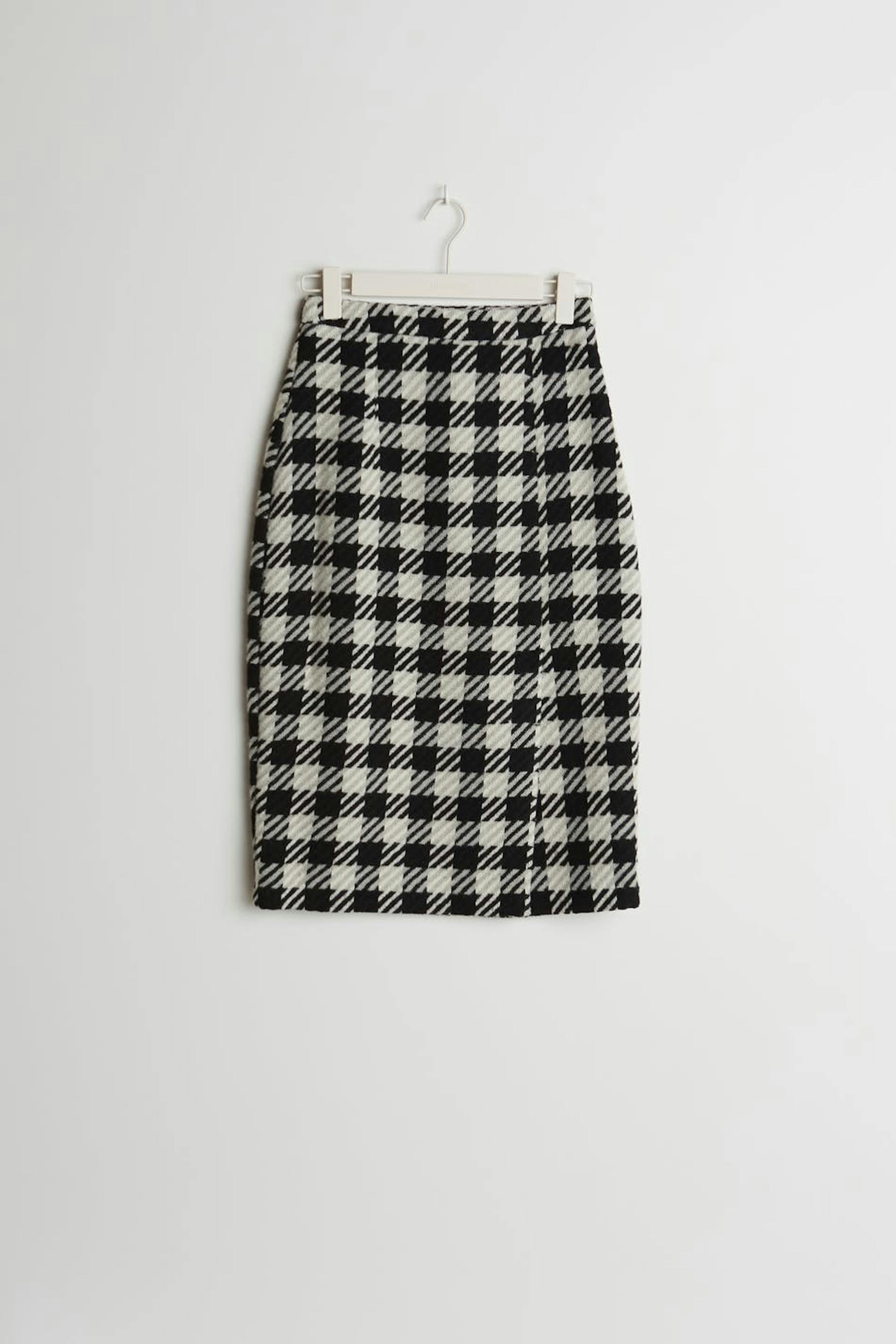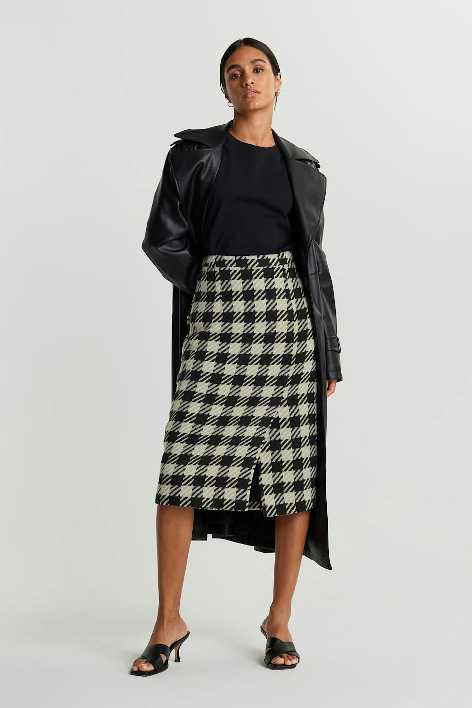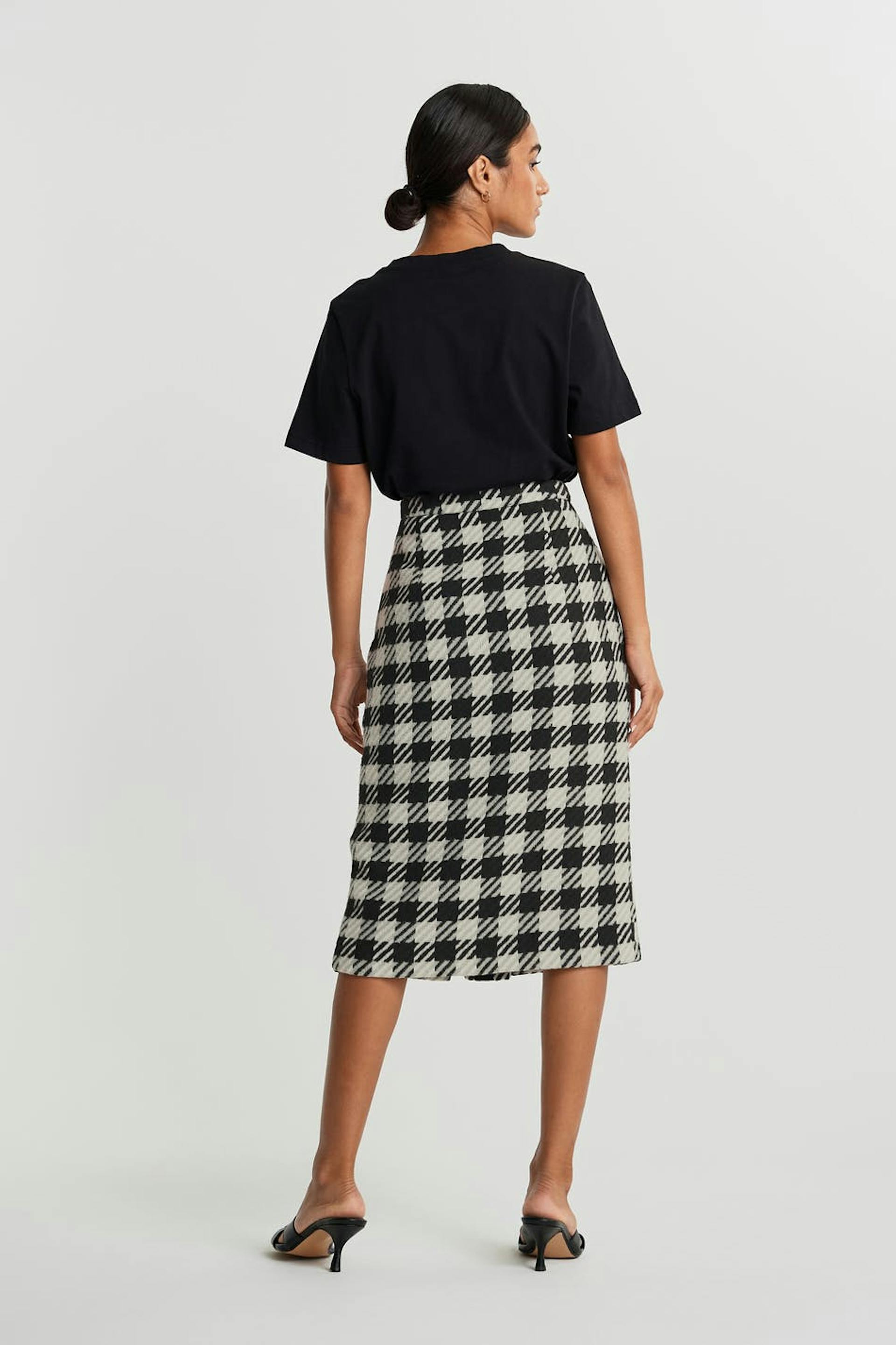 Ternet midi nederdel med en slids ved fronten. Nederdelen er sort og hvid.