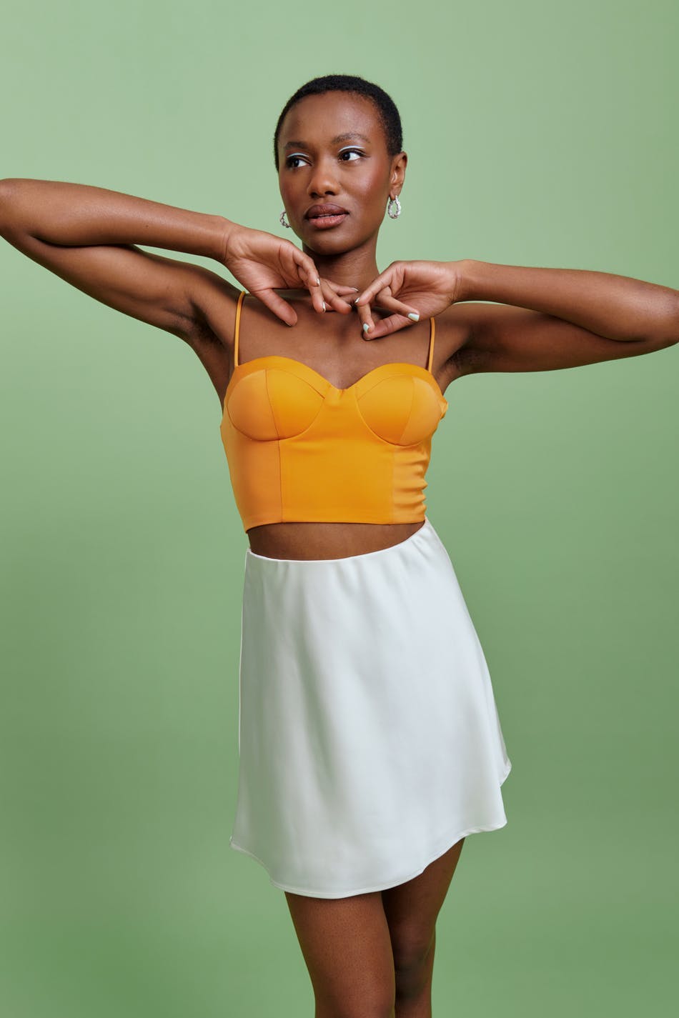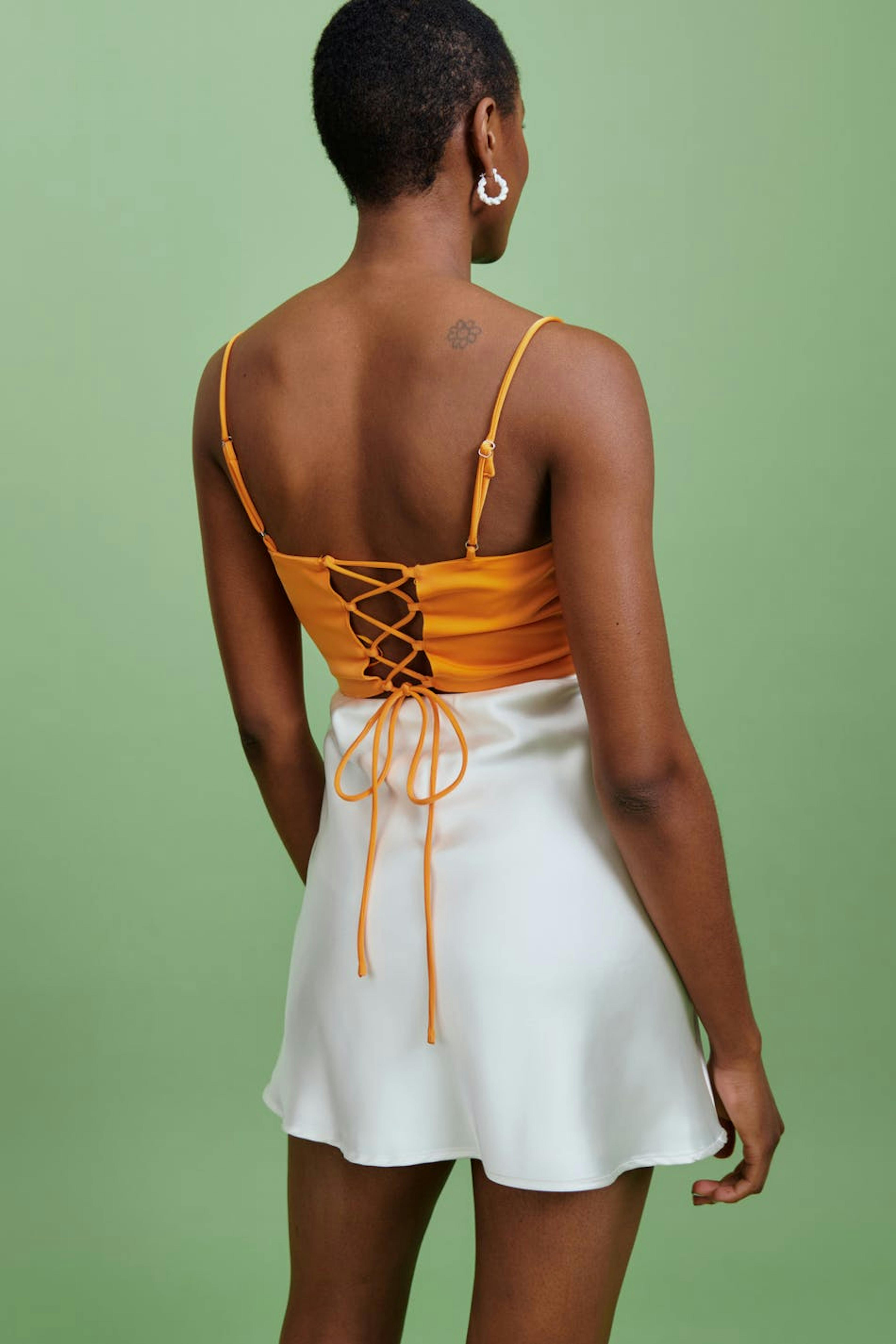 Kort satinkjole med elastik ved taljen. Nederdelen er hvid.