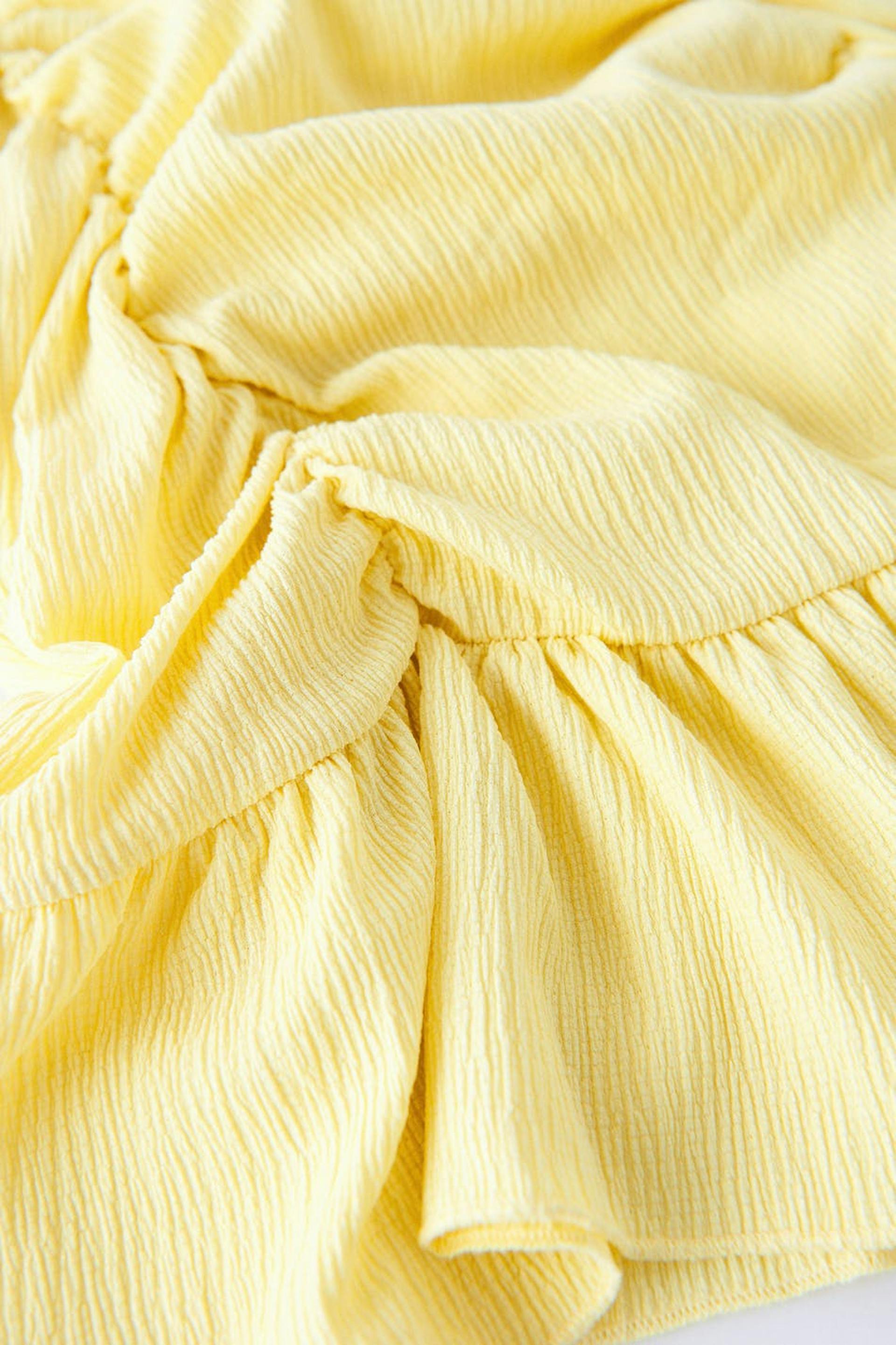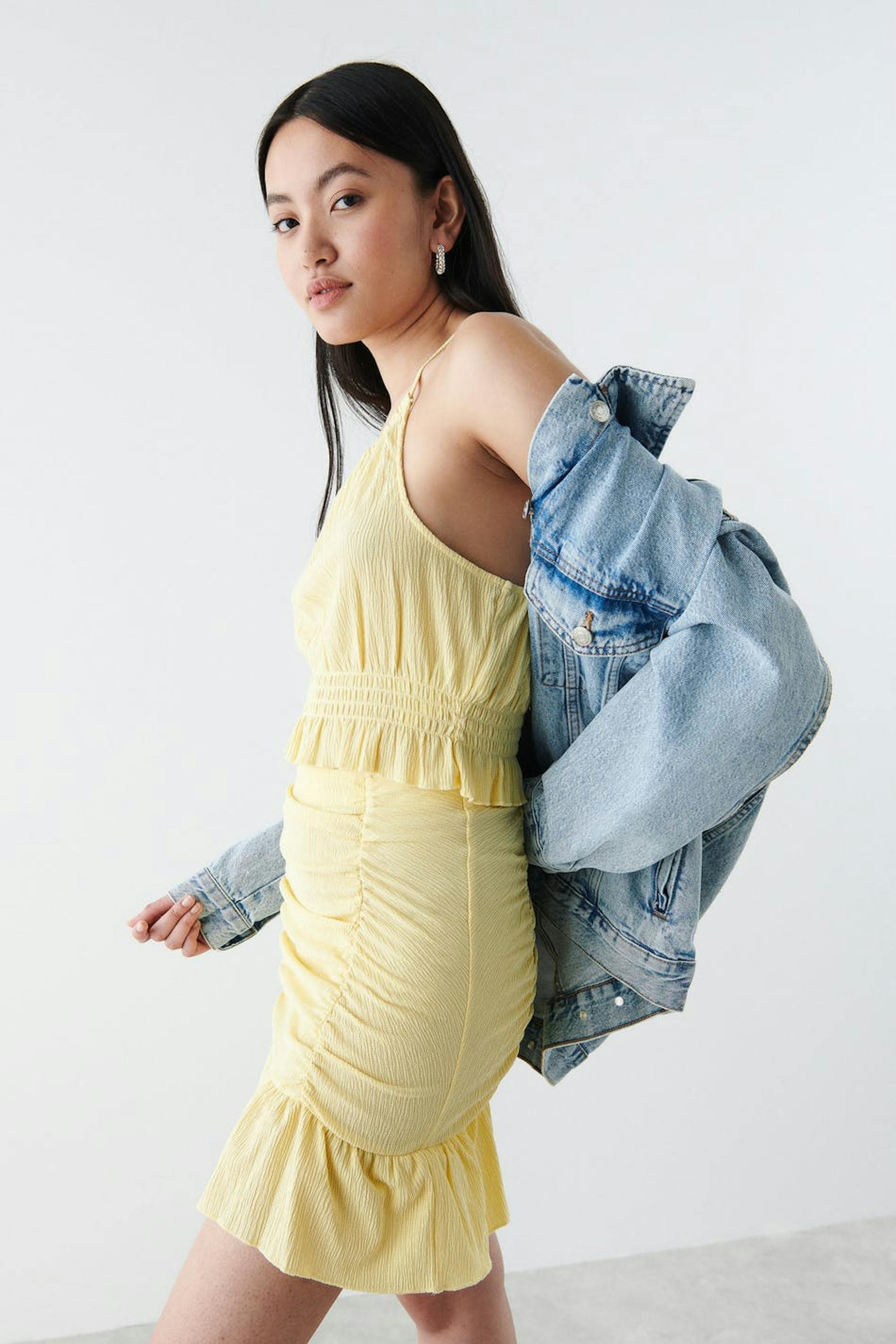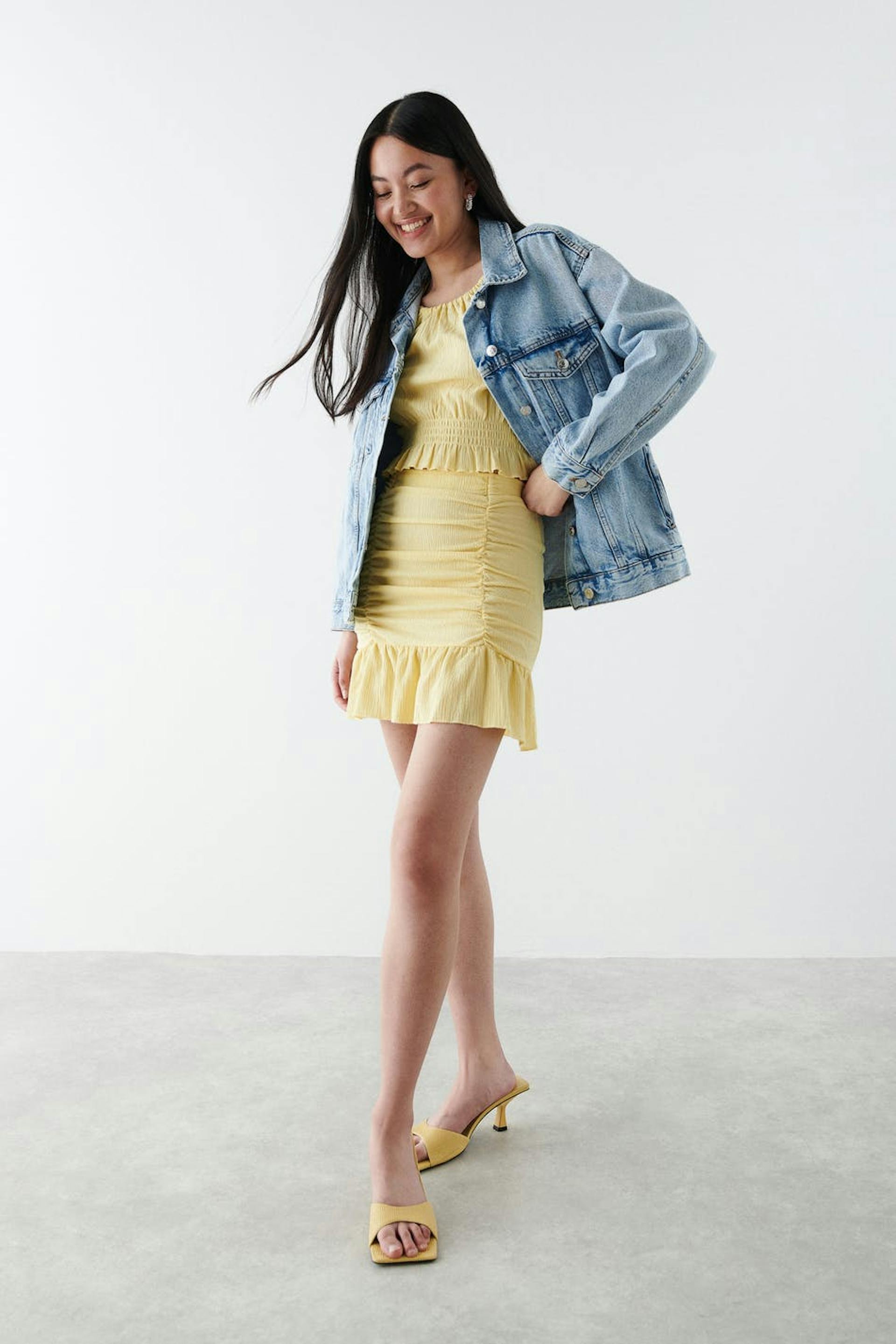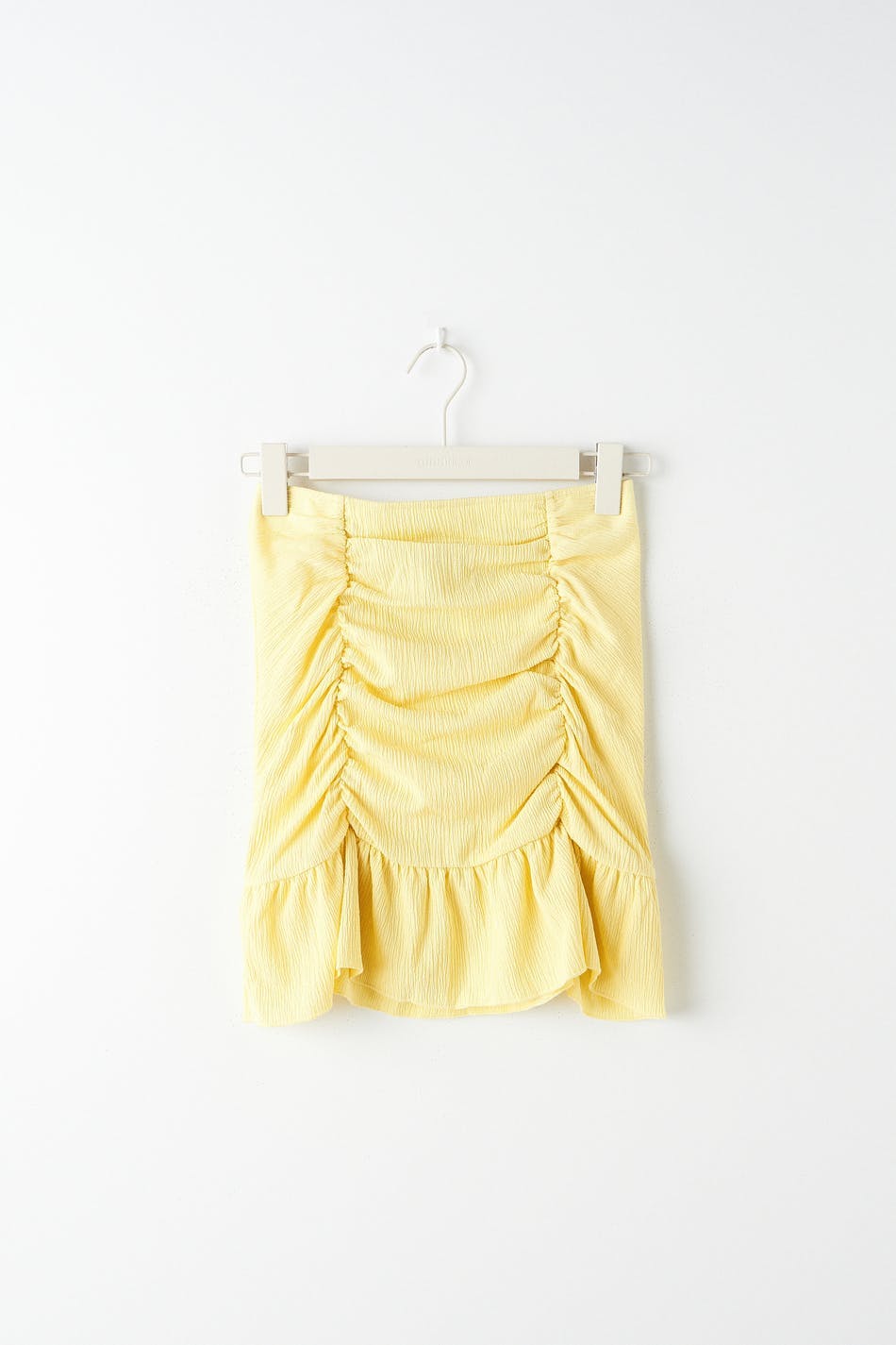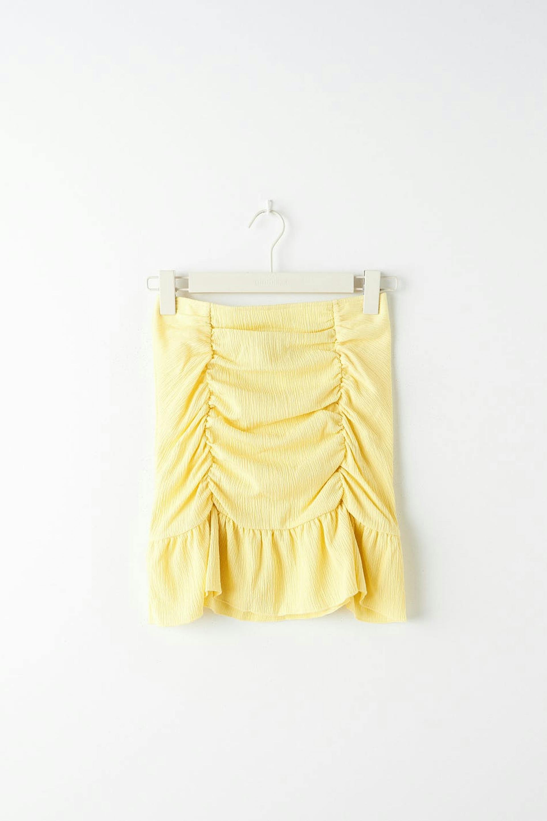 Kort nederdel i jersey med en figursyet pasform. Nederdelen er gul og har plisseringer ved fronten. Den har en volant nederst og en elastisk talje.