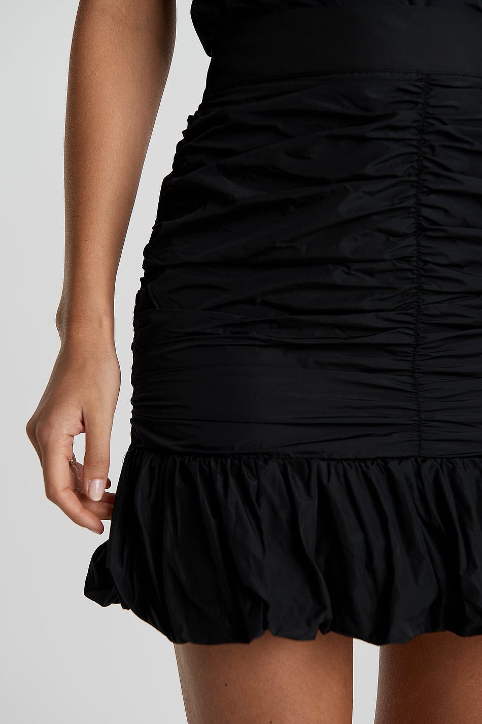 Nederdel med en normal pasform. Nederdelen er perfekt til festen og sort og har en volant ved sømmen. Den har en lynlås på siden.