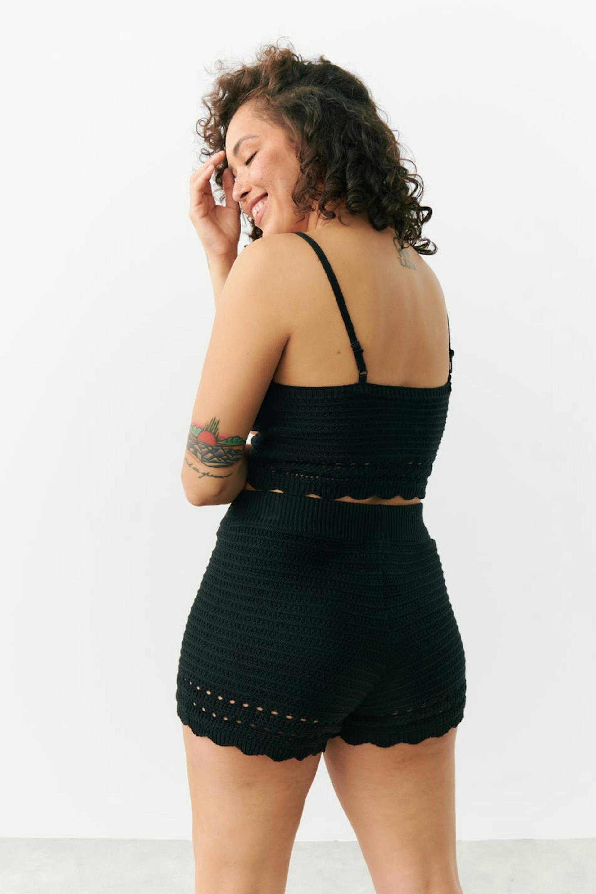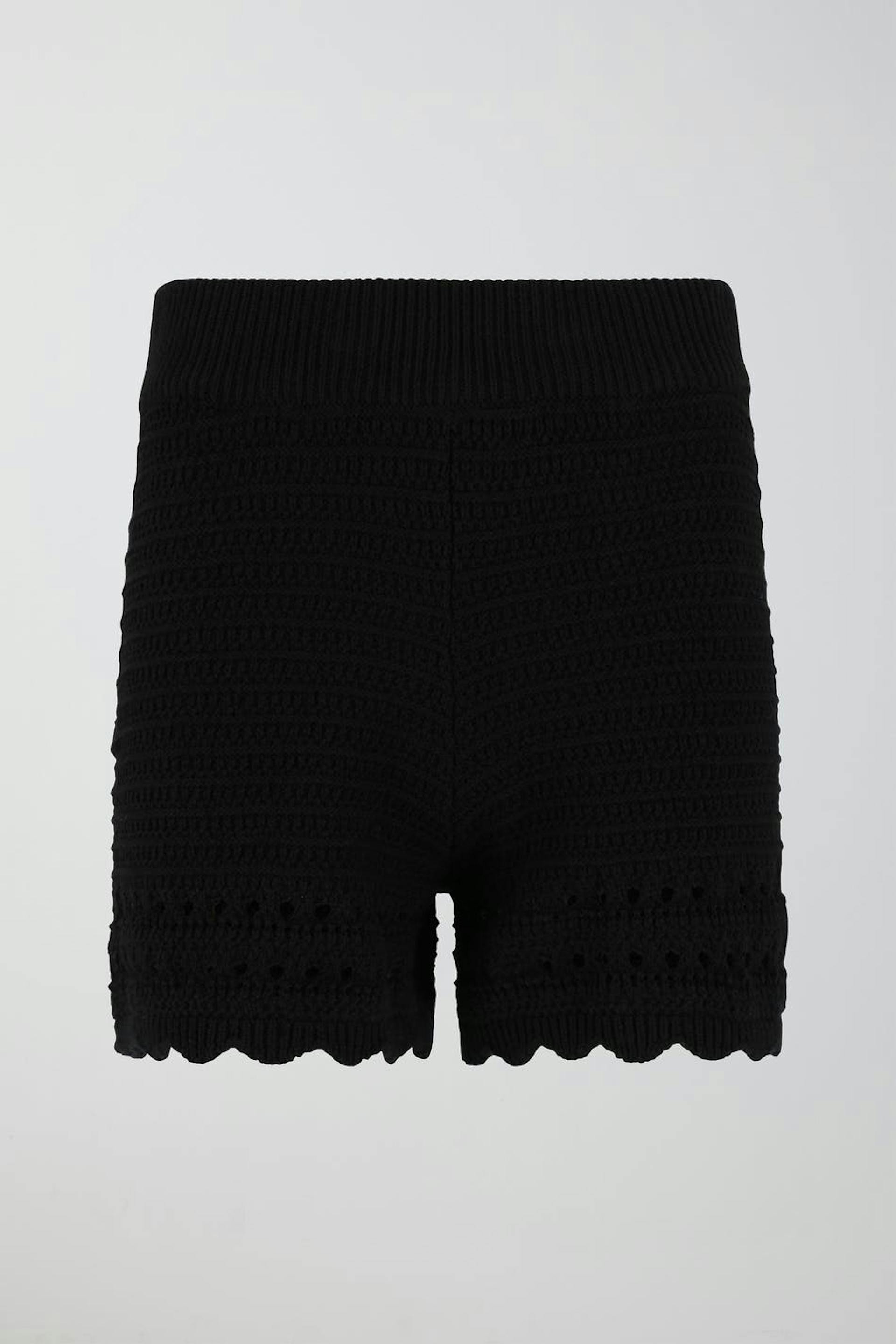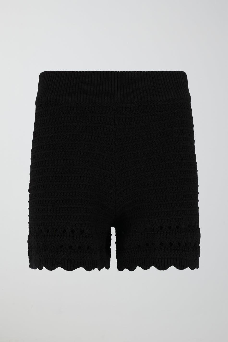 Strikket shorts med elastik ved taljen. Shortsene er sort og har dekorativ muslingekant nederst.