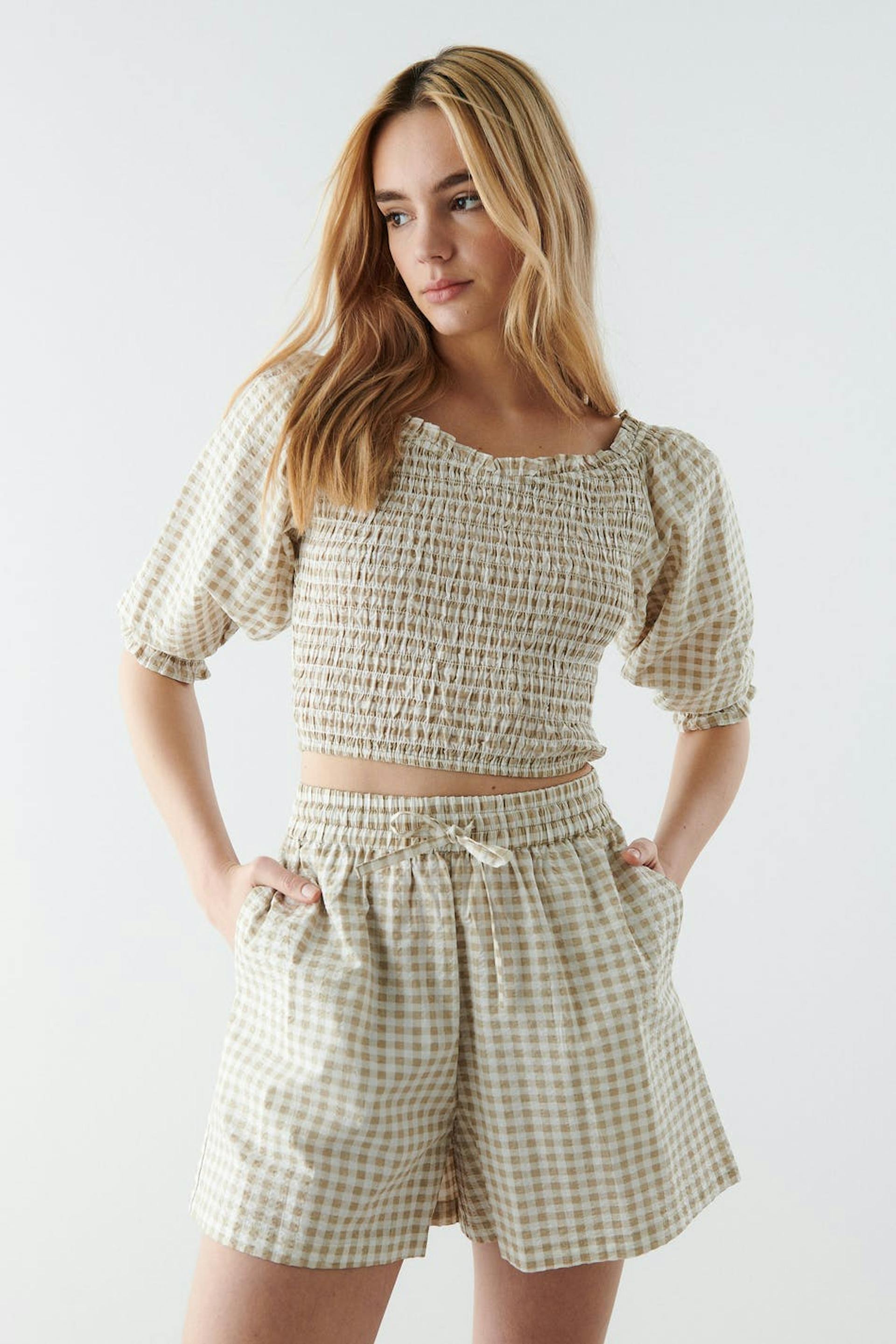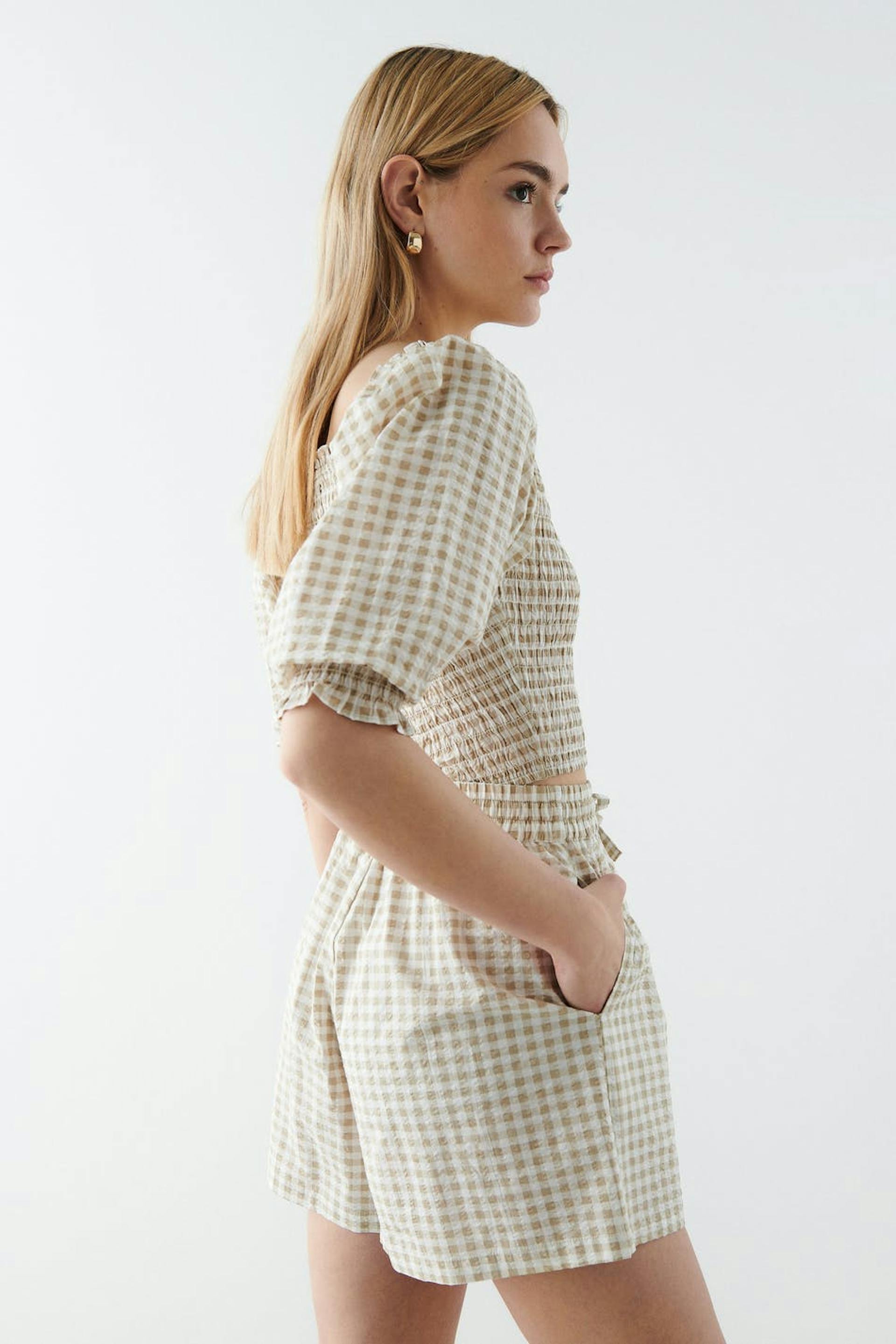 Shorts med en justérbar træksnørre ved taljen. Shortsene er beige og har sidelommer.