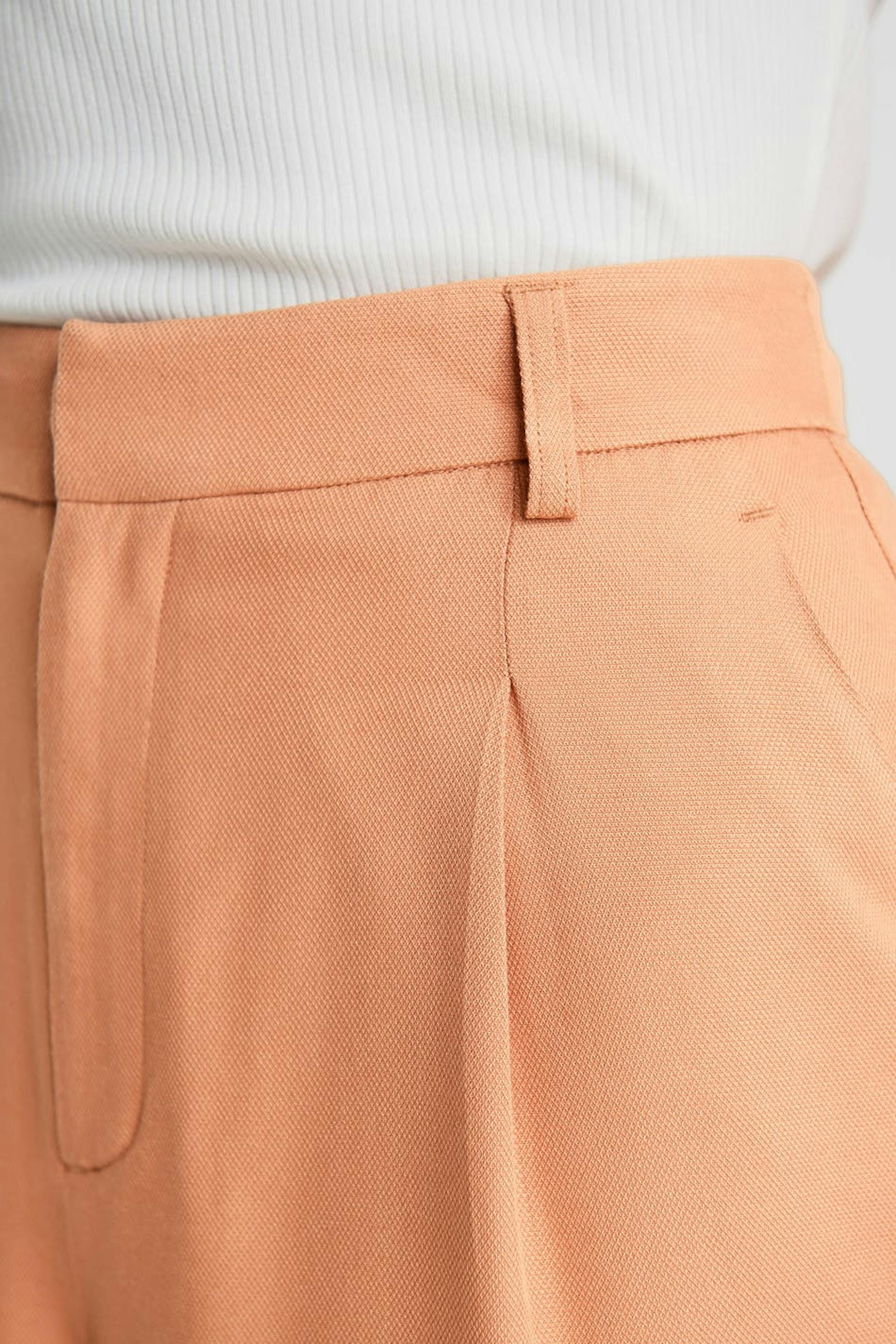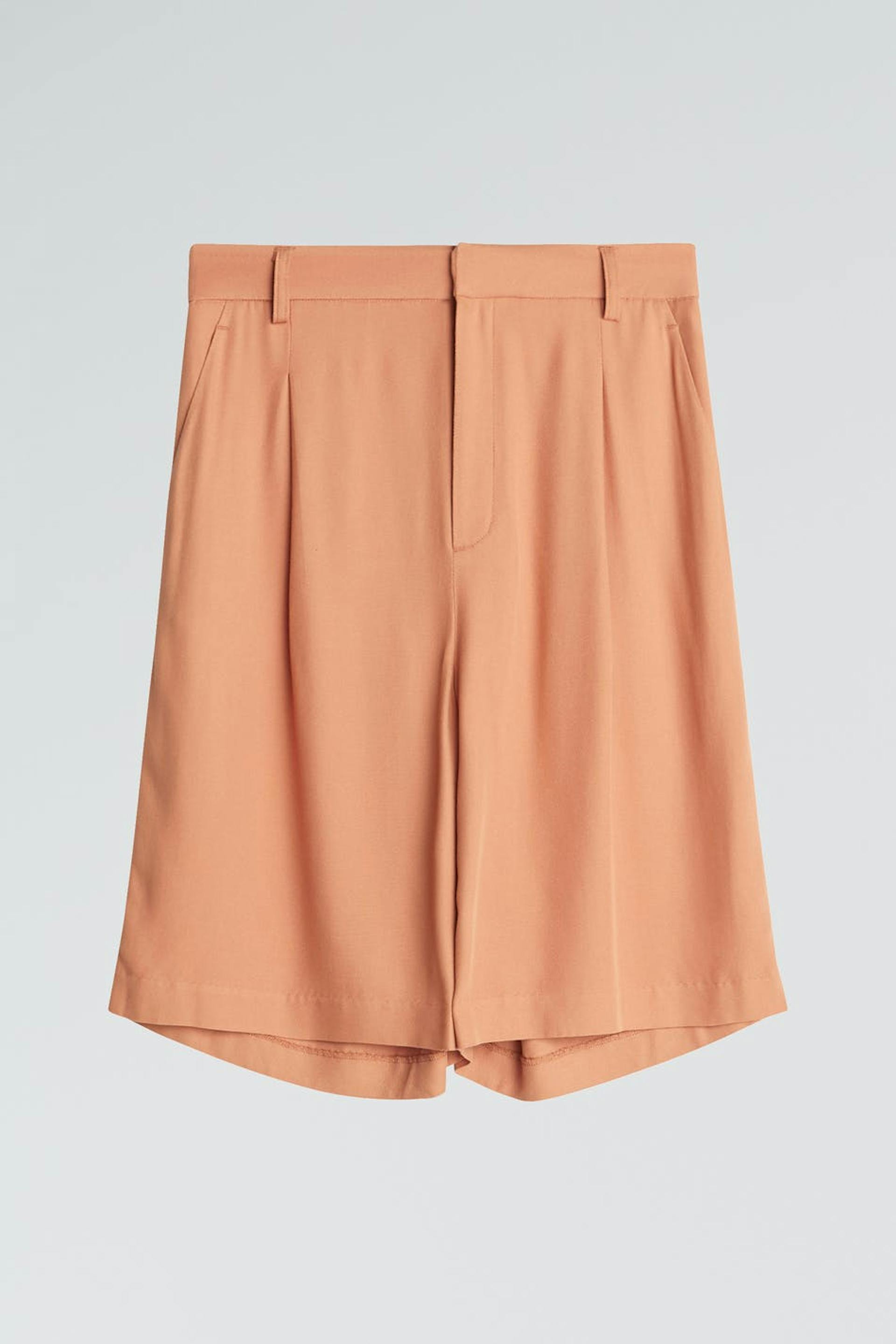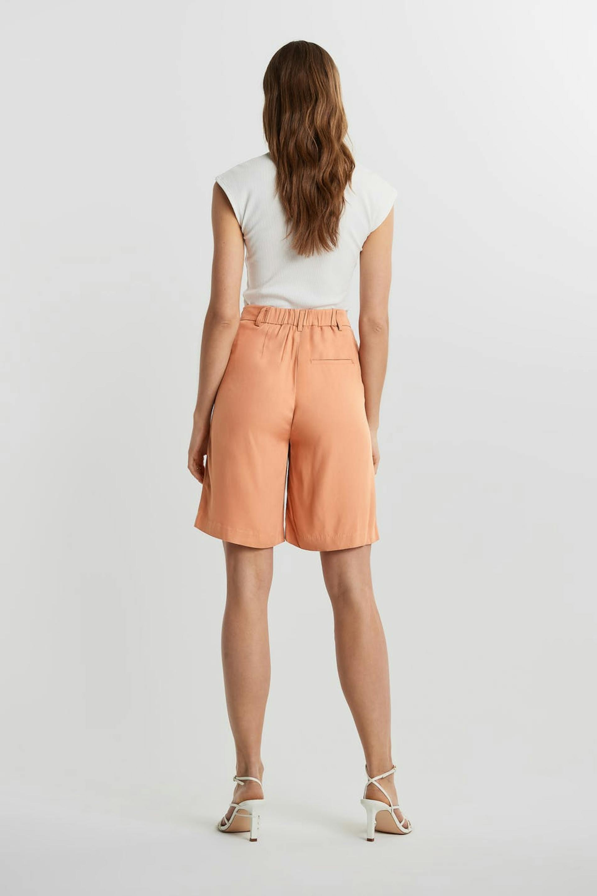 Bermudashorts med rynkedetalje ved fronten. Shortsene er orange og har brede ben. Det har et elastisk bånd ved bagsiden.