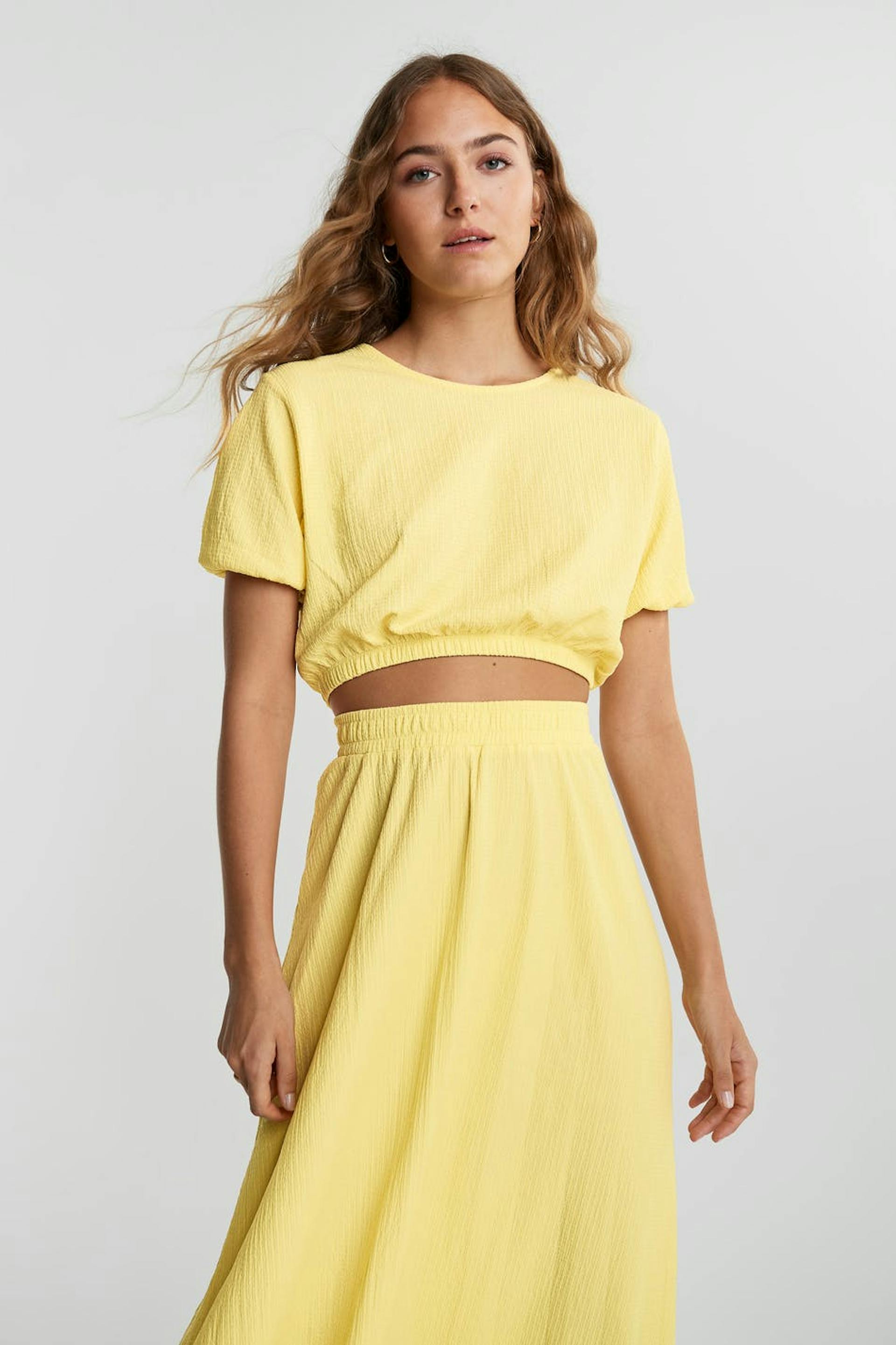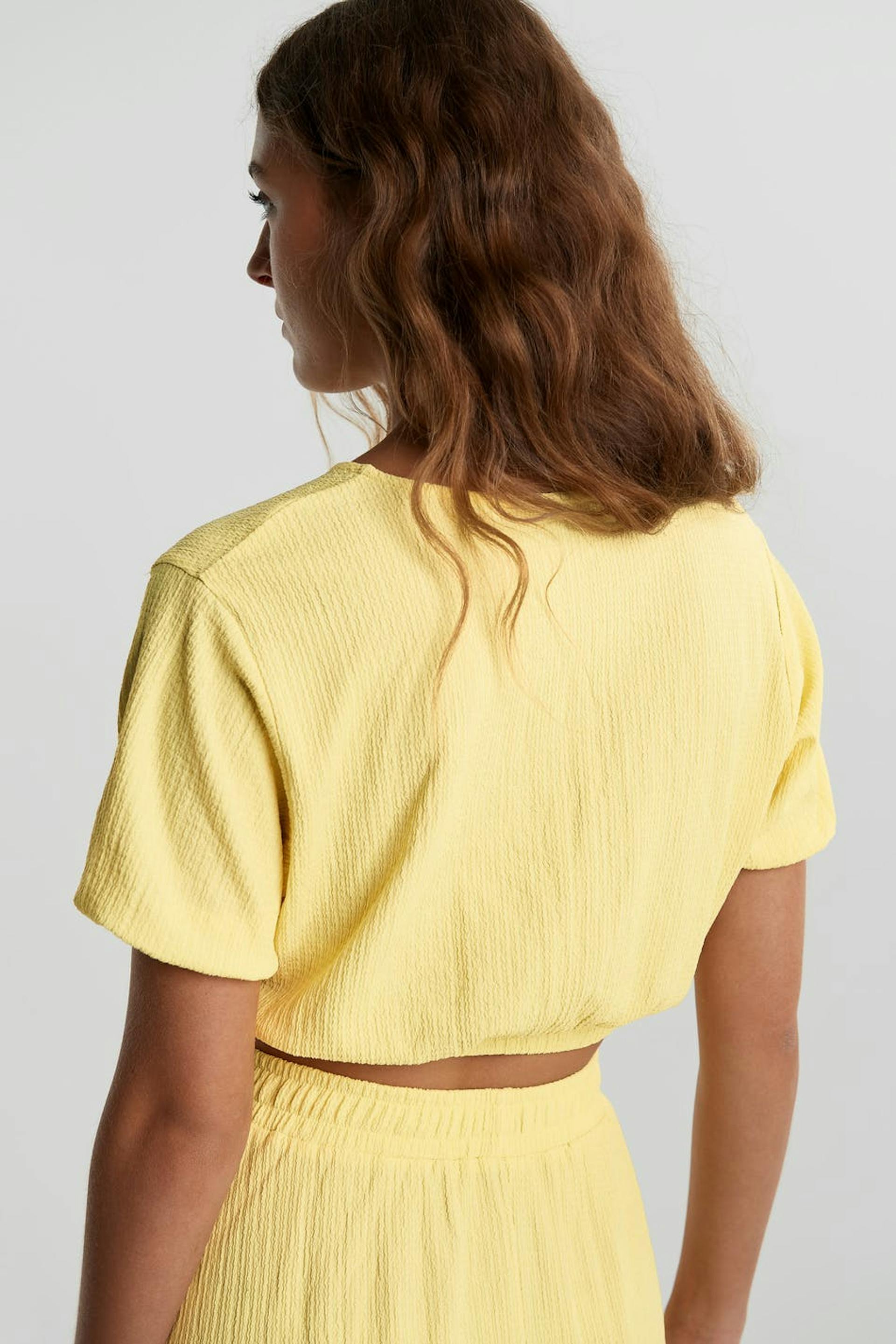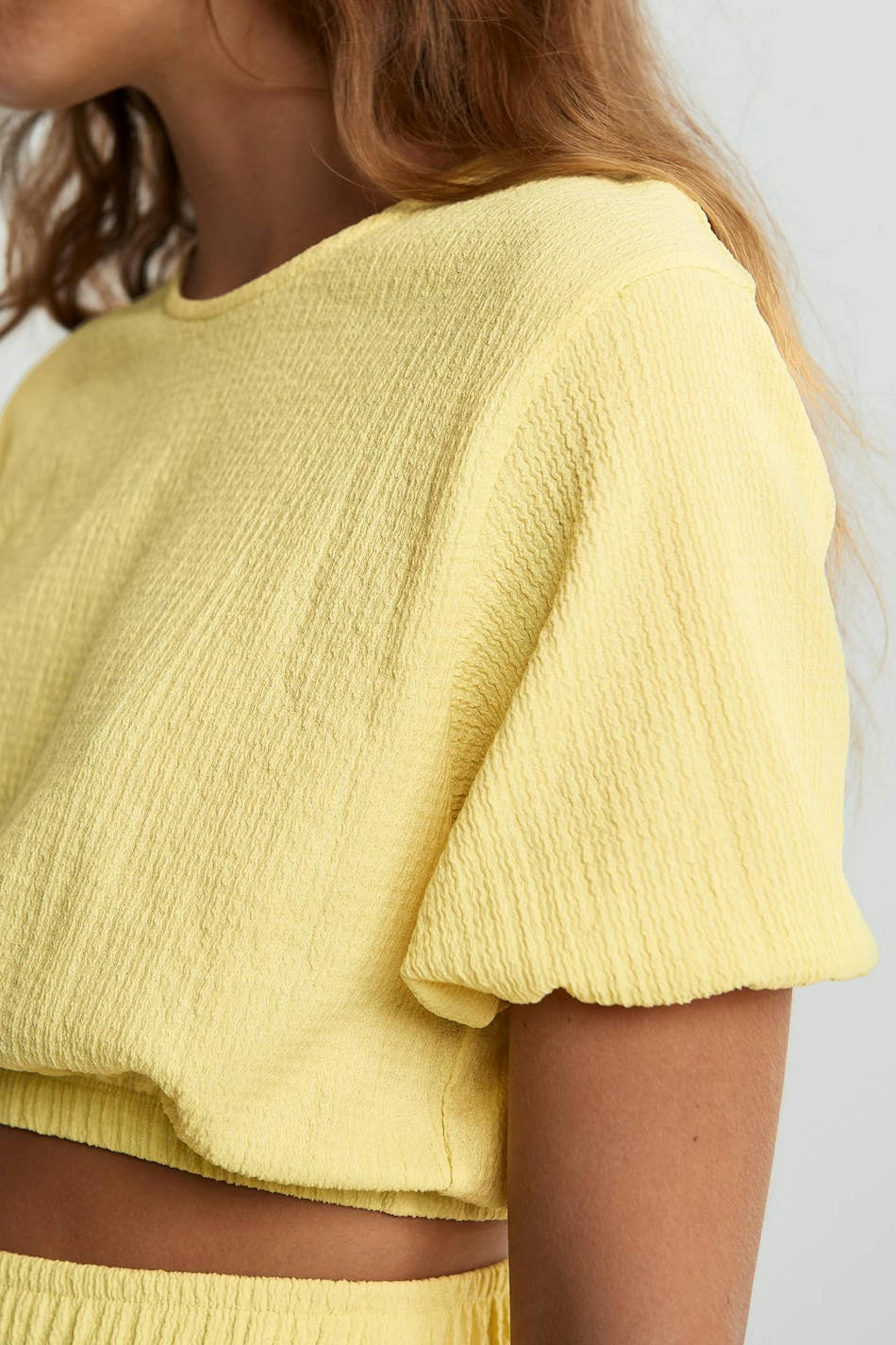 Kortærmet top med en normal pasform. Toppen er gul og har en croppet længde med et elastisk bånd nederst.