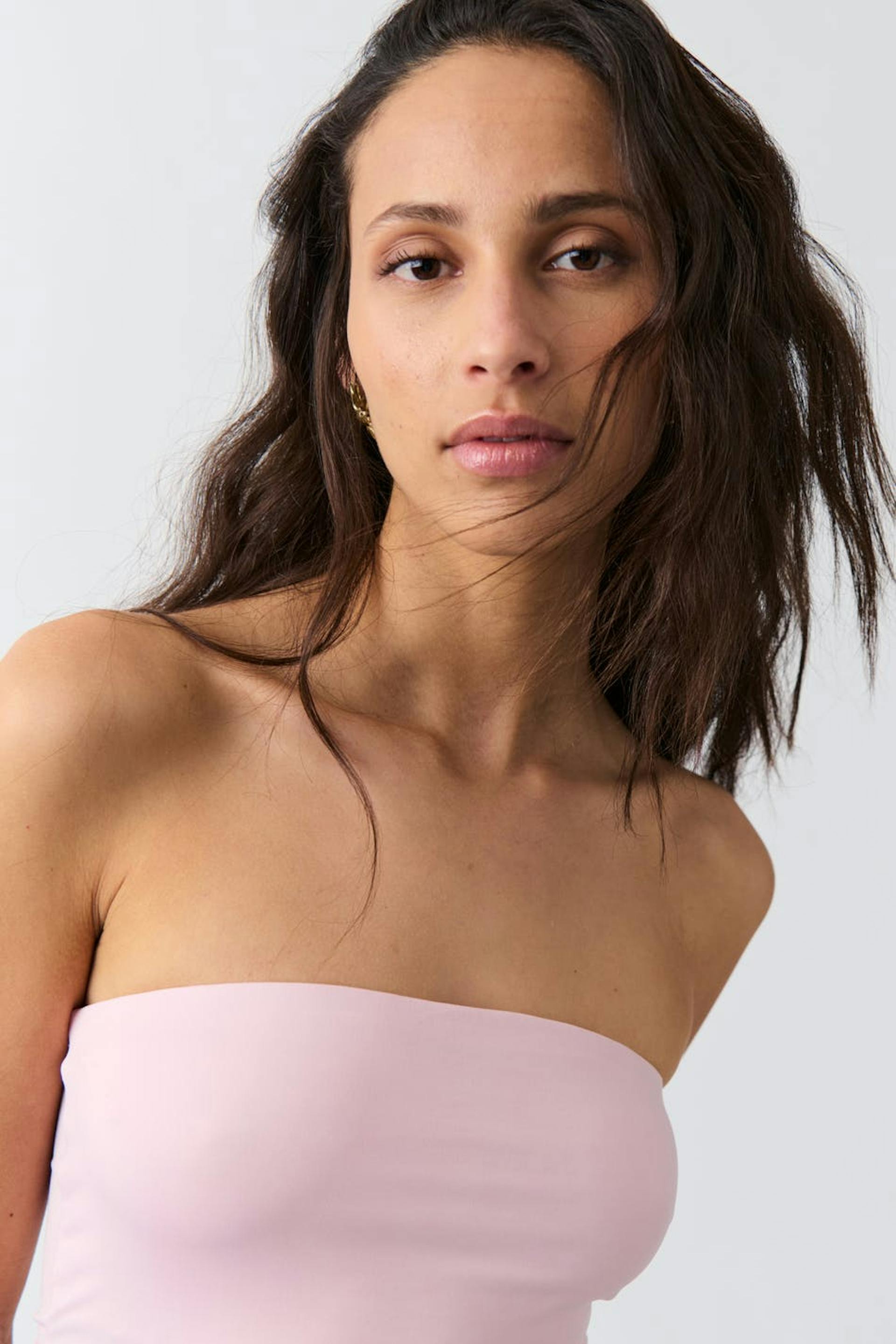 Tubetop i jersey med figurnær pasform. Toppen er pink og har elastisk kvalitet.