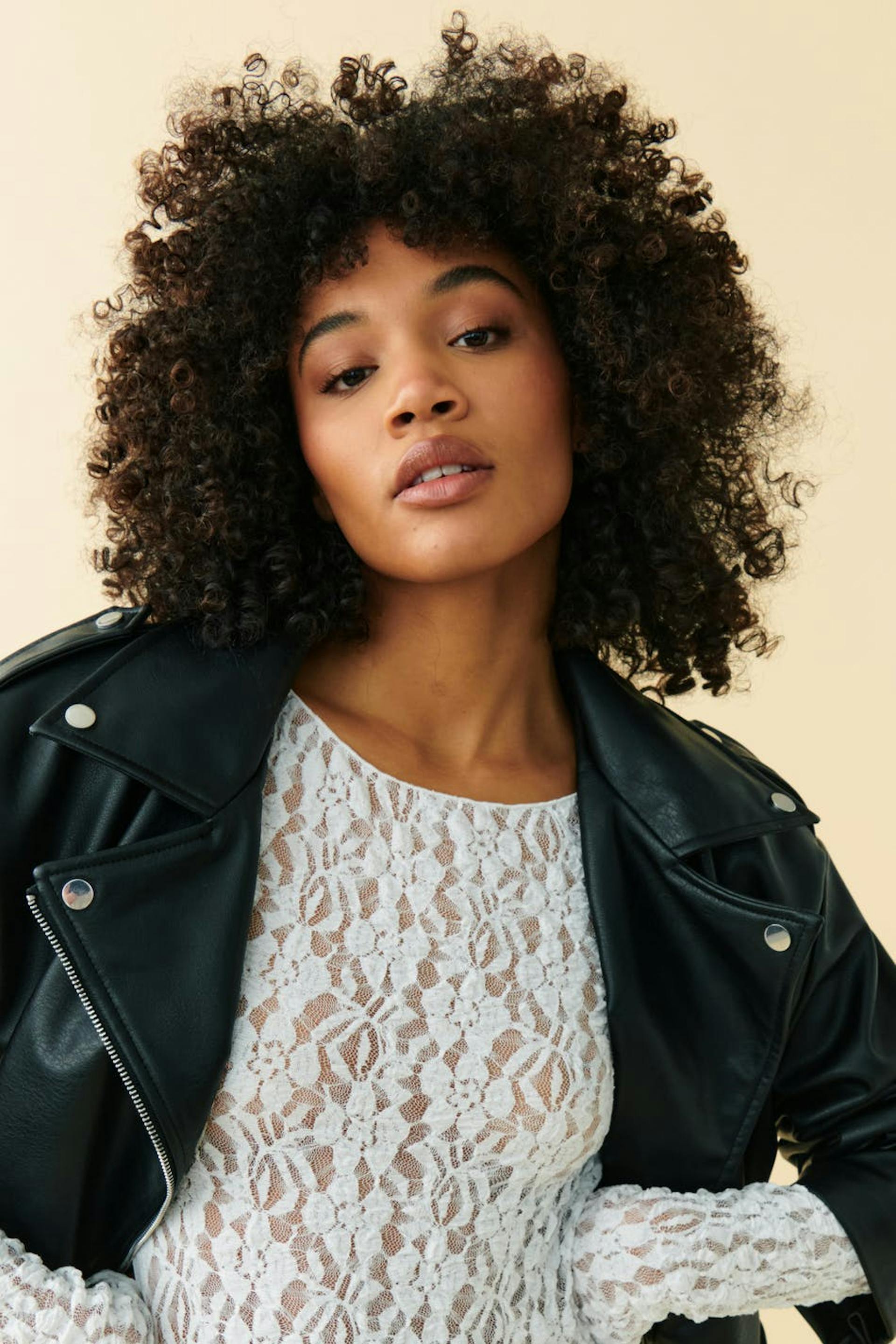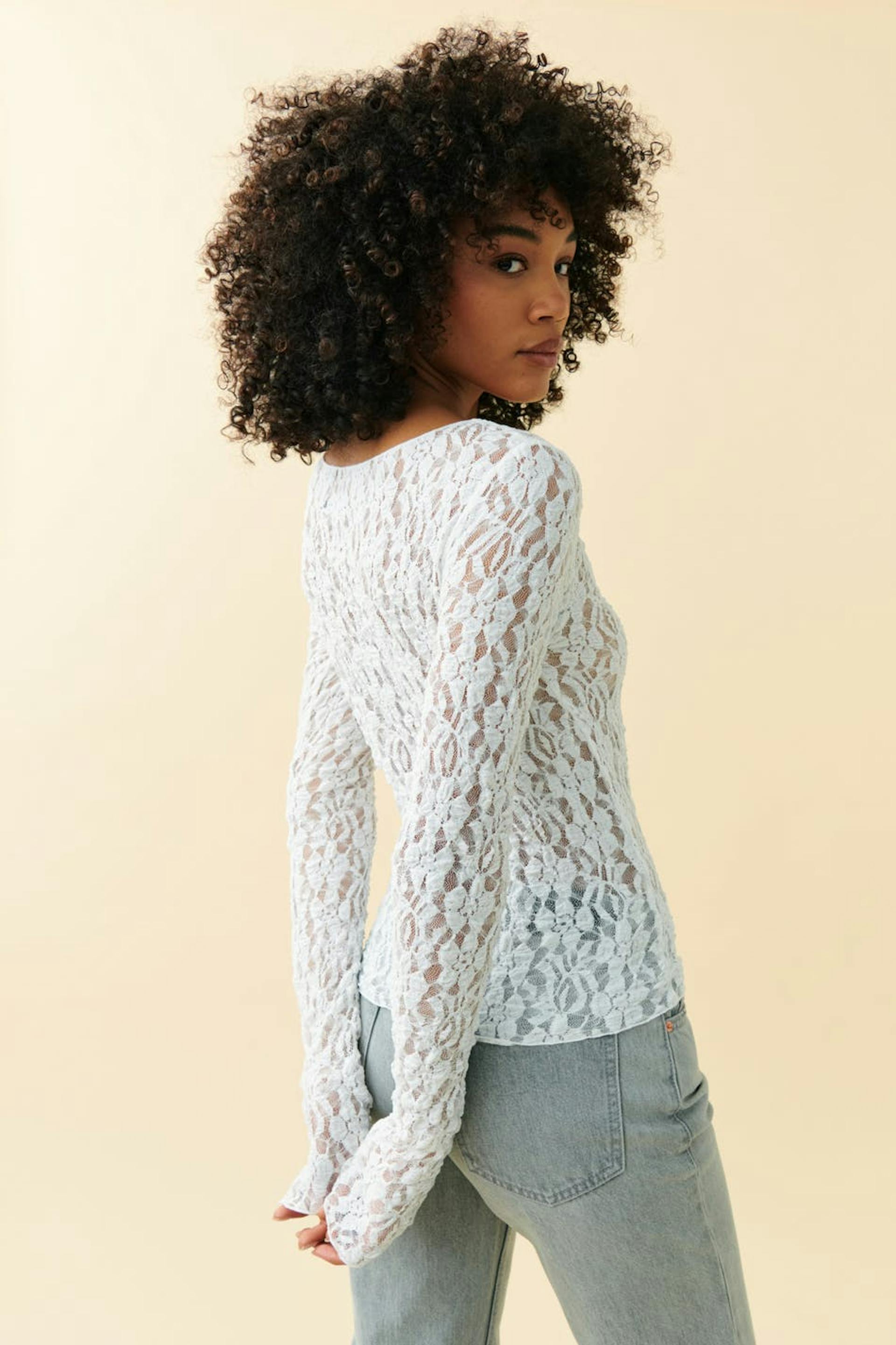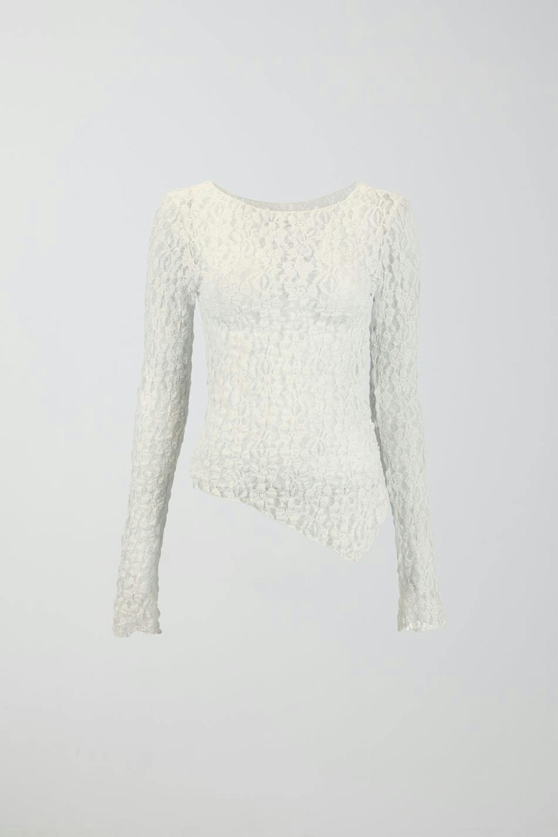 Langærmet blondetop med figurnær pasform. Toppen er hvid og har elastisk kvalitet med tekstur. Den har asymmetrisk søm og rund udskæring.