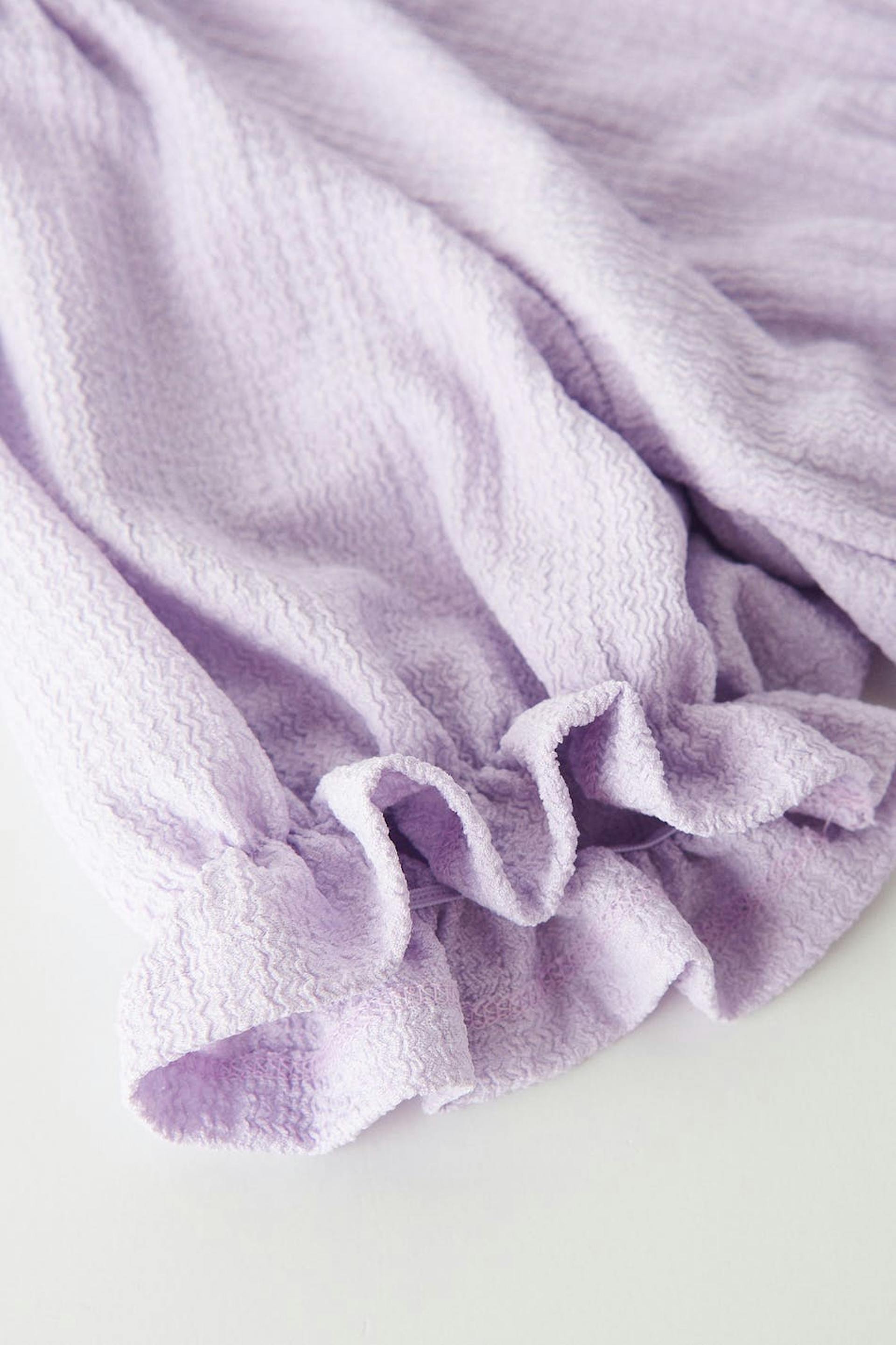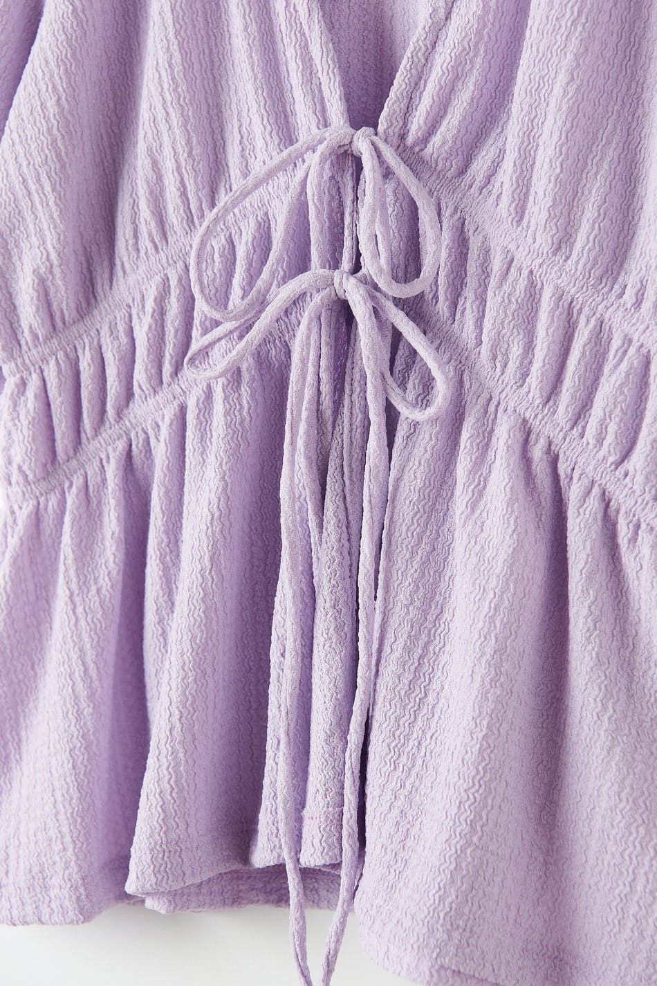 Top i jersey med knudedetaljer ved fronten. Toppen er lilla og har korte pufærmer med små flæsedetaljer. Den har en v-udskæring og et struktureret materiale.