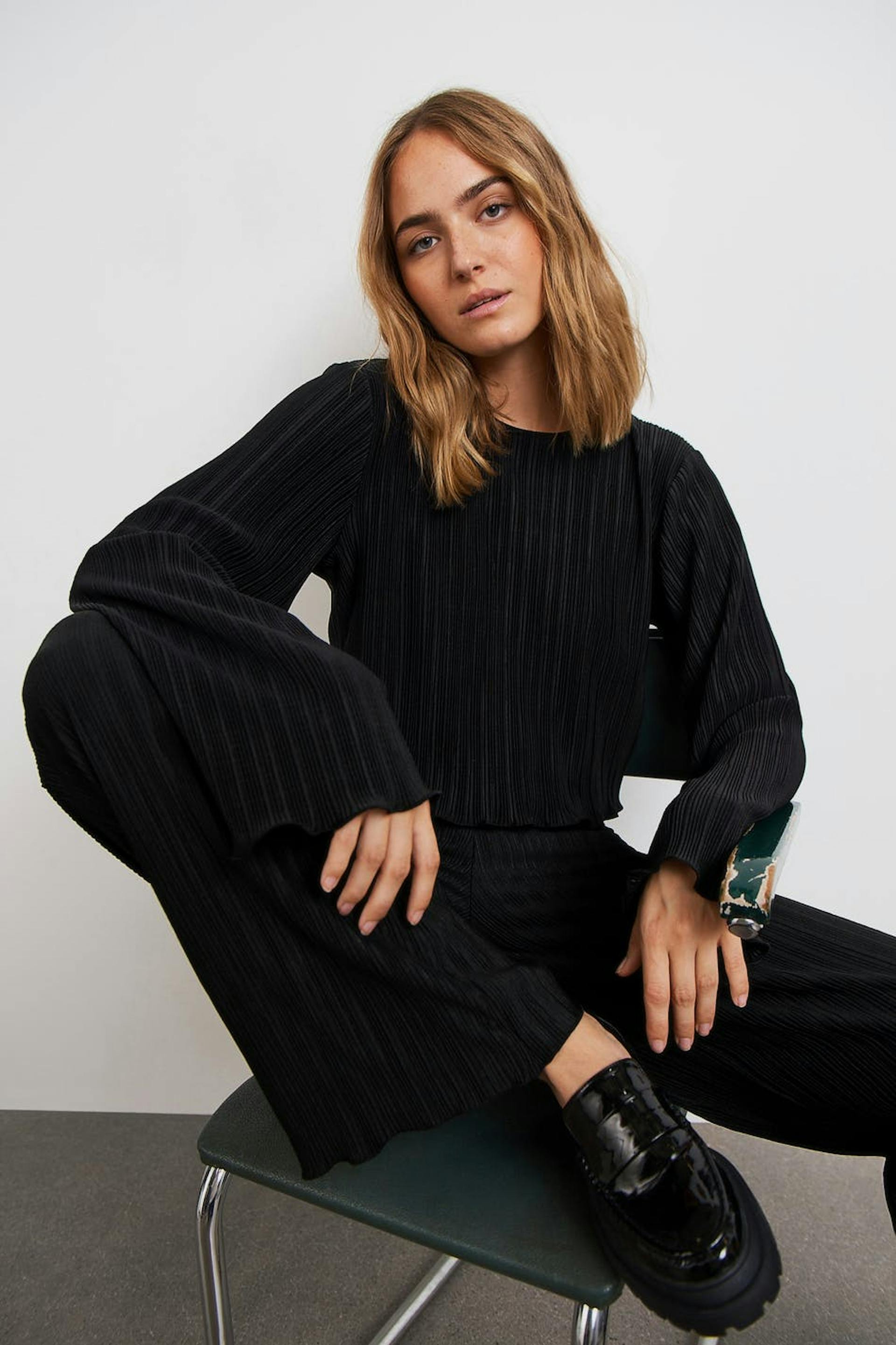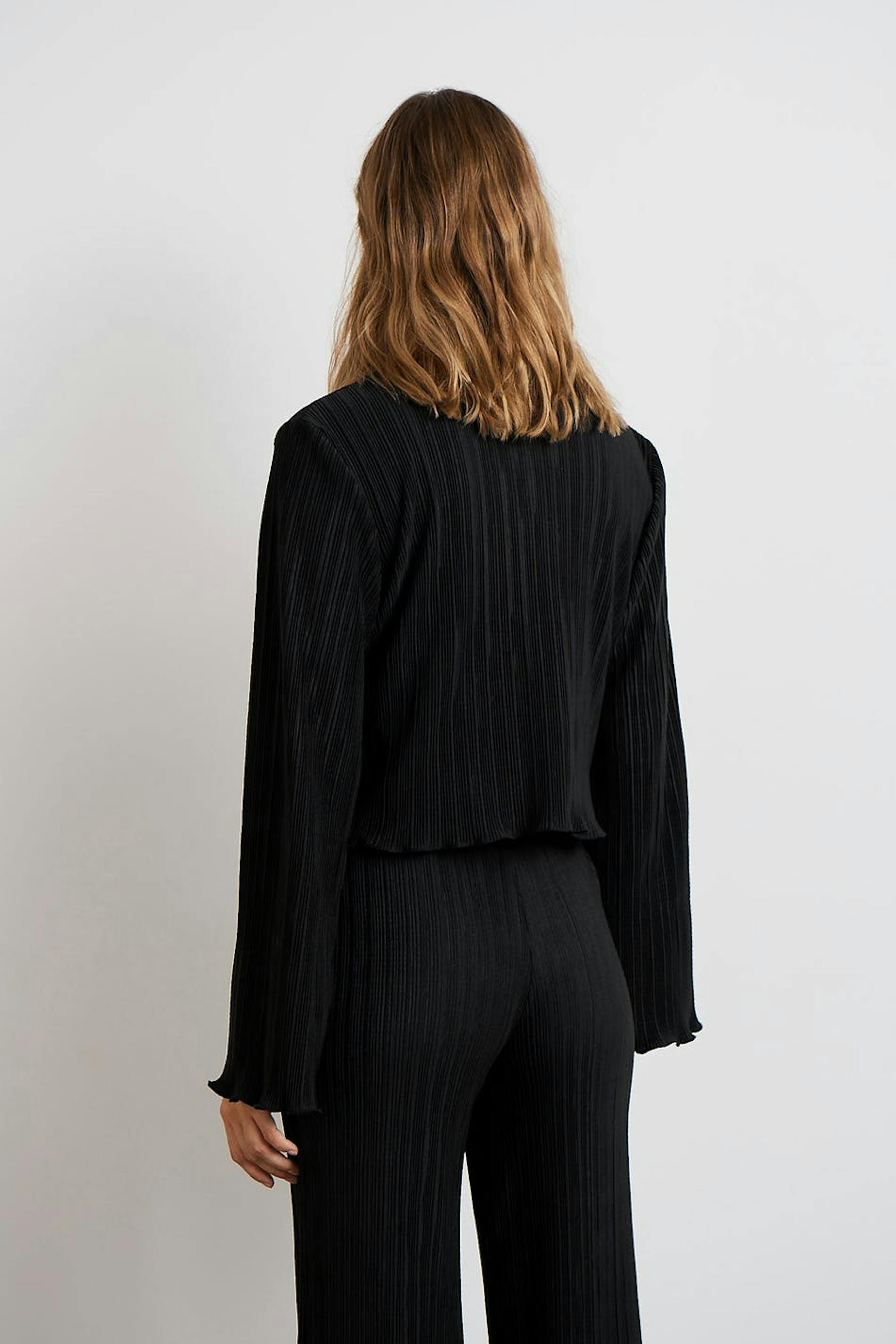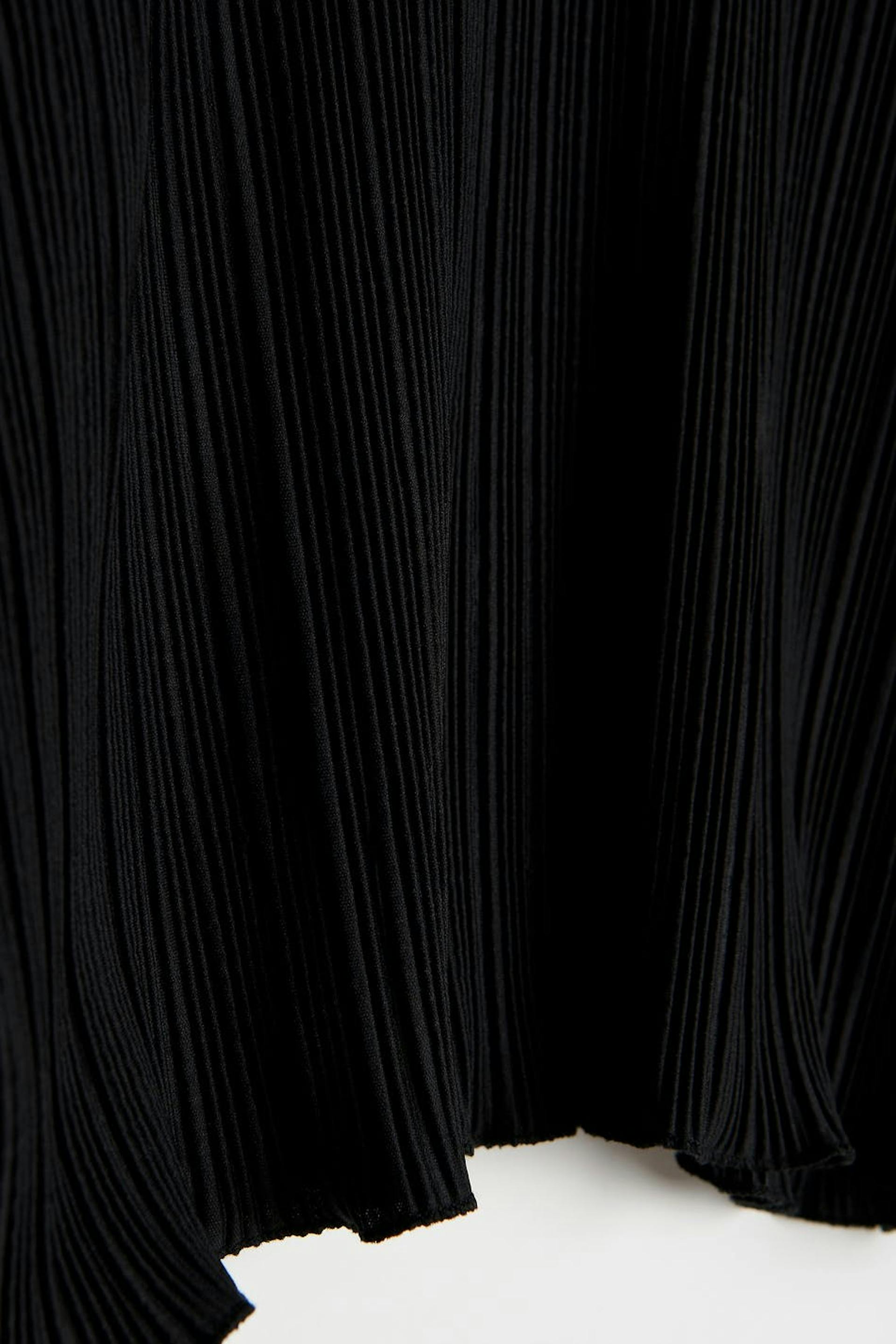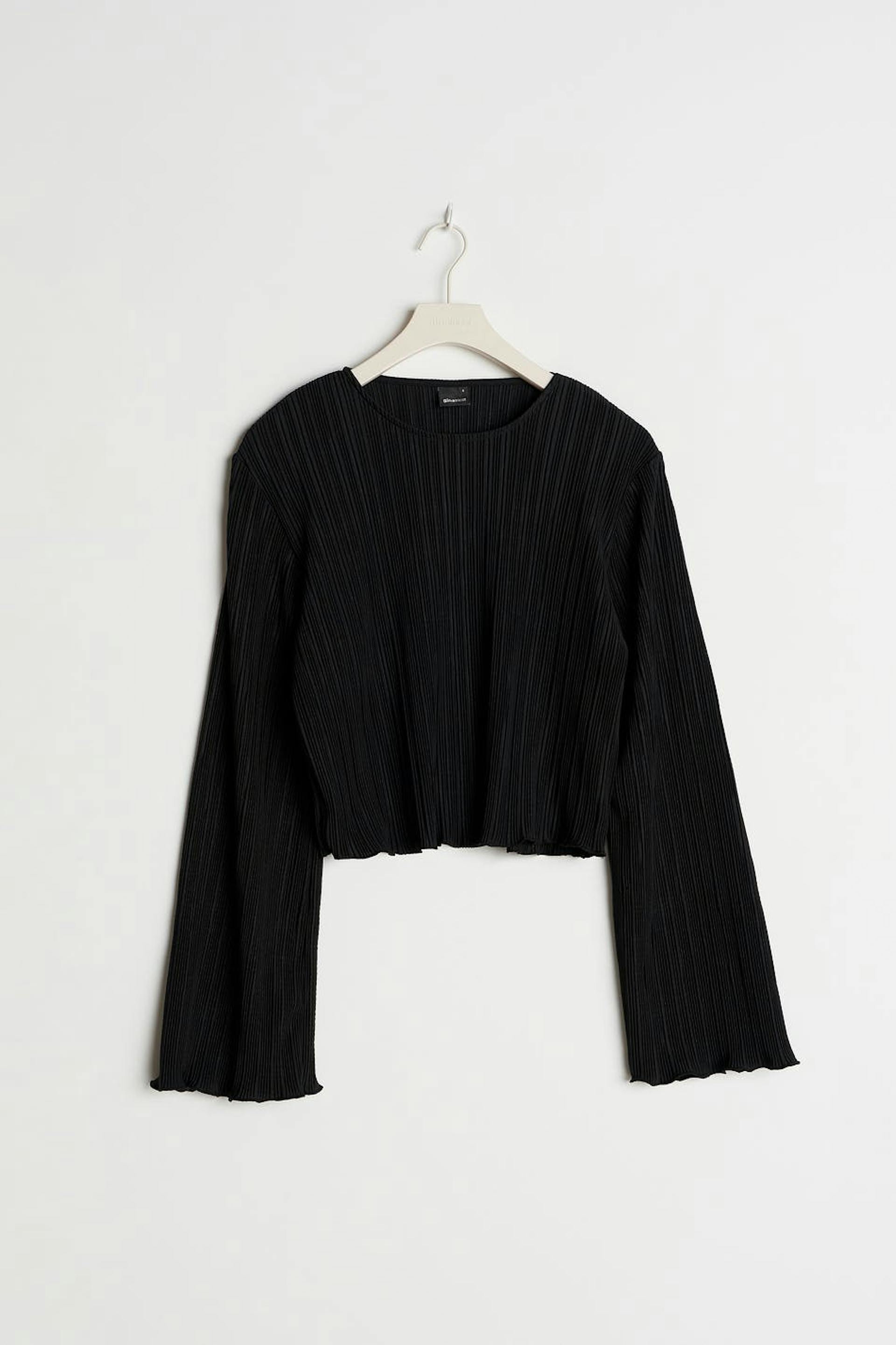 Plisseret top med volanter på ærmeafslutningerne og ved nedersømmen. Toppen er sort og har brede, lange ærmer. Den har en afrundet udskæring, en croppet længde og en løs pasform.