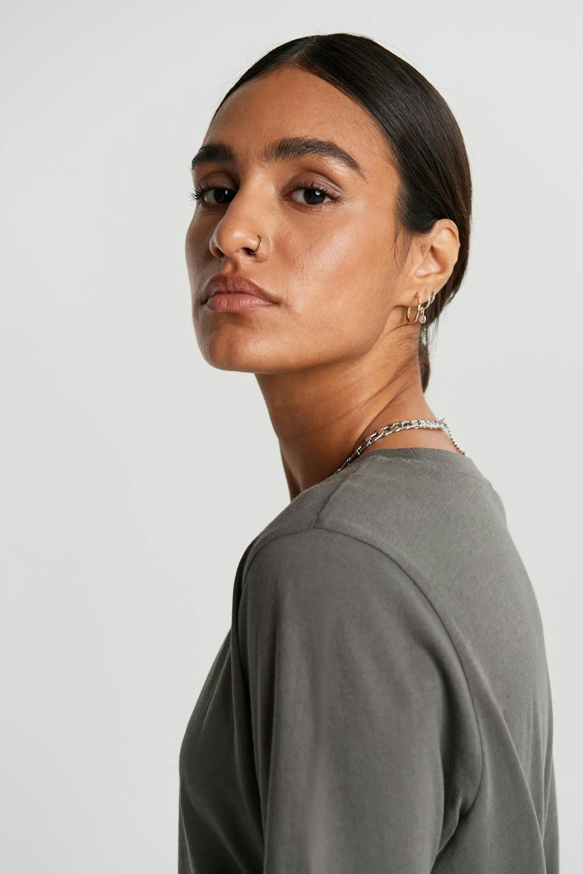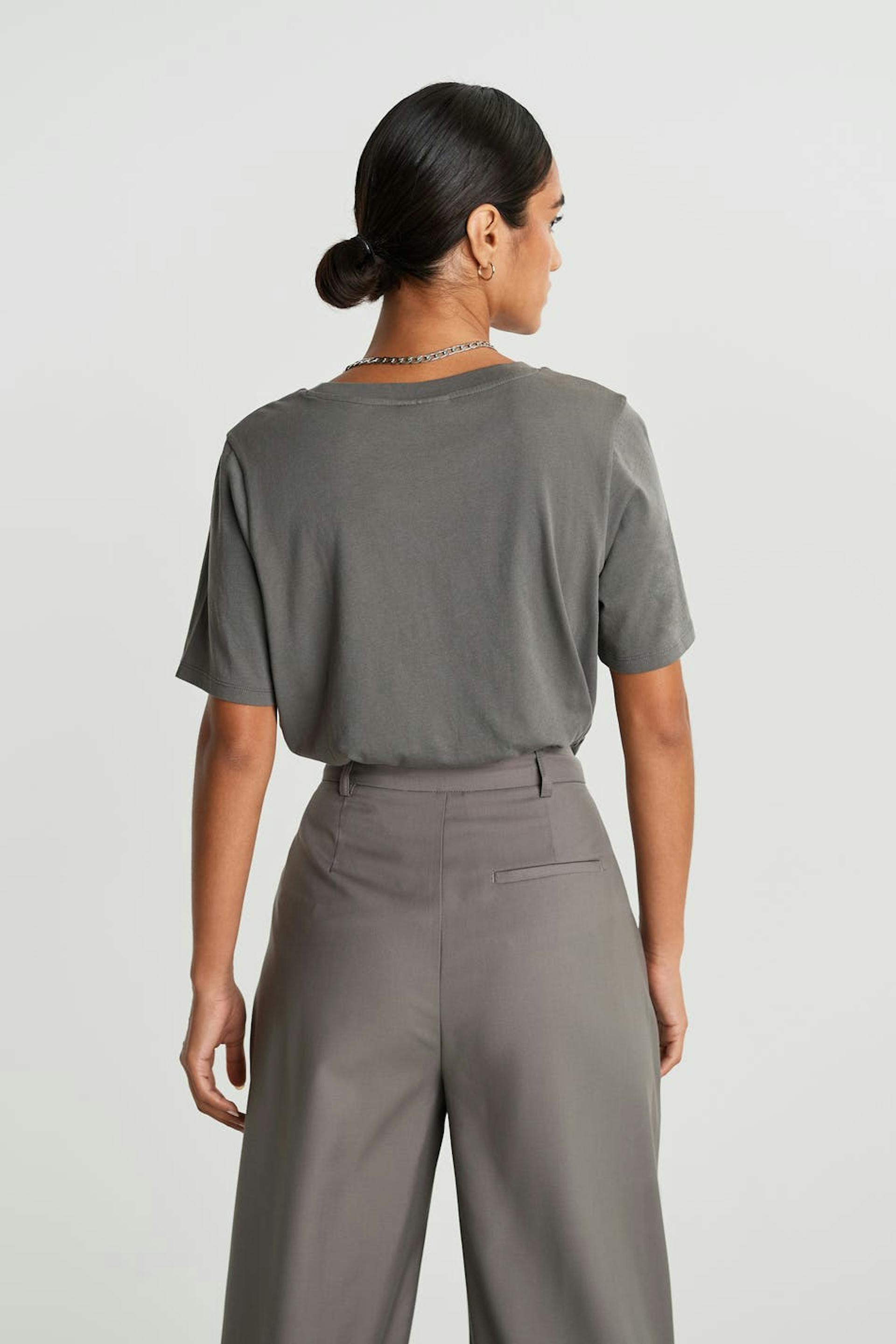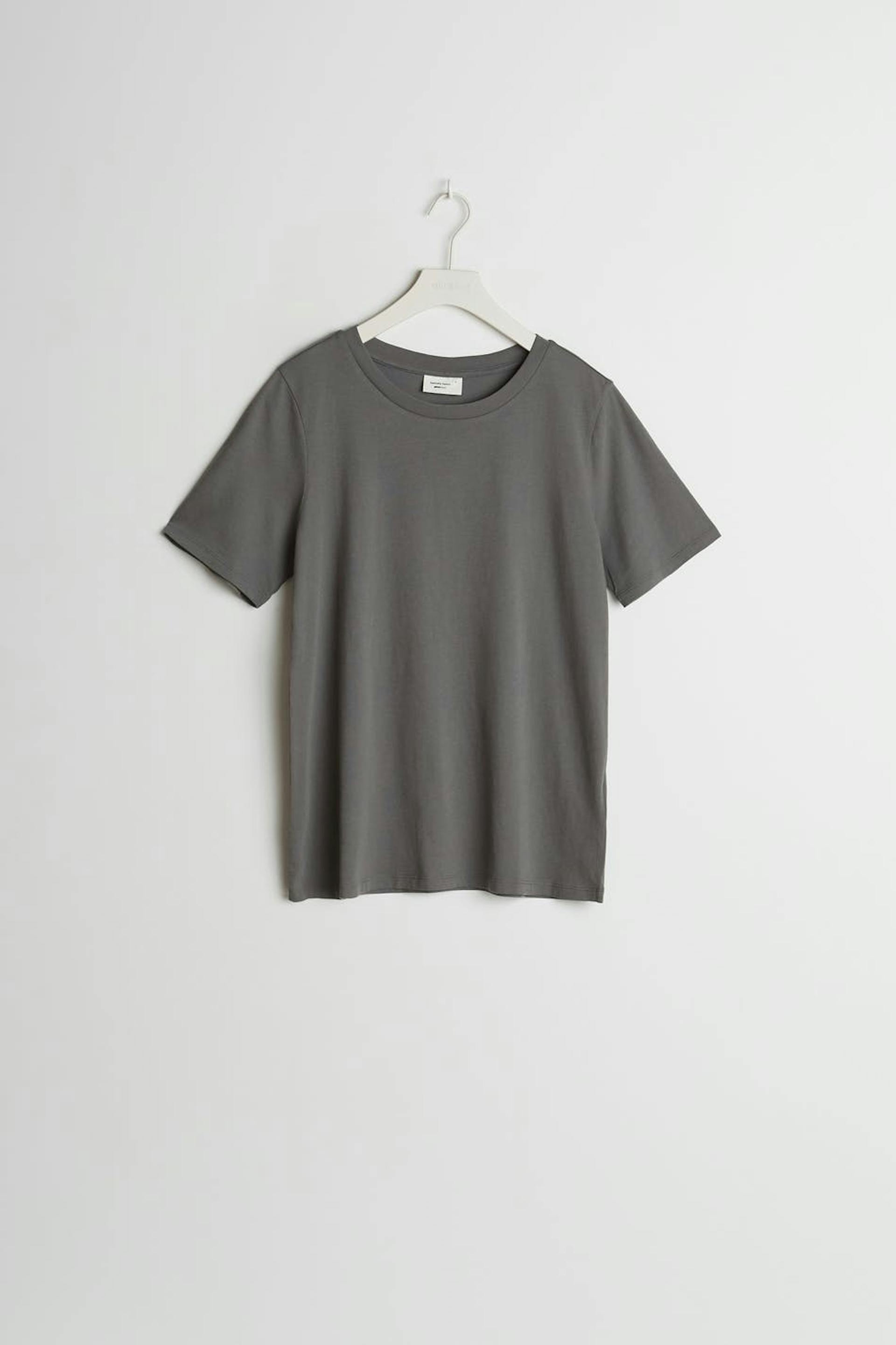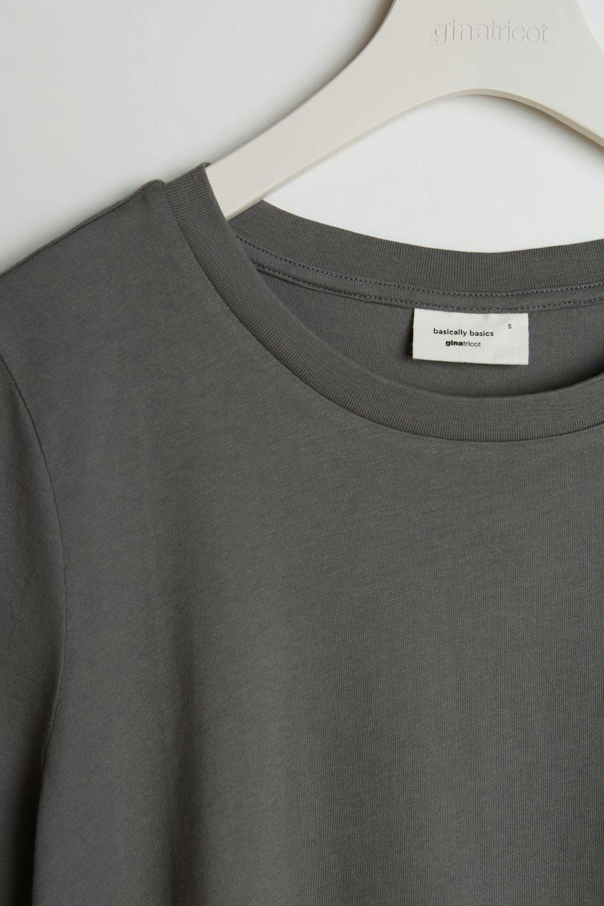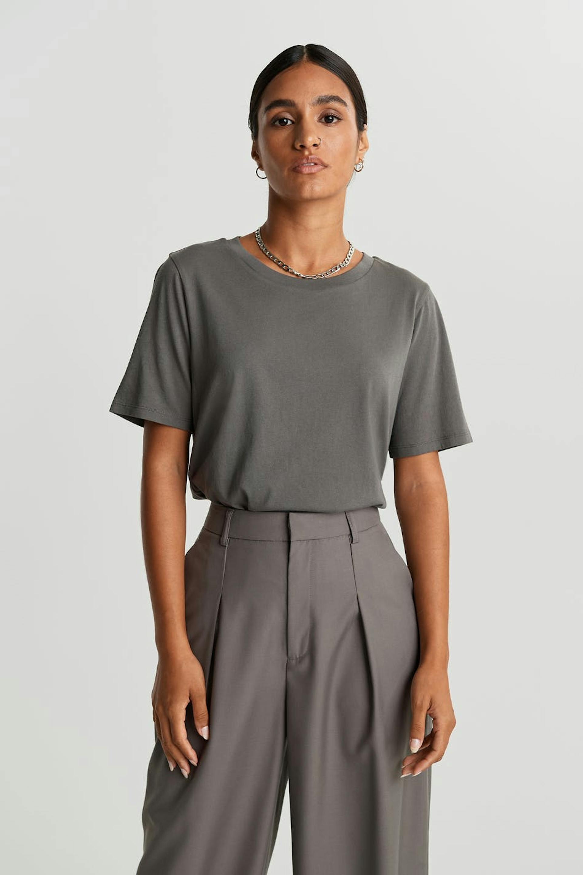 Kortærmet top med en oversize pasform. Toppen er grå.
