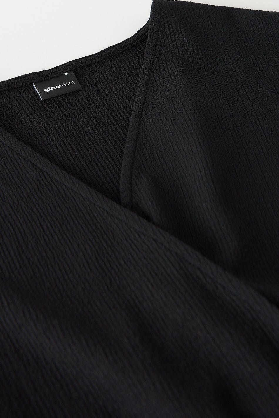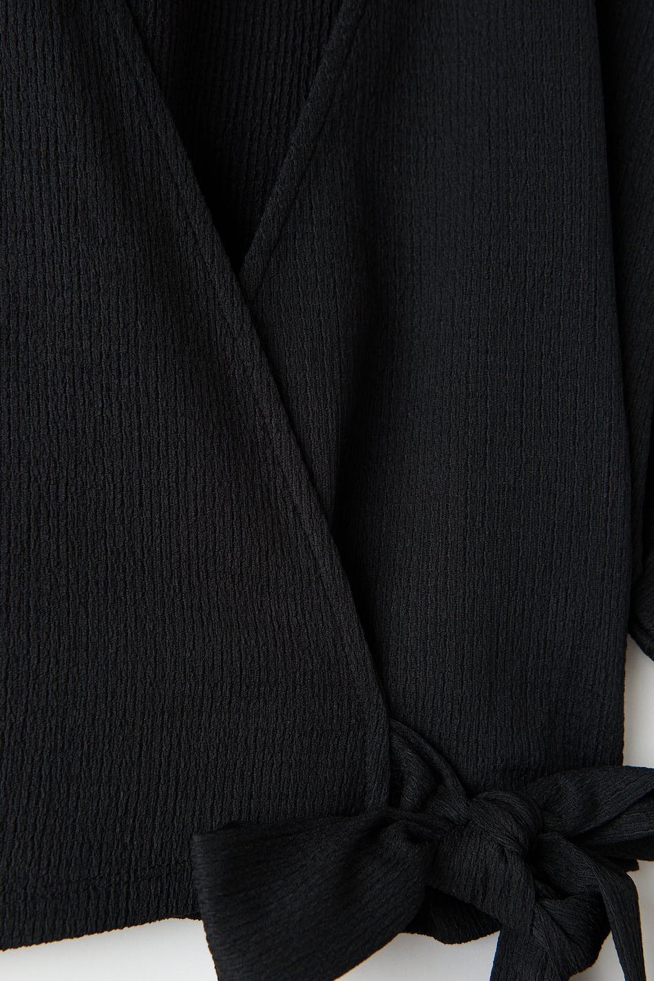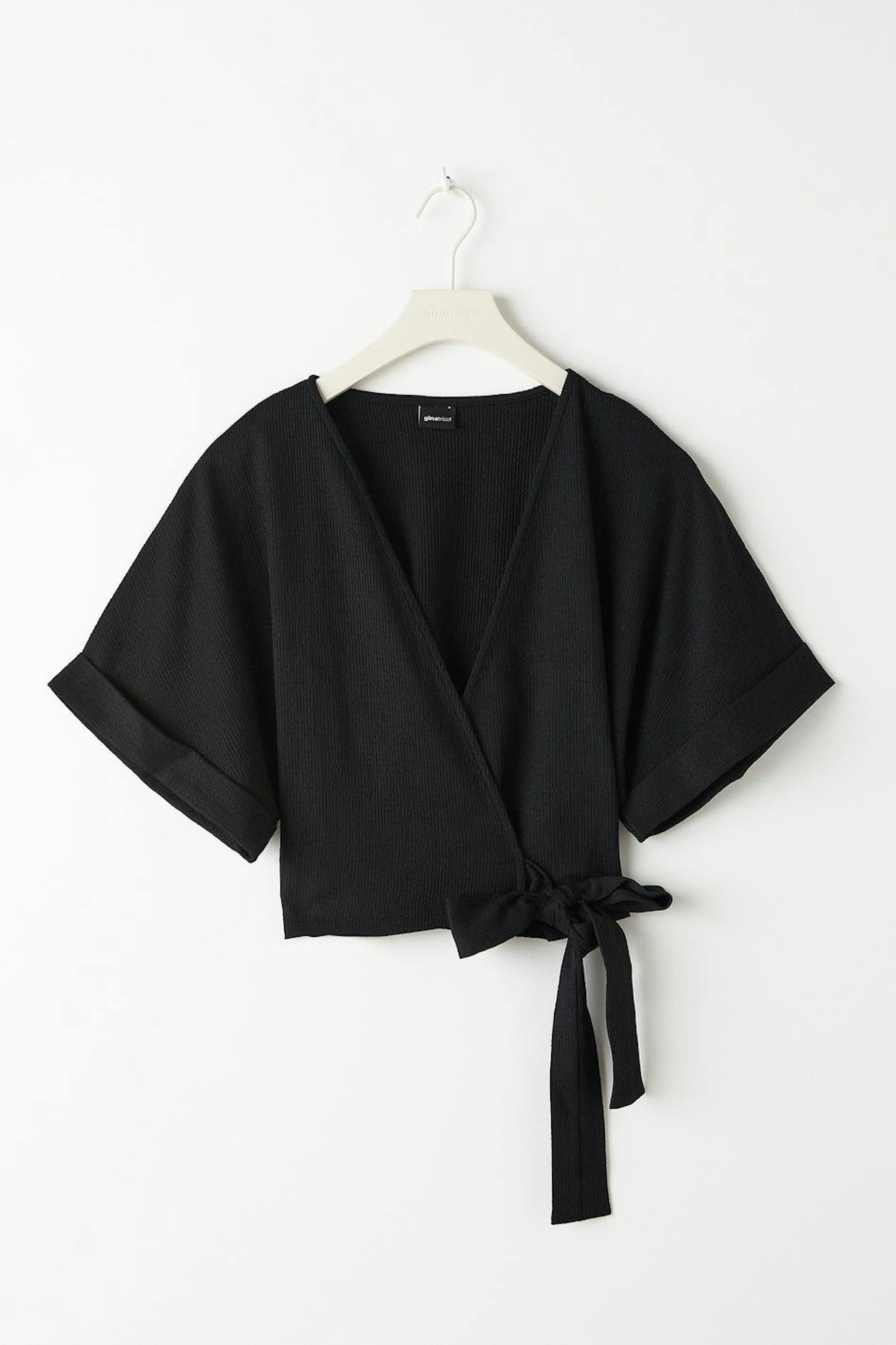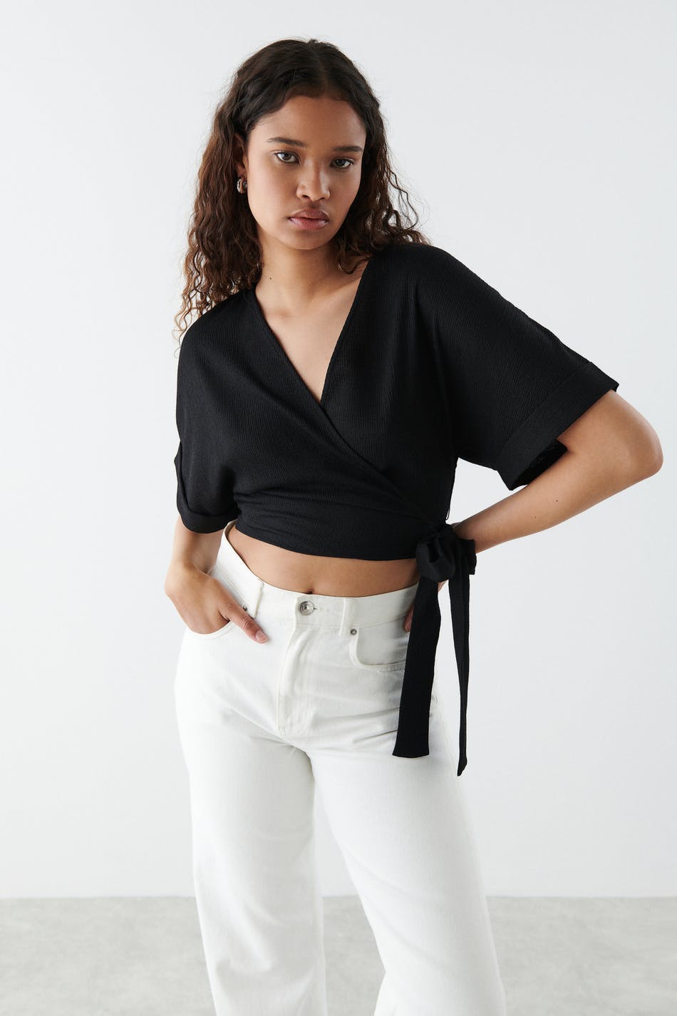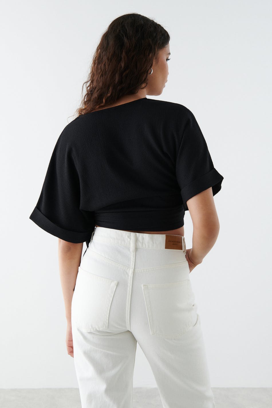 Kortærmet slå-om top med bindebånd i siden. Toppen er sort og har et struktureret materiale. Den har v-udskæring og en croppet længde.
