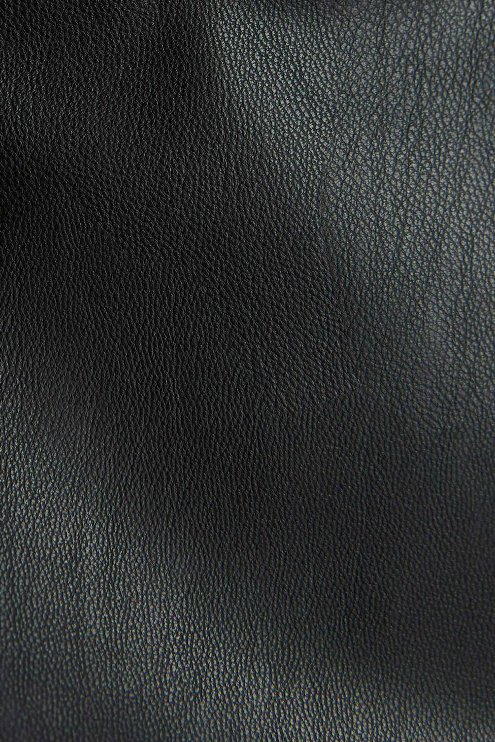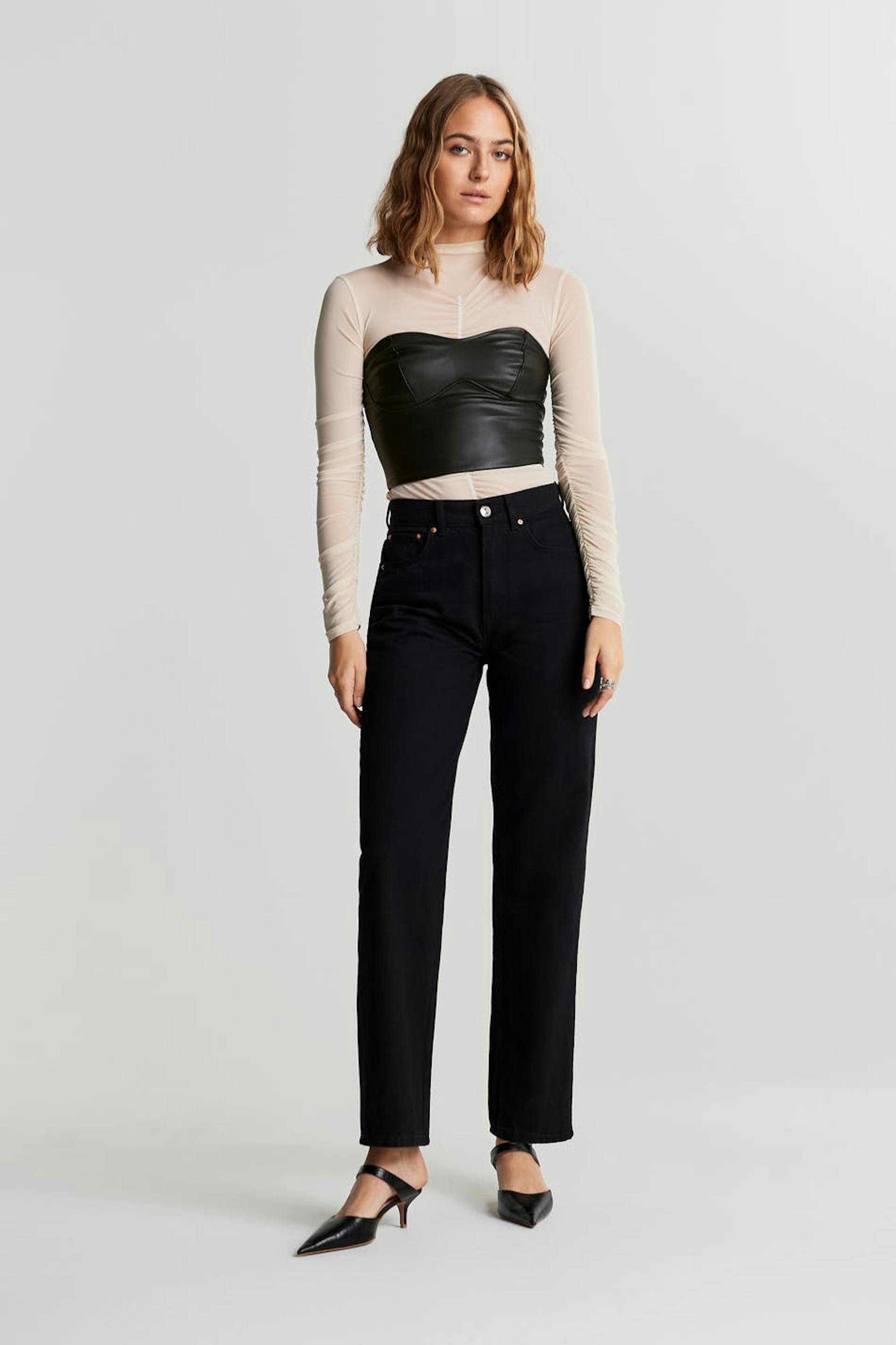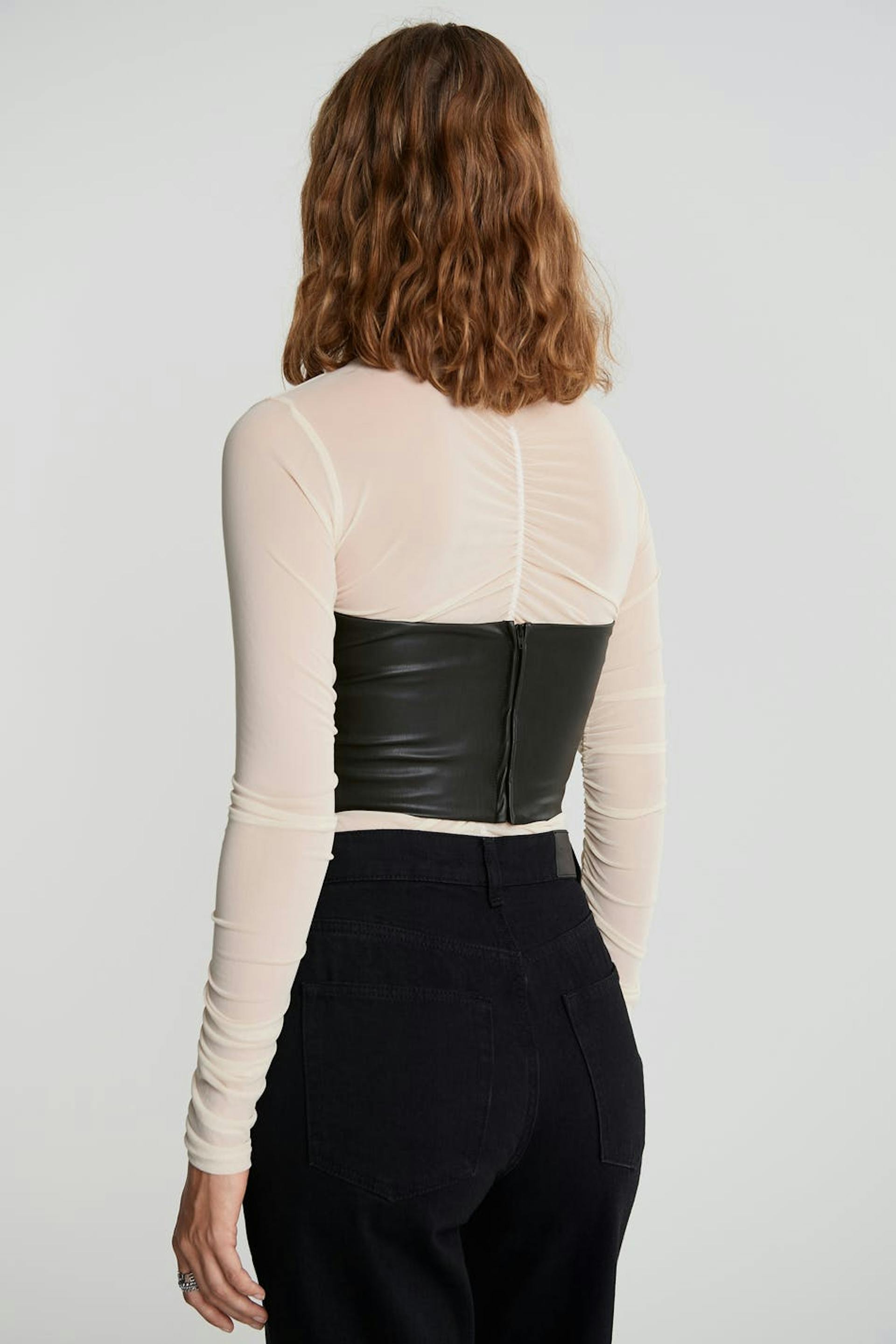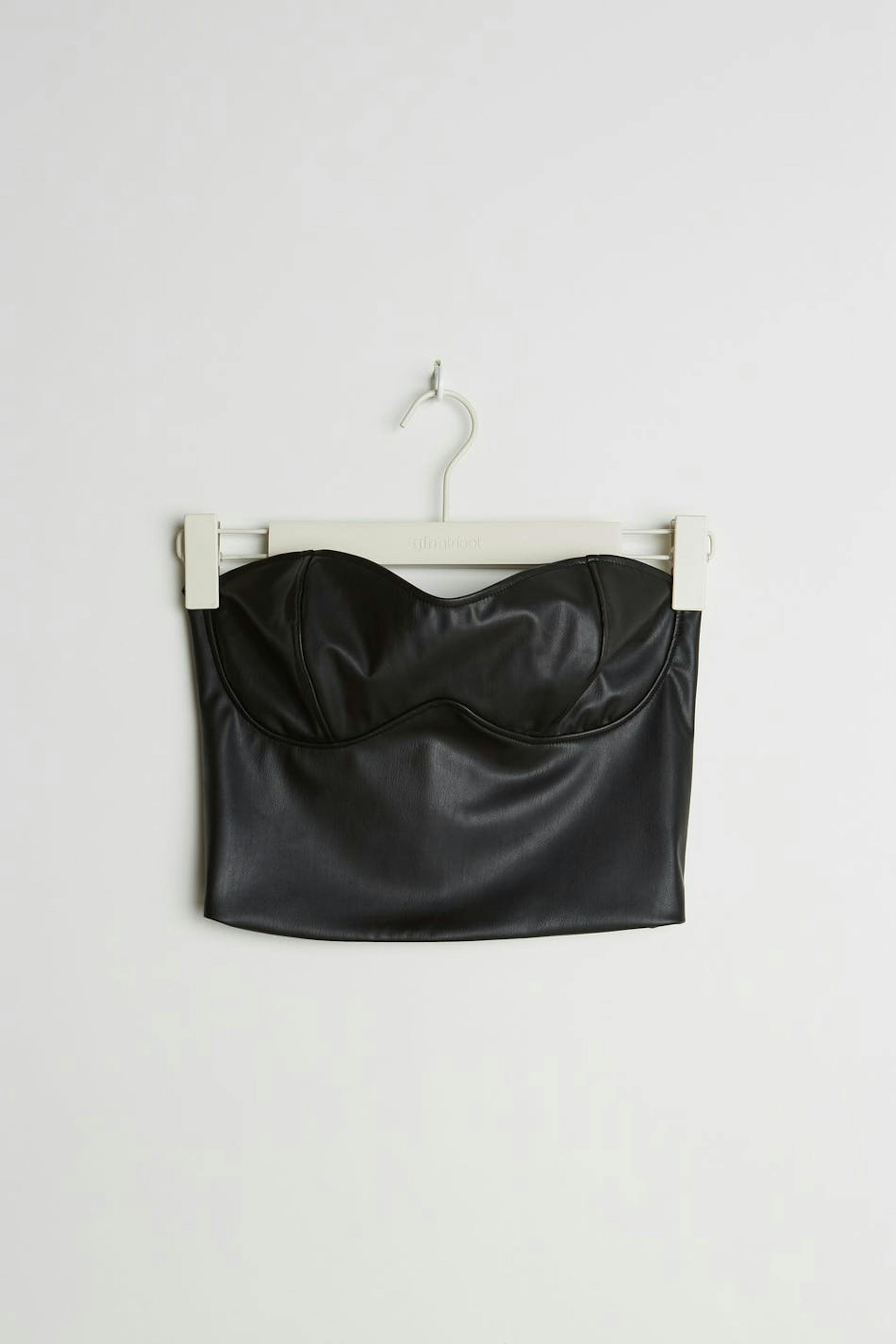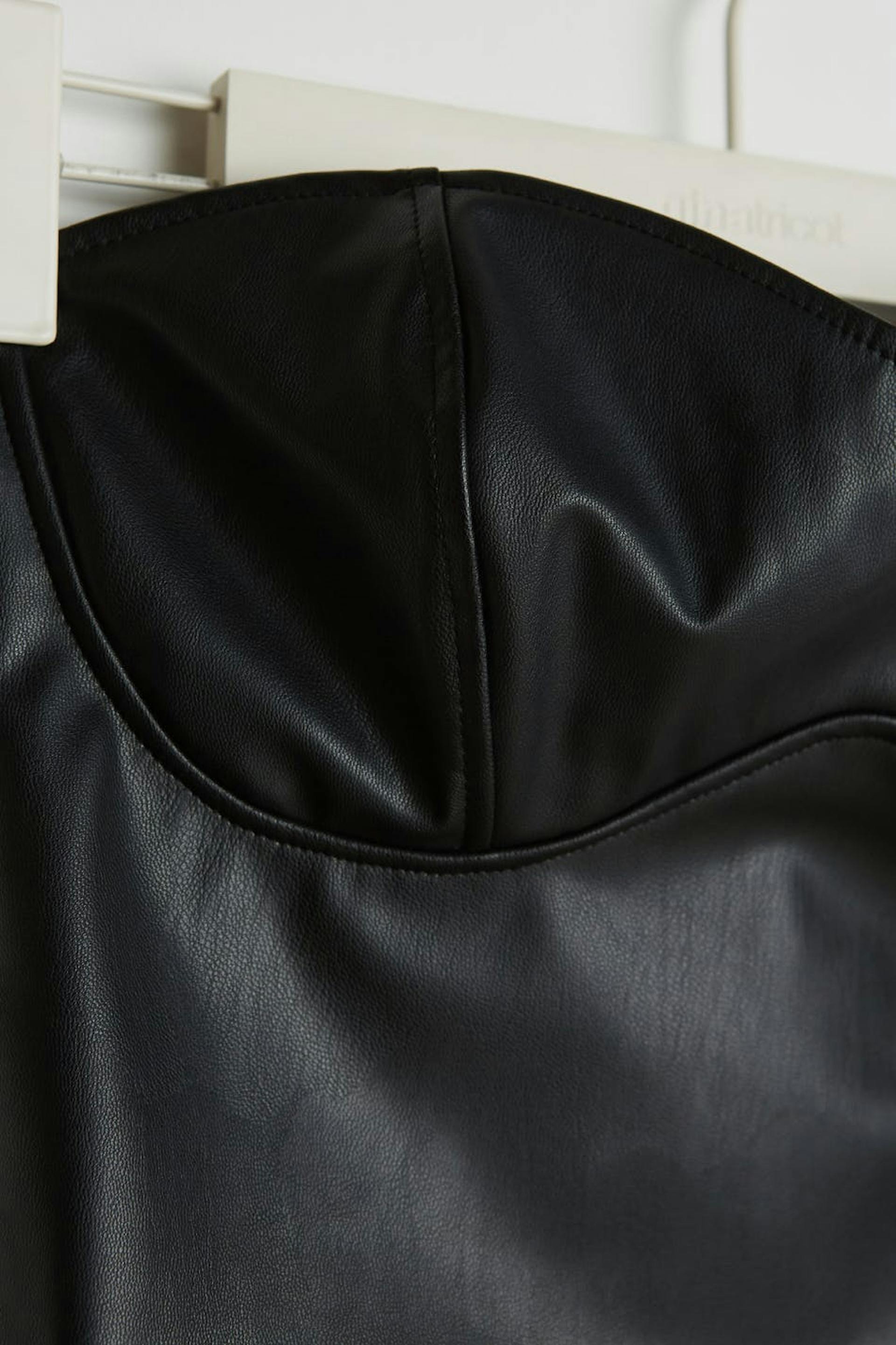 Stropløst korset med en figursyet pasform. Korsettet er sort og kort og har en sømdetalje under brystet. Det er fremstillet af PU og har en lynlås i ryggen.