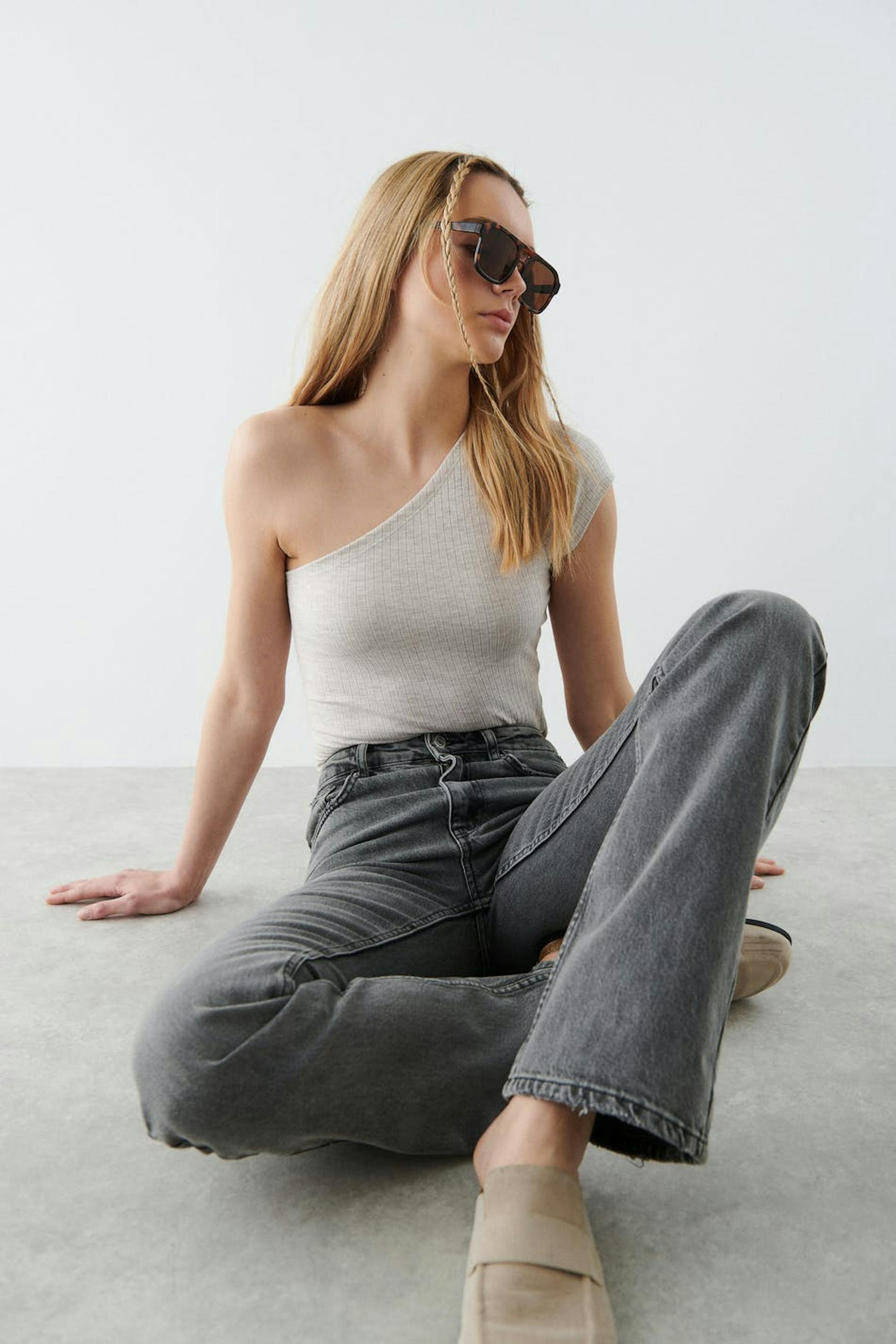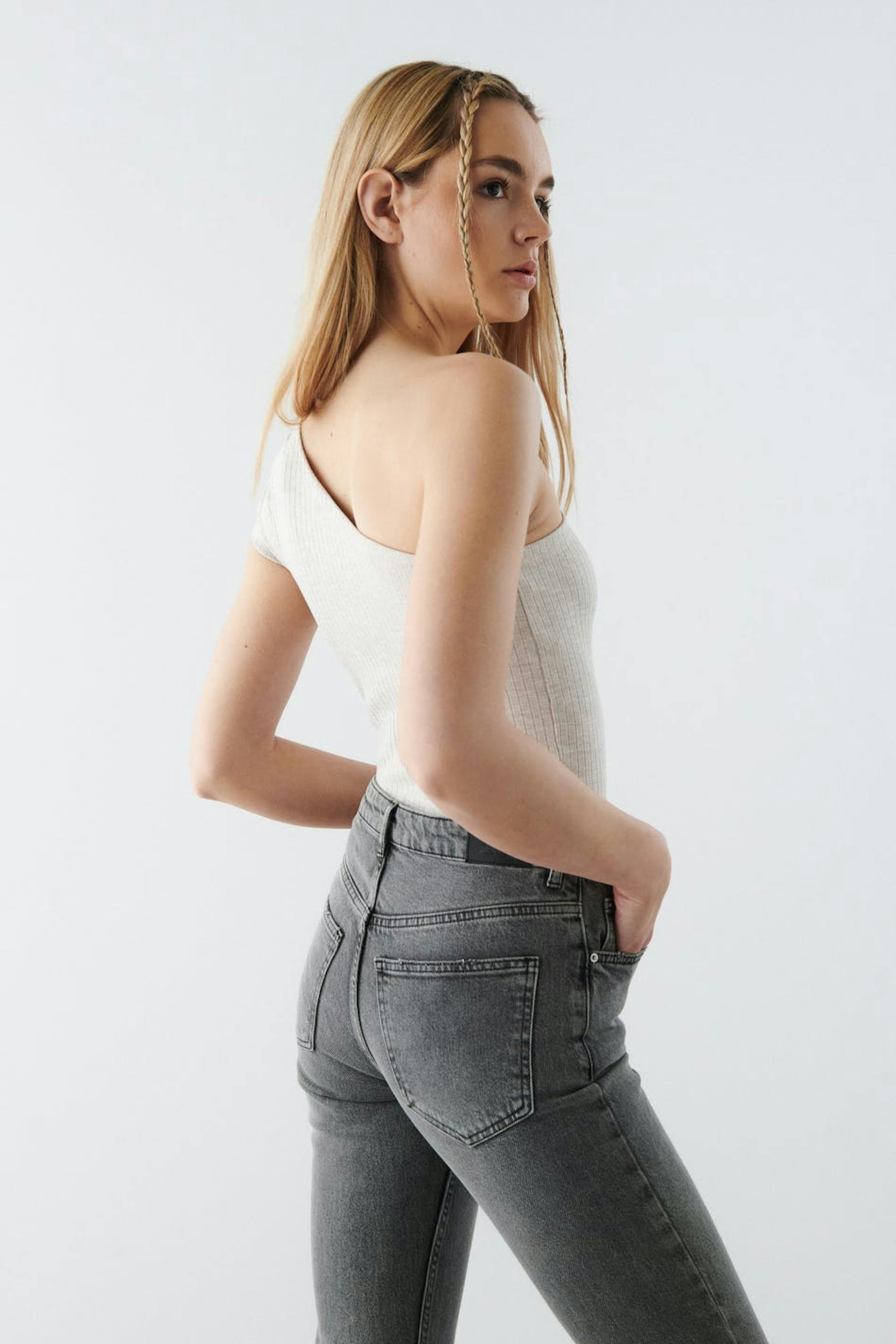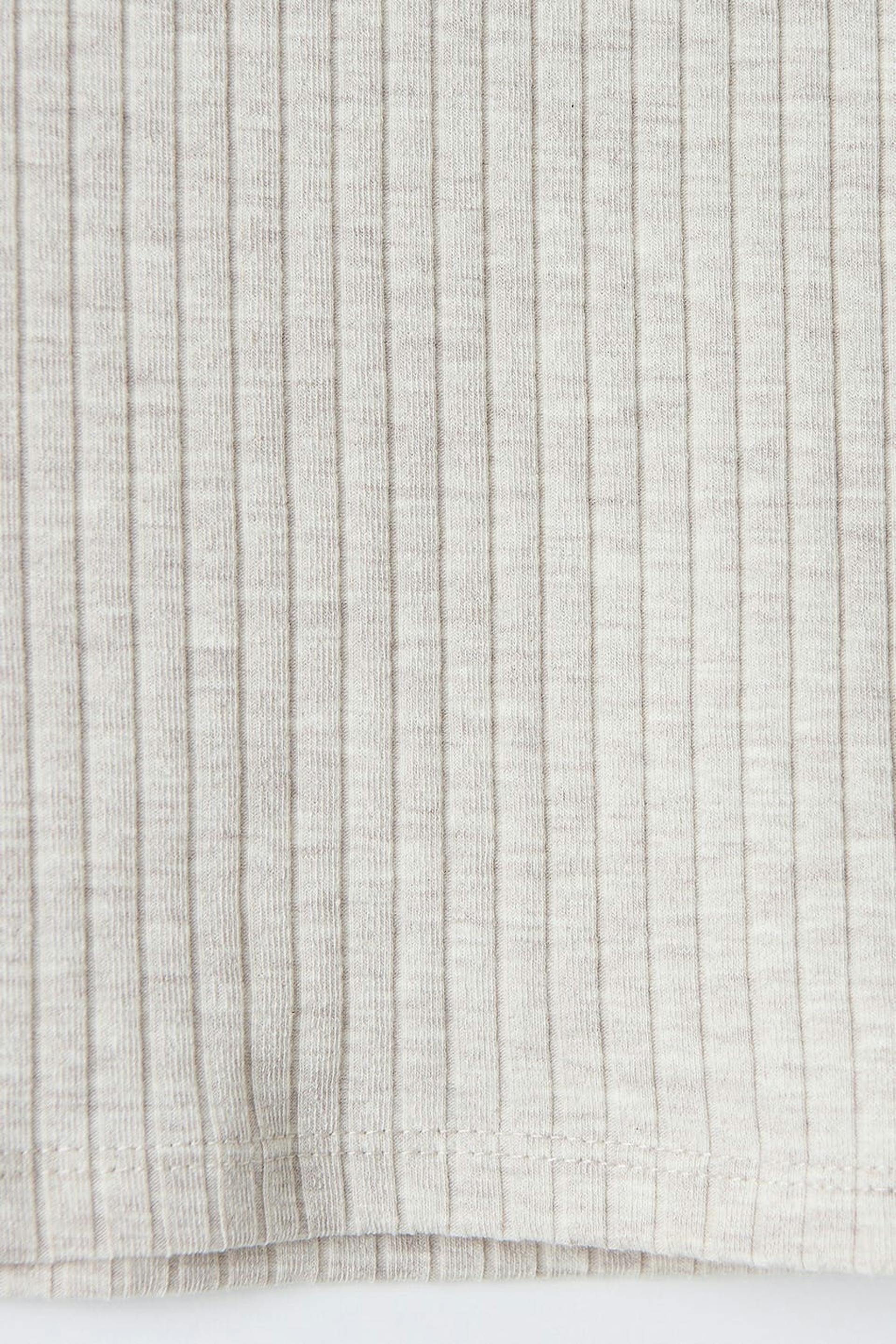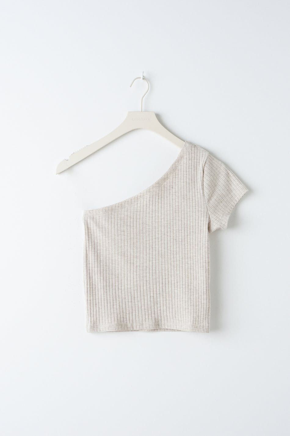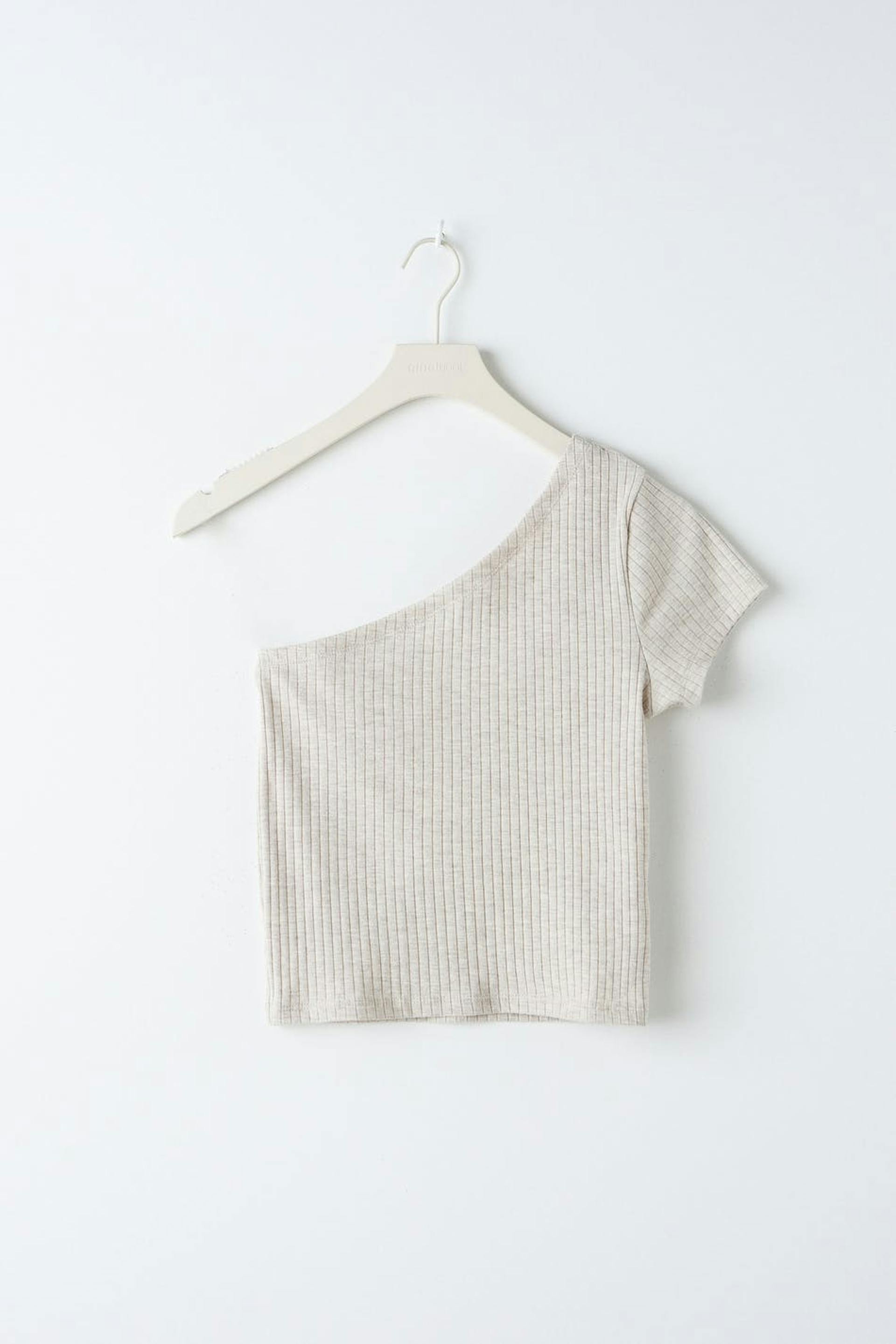Ribbet off-the-shoulder top i jersey med en figursyet pasform. Off-the-shoulder toppen er beige og kortærmet og har en figursyet pasform.