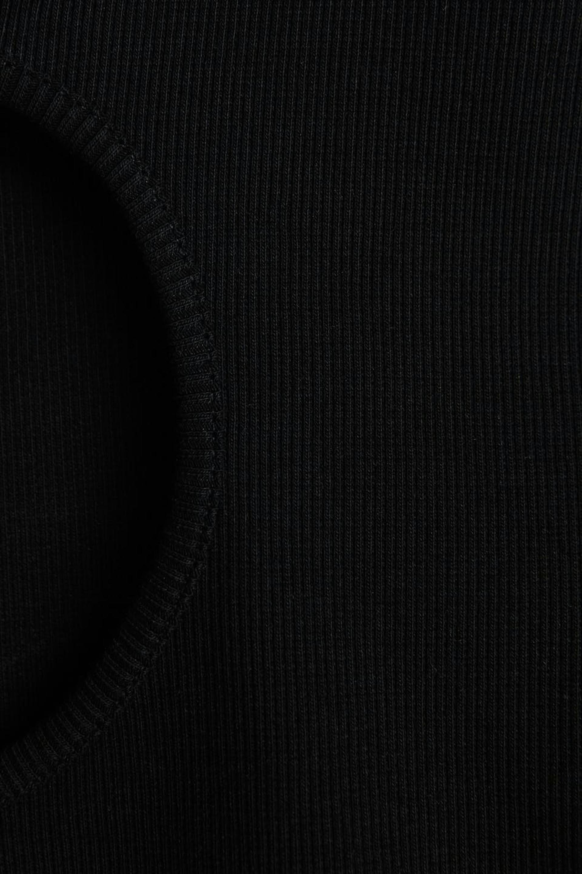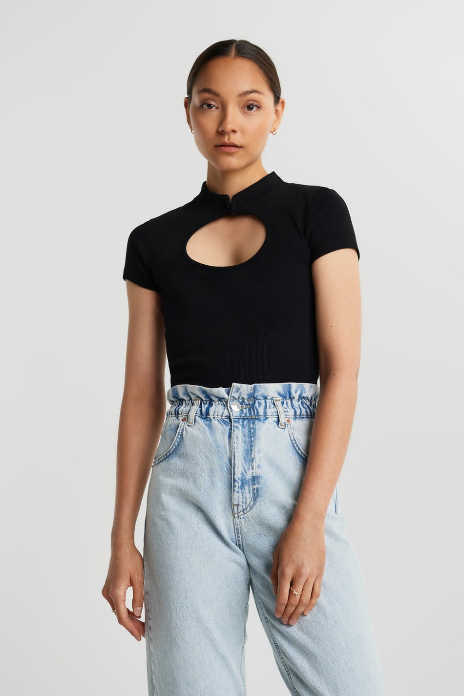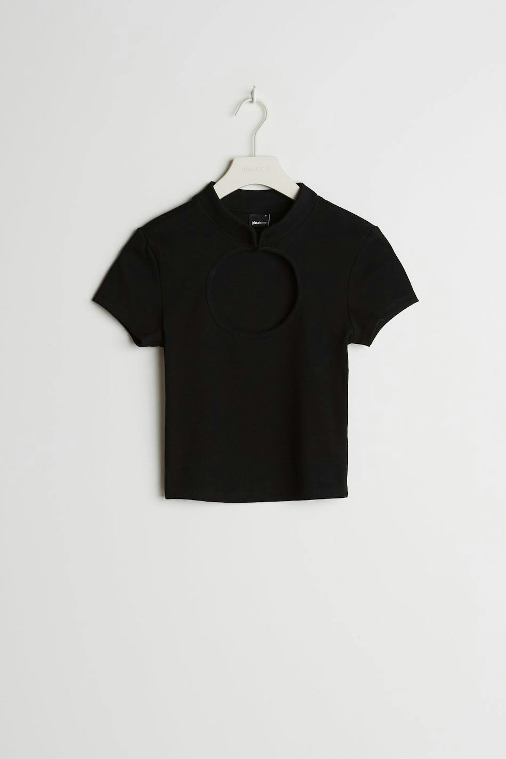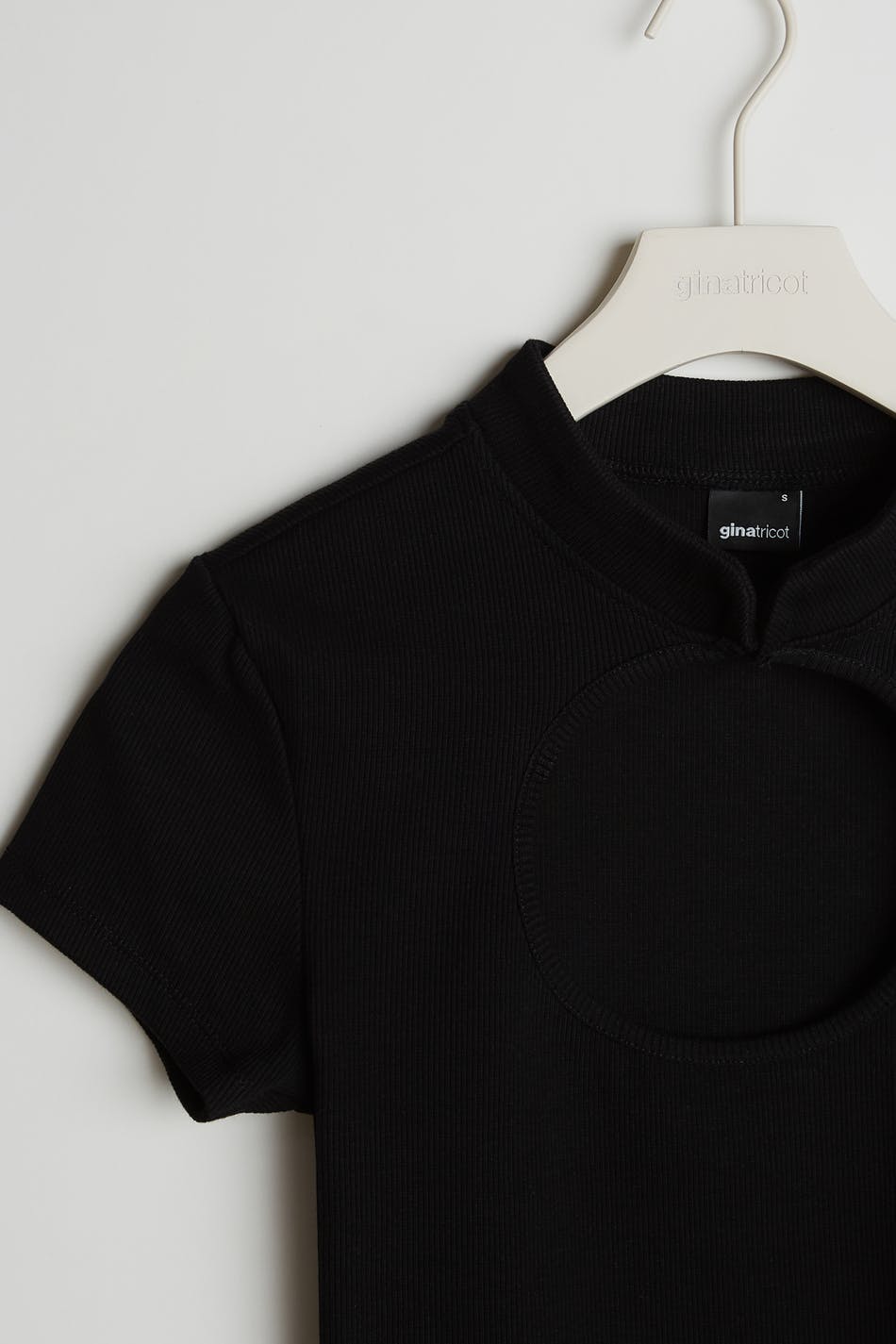 Kort top med en figursyet pasform. Toppen er sort og har en rund udskæringsdetalje over brystet. Den har en krage med en lukning til halsen.