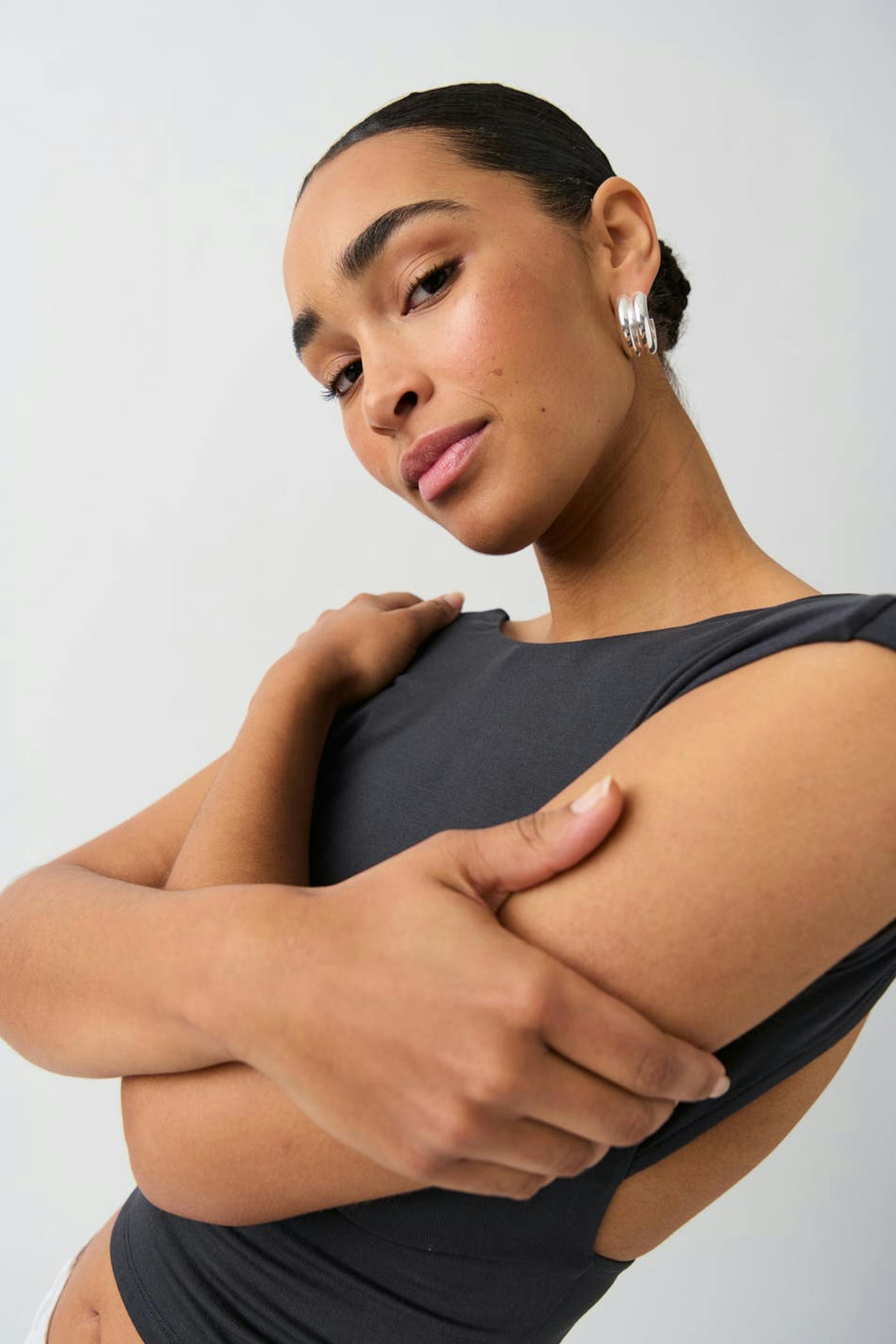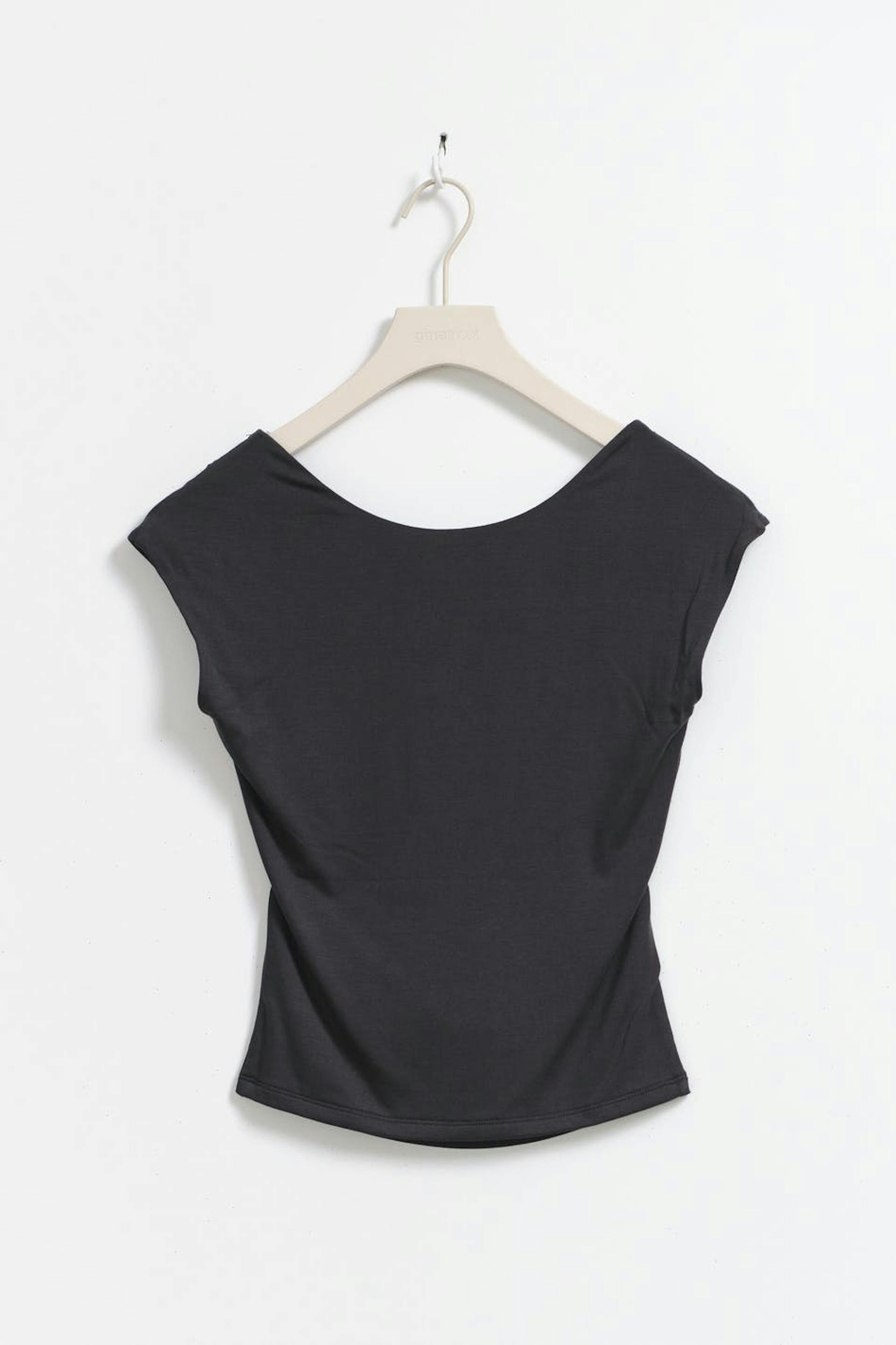 Soft touch – second skin comfort. Kortærmet top med åben ryg. Toppen er grå og har figurnær pasform. Den har rund udskæring, lav skulder og kort længde.