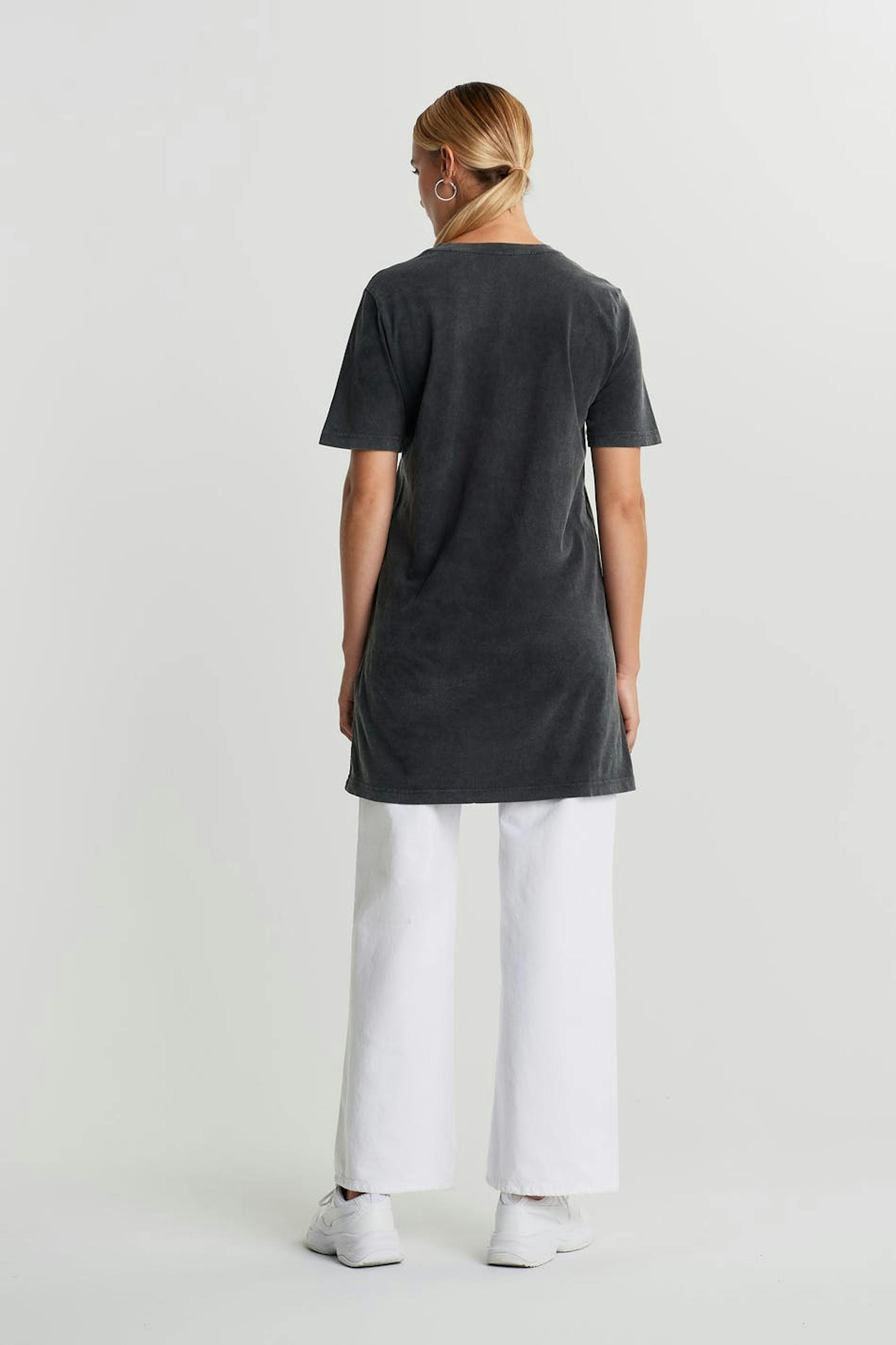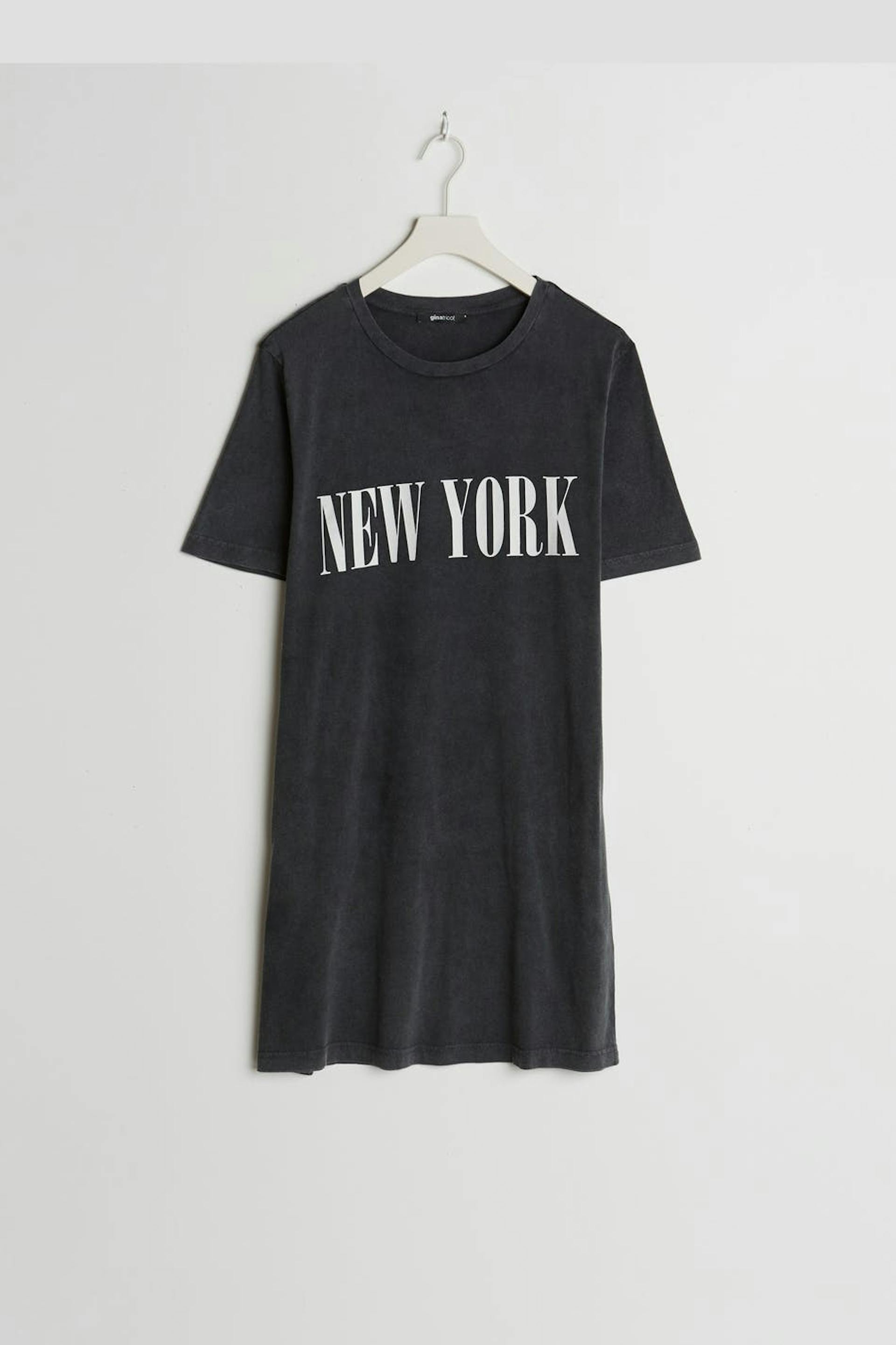 Kjole med en generøs pasform. Kjolen er sort og har et tryk ved fronten.