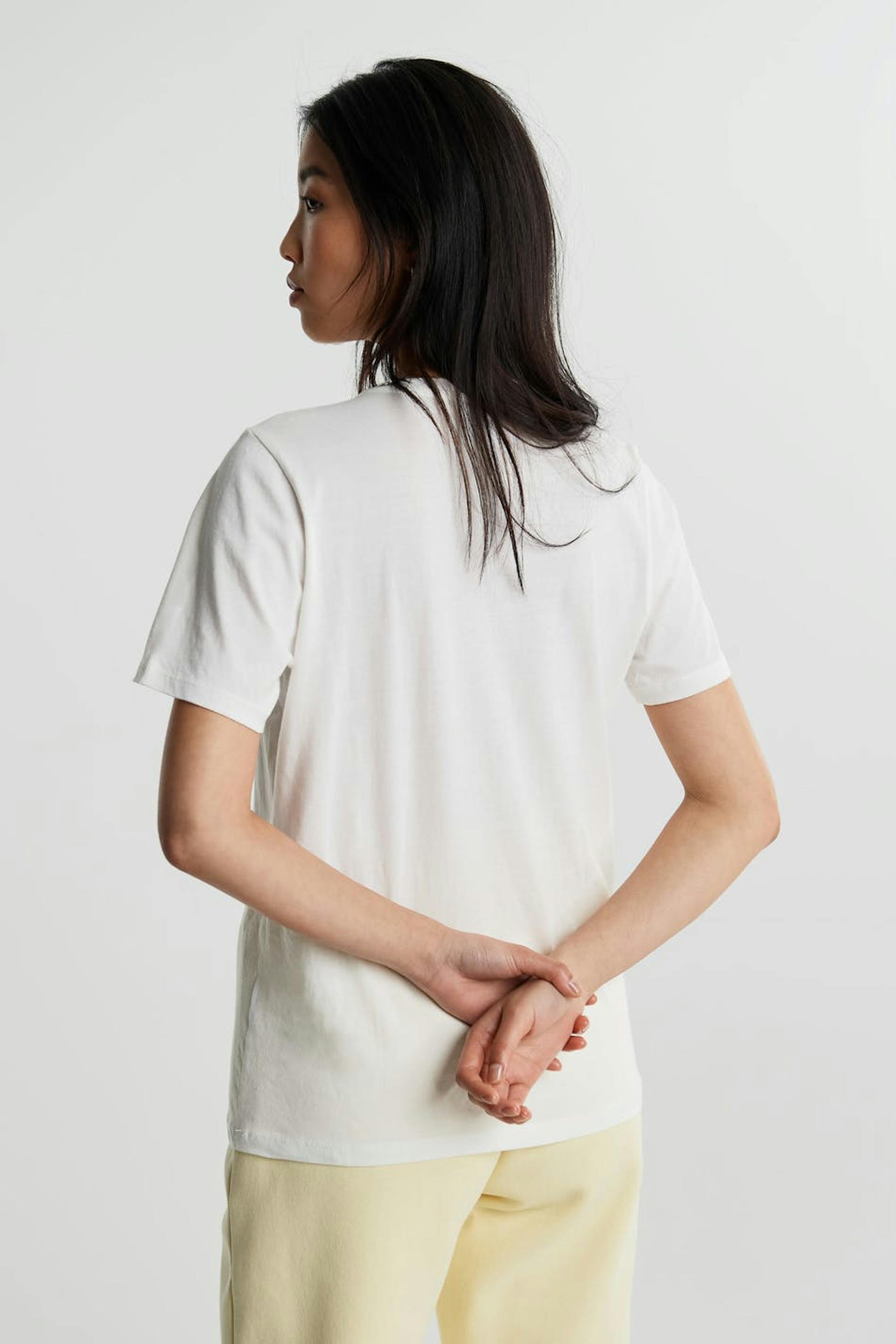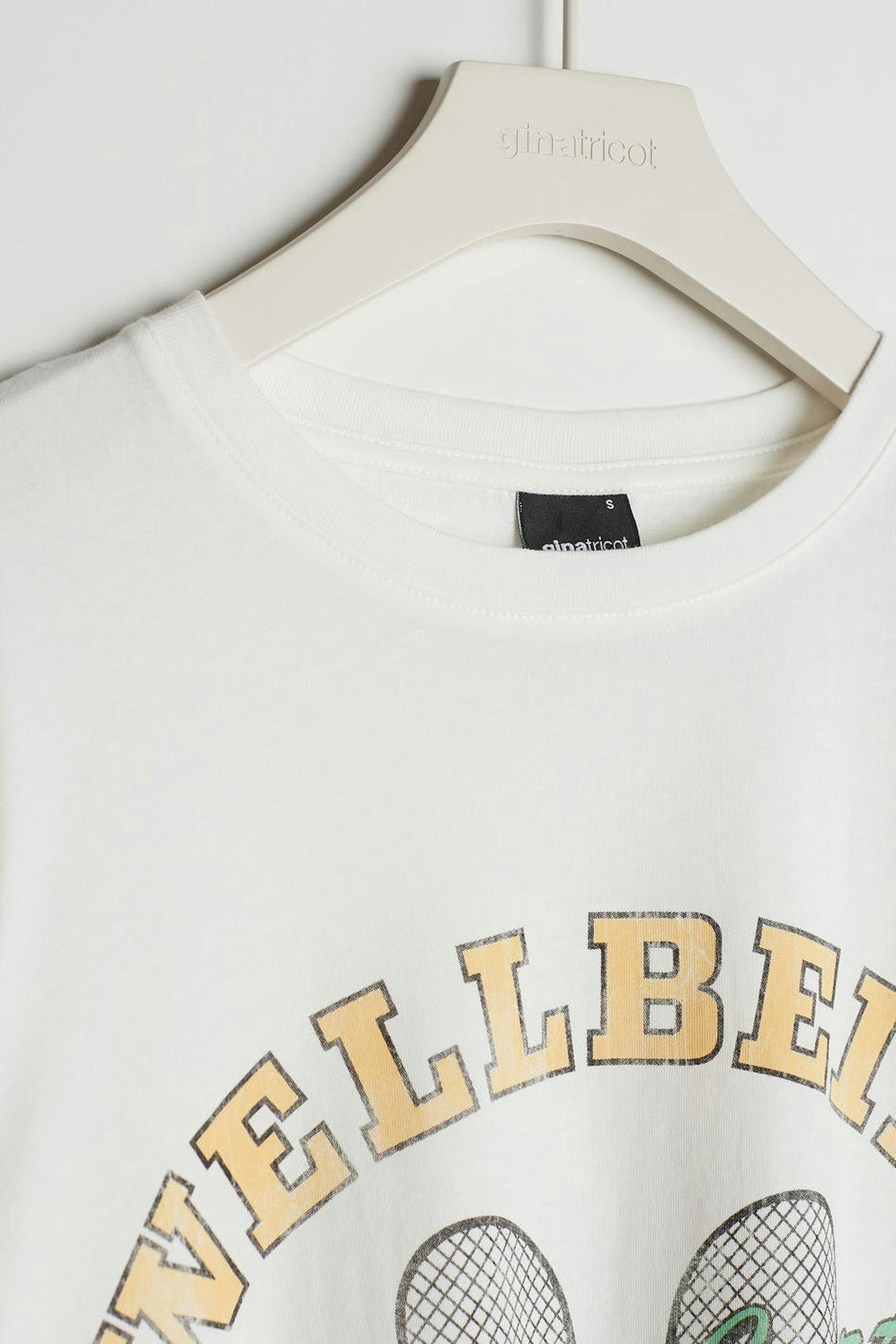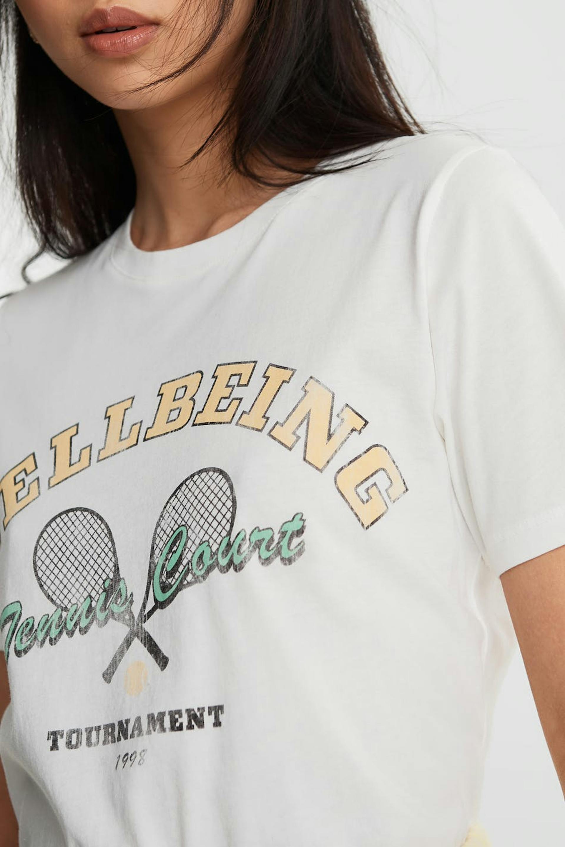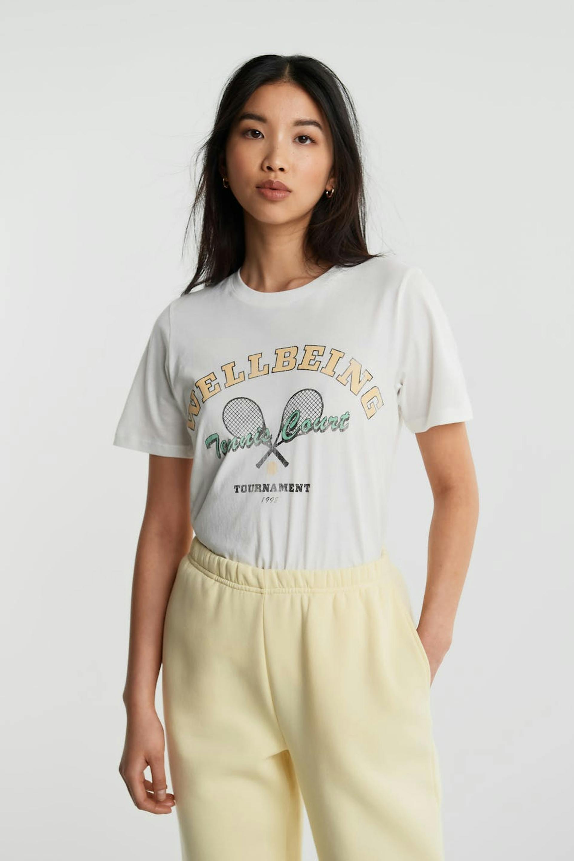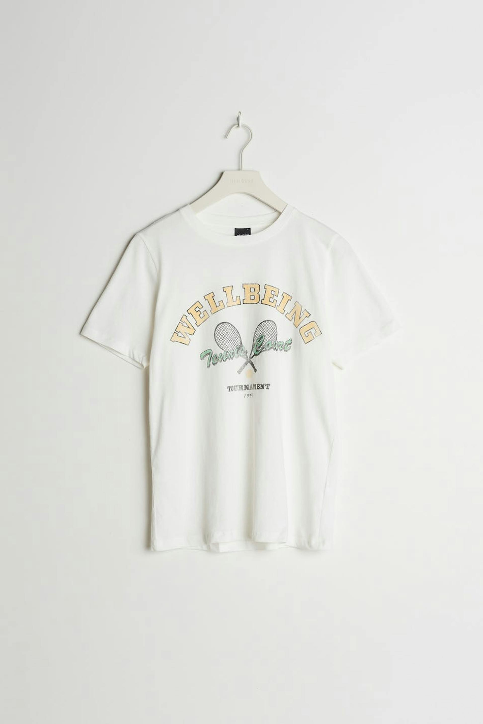 T-shirt med en normal pasform. T-shirten er hvid og har et tryk med tennis-stil på brystet. Den har en rund halsudskæring og en smal ribmanchet.