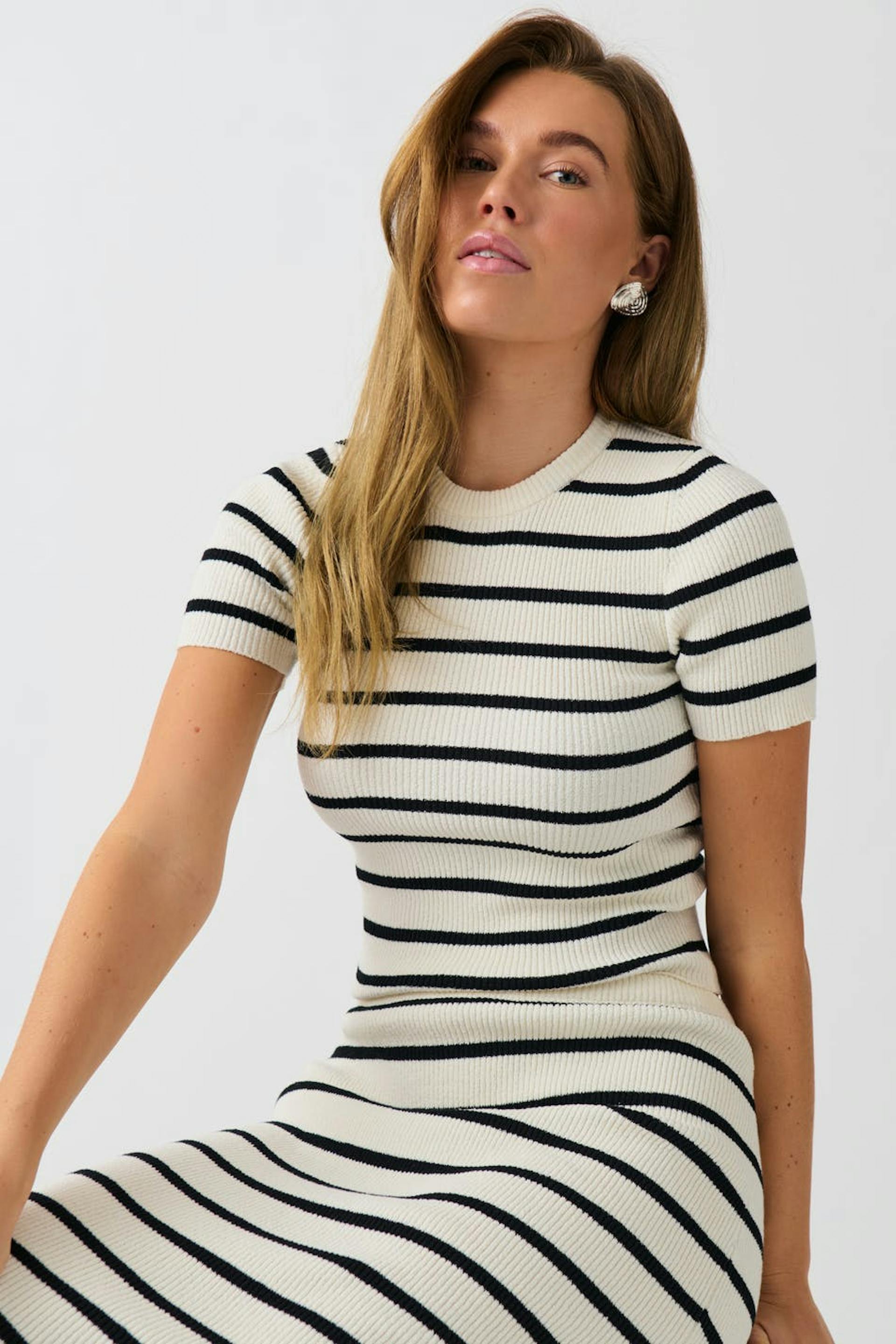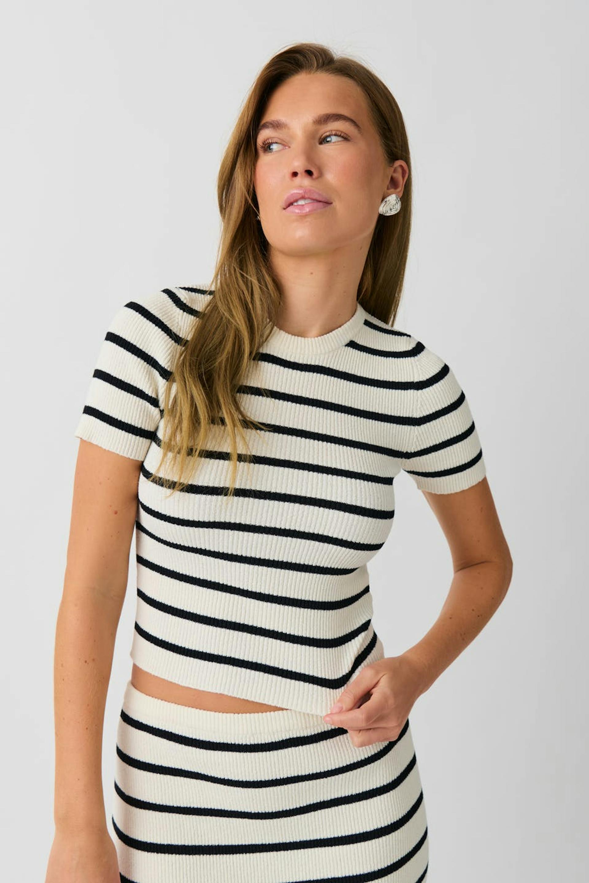 Stribet top med kort ærme. Toppen er hvid, sort og strikket. Den har figurnær pasform og rund udskæring.