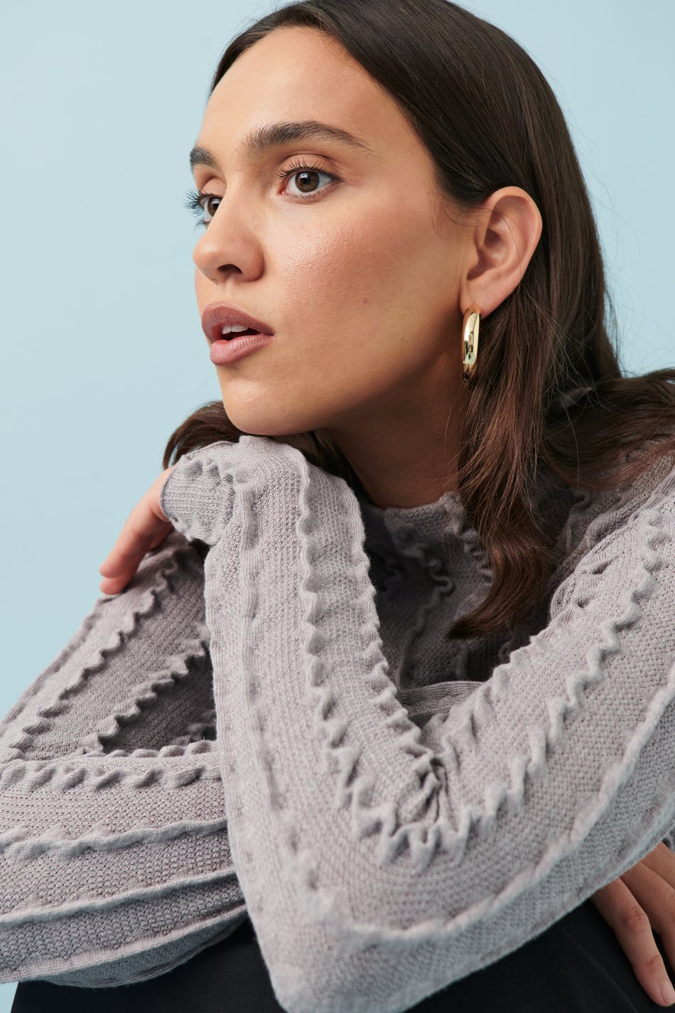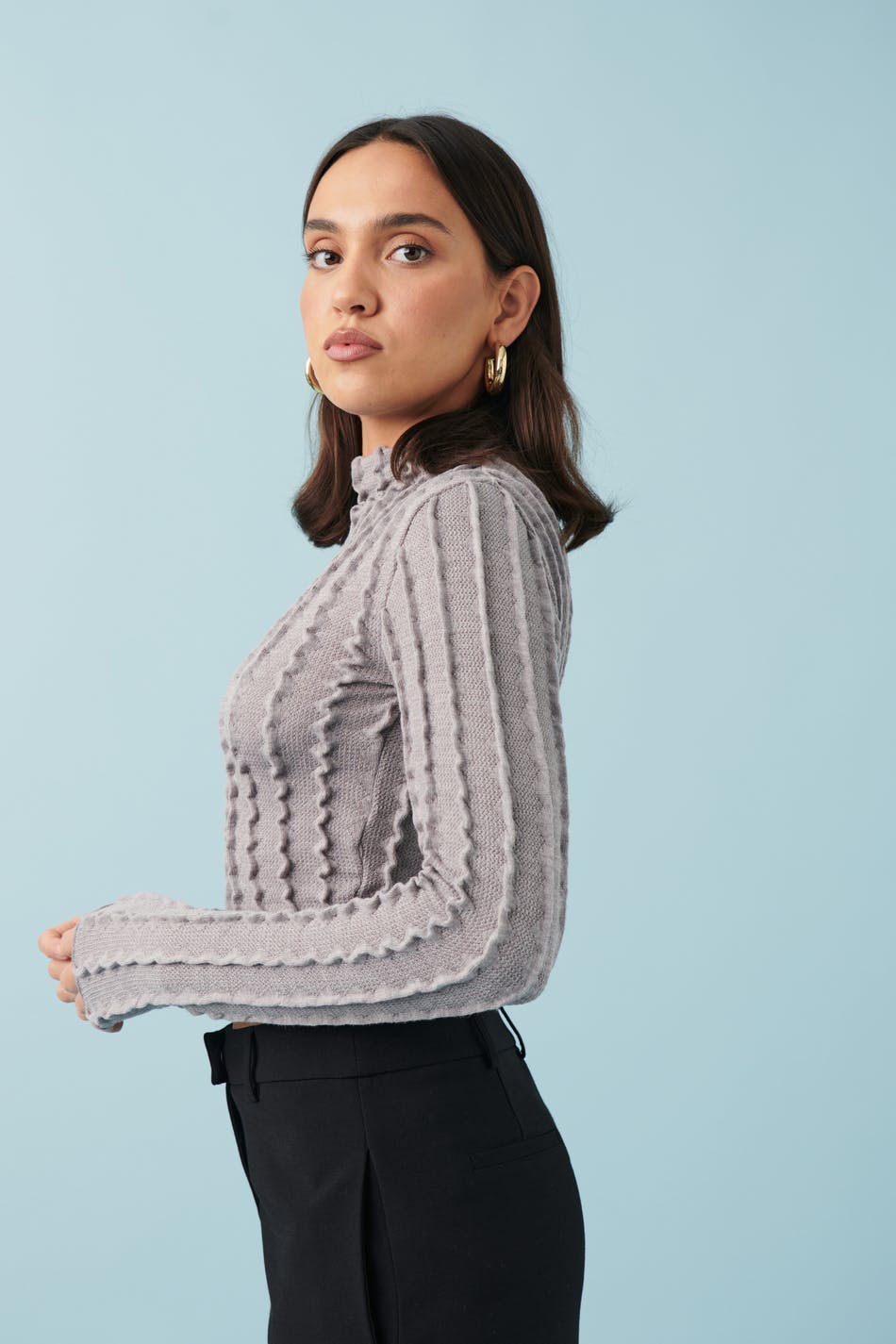 Tekstureret top med rullekrave. Toppen er grå og har figurnær pasform. Den har langt ærme og croppet længde.