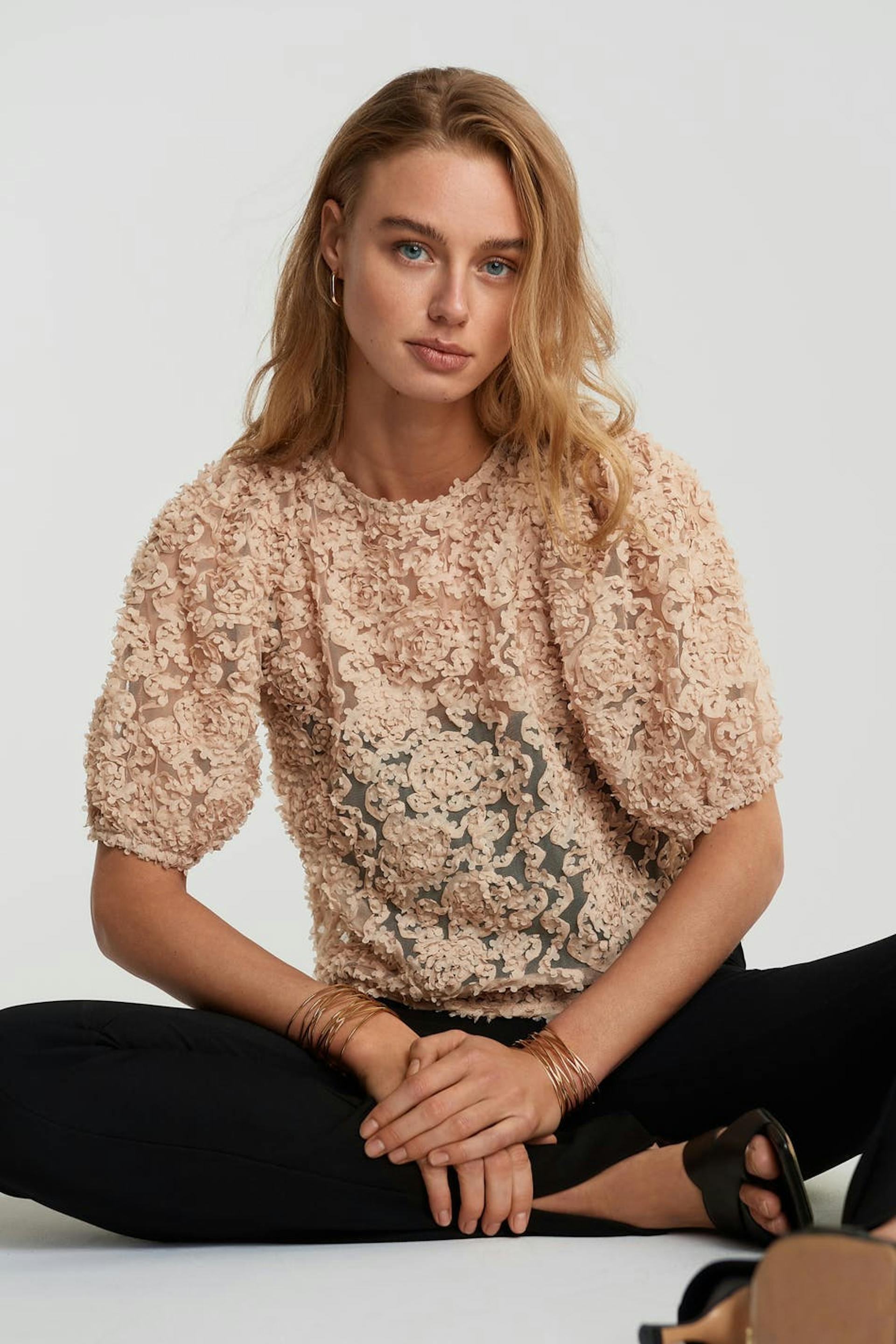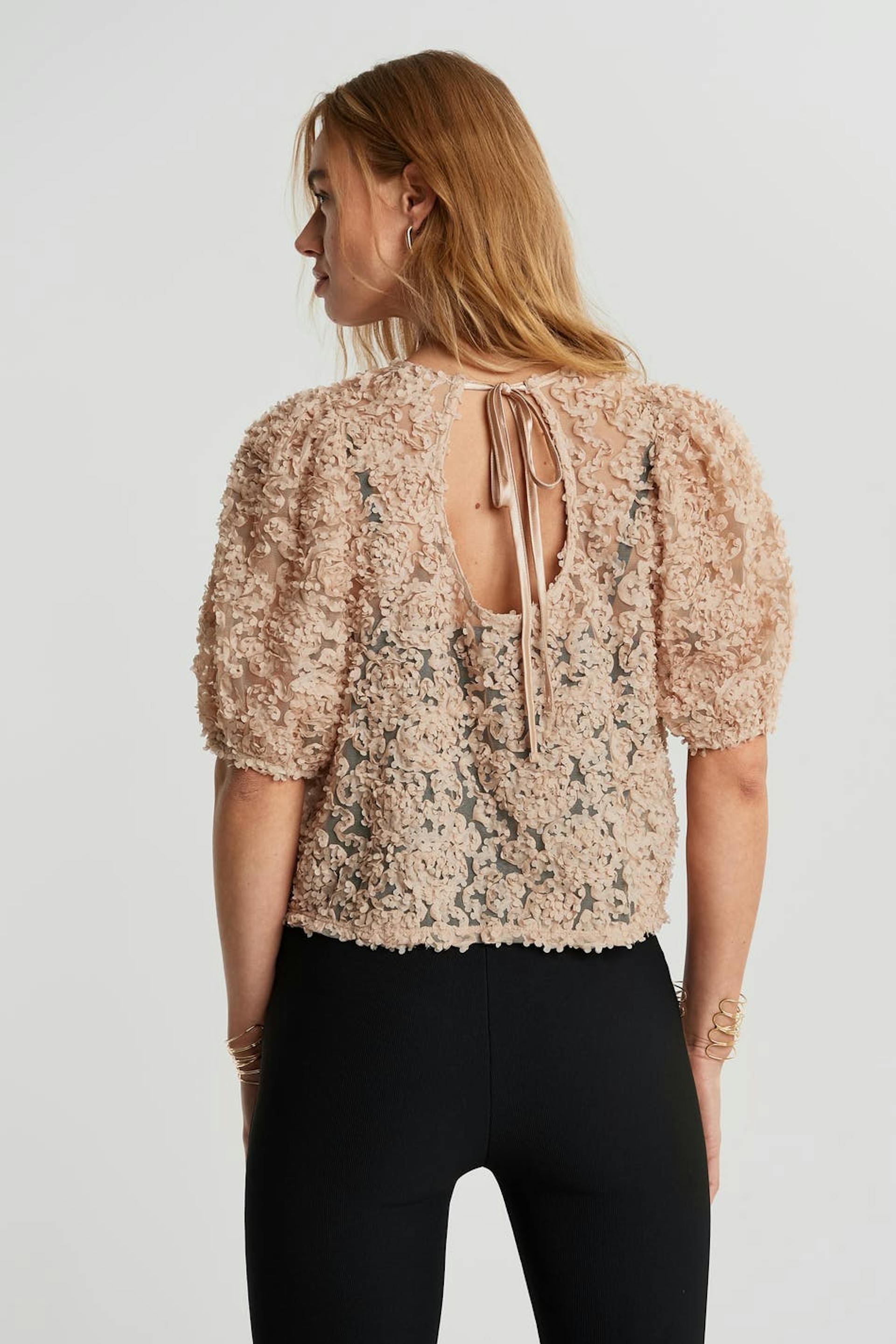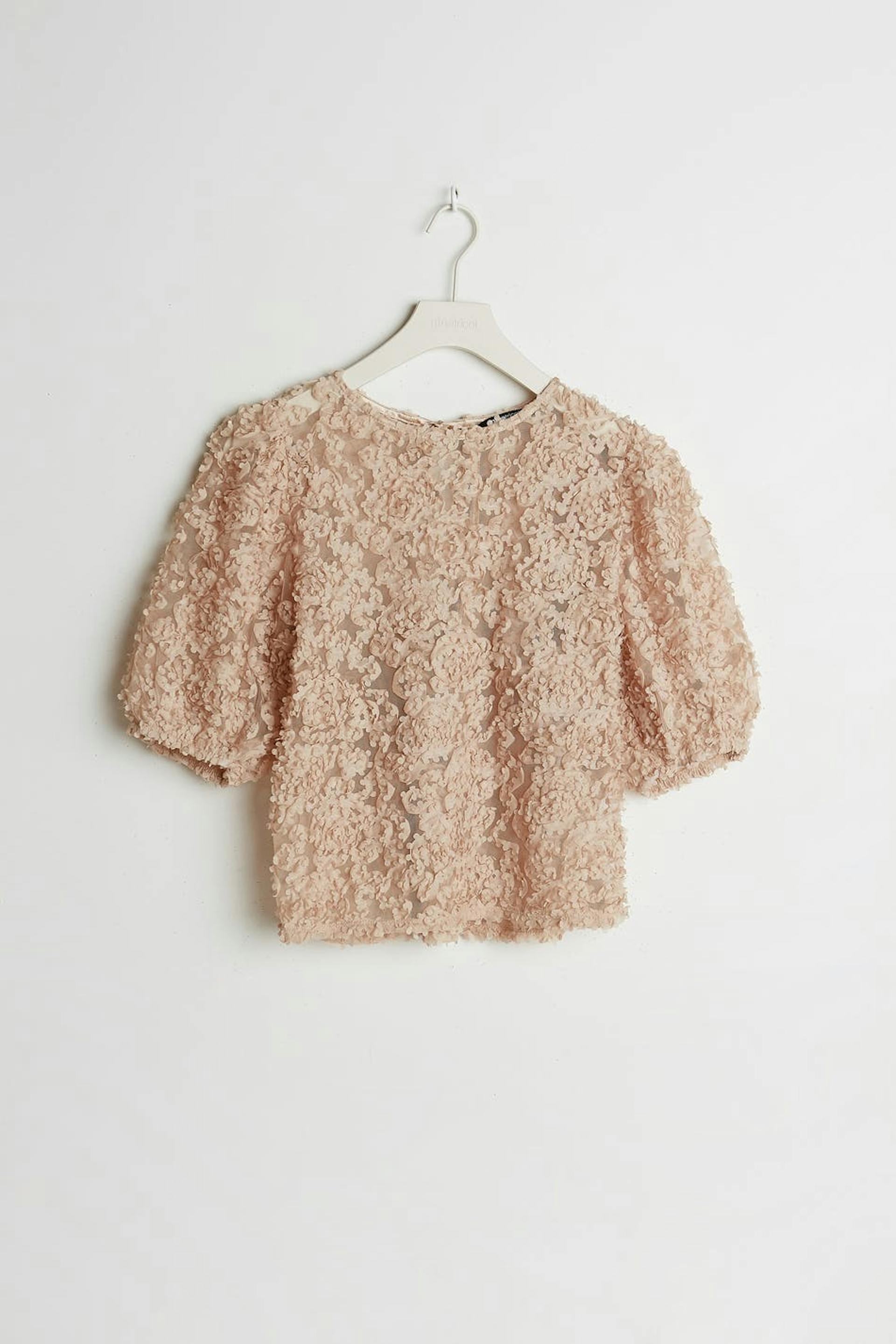Top med en normal pasform. Toppen er perfekt til festen og beige og har korte pufærmer. Den har 3D detaljer.