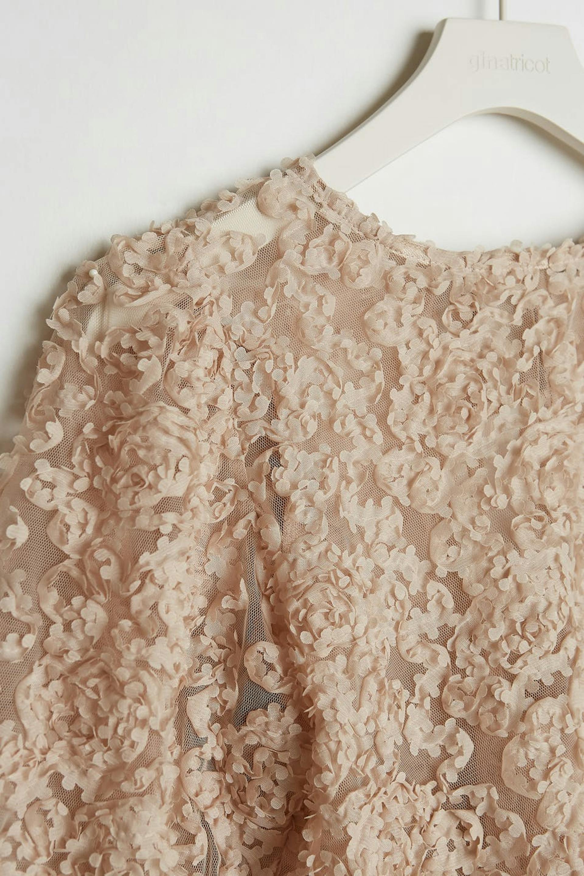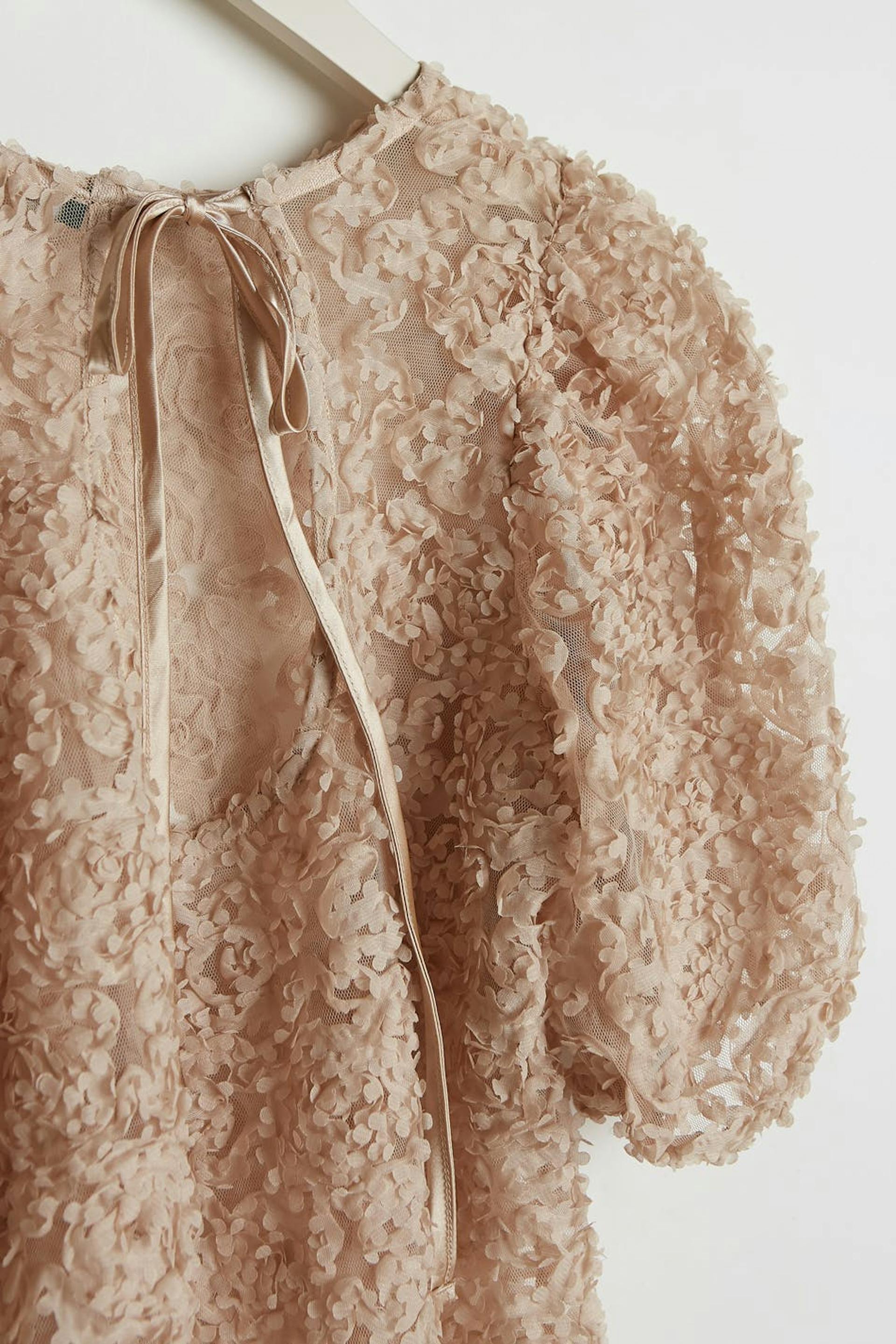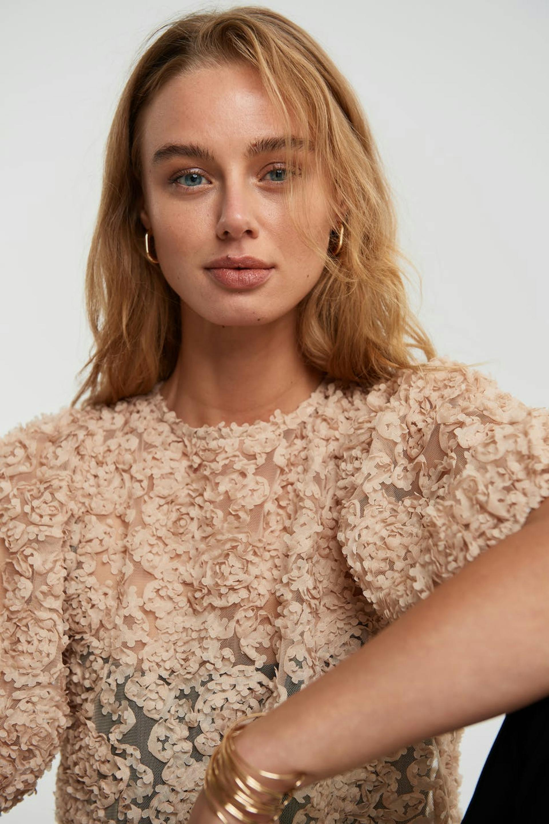 Top med en normal pasform. Toppen er perfekt til festen og beige og har korte pufærmer. Den har 3D detaljer.