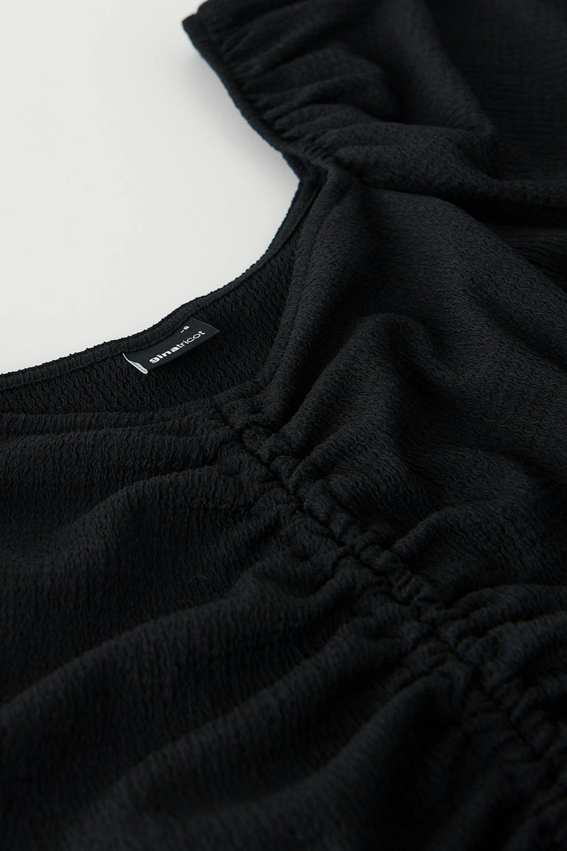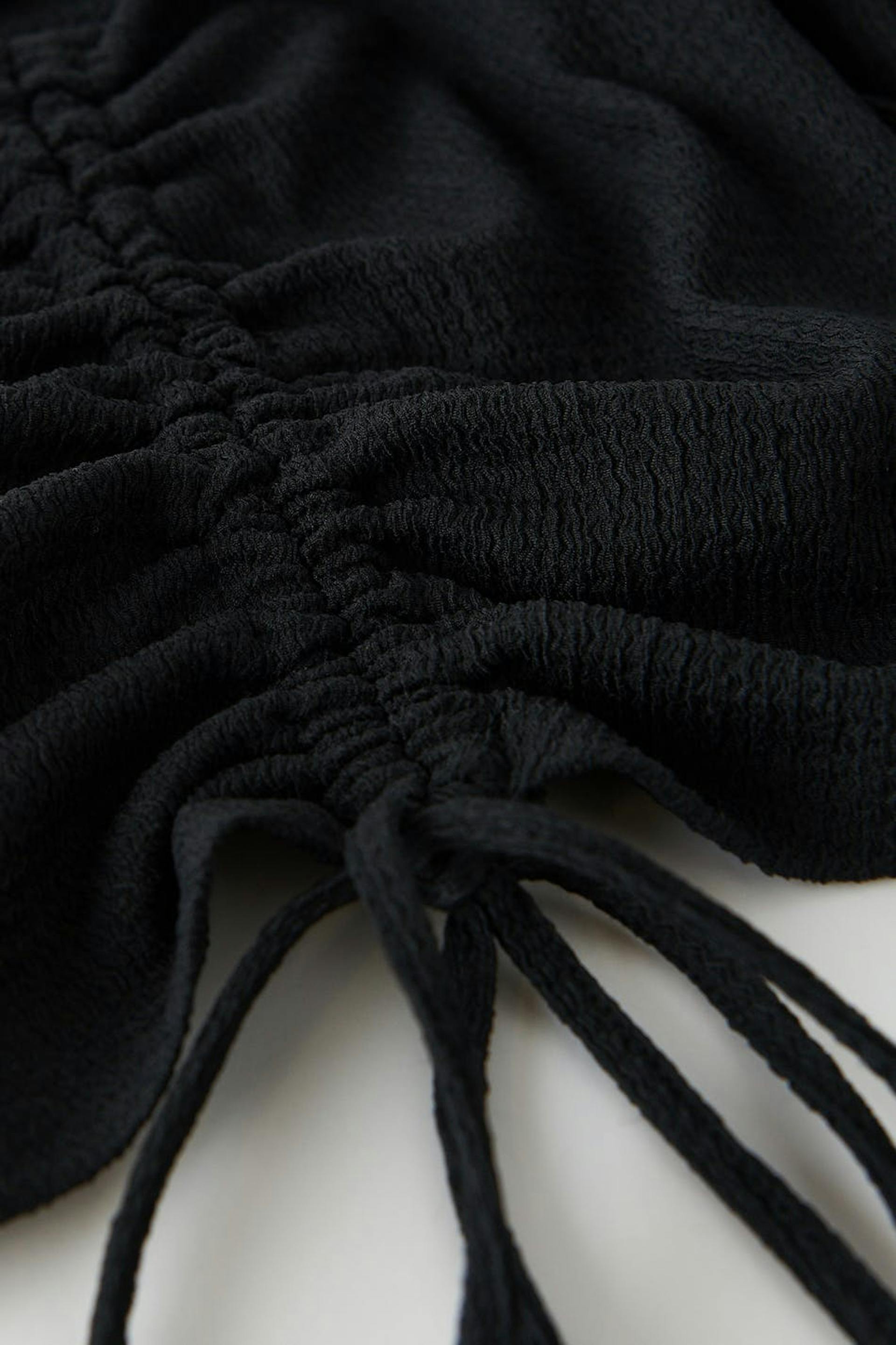 Croptop i genindvundet polyester med korte pufærmer. Toppen er sort og har en figursyet pasform. Den har en sweetheart udskæring og en justérbar træksnørre langs forsiden med en rynket effekt.
