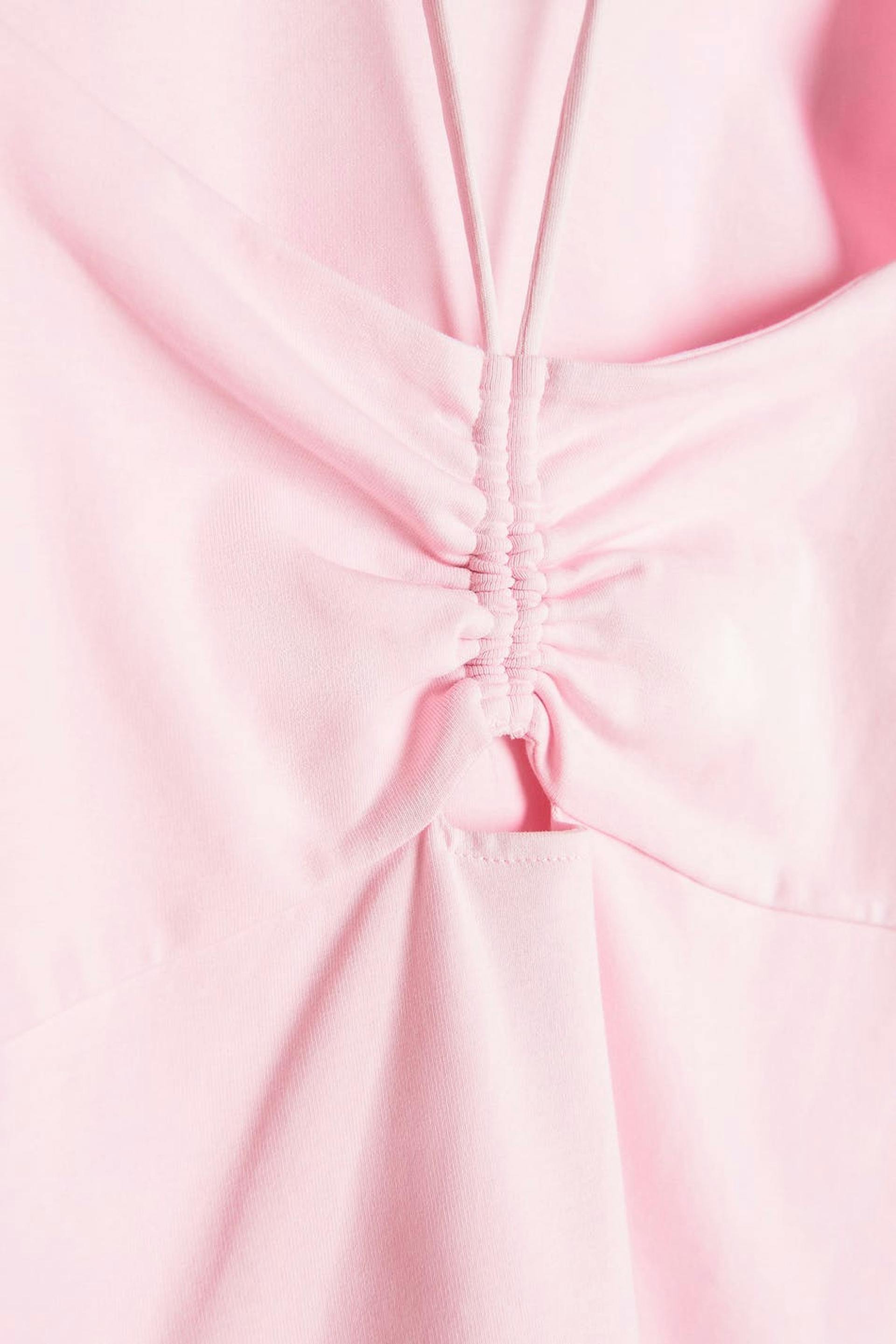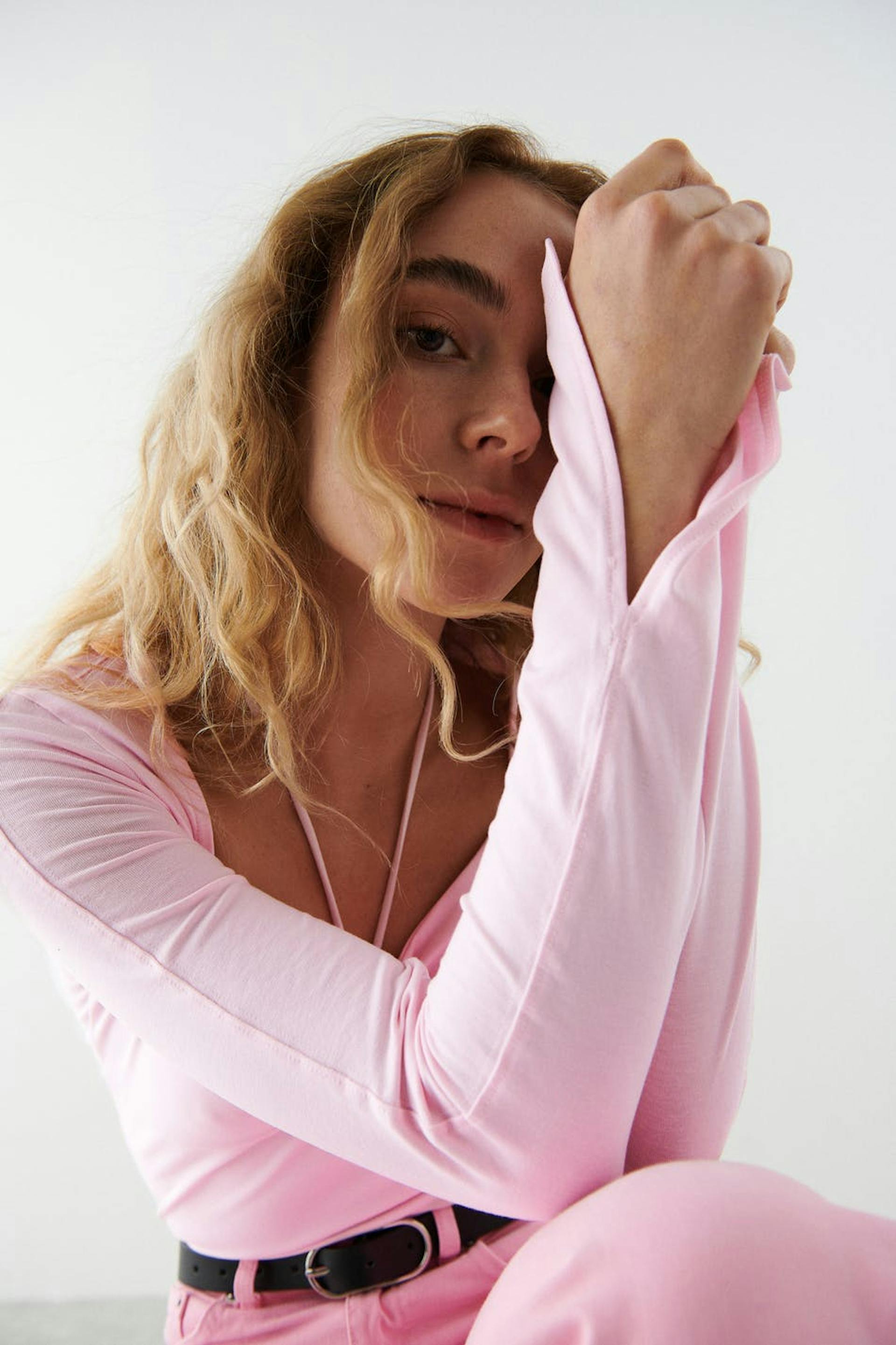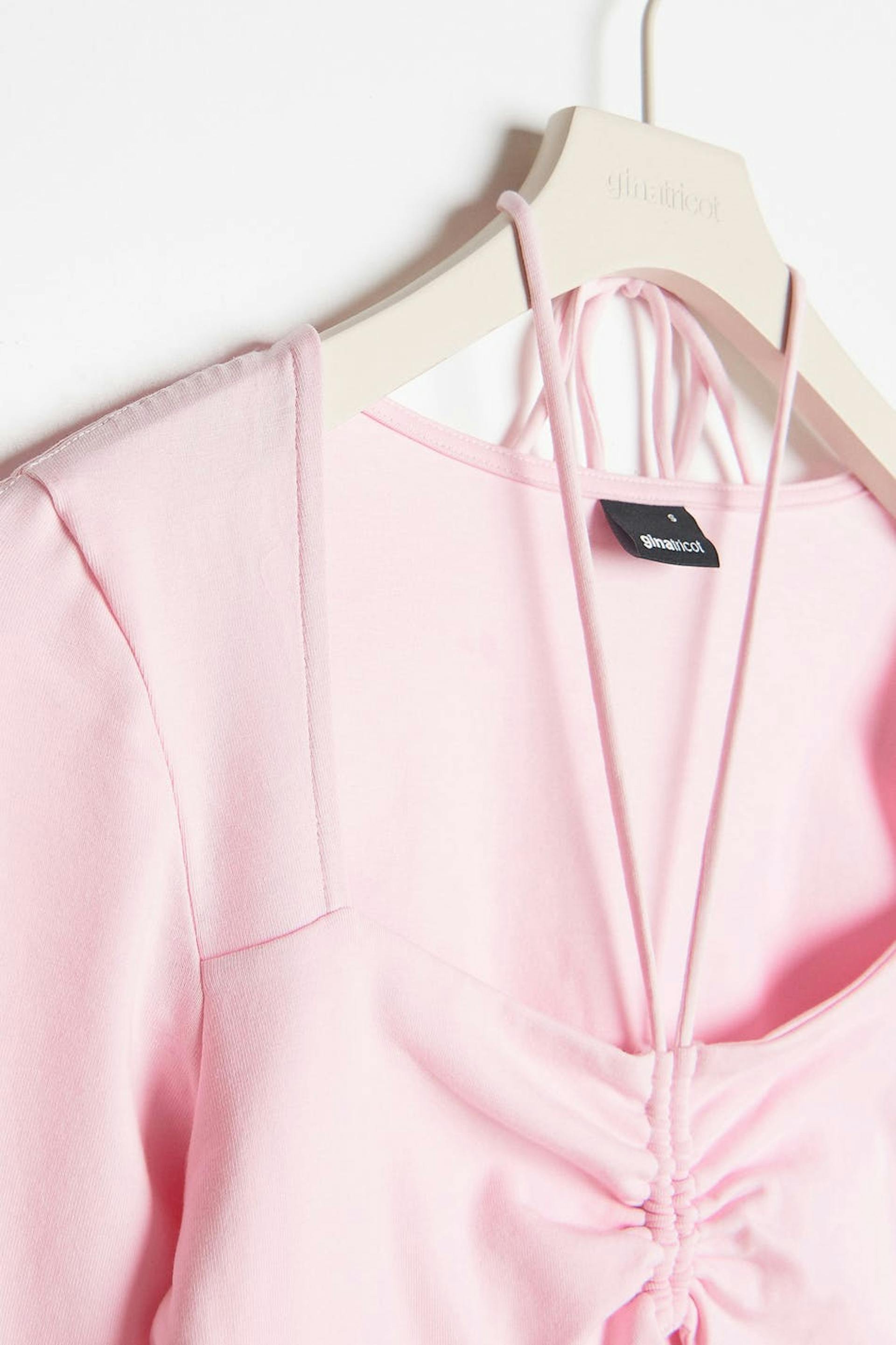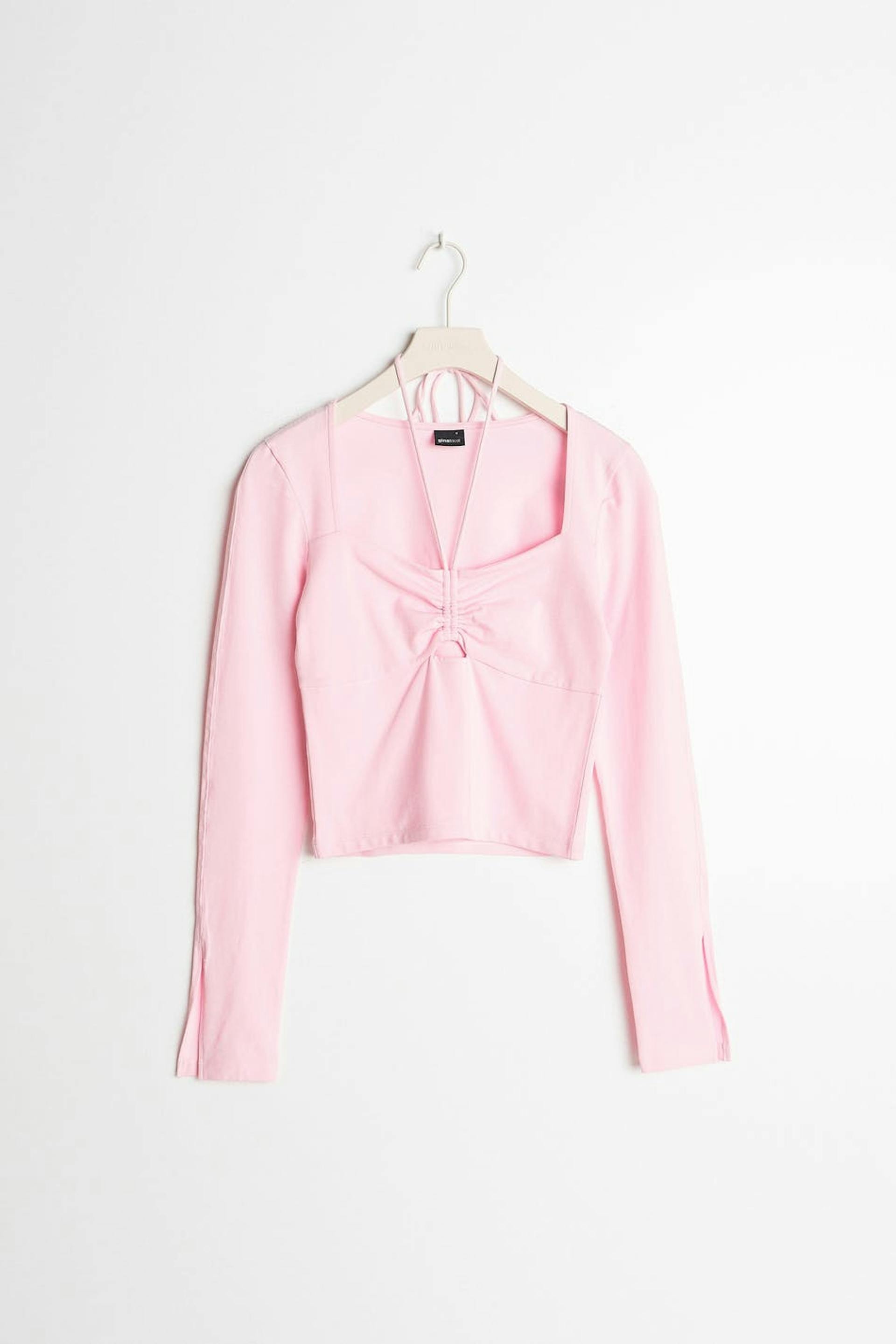 Langærmet top med halterneckdesign. Toppen er pink og har en figursyet pasform. Den har firkantet udskæring, bindbart bånd i nakken, slids på ærmeafslutningerne og en sømdetalje under brystet med nøglehulsåbning.