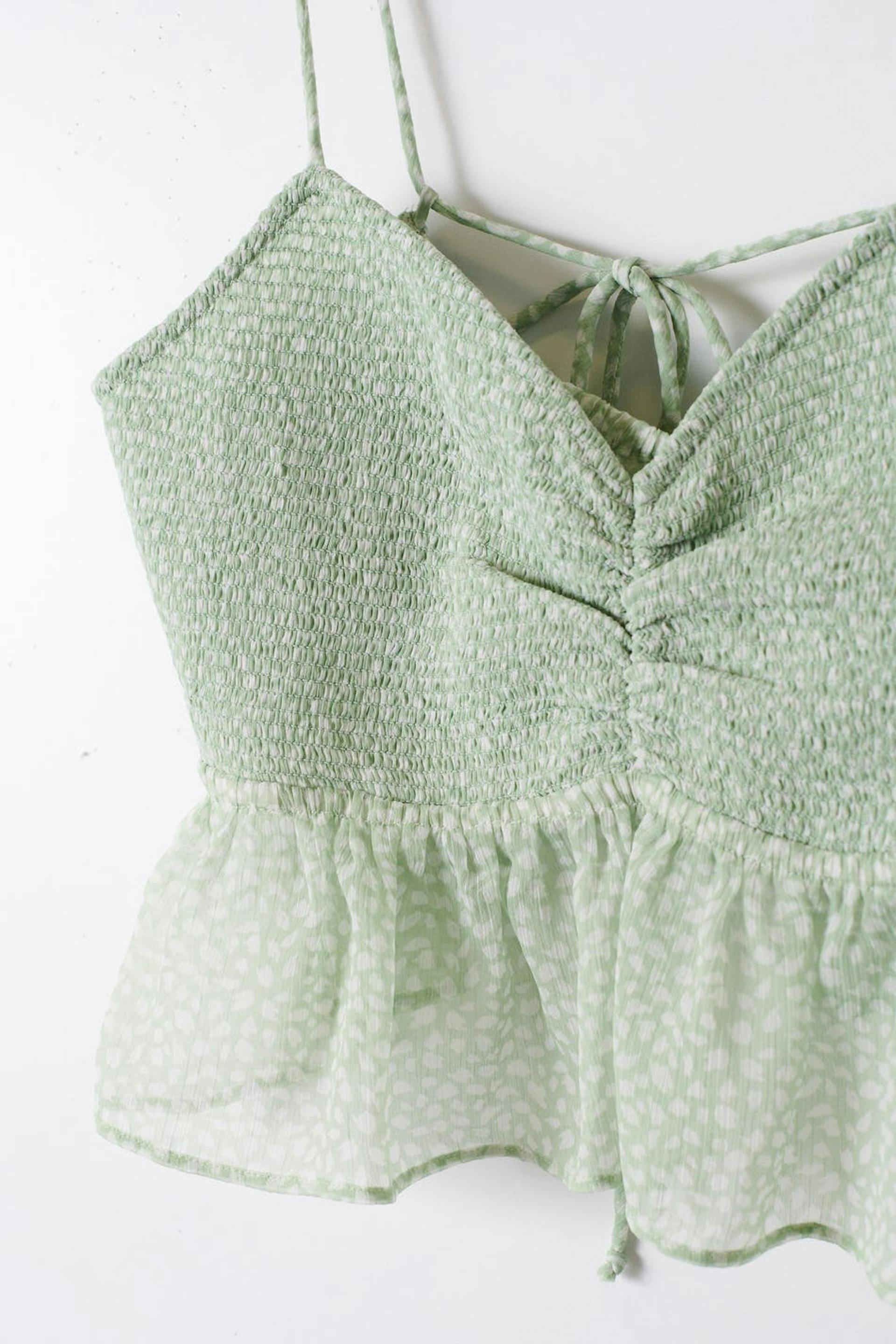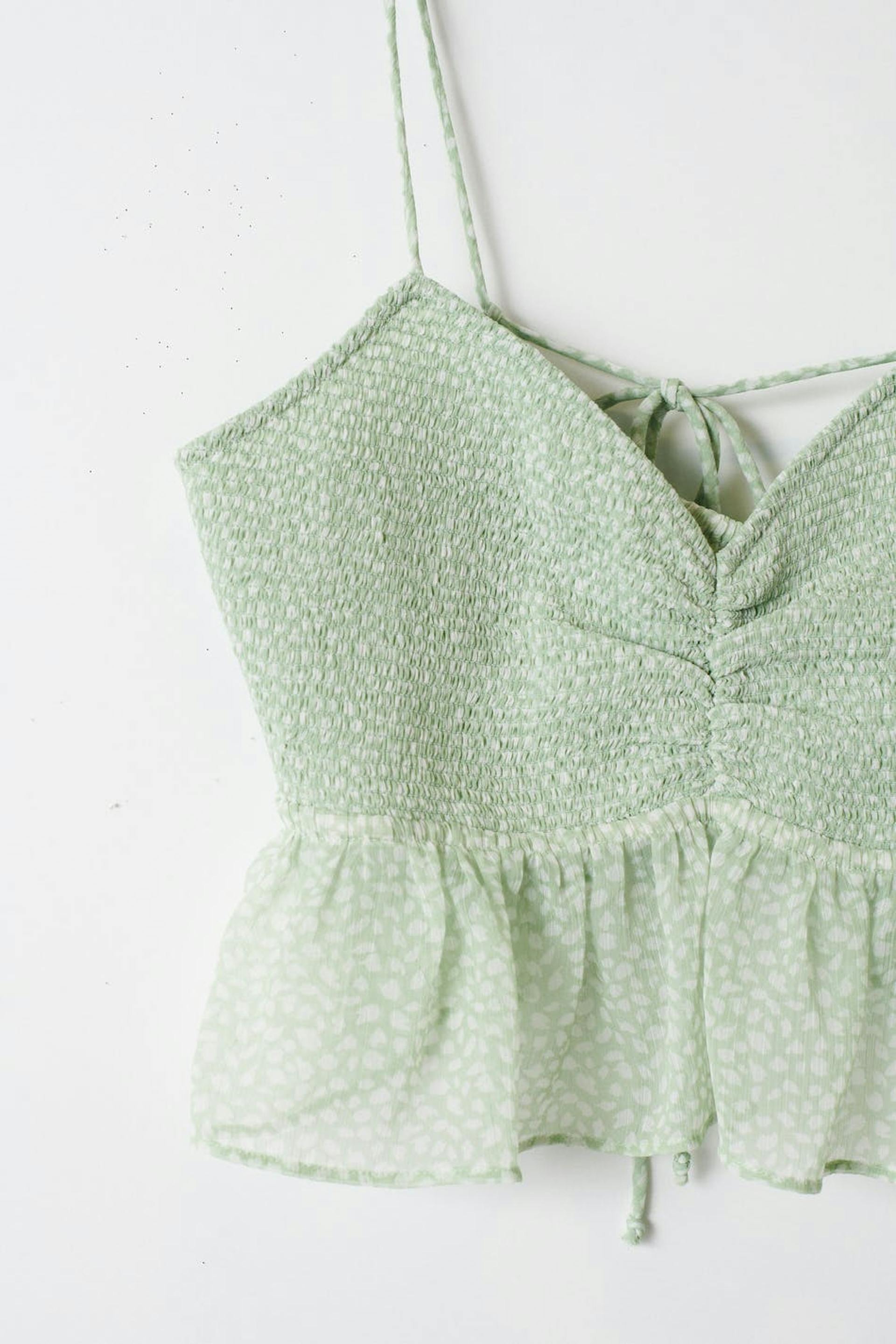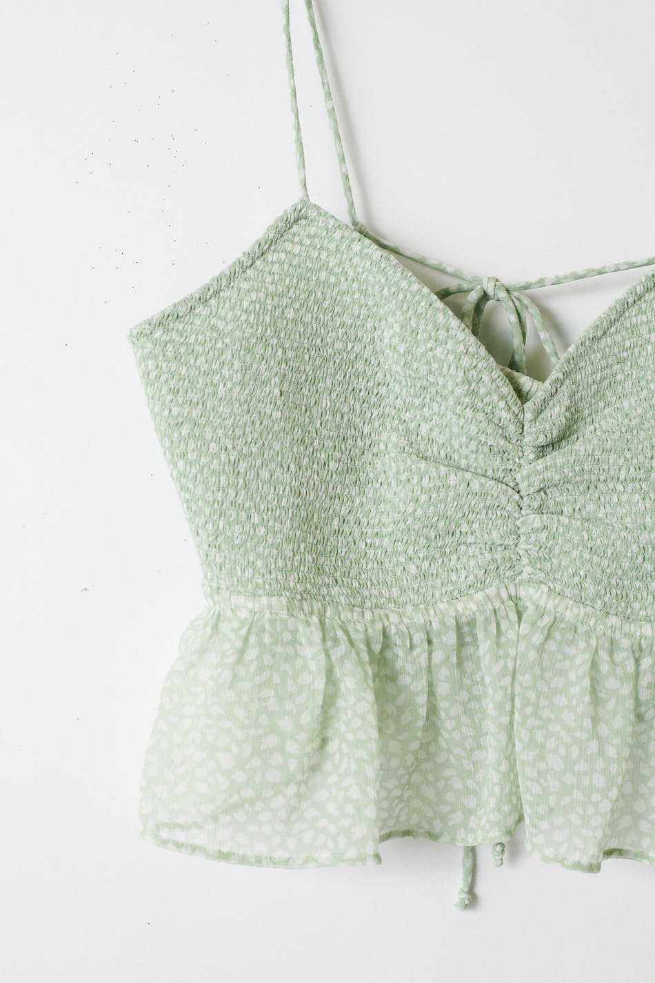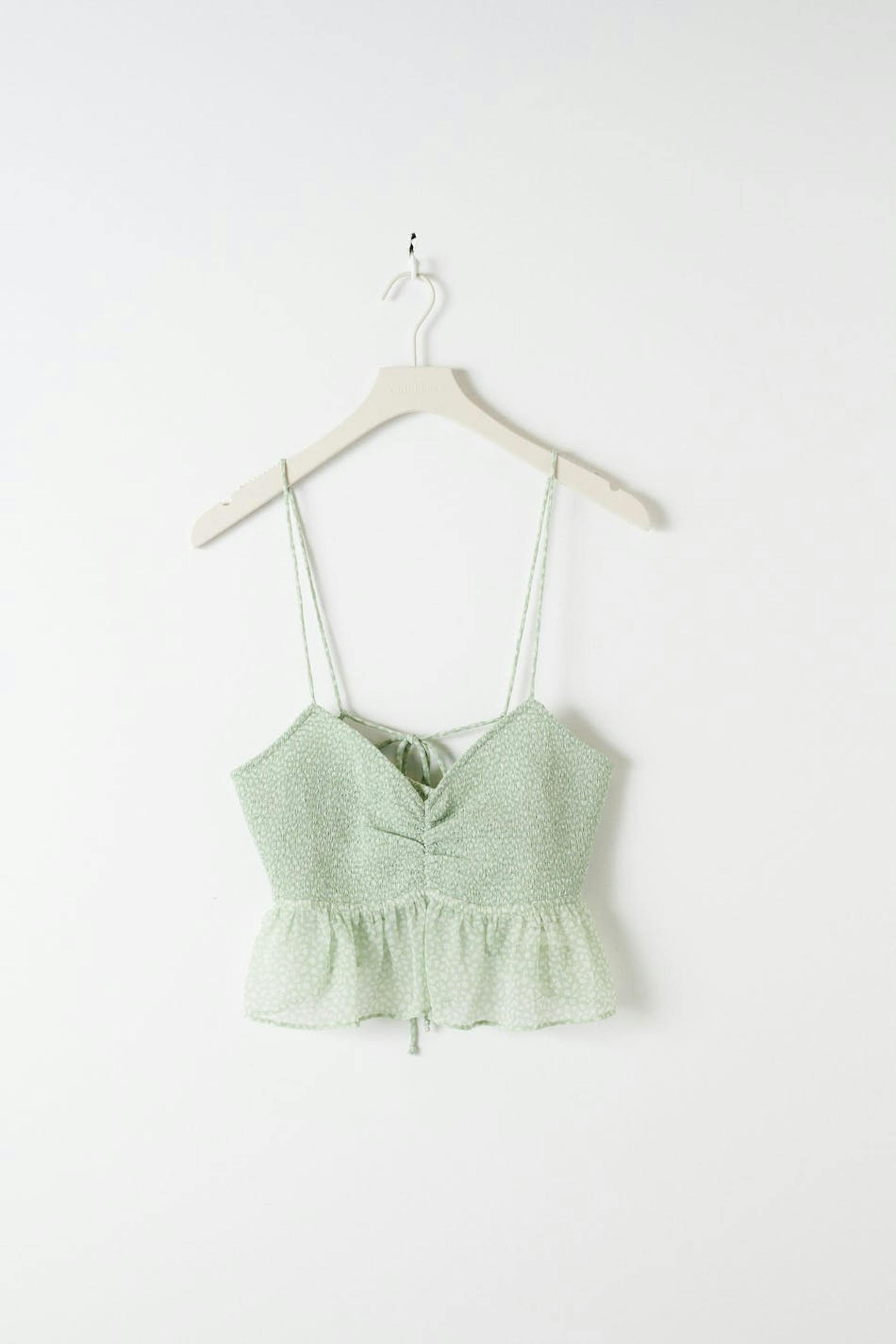 Prikket top i chiffon med v-udskæring. Toppen er grøn, ærmeløs og croppet. Den har tynde skulderstropper som bindes på ryggen, volanter nederst, en rynket detalje på brystet og et materiale i genindvundet polyester.