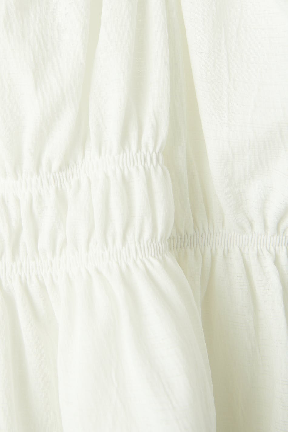 Langærmet top med folderig byste. Toppen er hvid og har pufærmer. Den har firkantet udskæring med elastik og volantdetaljer.