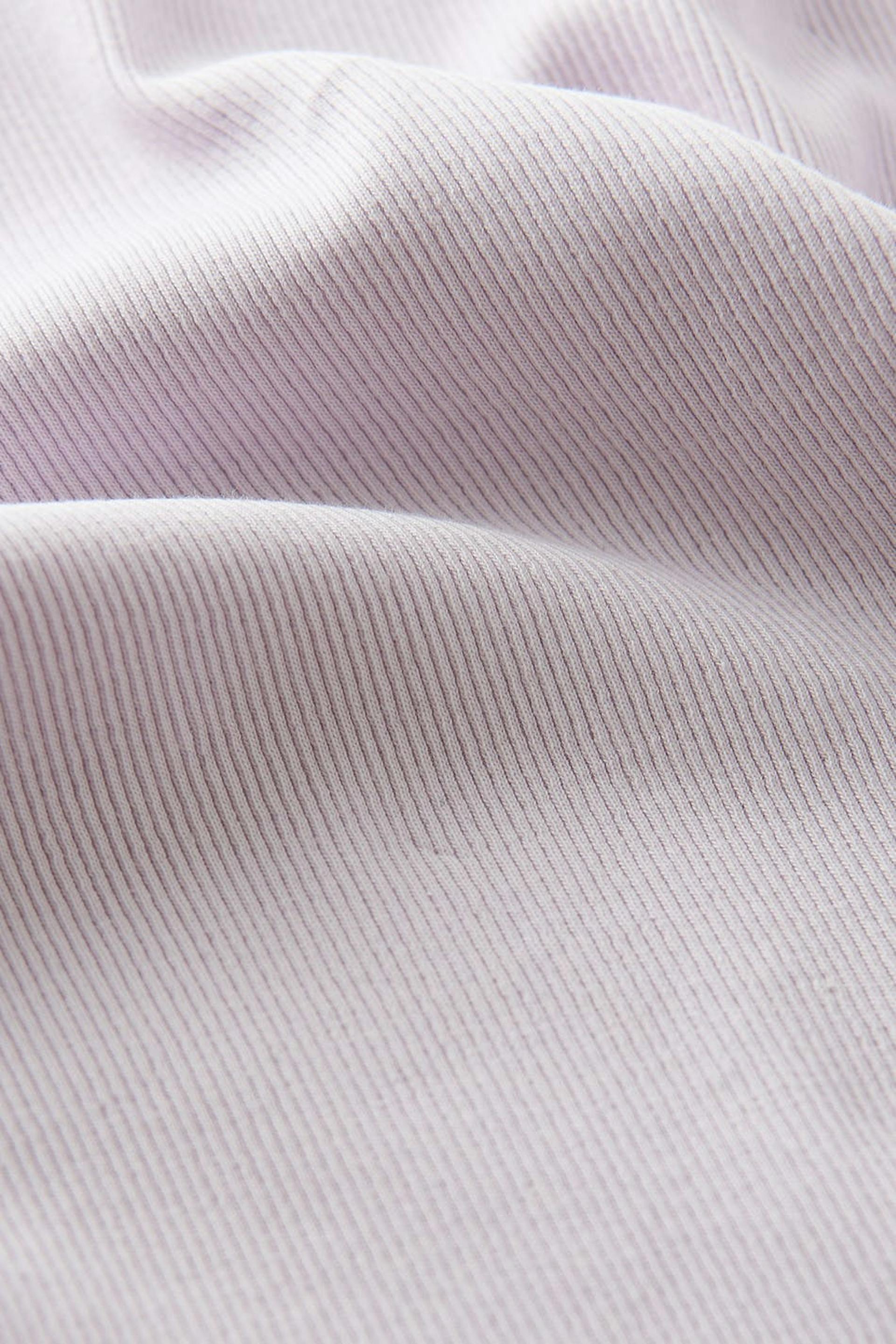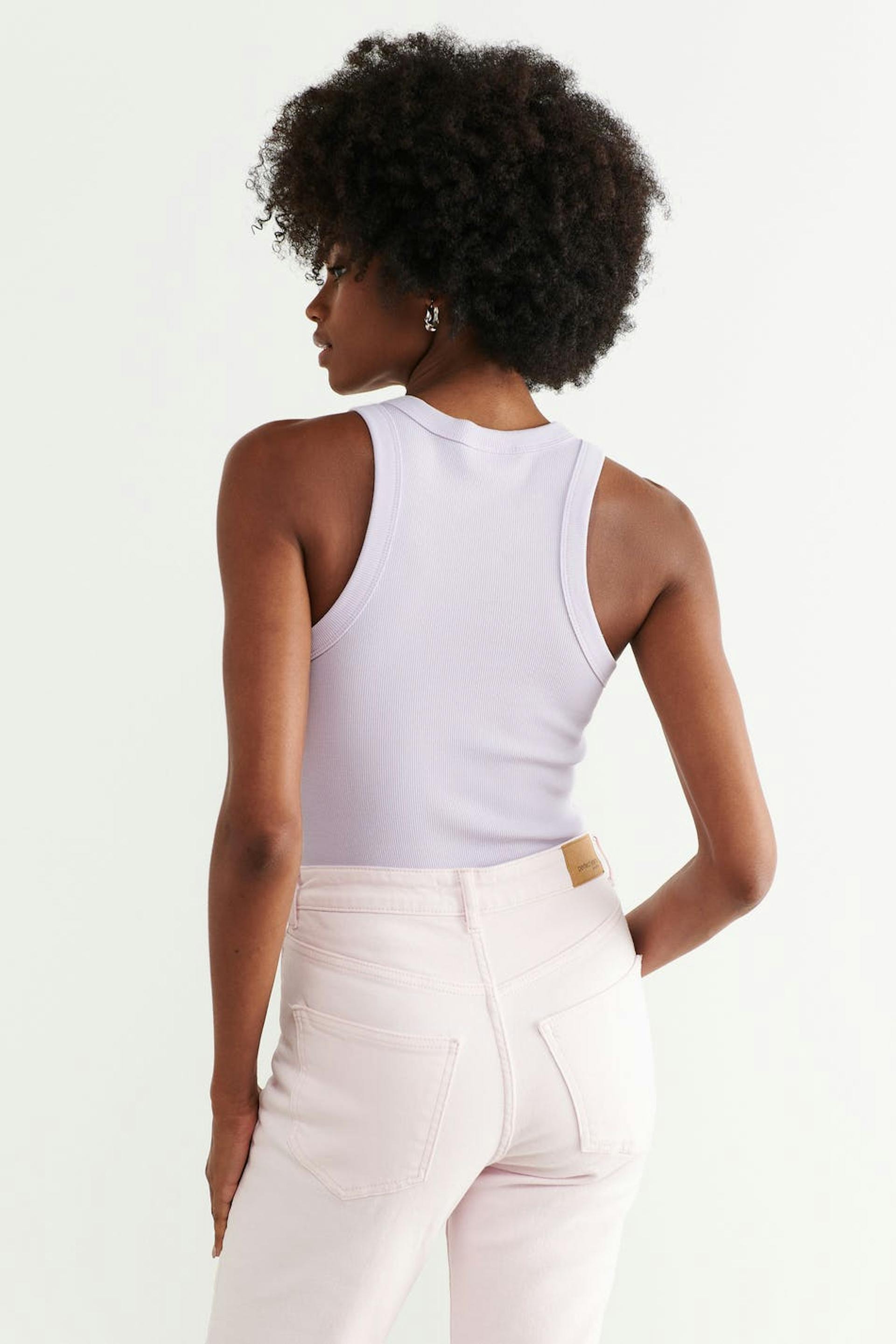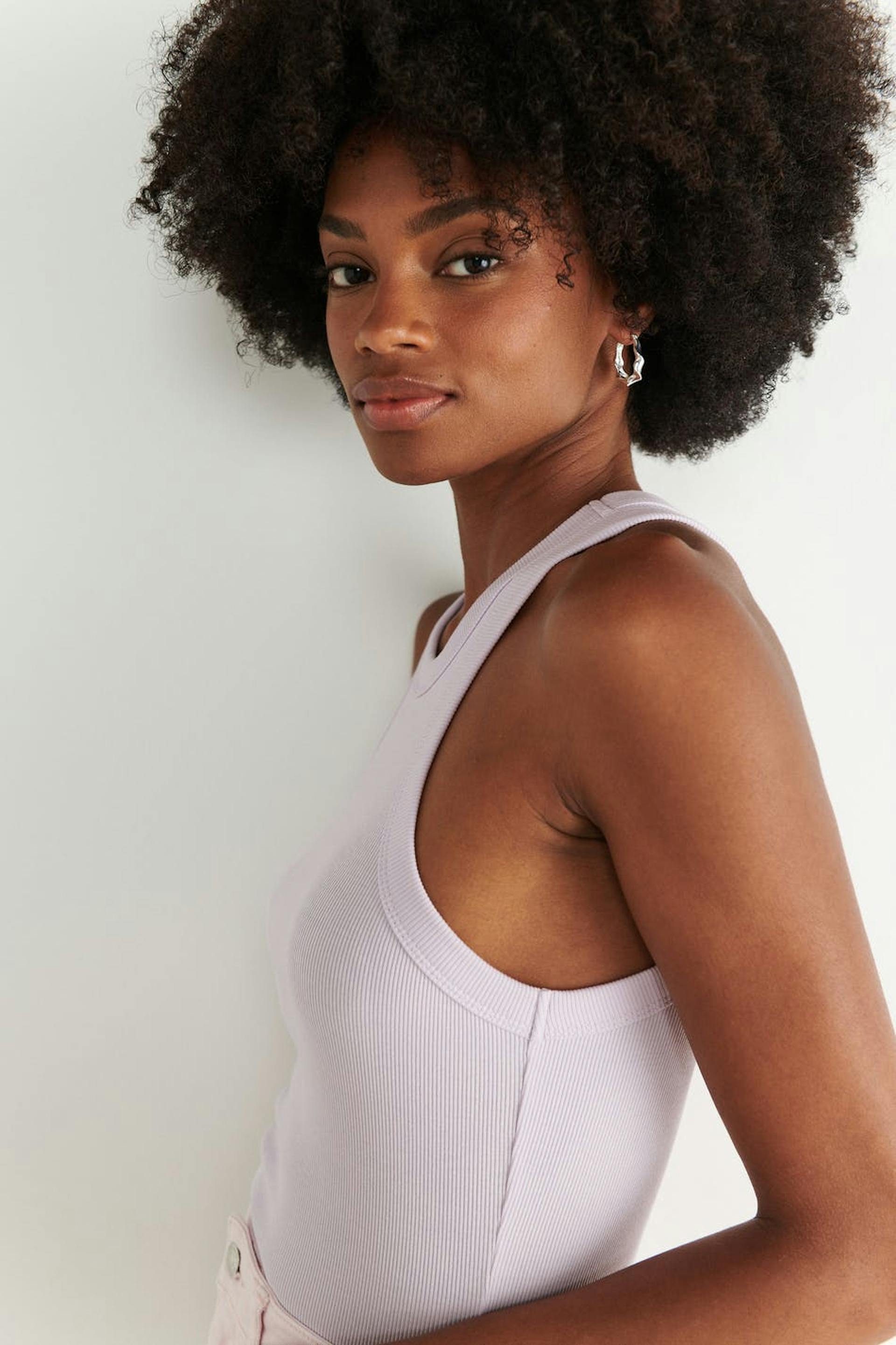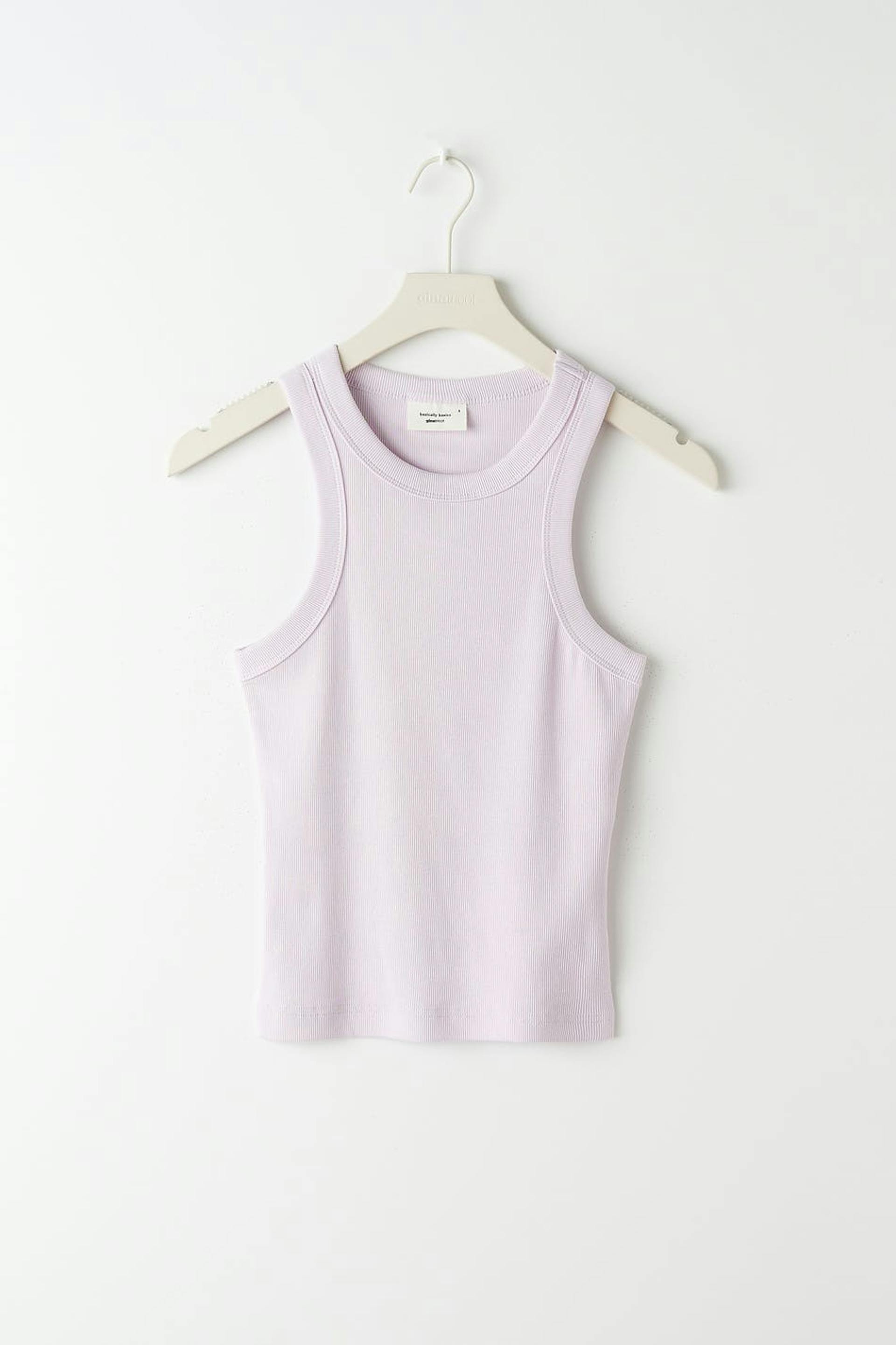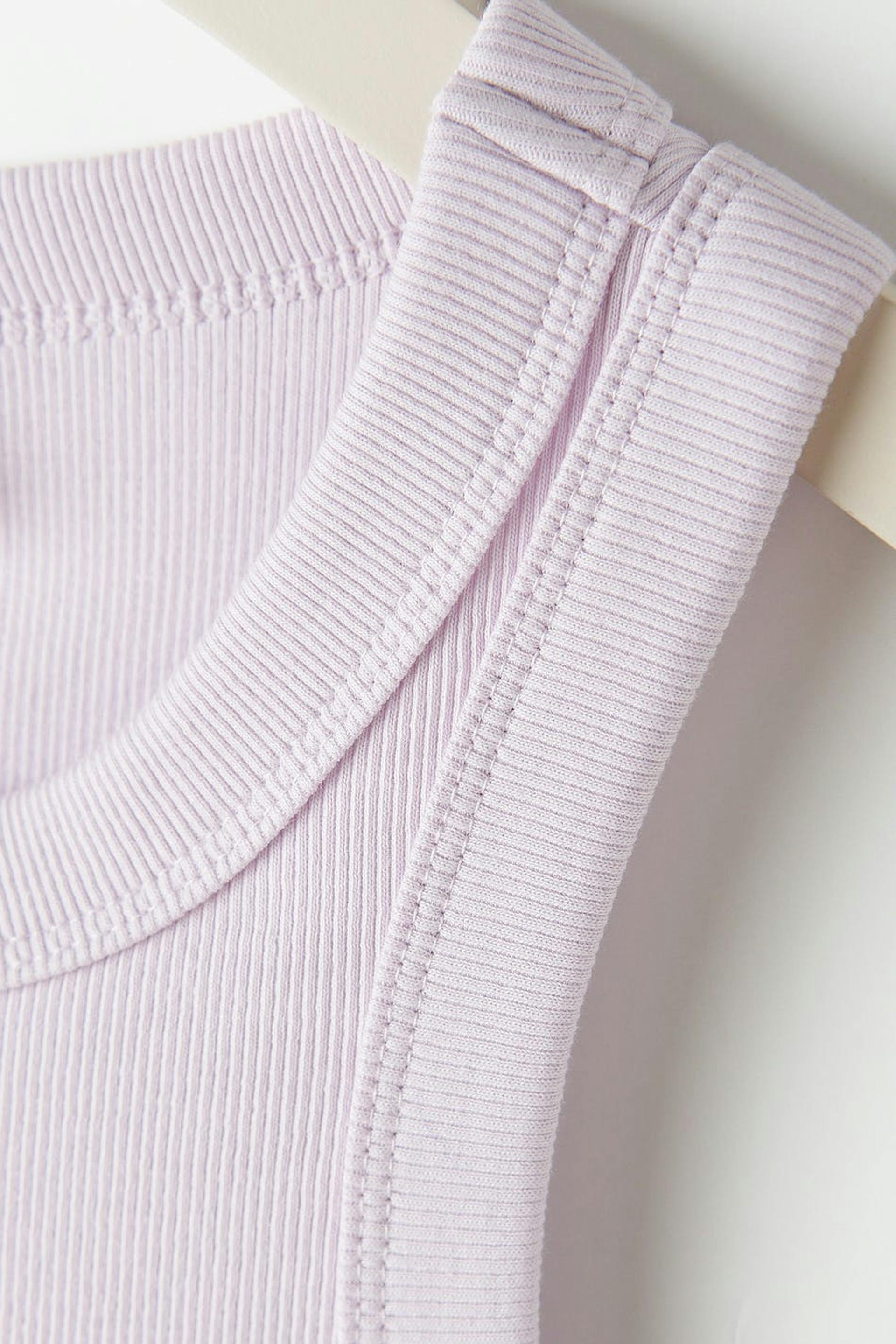 Ribbet tanktop med en figursyet pasform. Tanktoppen er lilla, ærmeløs og croppet. Den har en elastisk kvalitet i jersey.