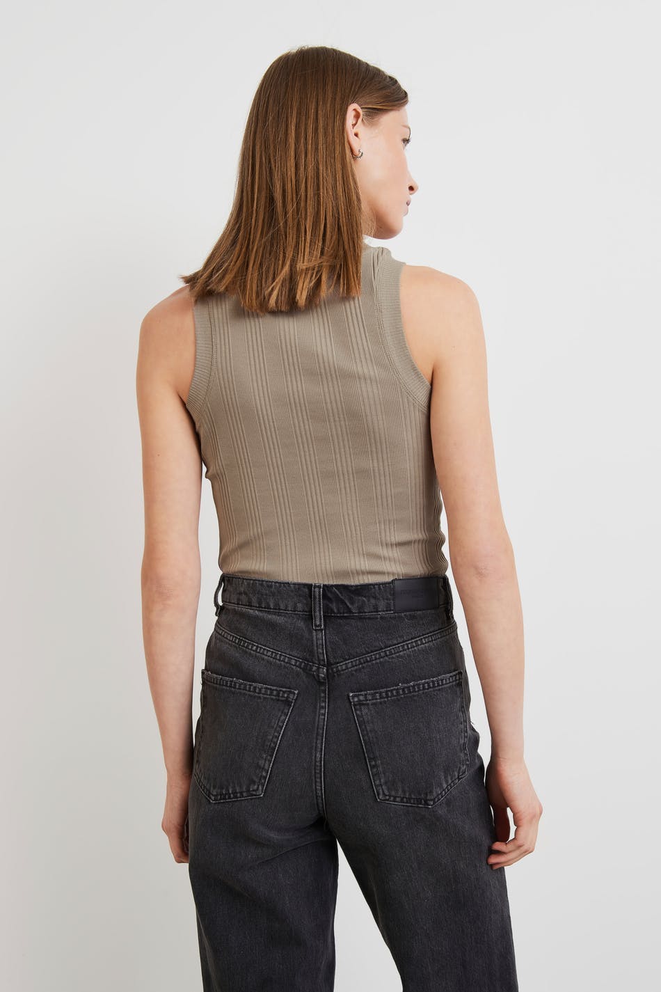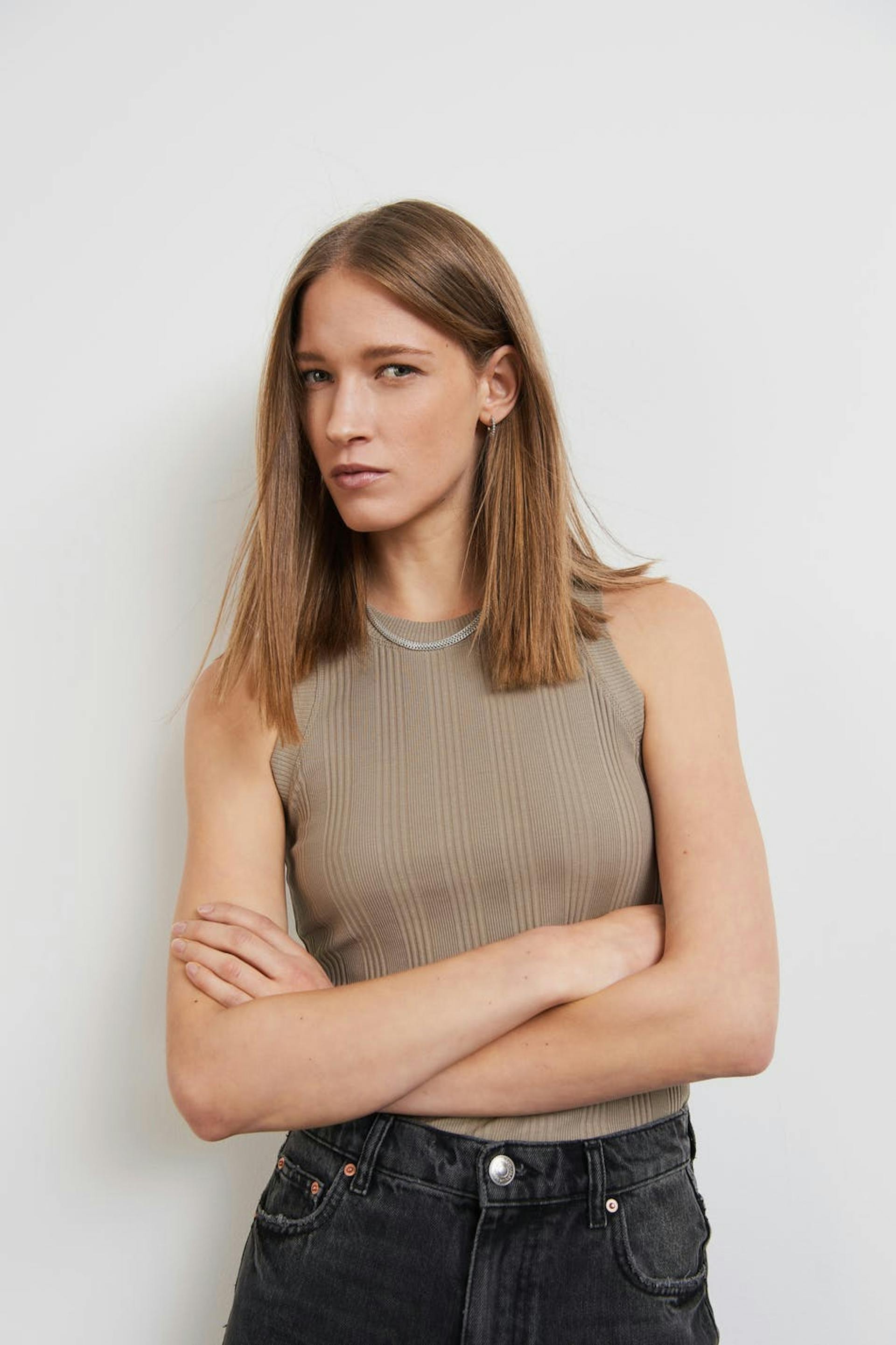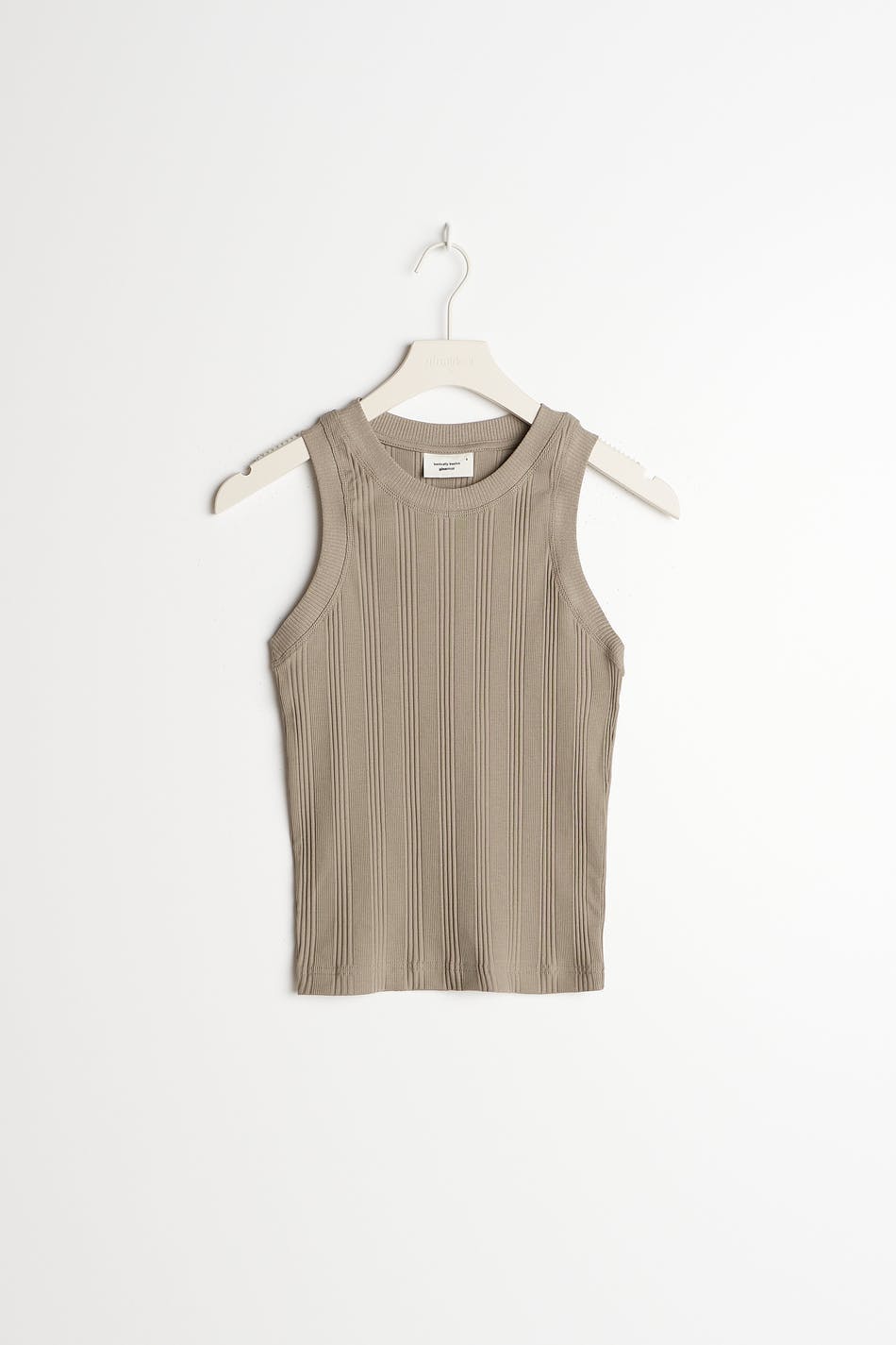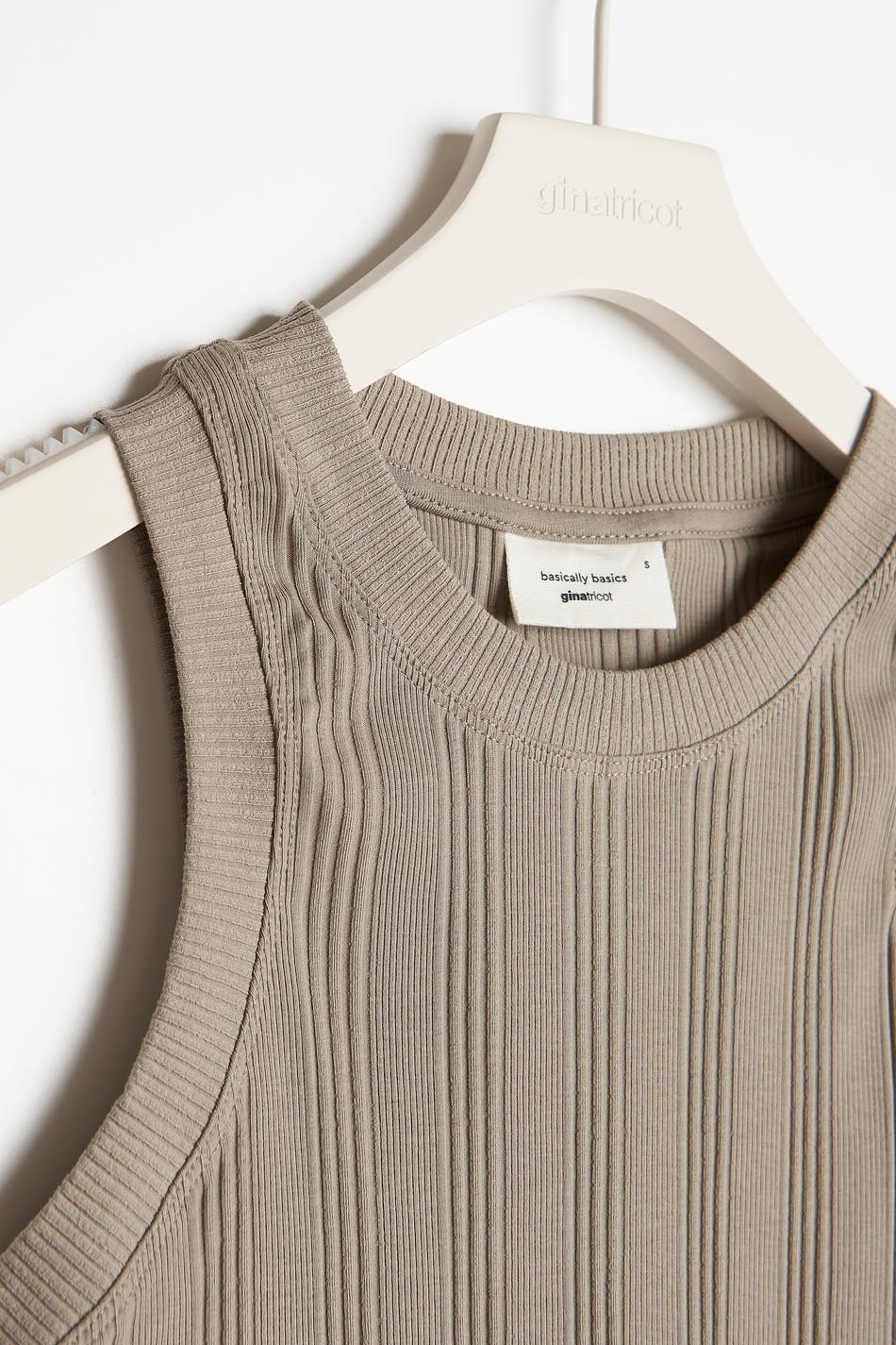 Ribbet tanktop med en figursyet pasform. Tanktoppen er beige og har en afrundet udskæring. Den er fremstillet af jersey.