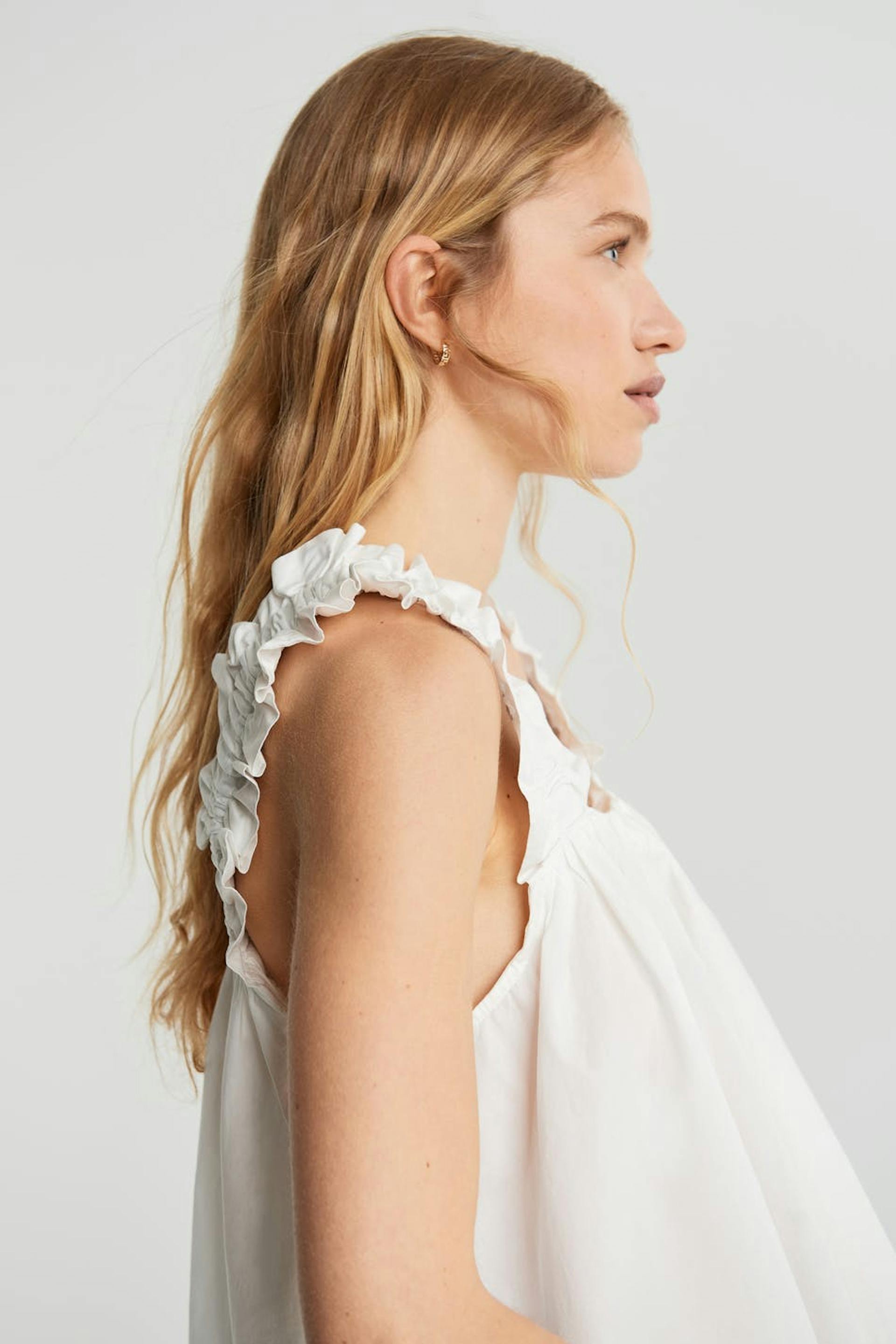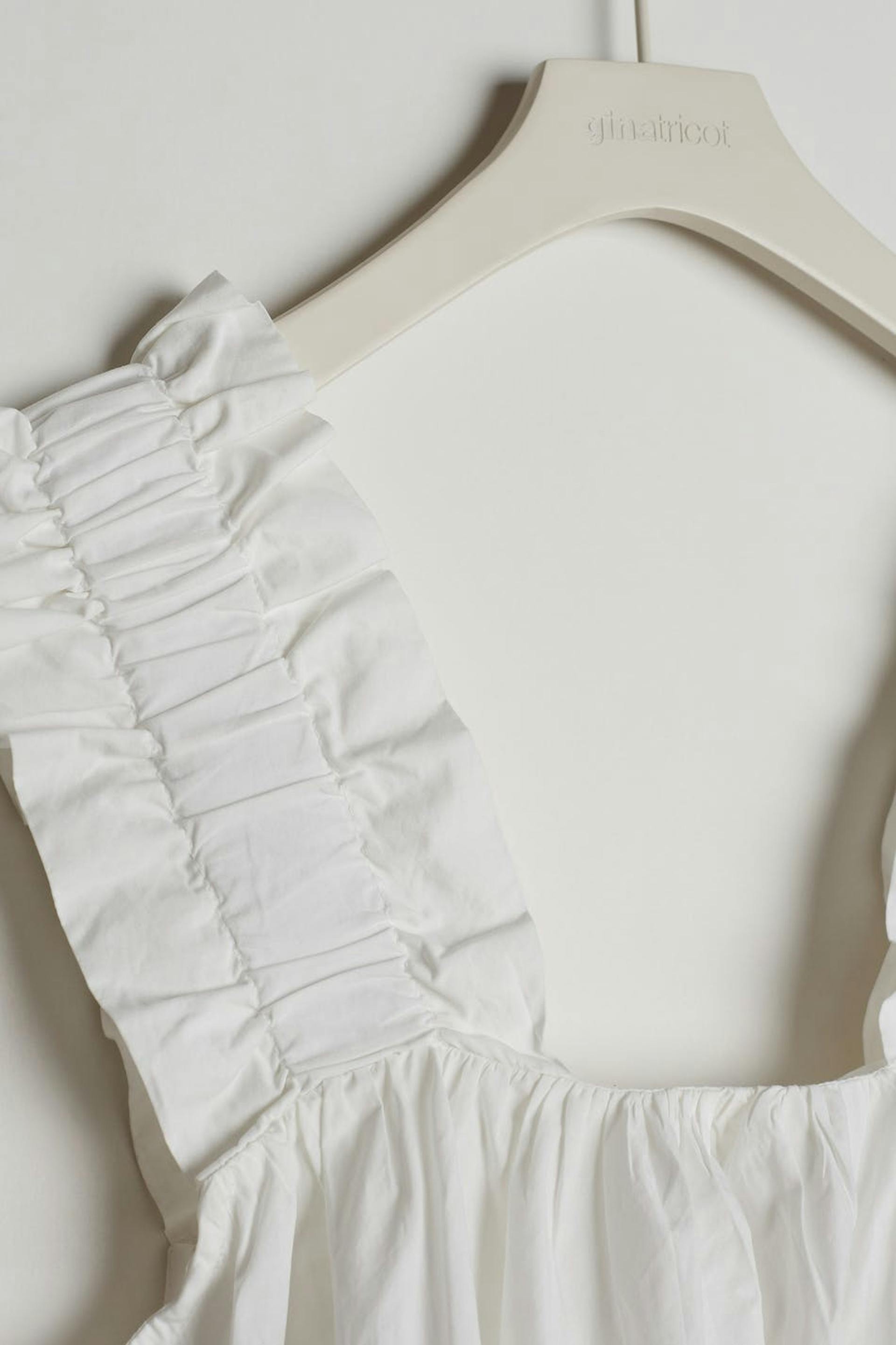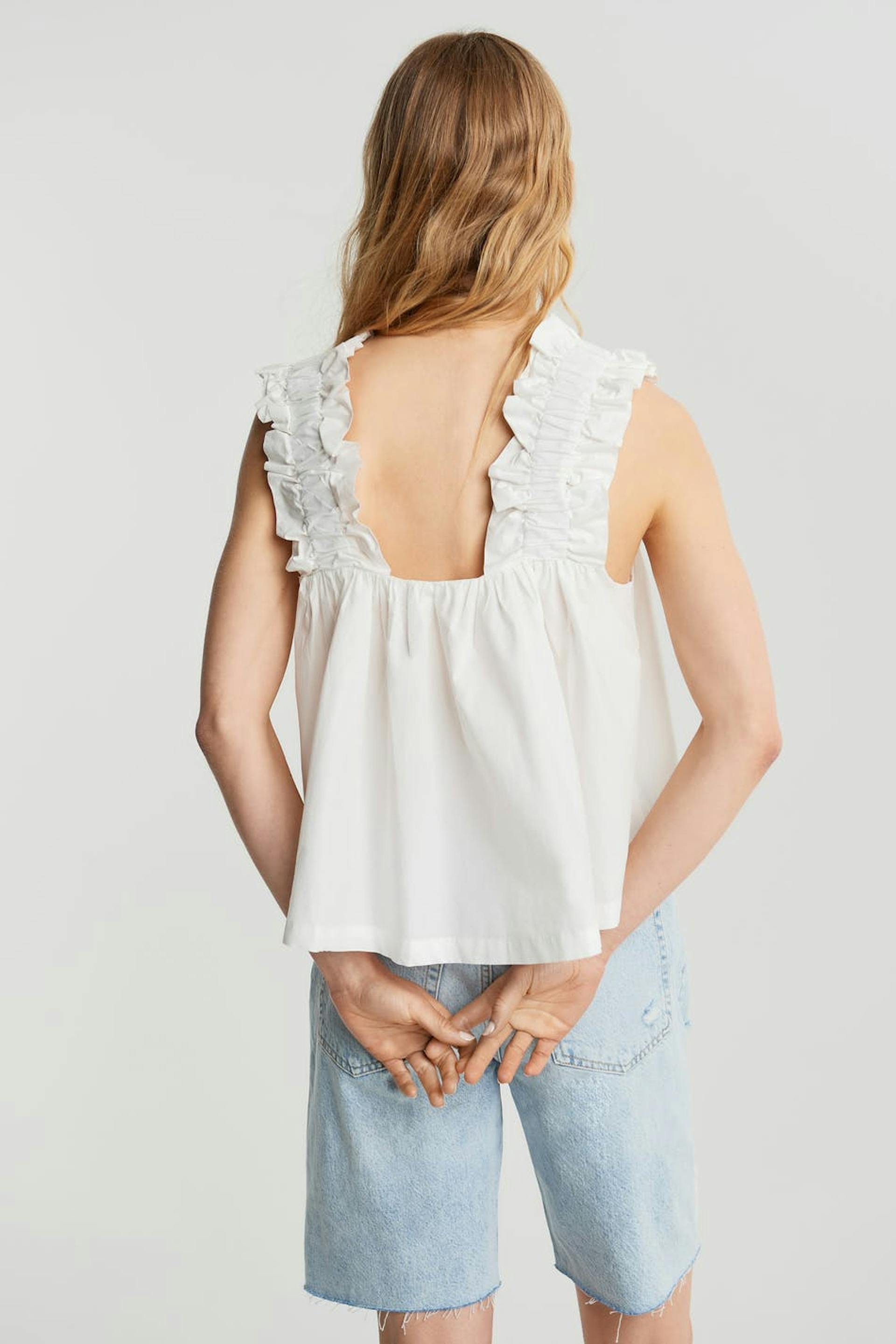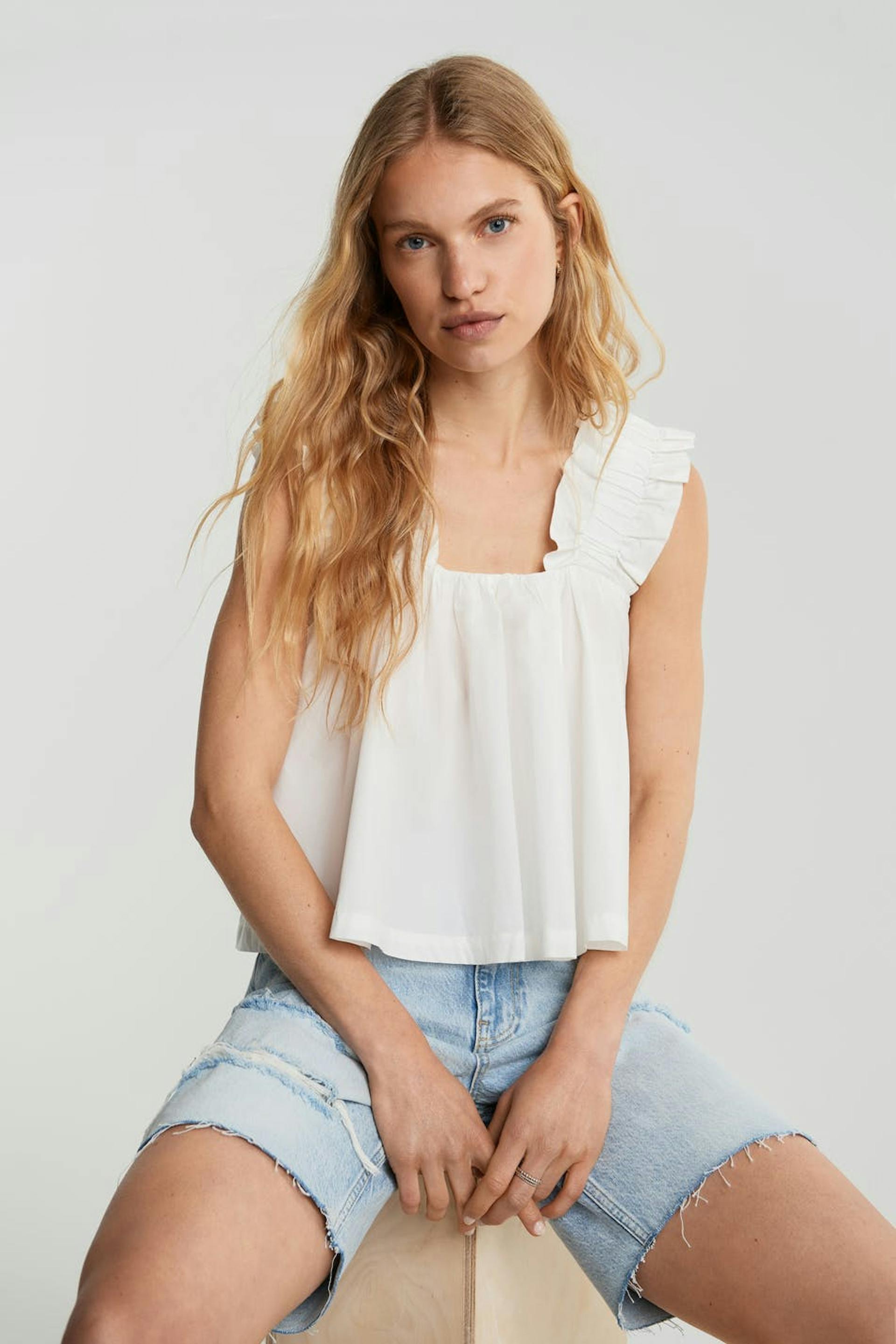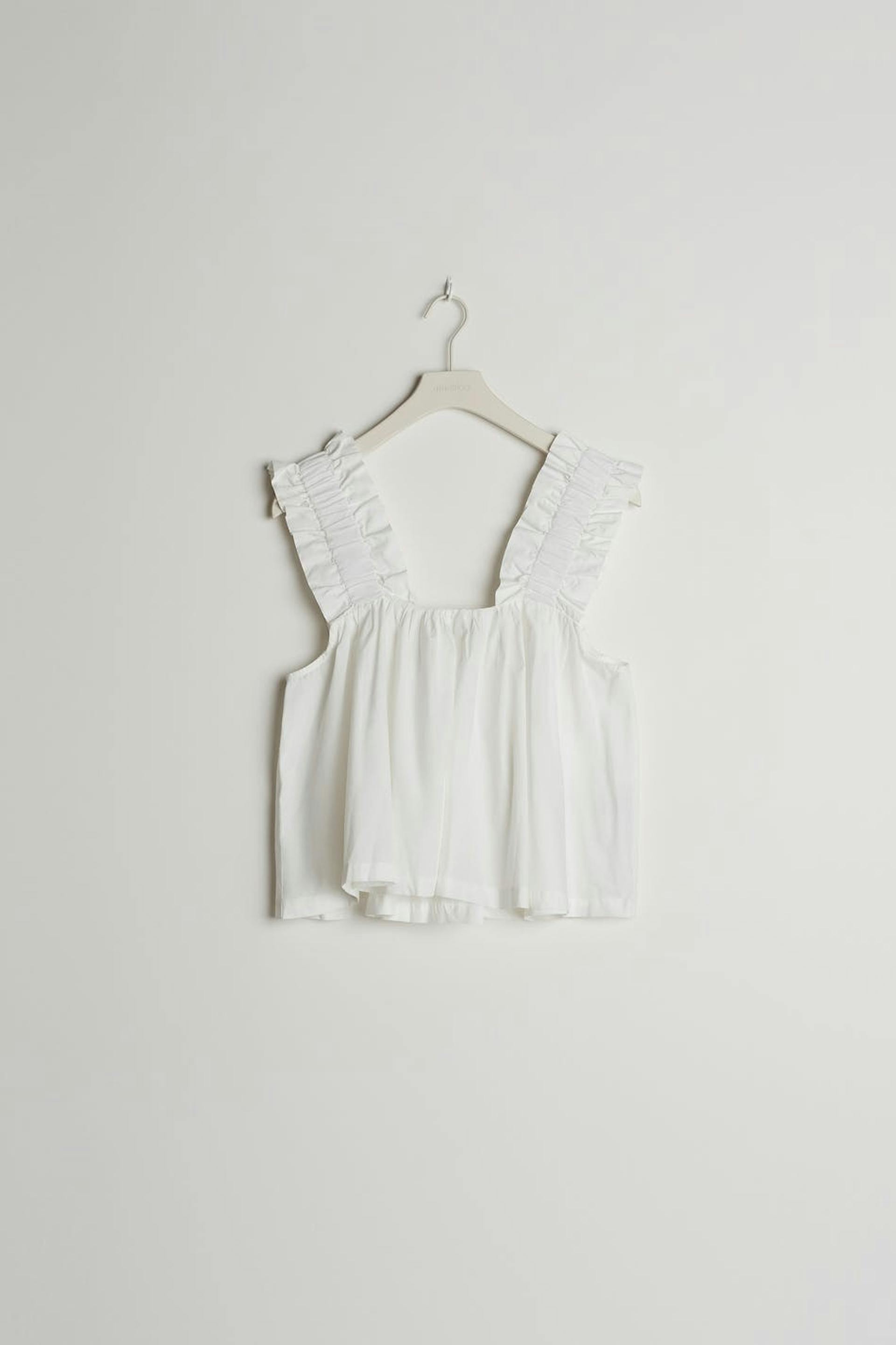 Croppet top med en luftig, voluminøs pasform. Toppen er hvid og har tykke skulderstropper med volanter med rynkede detaljer.