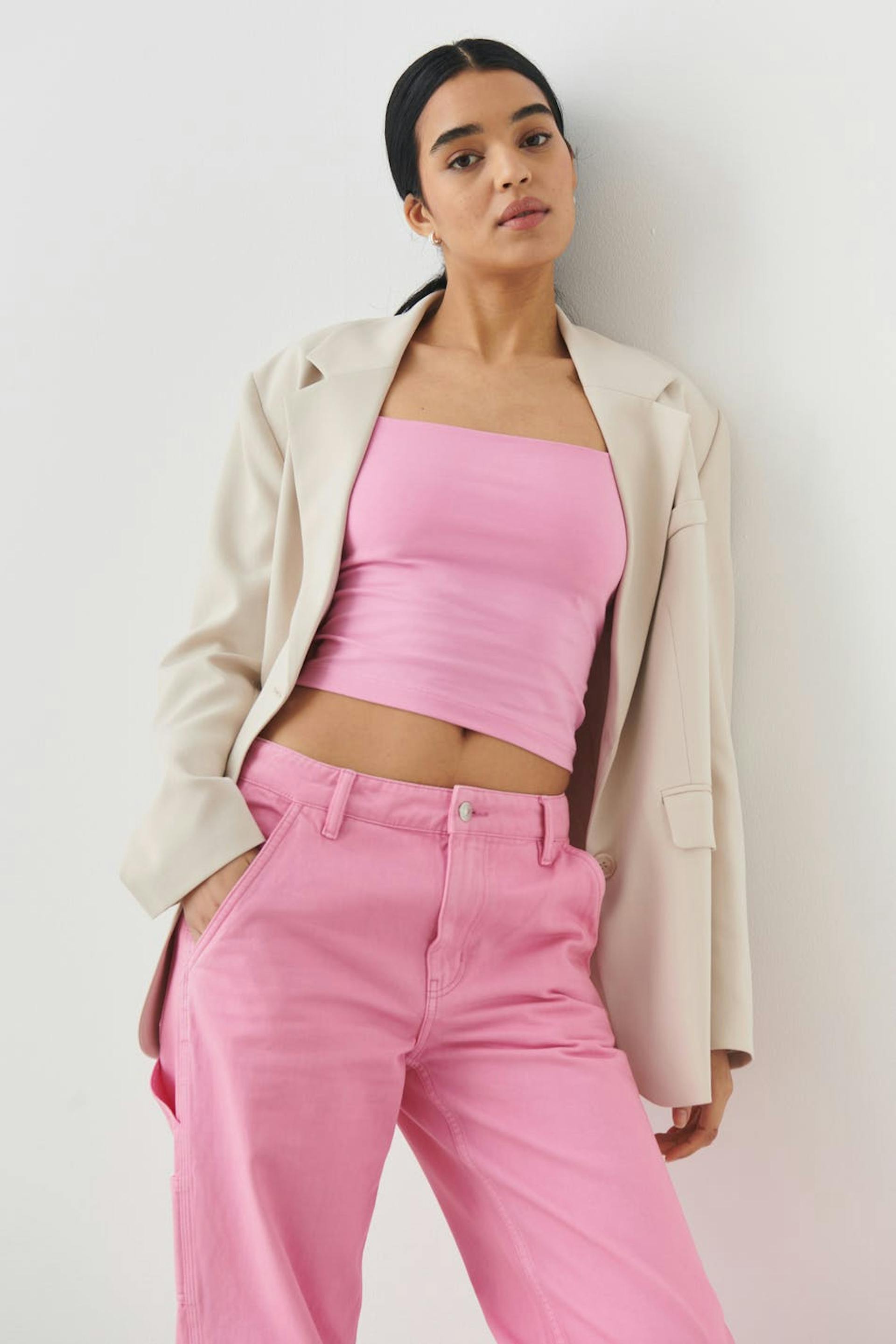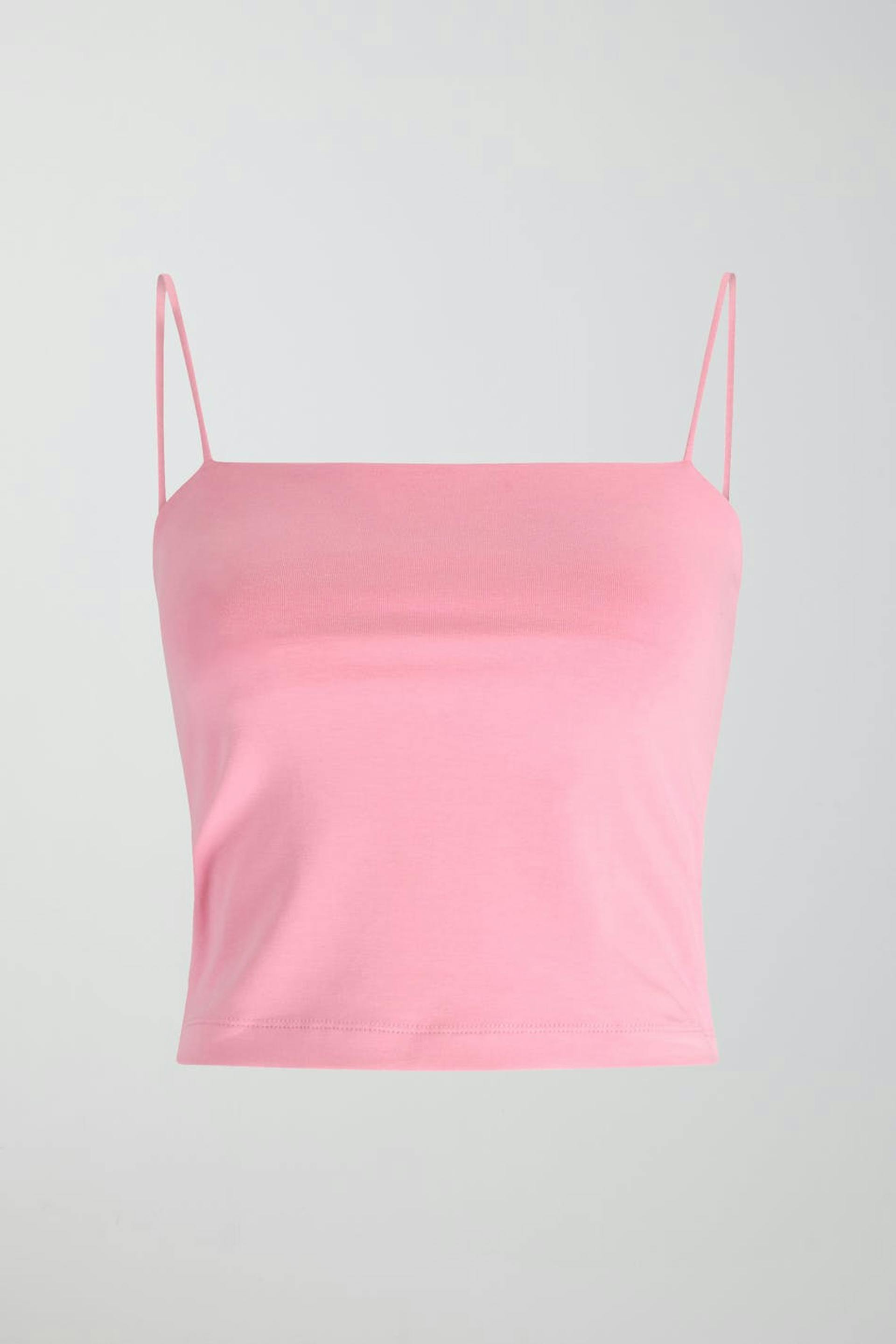 Kort tanktop med en figursyet pasform. Tanktoppen er pink og har lige overkant. Den har smalle skulderstropper.