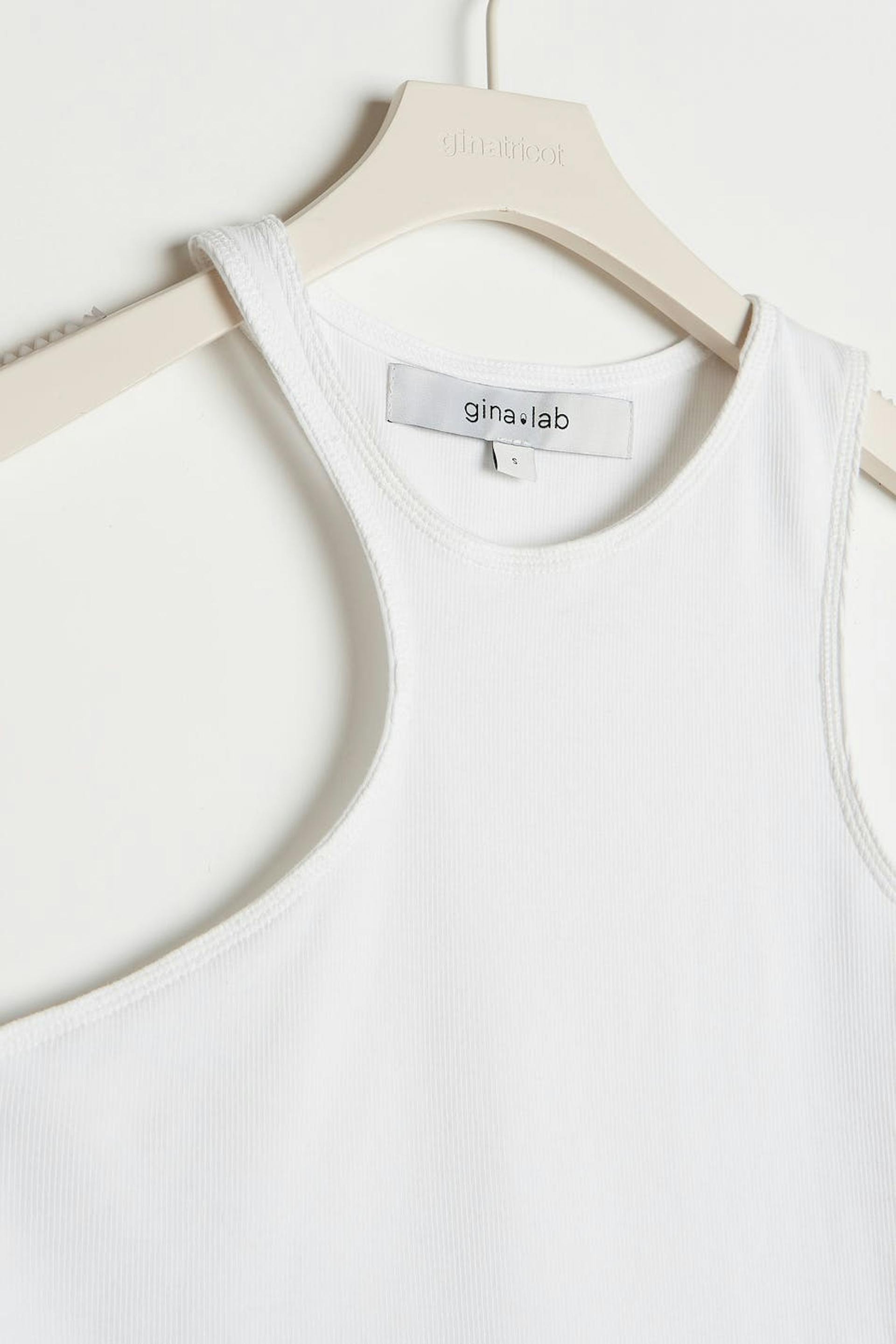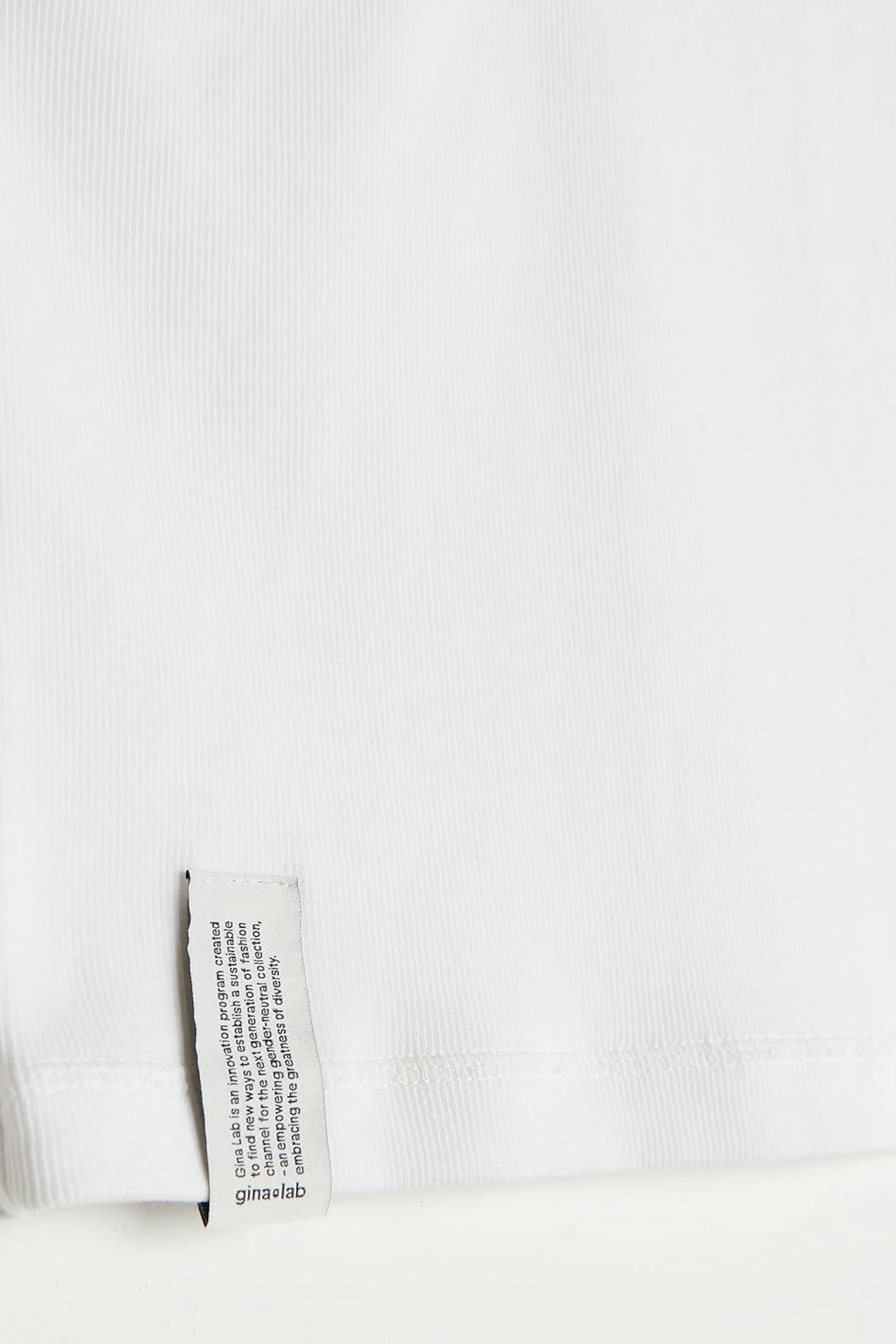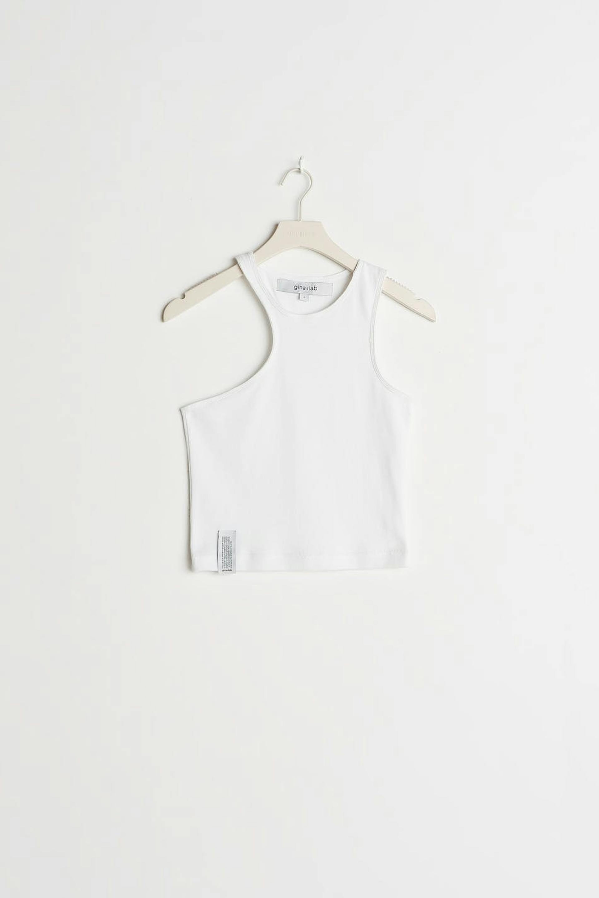 Top fra Gina Lab med et udsnit og figursyet pasform. Toppen er hvid og har en blød, ribbet kvalitet. Den har asymmetrisk pasform.