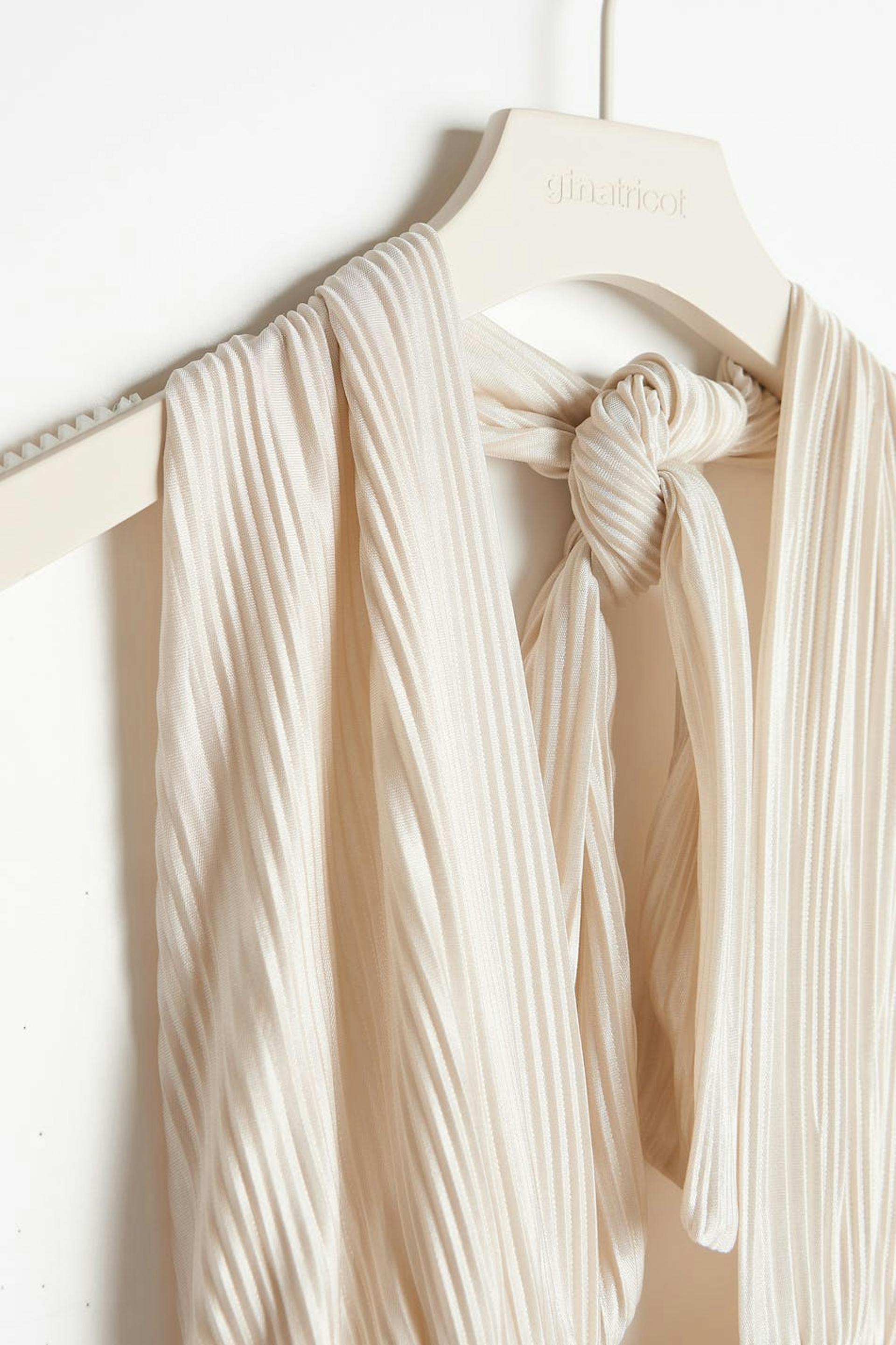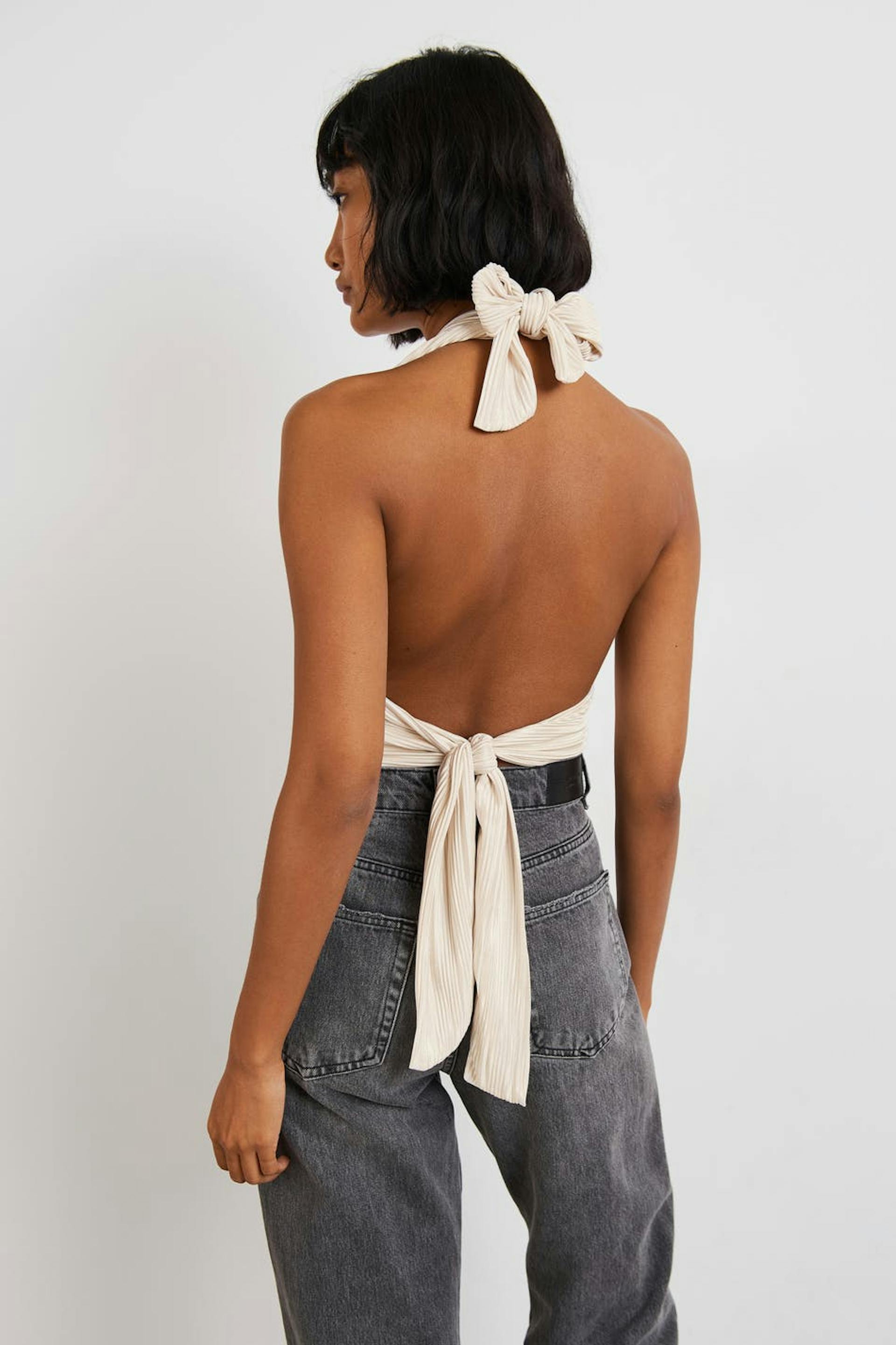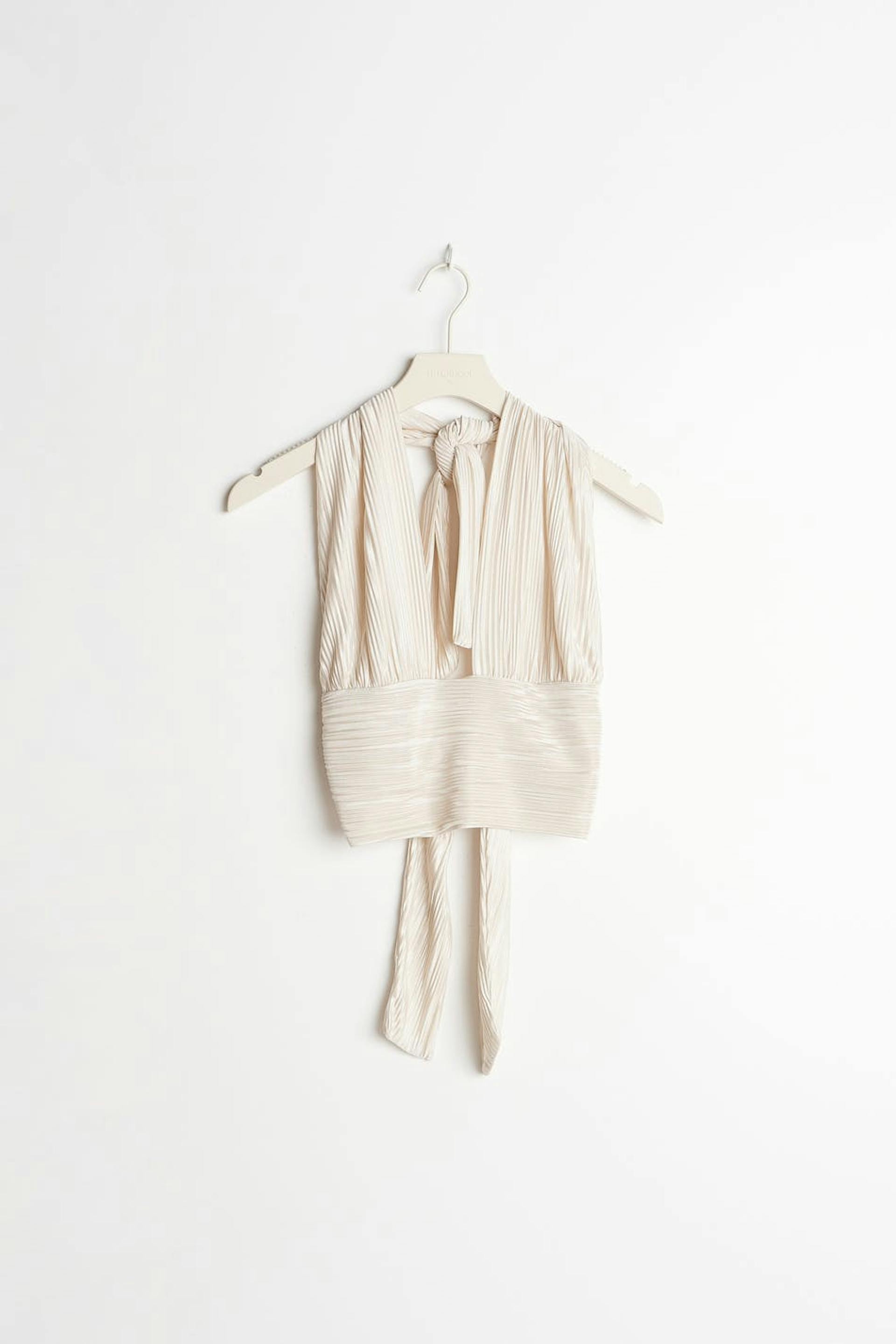 Plisseret halternecktop med bindbart bånd i nakken og i ryggen. Toppen er perfekt til festen, hvid og croppet. Den har en skinnende kvalitet i jersey.
