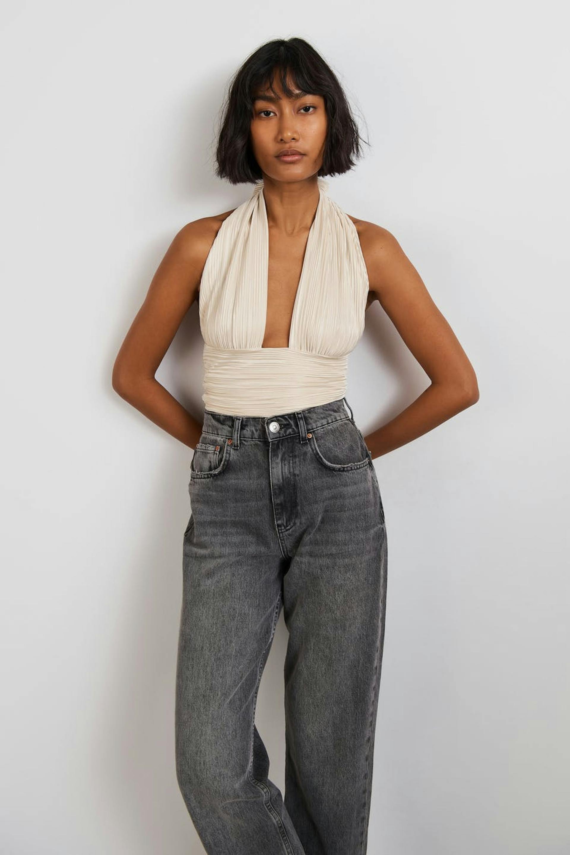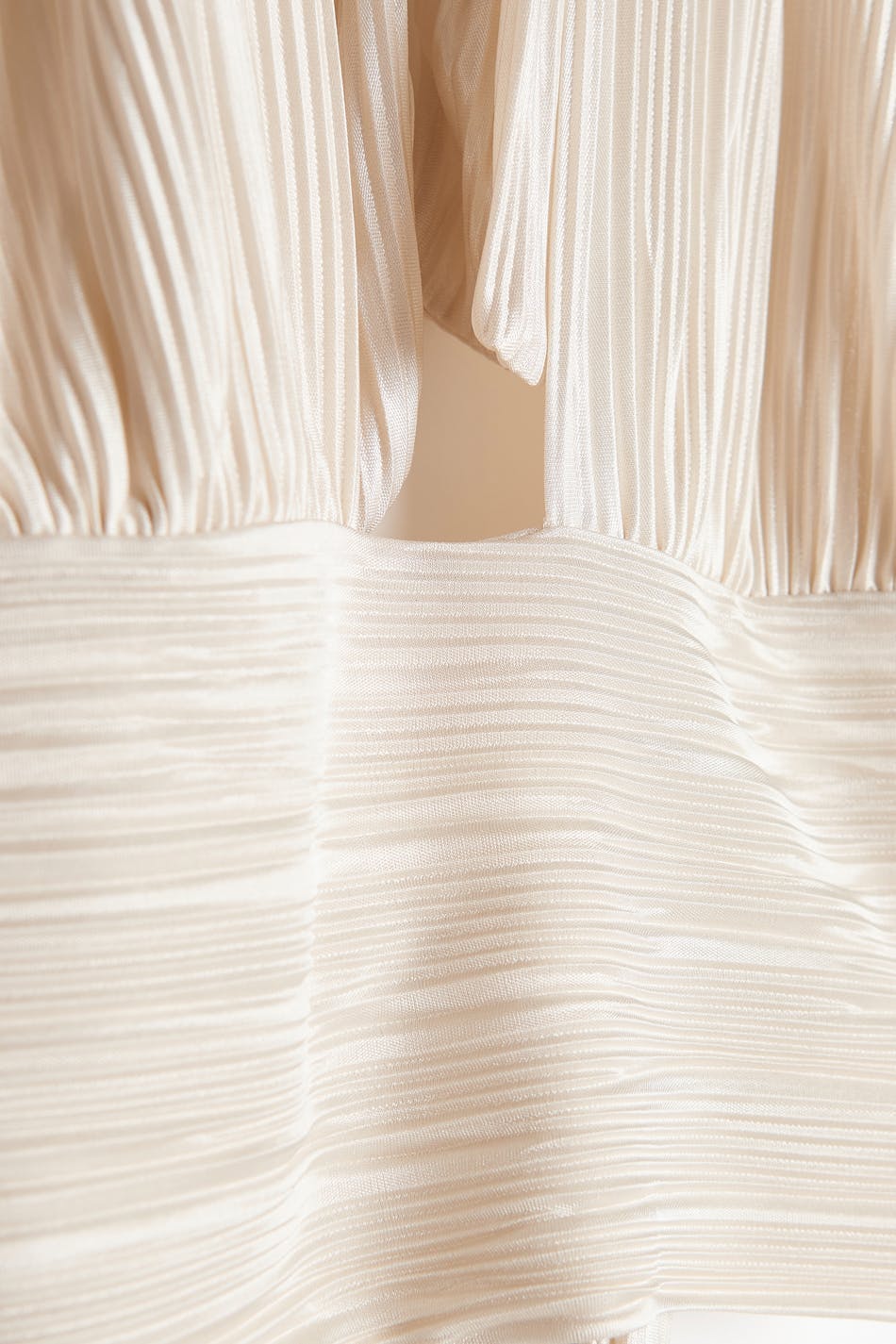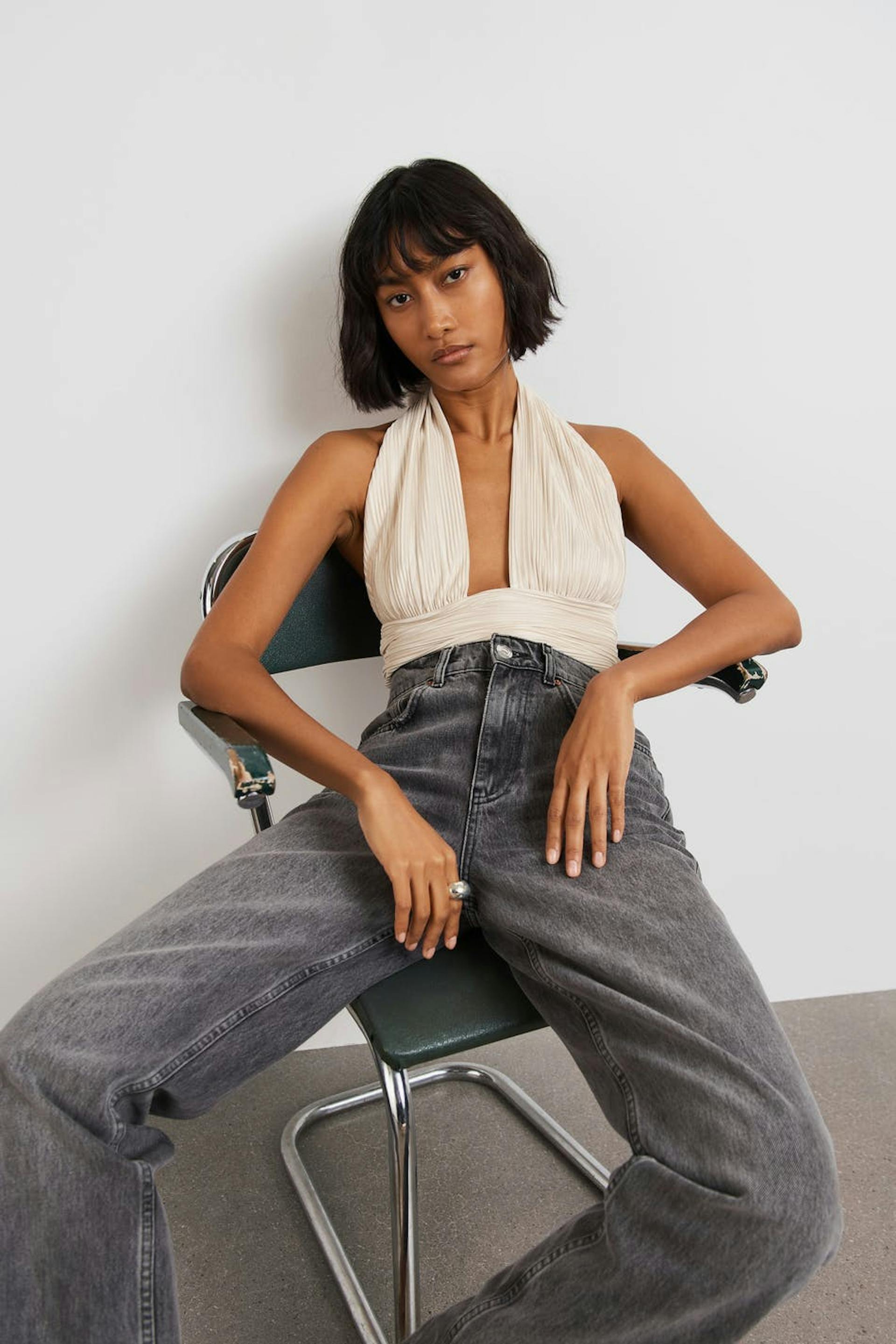 Plisseret halternecktop med bindbart bånd i nakken og i ryggen. Toppen er perfekt til festen, hvid og croppet. Den har en skinnende kvalitet i jersey.
