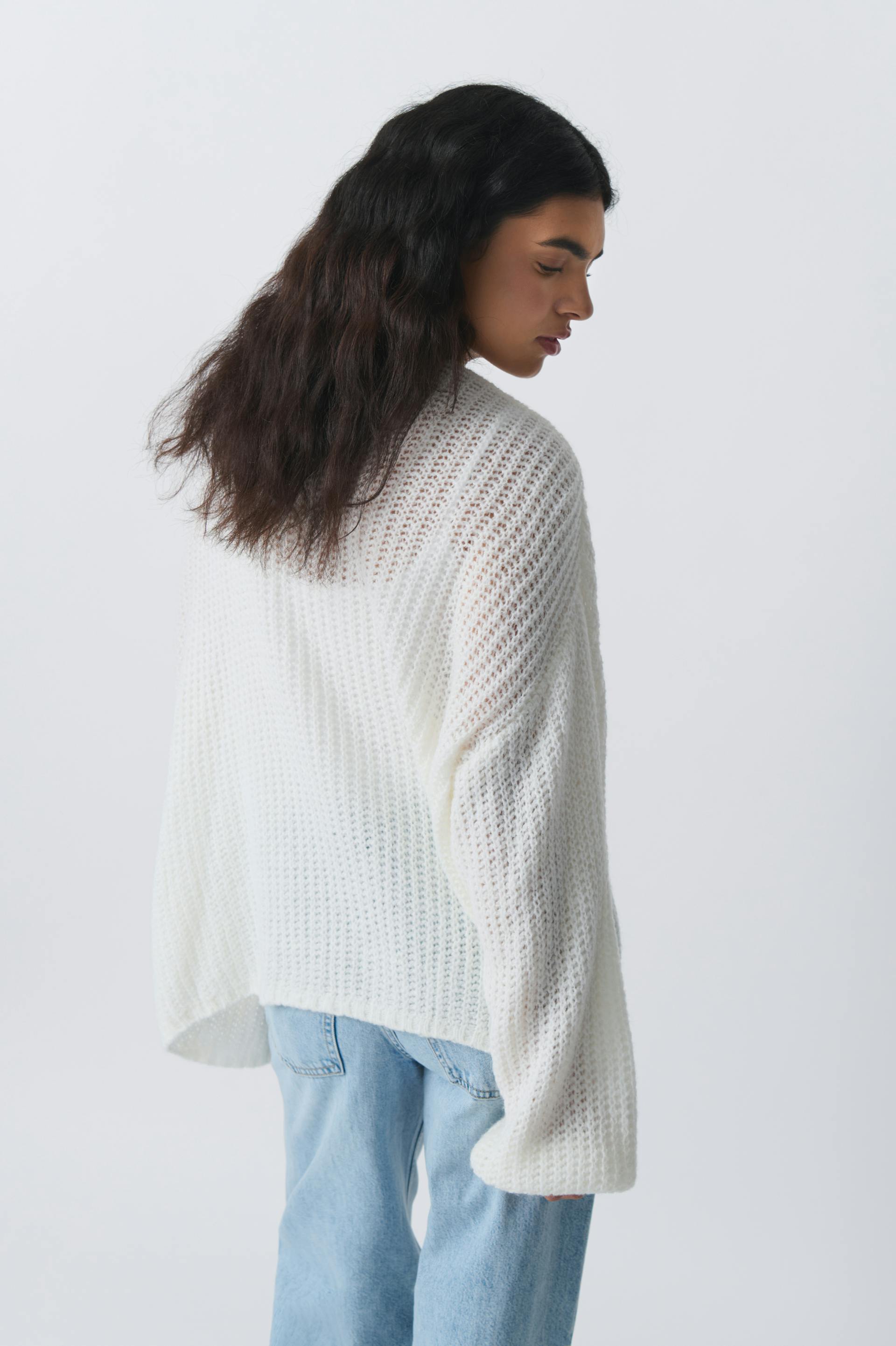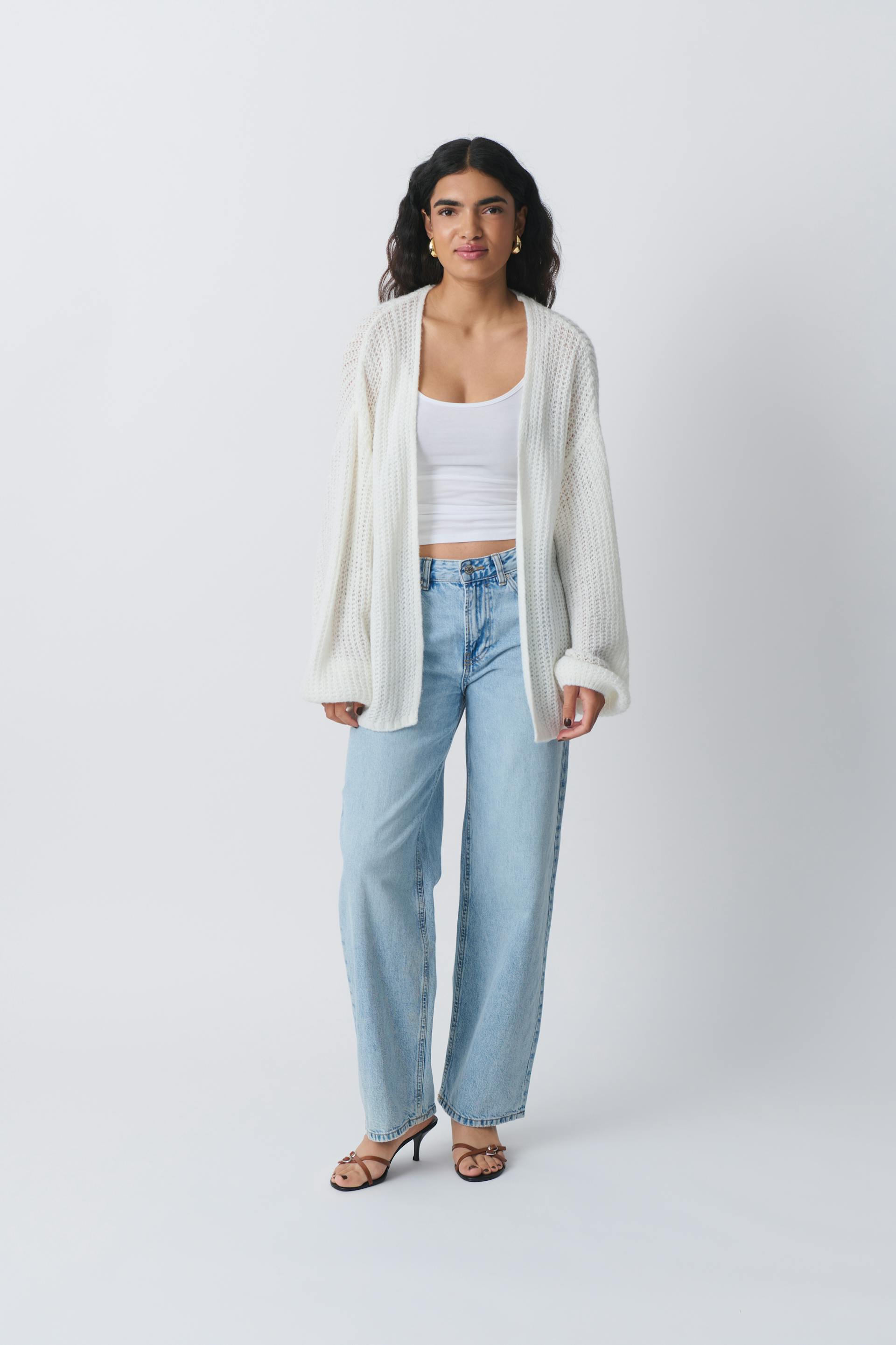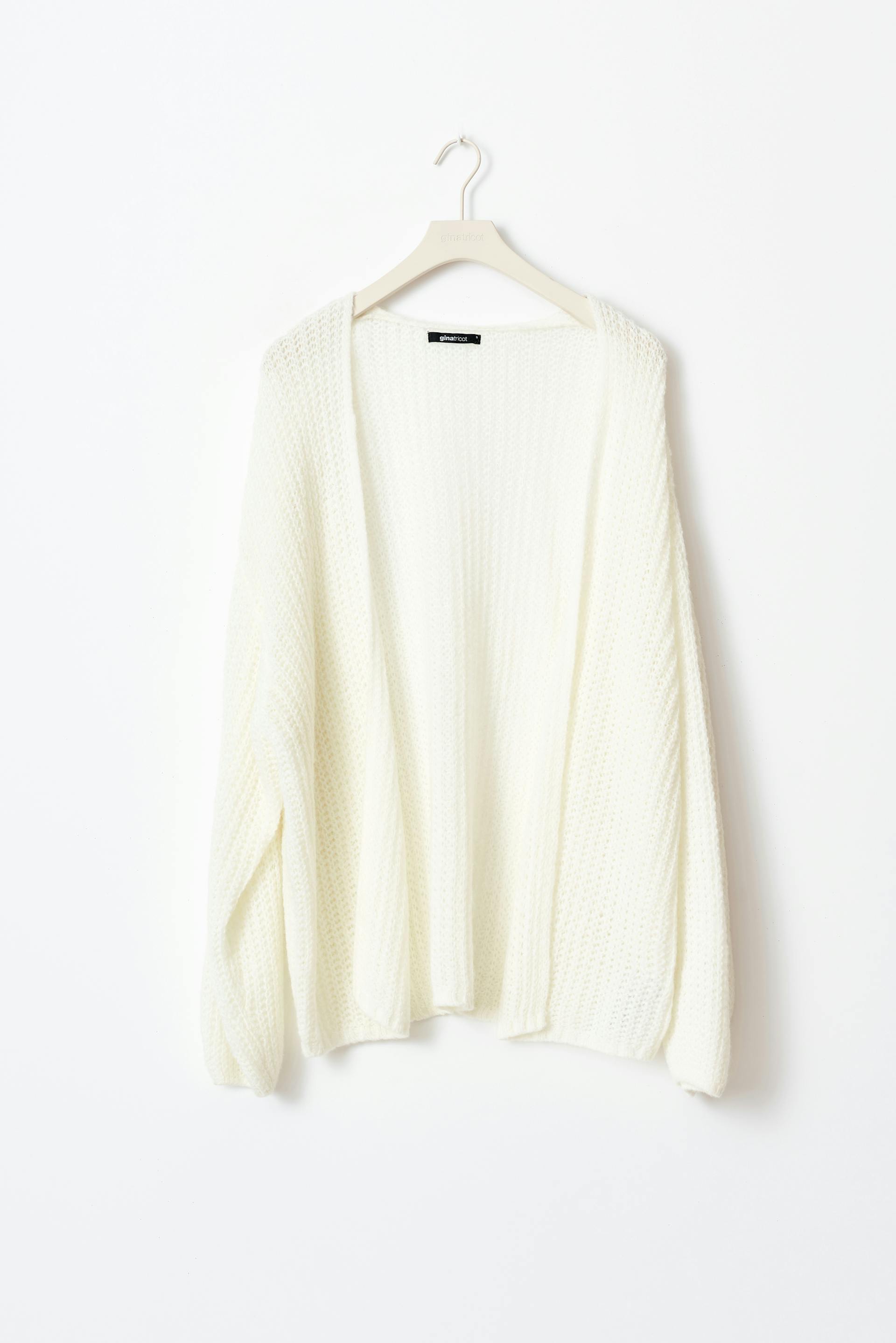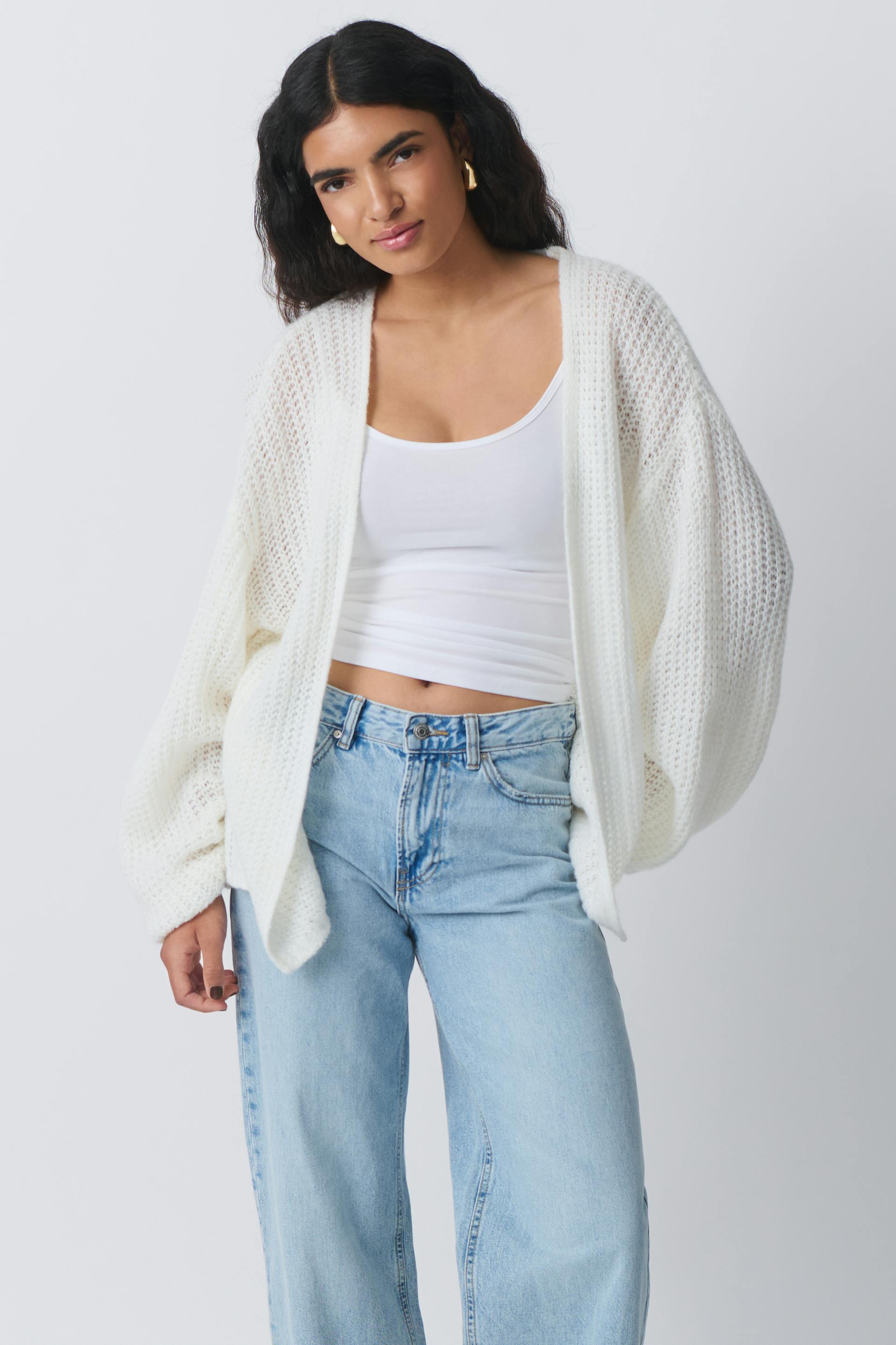 Strikket cardigan med ballonærme. Cardiganen er hvid og har oversize pasform. Den har normal længde og blød elastik på ærmeafslutningerne.