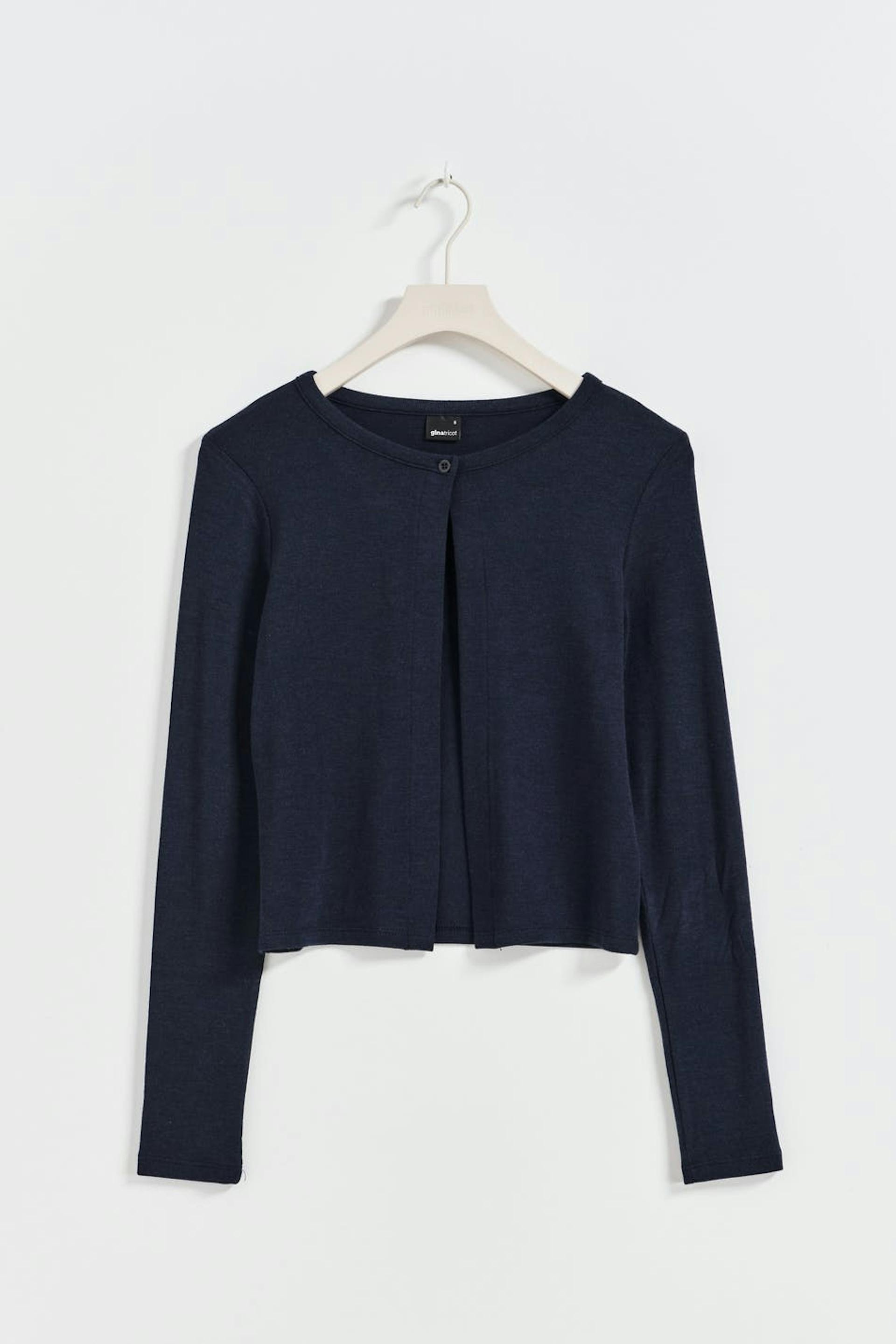 Cardigan i ribbet jersey med figurnær pasform. Cardiganen er blå og har lukning med en knap ved fronten. Den har rund udskæring, langt ærme og kort længde.
